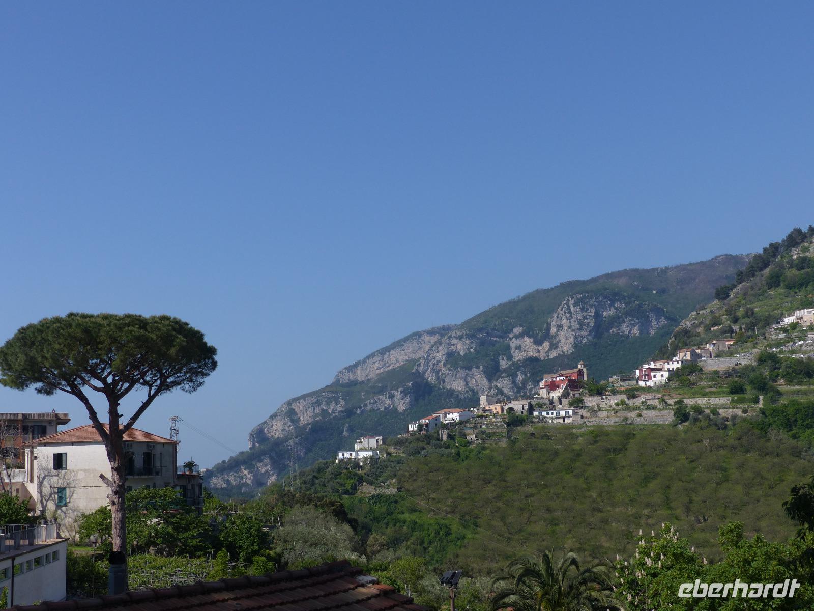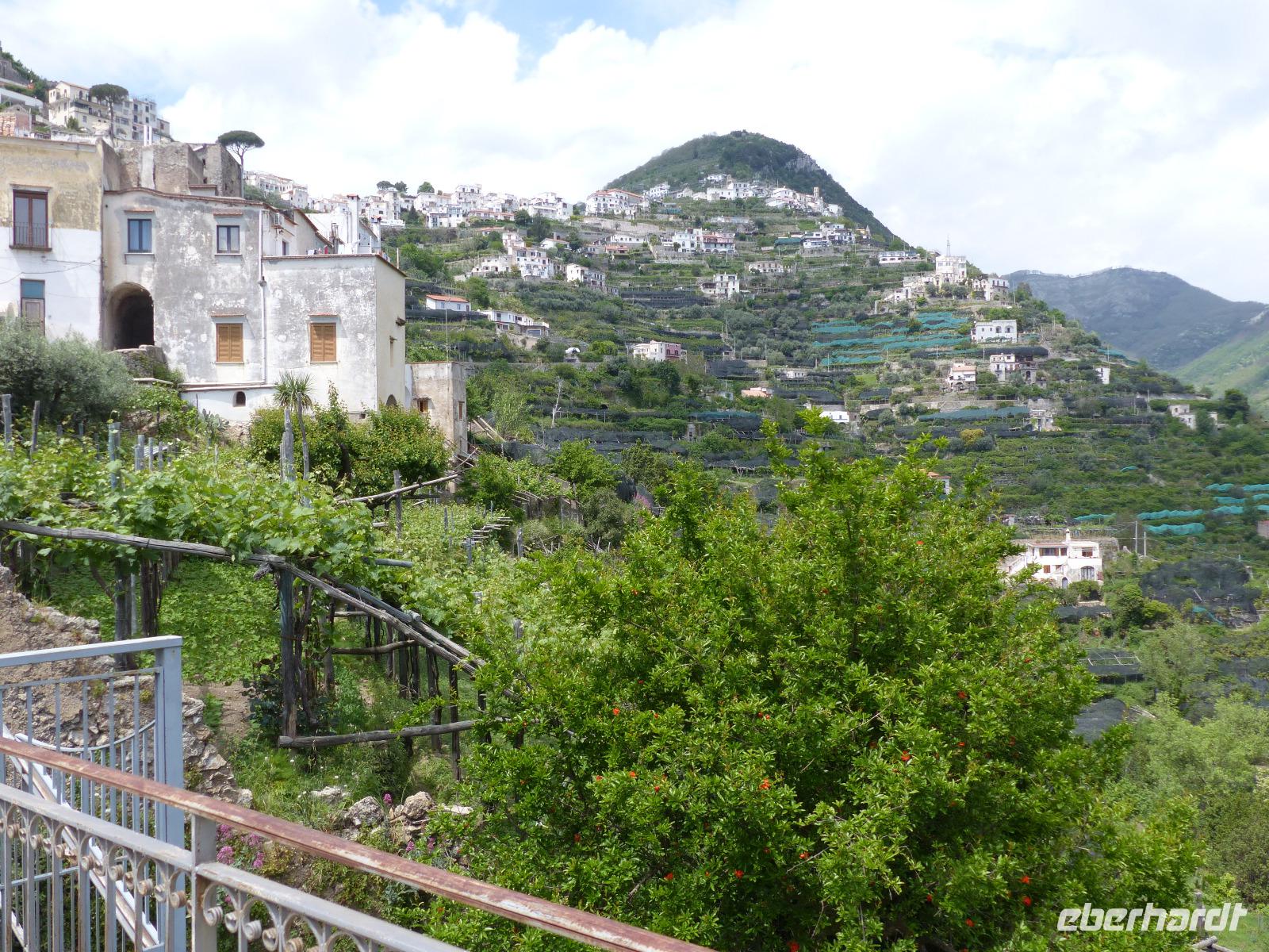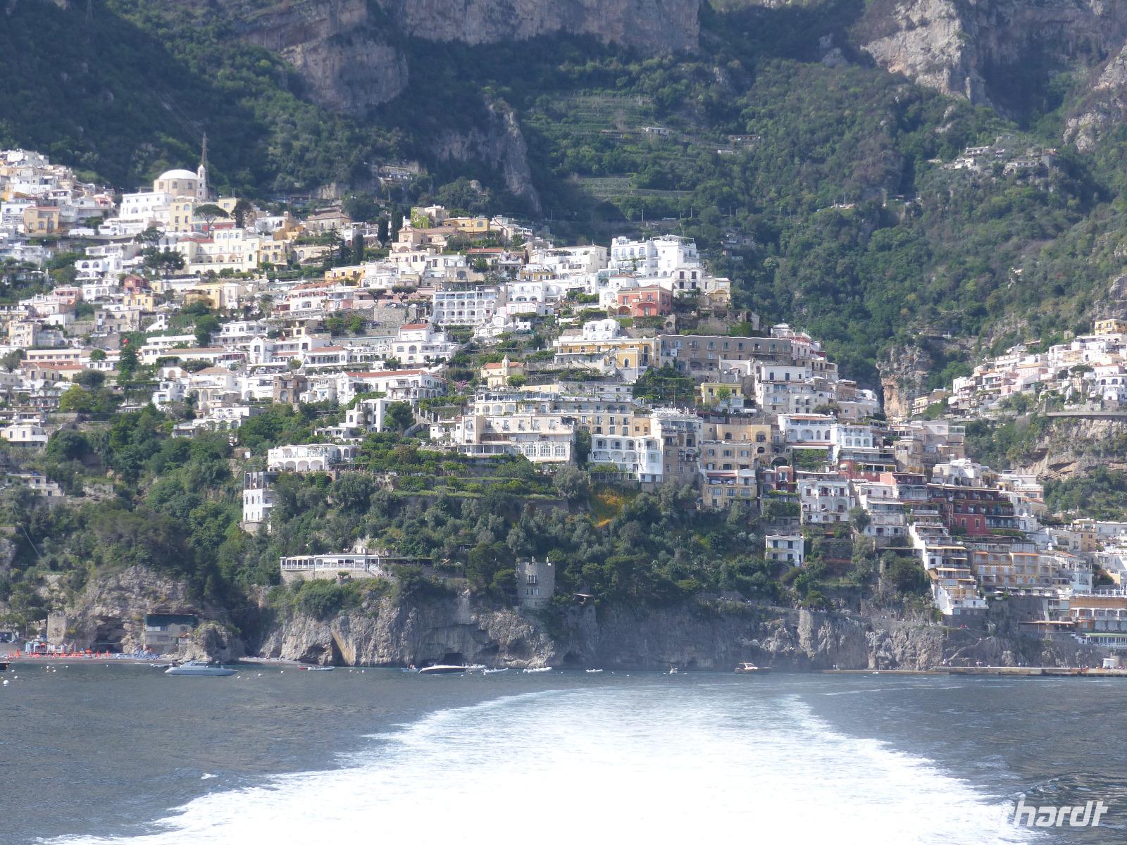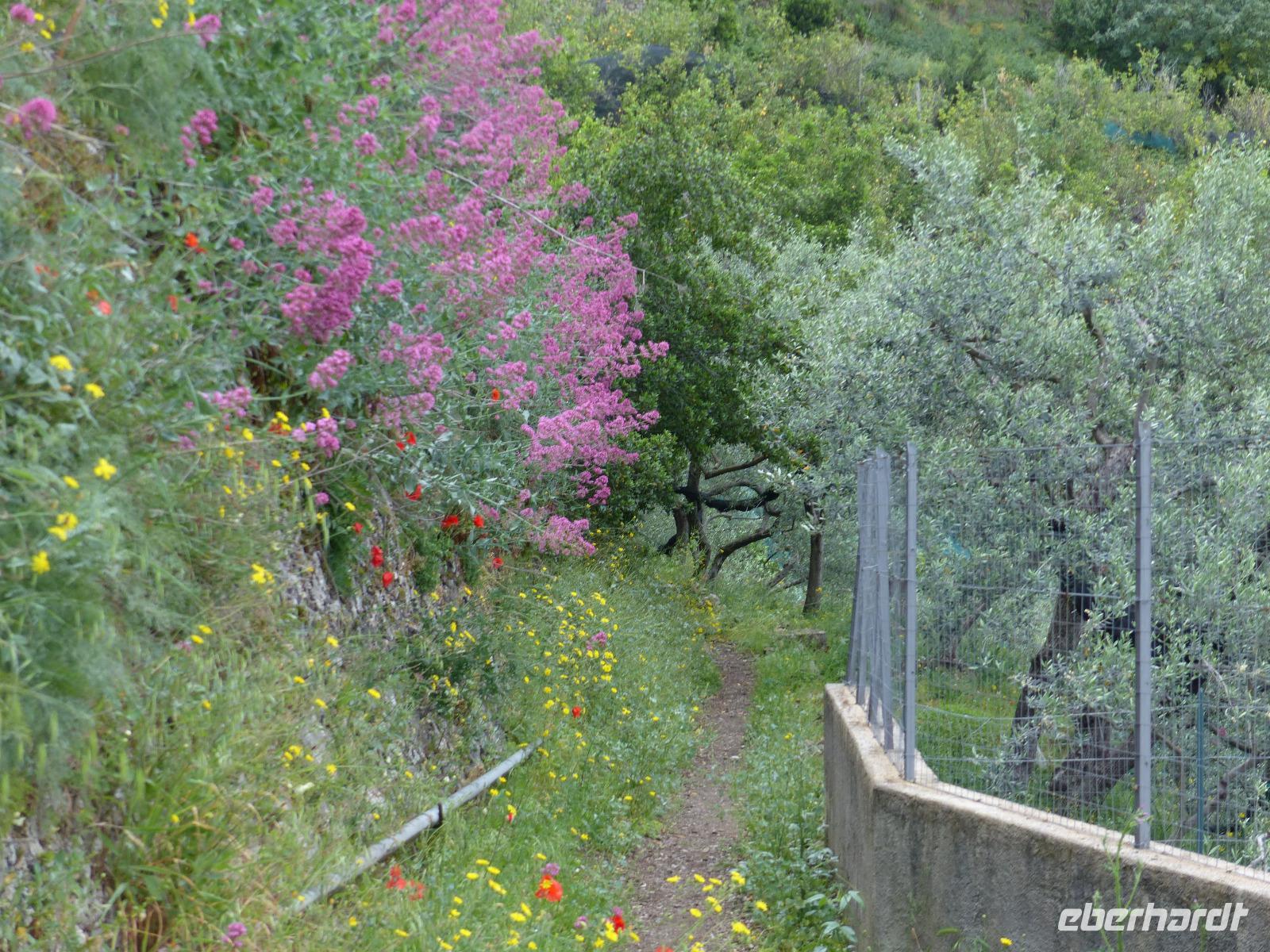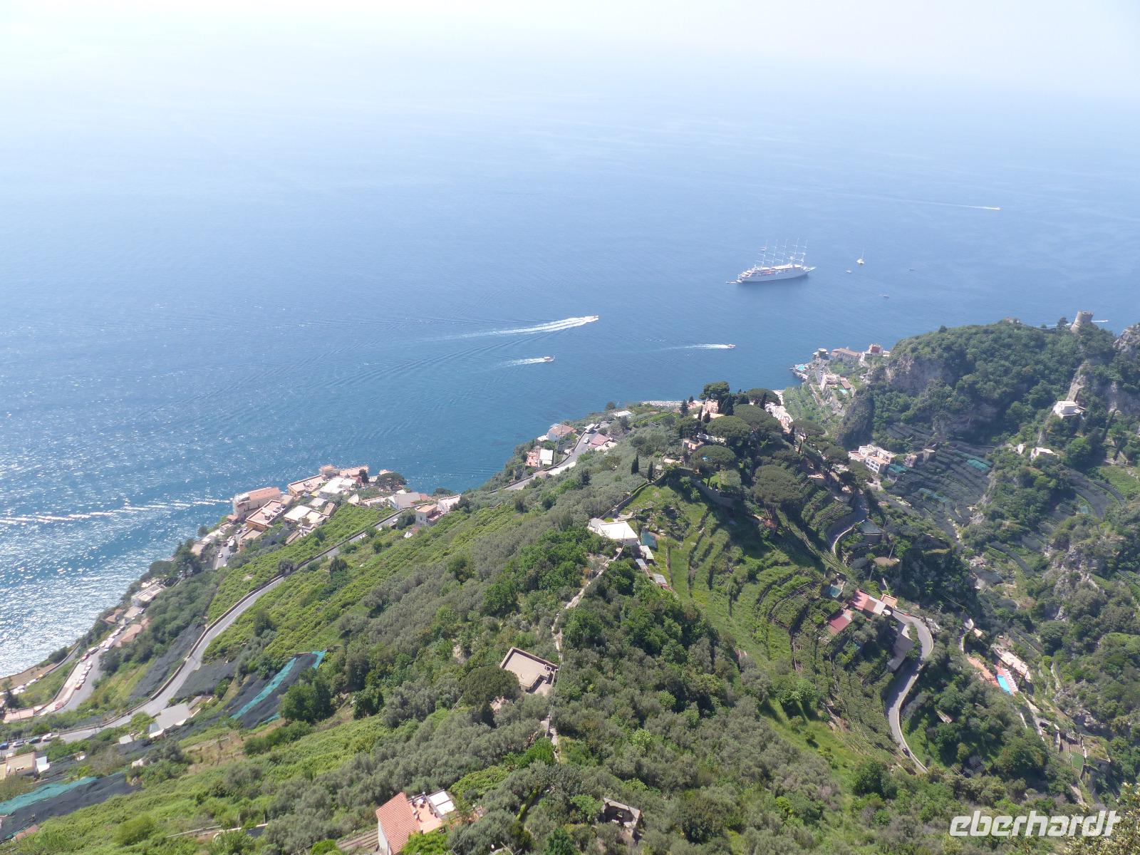 Die Götter empfingen uns mit mausgrauem Himmel. Aber es war warm und trocken. In Bomerano gönnten wir uns noch einen Kaffee. Dann ging's los. Der Weg war noch vor wenigen Wochen wegen eines Bergrutsches gesperrt gewesen. Nun ziehen wieder hunderte Menschen täglich in die Bergwelt zwischen Bomerano und Nocelle. Oberhalb der abgesperrten Stelle hat sich ein neuer Trampelpfad gebildet, über den man die abgerutschte Stelle umgehen kann. Viele Blumen blühten am Wegesrand, auf dem Meer flitzten Boote dahin und wir genossen die Aussicht. Eine kleine Pause machten wir an einer aussichtsreichen Stelle unter einer Felswand. Die große Pause folgte dann in Nocelle, einem kleinen Weiler, der hoch oben am Hang klebt. Und dort erwartete uns mal wieder Leckeres aus der Küche. Sehr gute Antipasti und wir hatten die ganze Terrasse für uns alleine. Ein paar Gäste genossen nun die Weiterreise per Bus, während die anderen sich mit mir zu Fuß auf den aussichtsreichen Pfad nach Positano begaben. Kläffende Vierbeiner empfingen uns in Montepertuso. Ein kleiner Ausrutscher blieb zum Glück ohne Folgen und so erreichten wir, nachdem wir Zaumgäste einer sehr stilvollen Hochzeitsfeier mit Konzert wurden (Mozarts Kleine Nachtmusik begleitete uns nun auf unserem Weg und geisterte durch unsere Köpfe), Positano und wir trafen uns alle wieder am Hafen von Positano. Den Rückweg traten wir übers Wasser an. Das Wetter hatte sich gebessert, die Sonne kam raus. Und die Strandbar an der Uferpromenade in Maiori freute sich nach unserer Rückkehr über eine ganze Gruppe Gäste, die den Blick aufs Meer mit leckeren Getränken genossen. Auch dieser Tag klang, wie immer, mit einem leckeren Essen in unserem Hotel aus.