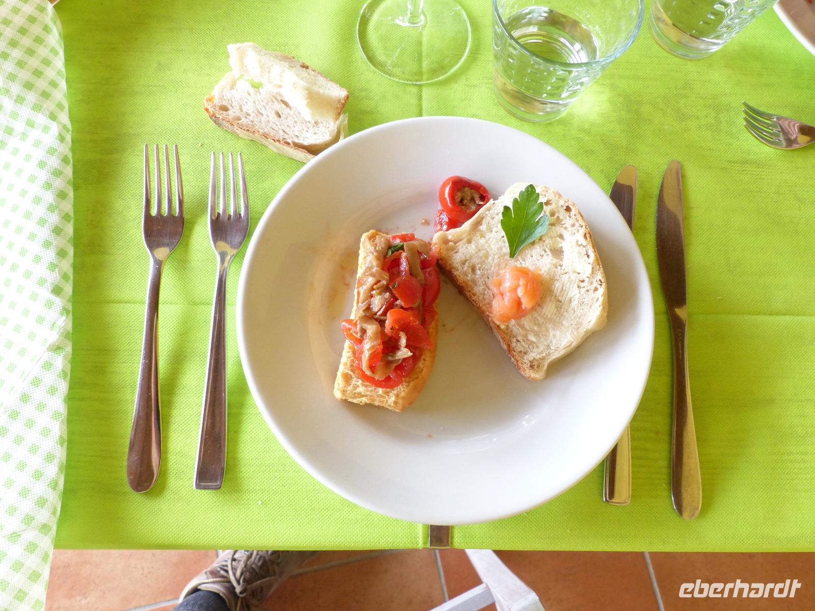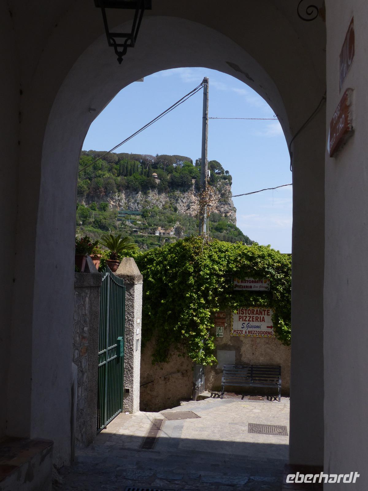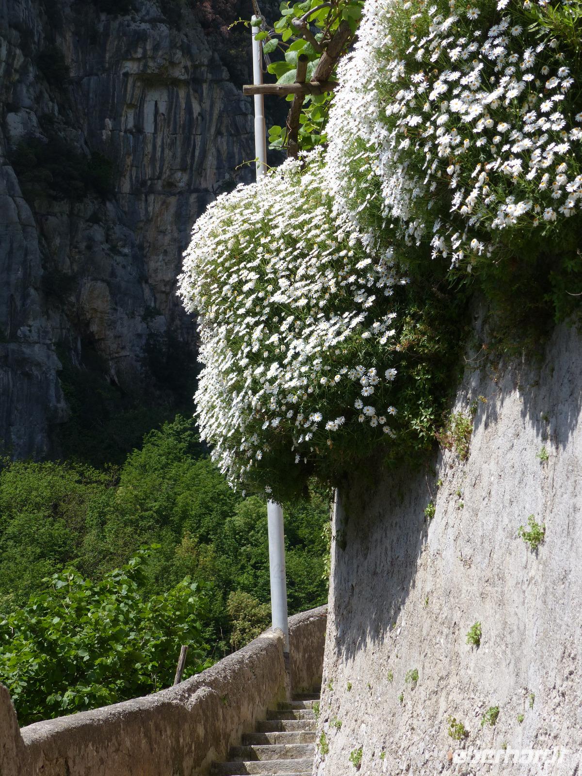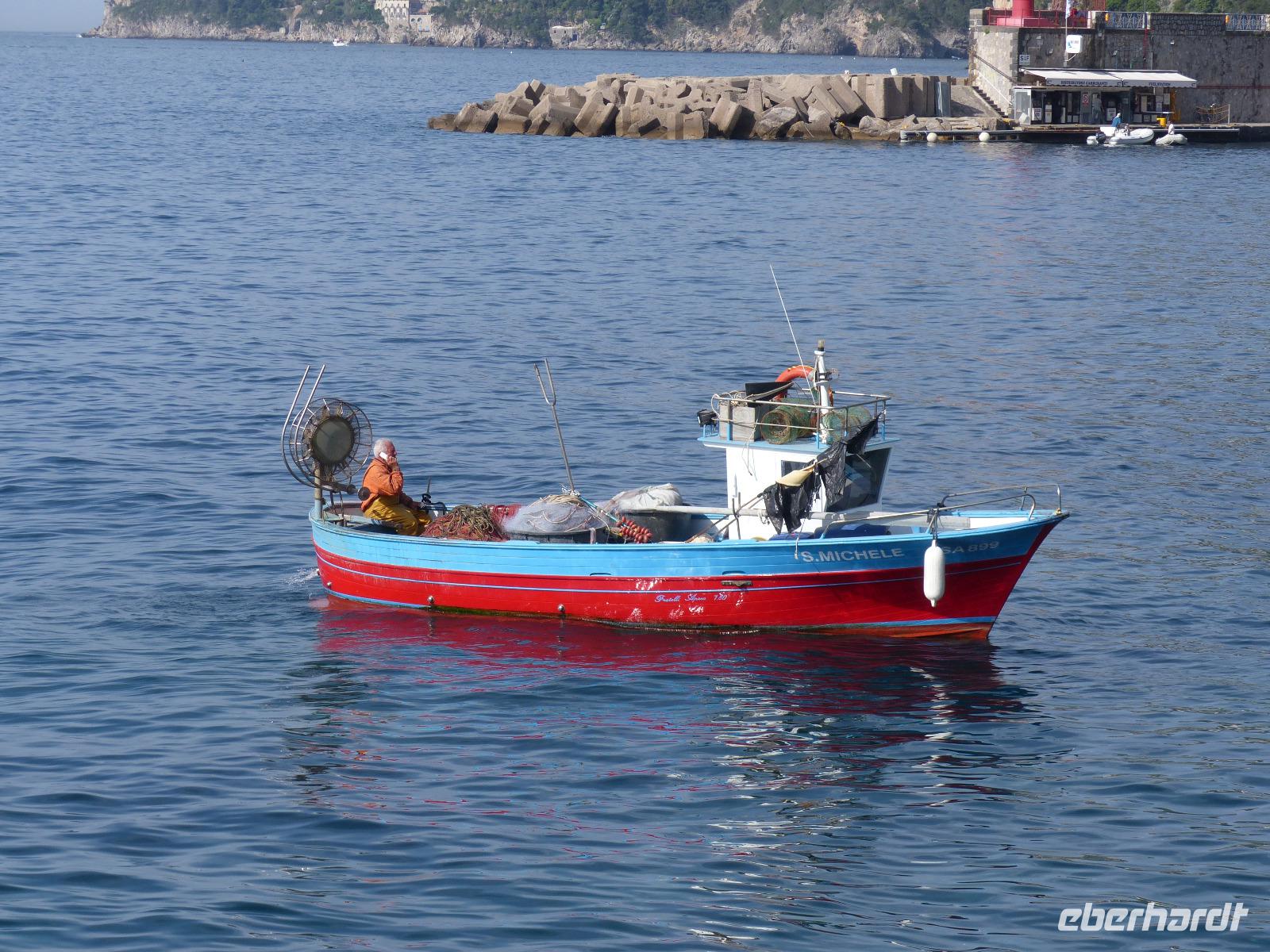 Die Götter empfingen uns mit mausgrauem Himmel. Aber es war warm und trocken. In Bomerano gönnten wir uns noch einen Kaffee. Dann ging's los. Der Weg war noch vor wenigen Wochen wegen eines Bergrutsches gesperrt gewesen. Nun ziehen wieder hunderte Menschen täglich in die Bergwelt zwischen Bomerano und Nocelle. Oberhalb der abgesperrten Stelle hat sich ein neuer Trampelpfad gebildet, über den man die abgerutschte Stelle umgehen kann. Viele Blumen blühten am Wegesrand, auf dem Meer flitzten Boote dahin und wir genossen die Aussicht. Eine kleine Pause machten wir an einer aussichtsreichen Stelle unter einer Felswand. Die große Pause folgte dann in Nocelle, einem kleinen Weiler, der hoch oben am Hang klebt. Und dort erwartete uns mal wieder Leckeres aus der Küche. Sehr gute Antipasti und wir hatten die ganze Terrasse für uns alleine. Ein paar Gäste genossen nun die Weiterreise per Bus, während die anderen sich mit mir zu Fuß auf den aussichtsreichen Pfad nach Positano begaben. Kläffende Vierbeiner empfingen uns in Montepertuso. Ein kleiner Ausrutscher blieb zum Glück ohne Folgen und so erreichten wir, nachdem wir Zaumgäste einer sehr stilvollen Hochzeitsfeier mit Konzert wurden (Mozarts Kleine Nachtmusik begleitete uns nun auf unserem Weg und geisterte durch unsere Köpfe), Positano und wir trafen uns alle wieder am Hafen von Positano. Den Rückweg traten wir übers Wasser an. Das Wetter hatte sich gebessert, die Sonne kam raus. Und die Strandbar an der Uferpromenade in Maiori freute sich nach unserer Rückkehr über eine ganze Gruppe Gäste, die den Blick aufs Meer mit leckeren Getränken genossen. Auch dieser Tag klang, wie immer, mit einem leckeren Essen in unserem Hotel aus.