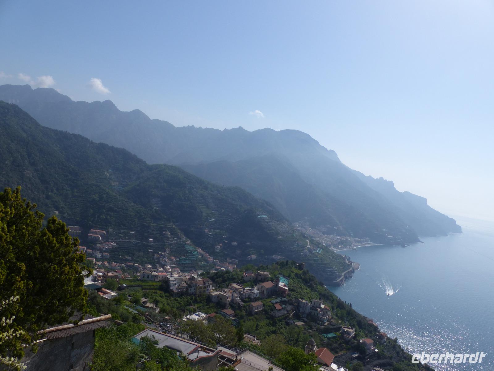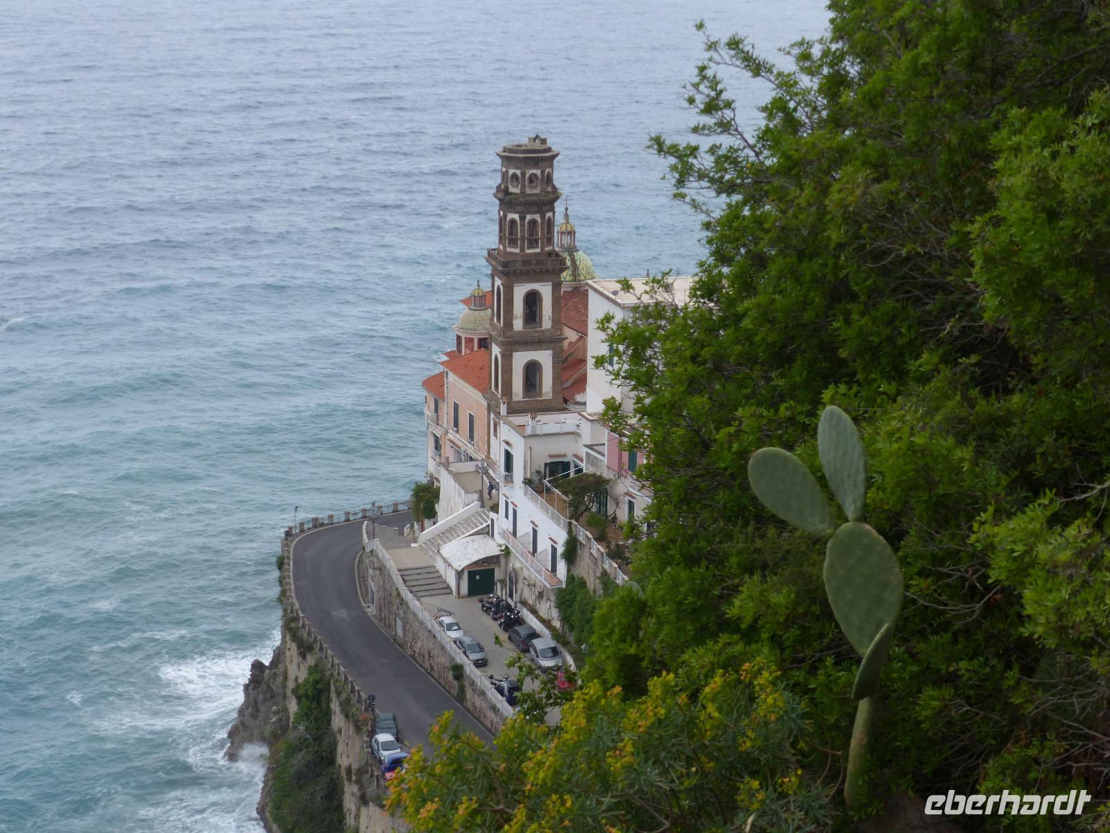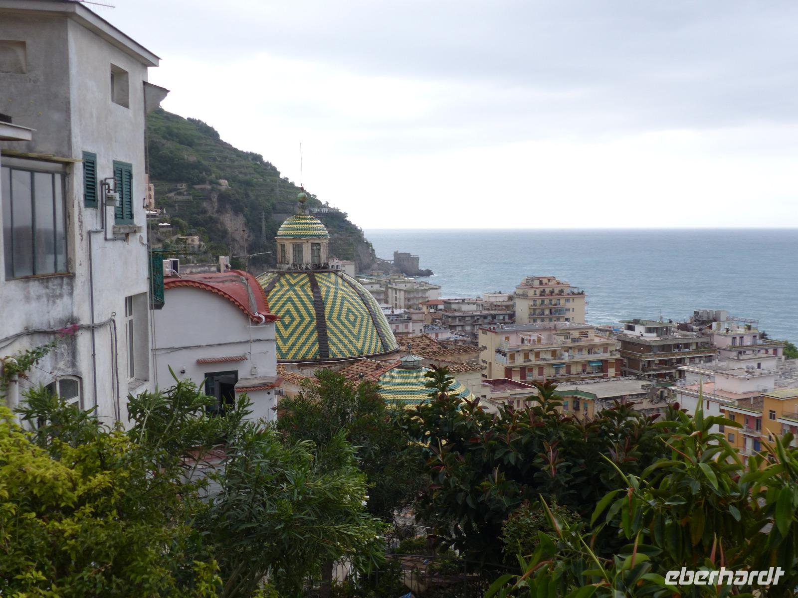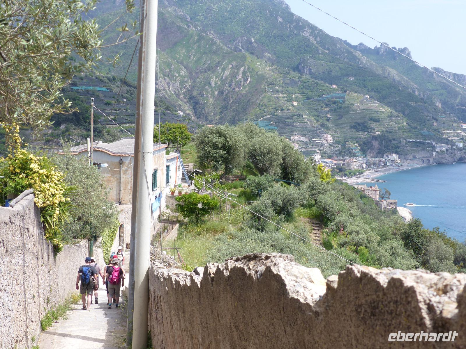In den Bergen hingen die Wolken. Da bleibt man am besten unweit des Meeres. Der Sentiero dei Limoni ist eine Küstenwanderung, die es allerdings in sich hat. Eben ist die Küste hierzulande nun mal nicht. Wir starteten in Maiori, wanderten an der Kirche vorüber und bewundeten nun von oben die Kuppeln, die mit gelben und grünen Majolikafliesen gedeckt sind, genossen den Blick auf die Küste und erreichten schließlich Minori. Ich hatte einige Tage zuvor eine Runde Zitronenkekse ausgegeben, und diese stammten aus Minori. „Die möchte ich mit nach Hause nehmen," sagte sich nicht nur ein Gast sondern gleich mehrere. Der Herr Konditor strahlte mich an. Gäste wie mich, die gleich 13 andere mitbringen, die hätte er gerne jeden Tag hier... Ein Gast betrachtete die trüben Wolken am Himmel und zog es vor, den Rest des Tages indoor zu verbringen. Vielleicht war es auch die Aussicht auf die steile Treppe, die uns nun bevorstand, die diesen Gast davon abhielt weiterzuwandern. Die Weiterwandernden schwitzten kräftig, obwohl sich die Sonne heute nicht zeigte. Aber auch der Regen hielt sich zurück. Es tröpfelte zwar immer mal wieder, aber das war's dann auch. Eine kleine Pause legten wir am Friedhof ein und dann ging's hoch nach Torello. Hier war dann ganz unvermutet die Welt mit Brettern vernagelt. Baumfällarbeiten in der Felswand unterhalb von Ravello. Wir mussten also einen Umweg gehen. Und dieser führte über eine Treppe, die nicht mehr enden wollte, den Hang hinunter. Dann erreichten wir einen wunderschönen Querweg. Der wäre eh unser Ziel gewesen. Rote Spornblumen überwucherten unseren Pfad, der schließlich mit herrlicher Aussicht auf die Barockkirche Santa Maria Maddalena, die malerisch oberhalb des Meeres am Ortsrand von Atrani liegt, zur Küste hinabführte. Mit dem öffentlichen Bus reisten wir nun nach Minori zurück und ich lud die Gruppe, die sich die gute Laune durch ein paar Wolken nicht vermiesen ließ, noch in eine bekannte Konditorei zum Schlemmen ein. Danach fuhren wir per Bus wieder zurück nach Maiori und hatten so die regenarme Zeit optimal genutzt, denn am Abend brachen Gewitter über die Küste herein - so wie vorhergesagt - und wir schlemmten weiter, und zwar in unserem Hotel. Das war ein regnerischer Tag, der diese Gruppe aber nicht aus der Ruhe brachte und alle genossen gut gelaunt ihren Urlaub.