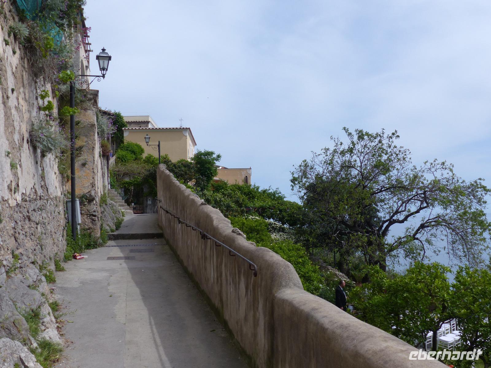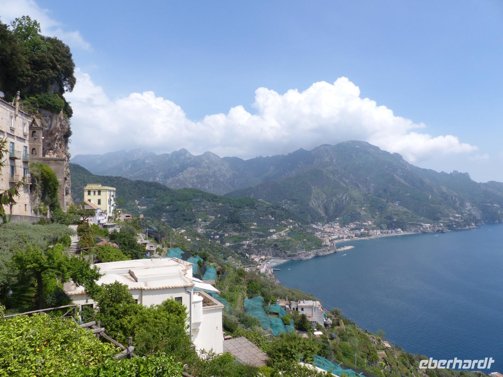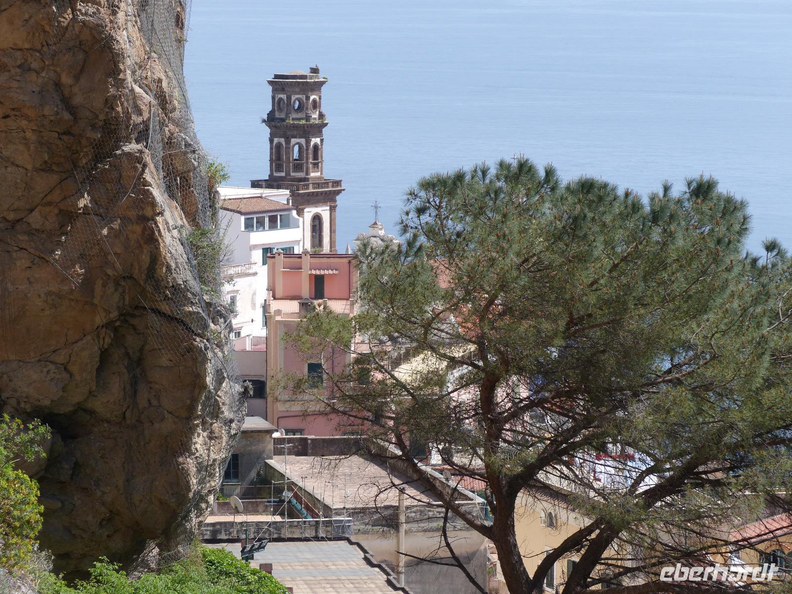 In den Bergen hingen die Wolken. Da bleibt man am besten unweit des Meeres. Der Sentiero dei Limoni ist eine Küstenwanderung, die es allerdings in sich hat. Eben ist die Küste hierzulande nun mal nicht. Wir starteten in Maiori, wanderten an der Kirche vorüber und bewundeten nun von oben die Kuppeln, die mit gelben und grünen Majolikafliesen gedeckt sind, genossen den Blick auf die Küste und erreichten schließlich Minori. Ich hatte einige Tage zuvor eine Runde Zitronenkekse ausgegeben, und diese stammten aus Minori. „Die möchte ich mit nach Hause nehmen," sagte sich nicht nur ein Gast sondern gleich mehrere. Der Herr Konditor strahlte mich an. Gäste wie mich, die gleich 13 andere mitbringen, die hätte er gerne jeden Tag hier... Ein Gast betrachtete die trüben Wolken am Himmel und zog es vor, den Rest des Tages indoor zu verbringen. Vielleicht war es auch die Aussicht auf die steile Treppe, die uns nun bevorstand, die diesen Gast davon abhielt weiterzuwandern. Die Weiterwandernden schwitzten kräftig, obwohl sich die Sonne heute nicht zeigte. Aber auch der Regen hielt sich zurück. Es tröpfelte zwar immer mal wieder, aber das war's dann auch. Eine kleine Pause legten wir am Friedhof ein und dann ging's hoch nach Torello. Hier war dann ganz unvermutet die Welt mit Brettern vernagelt. Baumfällarbeiten in der Felswand unterhalb von Ravello. Wir mussten also einen Umweg gehen. Und dieser führte über eine Treppe, die nicht mehr enden wollte, den Hang hinunter. Dann erreichten wir einen wunderschönen Querweg. Der wäre eh unser Ziel gewesen. Rote Spornblumen überwucherten unseren Pfad, der schließlich mit herrlicher Aussicht auf die Barockkirche Santa Maria Maddalena, die malerisch oberhalb des Meeres am Ortsrand von Atrani liegt, zur Küste hinabführte. Mit dem öffentlichen Bus reisten wir nun nach Minori zurück und ich lud die Gruppe, die sich die gute Laune durch ein paar Wolken nicht vermiesen ließ, noch in eine bekannte Konditorei zum Schlemmen ein. Danach fuhren wir per Bus wieder zurück nach Maiori und hatten so die regenarme Zeit optimal genutzt, denn am Abend brachen Gewitter über die Küste herein - so wie vorhergesagt - und wir schlemmten weiter, und zwar in unserem Hotel. Das war ein regnerischer Tag, der diese Gruppe aber nicht aus der Ruhe brachte und alle genossen gut gelaunt ihren Urlaub.