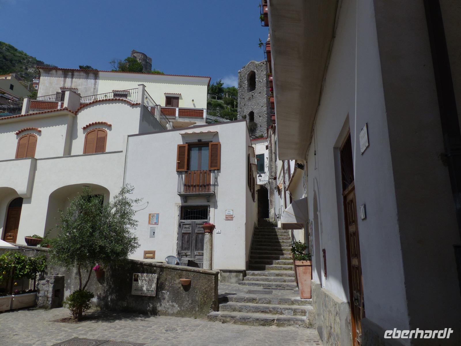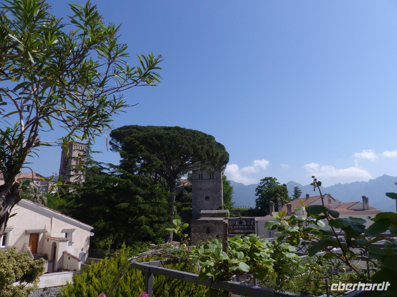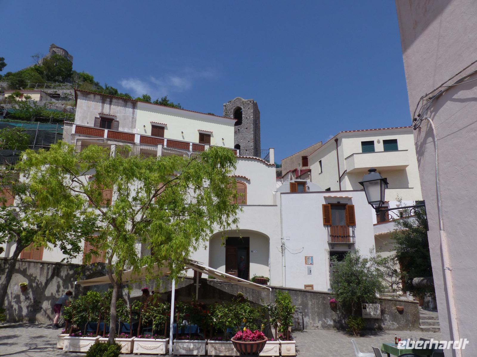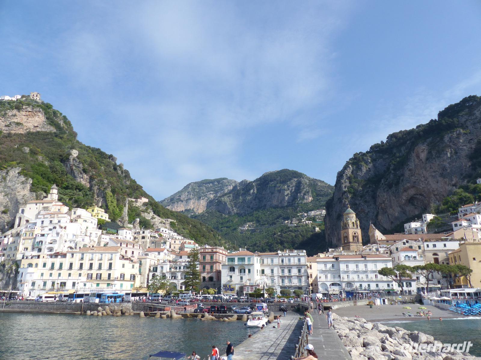 In den Bergen hingen die Wolken. Da bleibt man am besten unweit des Meeres. Der Sentiero dei Limoni ist eine Küstenwanderung, die es allerdings in sich hat. Eben ist die Küste hierzulande nun mal nicht. Wir starteten in Maiori, wanderten an der Kirche vorüber und bewundeten nun von oben die Kuppeln, die mit gelben und grünen Majolikafliesen gedeckt sind, genossen den Blick auf die Küste und erreichten schließlich Minori. Ich hatte einige Tage zuvor eine Runde Zitronenkekse ausgegeben, und diese stammten aus Minori. „Die möchte ich mit nach Hause nehmen," sagte sich nicht nur ein Gast sondern gleich mehrere. Der Herr Konditor strahlte mich an. Gäste wie mich, die gleich 13 andere mitbringen, die hätte er gerne jeden Tag hier... Ein Gast betrachtete die trüben Wolken am Himmel und zog es vor, den Rest des Tages indoor zu verbringen. Vielleicht war es auch die Aussicht auf die steile Treppe, die uns nun bevorstand, die diesen Gast davon abhielt weiterzuwandern. Die Weiterwandernden schwitzten kräftig, obwohl sich die Sonne heute nicht zeigte. Aber auch der Regen hielt sich zurück. Es tröpfelte zwar immer mal wieder, aber das war's dann auch. Eine kleine Pause legten wir am Friedhof ein und dann ging's hoch nach Torello. Hier war dann ganz unvermutet die Welt mit Brettern vernagelt. Baumfällarbeiten in der Felswand unterhalb von Ravello. Wir mussten also einen Umweg gehen. Und dieser führte über eine Treppe, die nicht mehr enden wollte, den Hang hinunter. Dann erreichten wir einen wunderschönen Querweg. Der wäre eh unser Ziel gewesen. Rote Spornblumen überwucherten unseren Pfad, der schließlich mit herrlicher Aussicht auf die Barockkirche Santa Maria Maddalena, die malerisch oberhalb des Meeres am Ortsrand von Atrani liegt, zur Küste hinabführte. Mit dem öffentlichen Bus reisten wir nun nach Minori zurück und ich lud die Gruppe, die sich die gute Laune durch ein paar Wolken nicht vermiesen ließ, noch in eine bekannte Konditorei zum Schlemmen ein. Danach fuhren wir per Bus wieder zurück nach Maiori und hatten so die regenarme Zeit optimal genutzt, denn am Abend brachen Gewitter über die Küste herein - so wie vorhergesagt - und wir schlemmten weiter, und zwar in unserem Hotel. Das war ein regnerischer Tag, der diese Gruppe aber nicht aus der Ruhe brachte und alle genossen gut gelaunt ihren Urlaub.