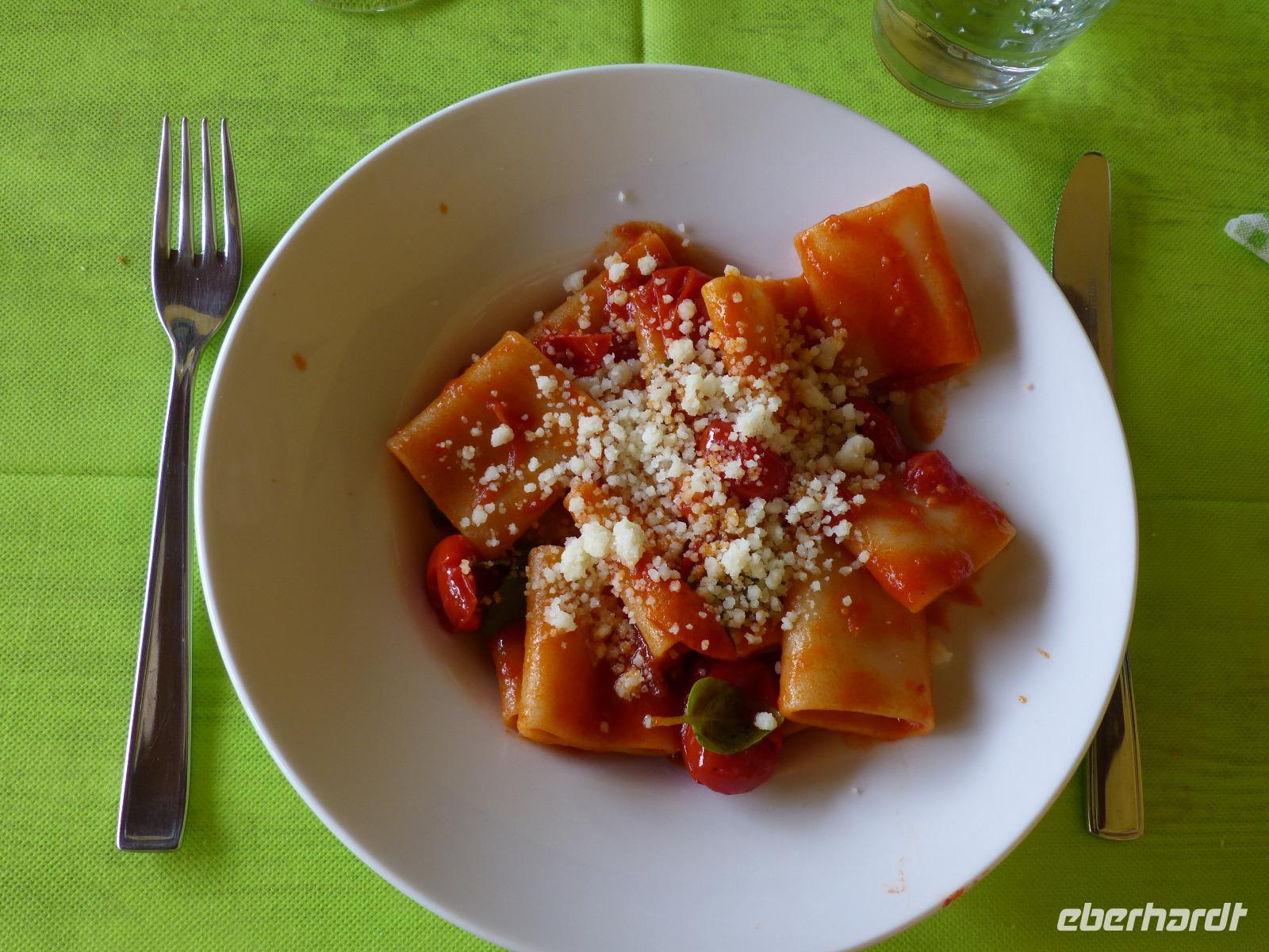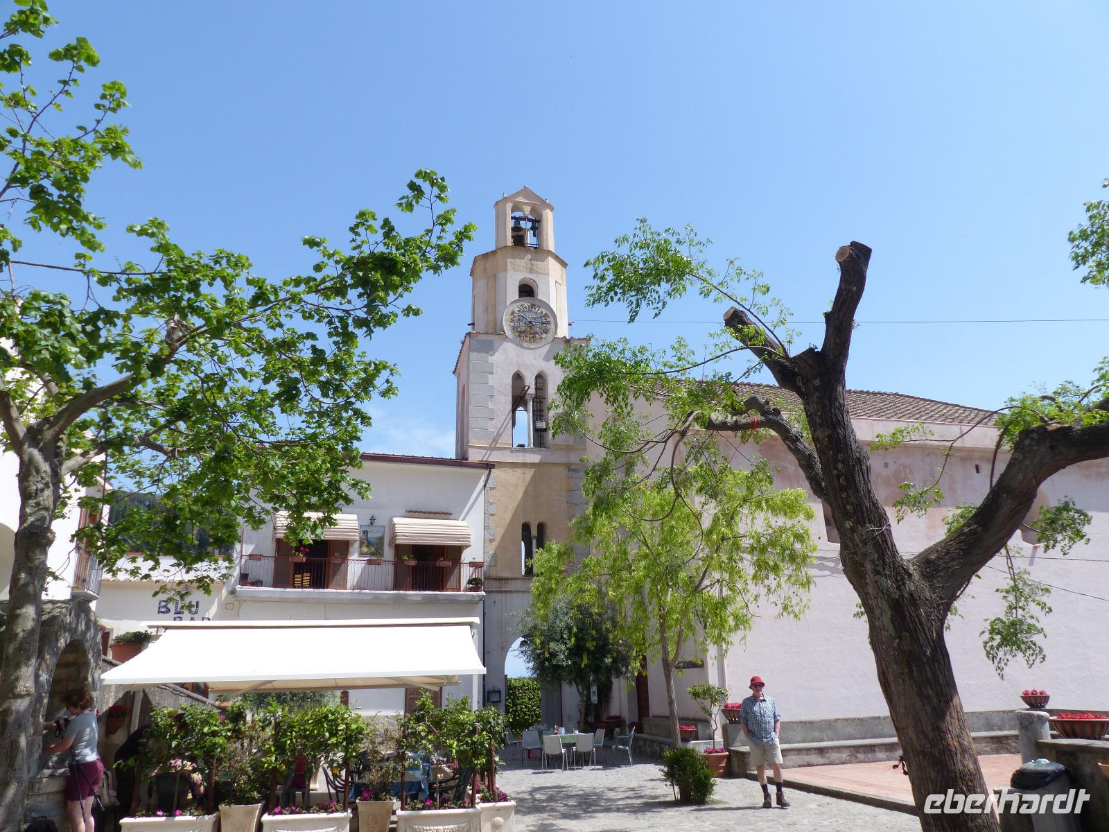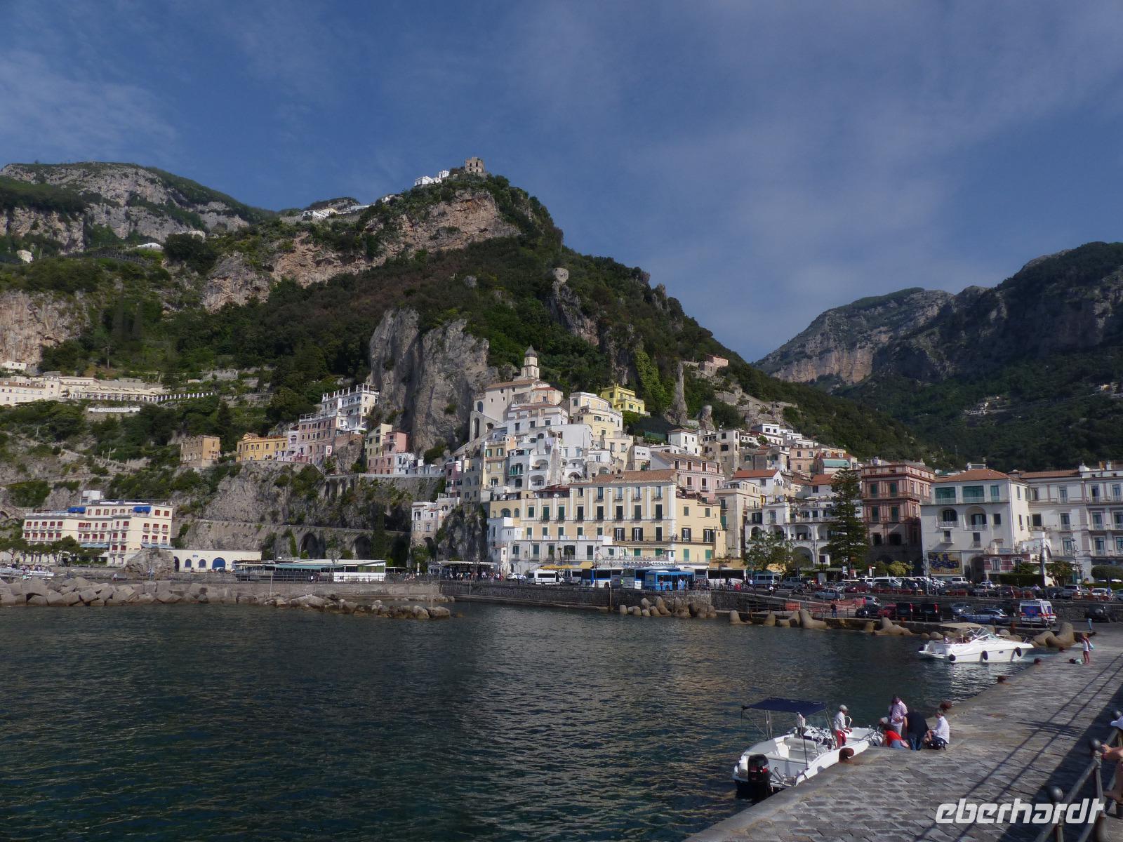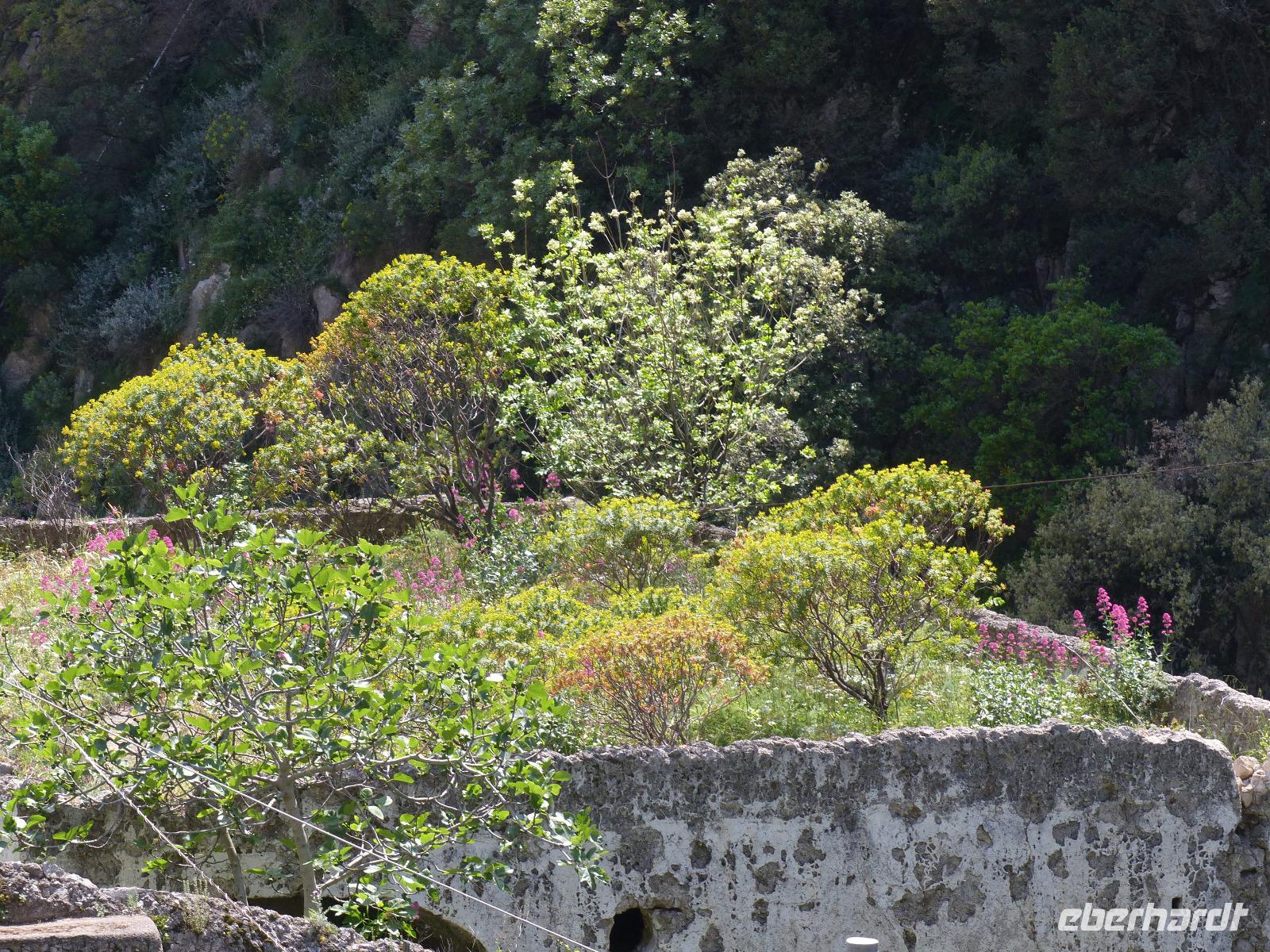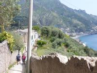 Unser gecharterter Bus brachte uns nach Amalfi. Vom Pier aus liegt der Ort in seiner ganzen Pracht vor dem Besucher. Dann bewunderten wir die ganzjährig aufgestellten Weihnachtskrippen und ließen uns durch das Papiermuseum führen. Danach zogen wir los, durch Zitronenhaine am Ortsrand aufwärts ins Mühlental. Bald schon ließen wir die Zitronenbäumchen hinter uns und durchwanderten das herrliche Valle dei Mulini, das Mühlental. Hier passierten wir überwucherte alte Gemäuer, die von verfallenden Papiermühlen stammten, und malerische Wasserfälle. Nach einem regnerischen Frühjahr wurden aus Rinnsalen richtige Flüsse und überall plätschte das Wasser. Unser Weg schlängelte sich durch Wald aufwärts. Am Wegesrand blühten viele Frühlingsblumen. An einer alten Eisenhütte machten wir noch einen Abstecher und suchten uns eine Stelle für eine kleine Pause. Durch die Feiertage bedingt nutzte die Jugend Neapels das Tal zum Picknicken und dadurch war viel los im Mühlental. Dann folgte ein letzter Anstieg und es bot sich eine herrliche Aussicht auf Amalfi hinunter, bevor wir in Pontone auf dem Kirchplatz leckere Antipasti und Salate aufgetischt bekamen. In Atrani, das wir am Nachmittag erreichten, gönnten wir uns ein Eis, bevor wir nach Amalfi zurückwanderten. Nun zogen die ersten Wolken auf, denn am Mittag war der Himmel blitzblau gewesen. In Amalfi besichtigten wir dann noch den interessanten Dom Sant' Andrea, bevor wir in See stachen. Die Rückreise nach Maiori erfolgte mit einem flotten Linienschiff. Es war sommerlich warm und einige Gäste wagten sich in die erfrischenden Fluten des Mittelmeers am schönen langen Strand von Maiori. „Wenn man erst mal drin ist findet man es wirklich warm," so die Wassertester. Welch ein Genuss! Wir hatten 28 Grad und da war dieses Bad dann herrlich. Und wir ließen uns zum Abschluss dieses schönen ersten Wandertages wie jeden Abend das schmackhafte Abendessen munden.