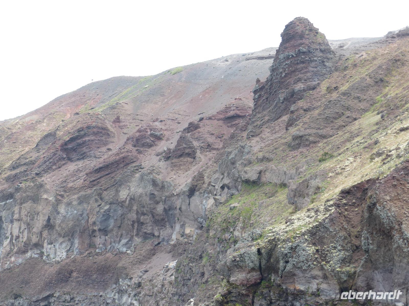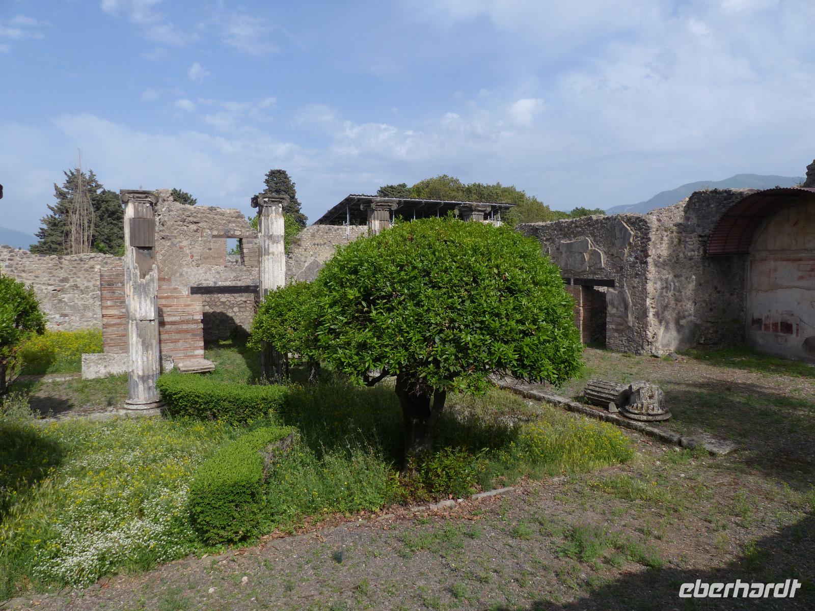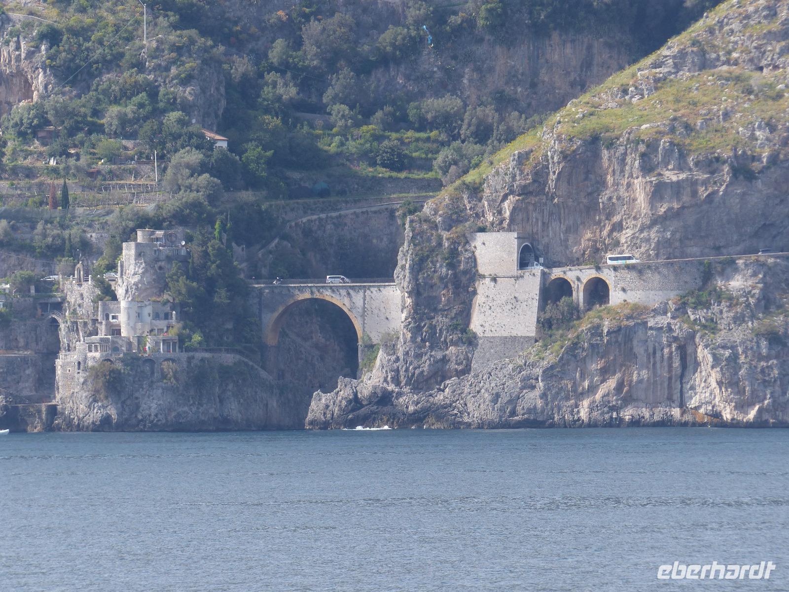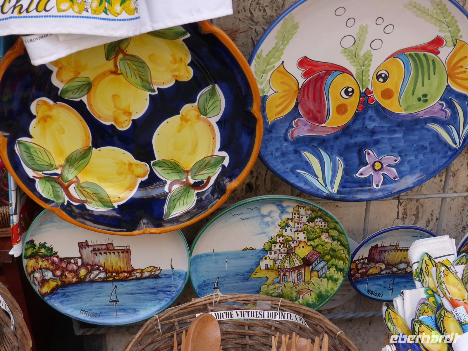 Regen war vorhergesagt für den Vormittag. Aber allen Unkenrufen zum Trotz blieb es trocken. Wir starteten nun auf der Küstenstraße in Richtung Vietri sul Mare, genossen die herrlichen Blicke auf die Küste und die Tatsache, dass wir hier selbst nicht hinterm Steuer saßen. Dann sausten wir über die Autobahn auf den Vesuv zu. Bei Torre del Greco verließen wir die Autobahn und wenig später schon quälte sich der Bus zwischen erstarrter Lava und Pinien aufwärts. Die Spuren des Feuers aus dem letzten Sommer waren noch sichtbar, aber die Natur erobert sich Stück für Stück ihr Territorium zurück. Und die Brandzone liegt weit weg von unserem Ziel, am Fuße des Berges. Es war ein bisschen trüb, aber wir hatten Aussicht bis nach Neapel hinunter. Unser Blick fiel in den Krater hinein, in der Ferne lag Pompei im Dunst und auf der gegenüberliegenden Seite des Kraterrandes fand eine geologische Spezialführung statt, deren Teilnehmer wie Ameisen am Kraterrand entlangturnten. Zumindest sah dies für uns so aus. Vermutlich war ihr Weg nicht ganz so abenteuerlich wie es aussah. Danach landeten wir in einem kleinen Weinberg, verborgen hinter hohen Mauern und vergnügten uns mit den Tränen Christi. So heißt der Wein, der am Vesuv wächst. Und dazu gab es wieder etwas Leckeres zu Essen. Und eine herzliche Dame, die uns sehr gut verköstigte, führte uns auch durch die Kelterei und erklärte uns wie man Weinstöcke verjüngt. Manch einer nahm die Tränen von Christus sorgfältig verpackt im Koffer mit nach Hause. Am Nachmittag fuhren wir dann etwas beschwingt weiter in Richtung Pompei. Dort trafen wir Nicola, der uns durch ruhige Winkel in der ausgegrabenen Stadt führte. Und bald schon kam die Sonne raus und wir genossen den späten Nachmittag bei blauem Himmel in der Ruinenstadt. Dass die Bewohner Pompeis einen flotten Lebenstil hatten, erfuhren wir und auch wie man sich bildlich über Sprachbarrieren hinweghalf. Wir besichtigten eine ausgegrabene Bäckerei, Villen, die Unterkünfte der Gladiatoren, Märkte und das Odeon, warfen aber auch einen Blick auf einige Gipsfiguren, die den Umriss der Verunglückten preisgeben, die beim Vulkanausbruch 79 n.Chr. ums Leben kamen. Nachdem diese interessante Führung durch einen Teil der verschütteten Stadt zu Ende ging, flitzten wir wieder zu unserem Hotel zurück. In unserem Hotel wartete natürlich am Abend wieder ein sehr gutes Essen auf uns. Leider musste ich aber am Abend meinen Gästen verkünden, dass der Capriausflug, der am nächsten Tag hätte stattfinden sollen, wegen Sturmwarnung nicht stattfinden konnte. Die Boote fuhren nicht. Aber ich überlegte mir gleich ein Alternativprogramm, nachdem ich das Internet intensiv nach dem Wetter an der Amalfiküste befragt hatte.
