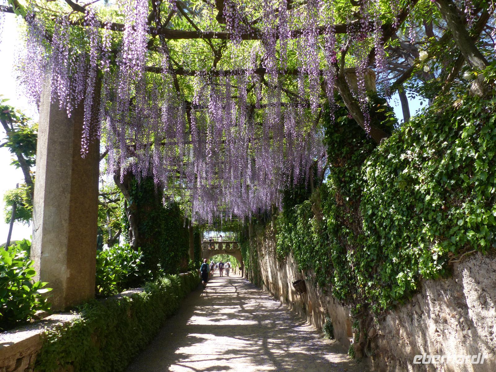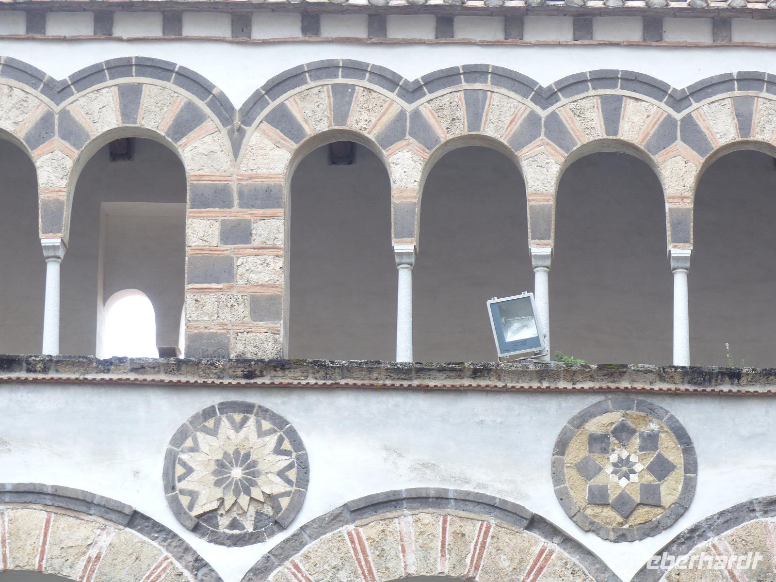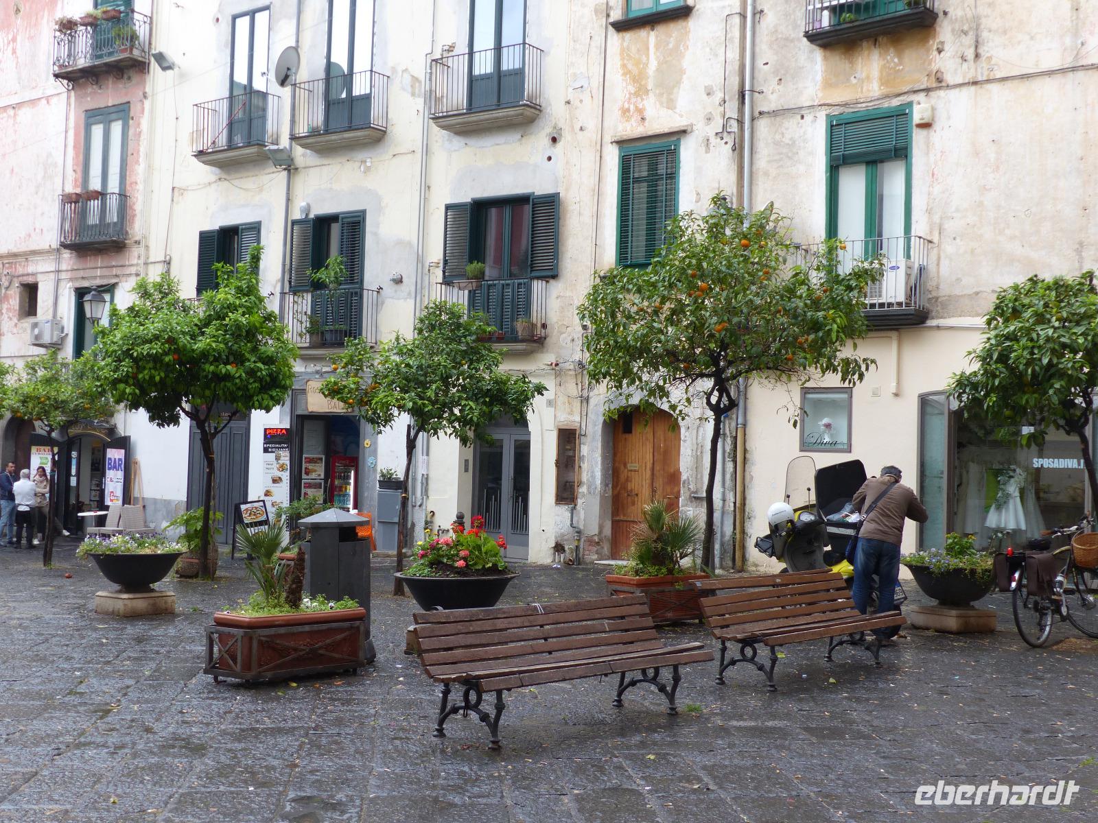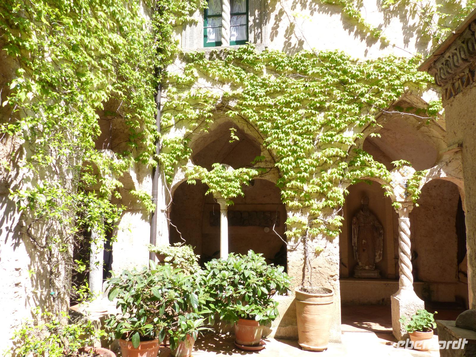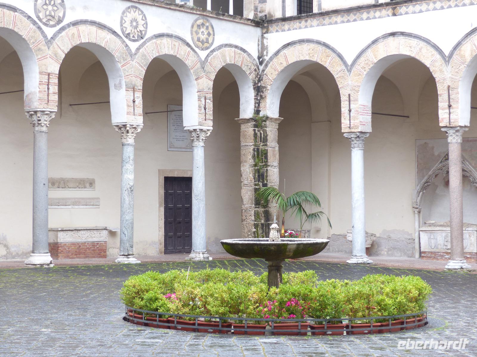 Die letzte offizielle Wanderung hätte uns ins Valle delle Ferriere führen sollen. Auch das sollte nicht sein! Die Vorhersage versprach uns nicht nur stärkeren Regen, sondern Gewitter mit Blitzen in den Bergen. Was ist dieses Frühjahr nur am Mittelmeer los - das deutsche Fernsehen hatte am Vorabend von Unwettern auf Mallorca berichtet, während in Deutschland die Sonne schien. Nun denn. Wir planten mal wieder um. Unser heutiges Ziel war Salerno. Aus dunkelgrauen Wolken wurden hellgraue Wolken, die uns ab und zu mal mit einem kleinen Schauer versorgten, aber der starke Dauerregen und die Blitze waren irgendwo anders heruntergegangen. Wir bummelten durch die Fußgängerzone und besuchten den Dom. Was für ein schönes Bauwerk! Der braucht sich hinter dem Dom von Amalfi gar nicht zu verstecken. Im Kreuzgang kann man noch die Reste des römischen Tempels erkennen, der hier früher einmal stand, denn Salerno ist eine alte Stadt, deren Ursprünge weit in vorchristlicher Zeit liegen. Der Dom selbst wurde zu Beginn der Herrschaft der Normannen gebaut. Und die Normannen hatten ein Händchen wenn es darum ging, verschiedene Kulturen zusammenzuführen. Die massiven Rundbögen der romanischen Architektur bekamen Gesellschaft von den golden glitzernden Fresken der Byzantiner und den farbenfrohen geometrischen Mustern am Ambon und auf dem Boden, die von den Arabern gerne verwendet wurden. Danach zogen wir weiter bergauf zum Garten der Minerva. Athene, die Göttin der rationellen Kriegsführung, die in ihrem Schild das Haupt der Medusa trägt, wird von den Römern Minerva genannt. Nach ihr ist dieser Kräuter- und Medizingarten benannt, der sich aussichtsreich über 4 Terrassen am Steilhang zieht und Informationen zu alten Heilmethoden gibt. Auch das Haupt der Medusa kann man hier finden - als Brunnenfigur. Wir haben ihr ins Gesicht gesehen - die alte Dame ist wohl in die Jahre gekommen, denn ihr Blick ließ uns nicht zu Stein erstarren. Dieser Garten ist ein wirklich lohnendes Ziel in Salerno! Nach unserem Gartenbesuch durchstreunten wir die Gassen und fanden schließlich was wir suchten: den öffentlichen Aufzug in die Unterstadt. Dort machten wir es uns in einer Pizzeria gemütlich und schlemmten mal wieder. Nicht nur Pizza, v.a. begeisterten uns die fischhaltigen Vorspeisen. Antipasti mal ganz anders! Dann kam sogar die Sonne raus und am Nachmittag reisten wir wieder zurück nach Maiori. Dort stellten wir fest, dass wir genau das Richtige getan hatten, denn über Maiori brach das große Dunkelgrau an, das sich über die Berge geschoben hatte und bedenklich grummelte. Es hatte dort wohl den ganzen Tag die Urlauber donnernd genervt. Wir hatten dagegen in Salerno einen schönen Tag, der zwar so nicht geplant gewesen war, aber es hatte uns Spaß gemacht diese Stadt zu entdecken, und der eine oder andere fragte mich, ob wir diesen schönen Ausflug nicht ins reguläre Programm aufnehmen würden. Nun ja - es gibt so viele schöne Dinge zu sehen, rund um Amalfi...
