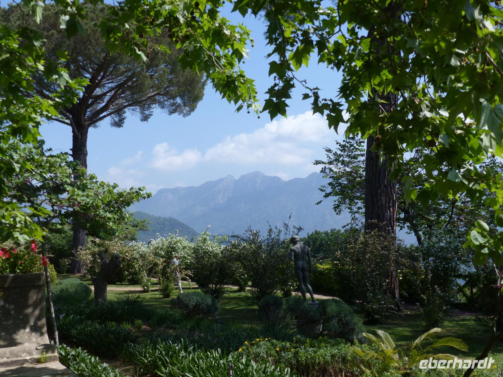 Bei strahlend blauem Himmel fuhren wir nach Ravello. Wir besuchten den Dom und machten einen Abstecher zu einem herrlichen aussichtsreichen Gärtchen zwischen alten Palazzi, die nun alle als 5-Sterne-Hotels dienen. Dann bummelten wir durch den Ort und erfreuten uns der herrlichen Blumen, der schönen Aussicht und der malerisch plazierten Plastiken im Park der Villa Cimbrone. Die Glyzinie blühte noch und bildete lange hängende Blütenschnüre über unseren Köpfen. Der Blick über die ganze Küste begeisterte uns. Wir nutzten diese malerische Ecke und das schöne Wetter für ein Gruppenfoto - eine gute Erinnerung an diesen gelungenen Tag. Und wir ließen uns auf schattigen Bänkchen nieder zum Picknick. Dann starteten wir zu unserer Wanderung. Auf einem ruhigen Weg spazierten wir rund um Ravello herum und abwärts nach Torello und weiter über einen Treppenpfad zwischen blühenden Granatapfelbäumen und Oliven hinunter nach Maiori. Dort spendierte ich eine Runde Eis im Cafe Europa bei Anna, die uns herzlich empfing. Mit dem öffentlichen Bus schaukelten wir dann in 5 Minuten nach Maiori zurück. Aber nicht alle wollten fahren, wir hatten auch durchtrainierte Bergziegen mit dabei, die gerne noch eine halbe Stunde Fußmarsch angehängt haben. Die Busfahrer stürzten sich nach ihrer Ankunft in Maiori teils wieder in die Fluten, denn das Wetter war sonnig und warm.