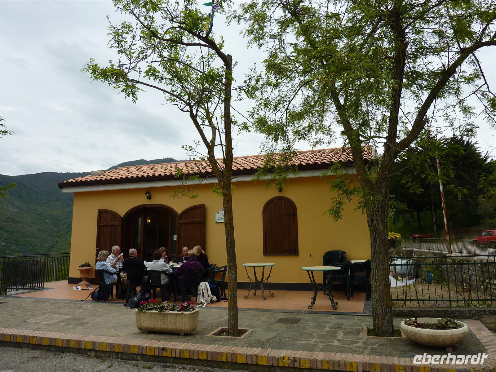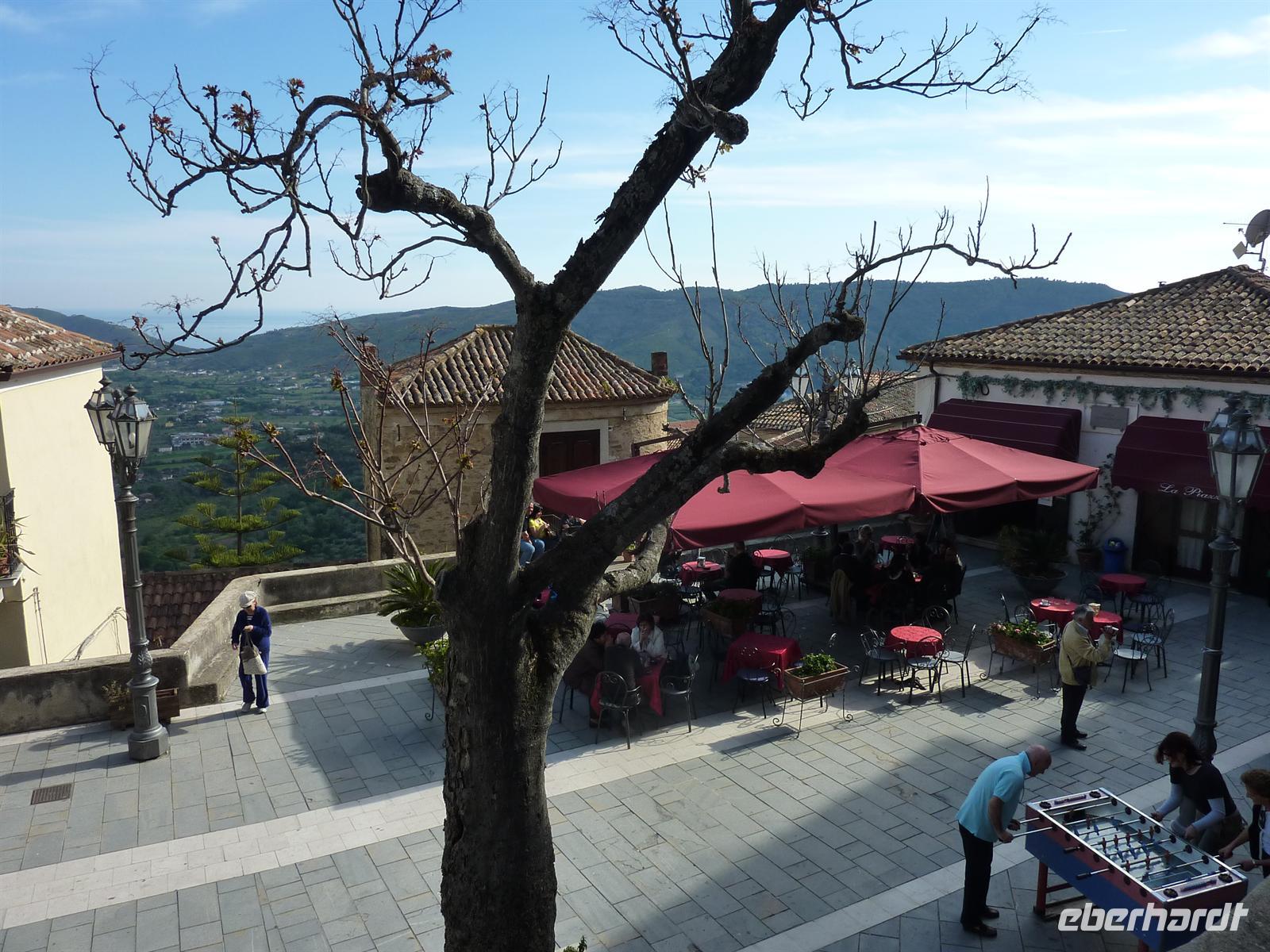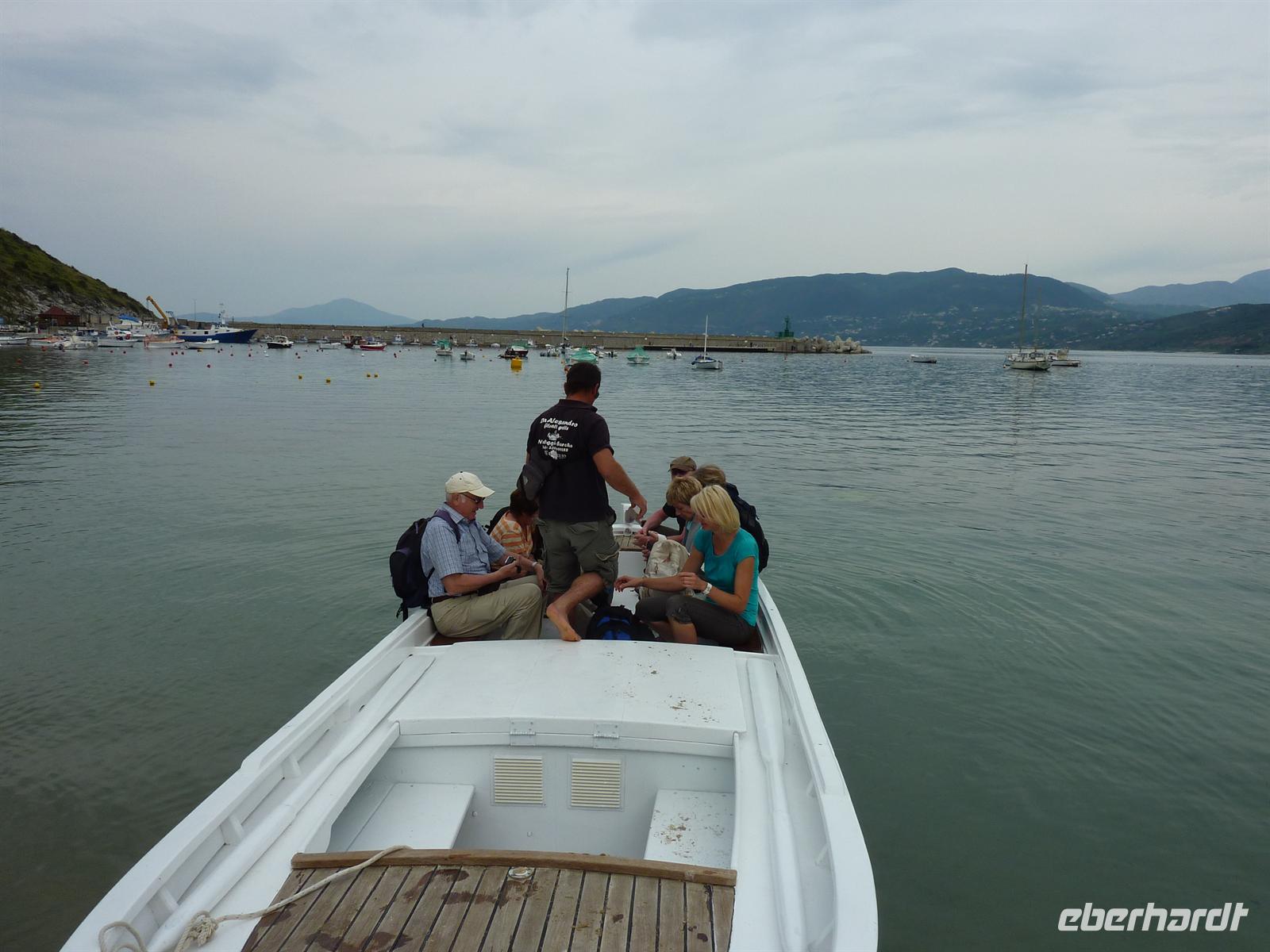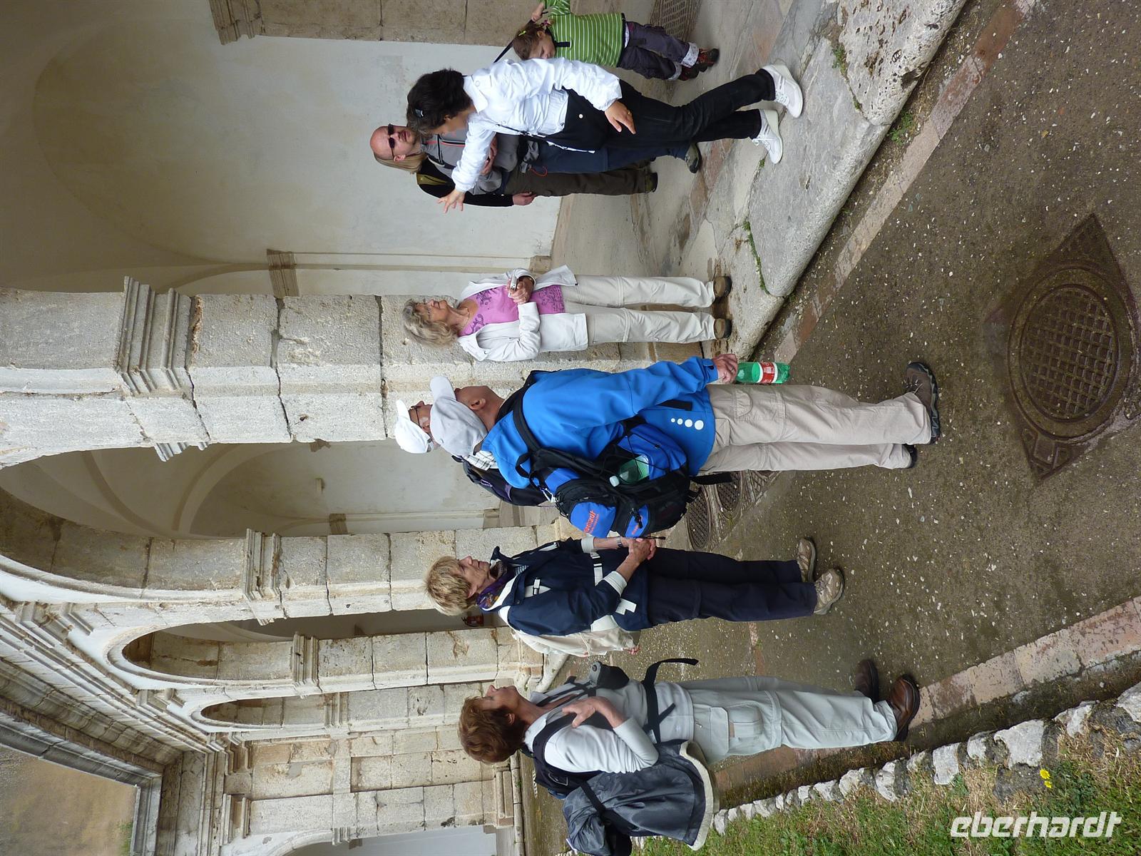 In den frühen Morgenstunden werden wir alle von unseren Wohnorten abgeholt und zum Flughafen Berlin-Schönefeld chauffiert. Hier lernen wir uns alle kennen: die angenehm kleine Wandergruppe mit 10 erwachsenen Personen und zwei kleinen, knapp 4 Jahre alten, Mädchen Svenja und Sophia. Per Direktflug gelangen wir nach 2 ½ Stunden Flugzeit nach Neapel. Hier holt uns Wanderführer Maurizio ab und bringt uns zu unserem Domizil für die nächsten Nächte - das Grand Hotel Santa Maria in Santa Maria di Castellabate. Wir beziehen unsere Zimmer, von denen wir alle freien Blick auf die Bucht von Salerno genießen können. Das Mittagessen geht italienisch turbulent zu - es gibt reichlich Nudeln in einem mit Italienern gut gefüllten Hotelrestaurant mit entsprechender Geräuschkulisse.Nach der kleinen Stärkung sind wir wieder voller Elan und besuchen am Nachmittag das Kastell von Castellabate, das 280m hoch über dem Meer auf einer Anhöhe liegt. Wir können die Vorbereitungen für eine Hochzeit im Kastell beobachten und erfreuen uns an dem herrlichen Ausblick auf die unter uns liegende Meeresbucht. Anschließend bummeln wir durch den historischen Ortskern mit den engen Gassen, romantischen Gassen und dicht aneinander stehenden Häusern. In der romanischen Basilika von Castellabate erfahren wir bei einer Führung viel Wissenswertes über die Entstehung des Ortes; wichtigster Kunstschatz in der Kirche ist ein Gemälde aus dem 15. Jh. Auf der kleinen, romantischen Piazza genehmigen wir uns den ersten, wirklich guten italienischen Cappuccino oder einen Espresso! Hmm, schmeckt wirklich wie beim Italiener! - Und das bei strahlendem Sonnenschein.Beim Abendessen sind wir stolz, dass wir so einen überaus langen Tag erfolgreich gemeistert haben. Wir werden alle mit einer Kleinigkeit vom Eberhardt-Osterhasen belohnt. Auch die Kleinsten haben an diesem Tag bis zum Abendessen durchgehalten. Wir sind am Abend so müde, dass uns ein kurzzeitiger Stromausfall im Hotel nicht mehr aus der Ruhe bringt.