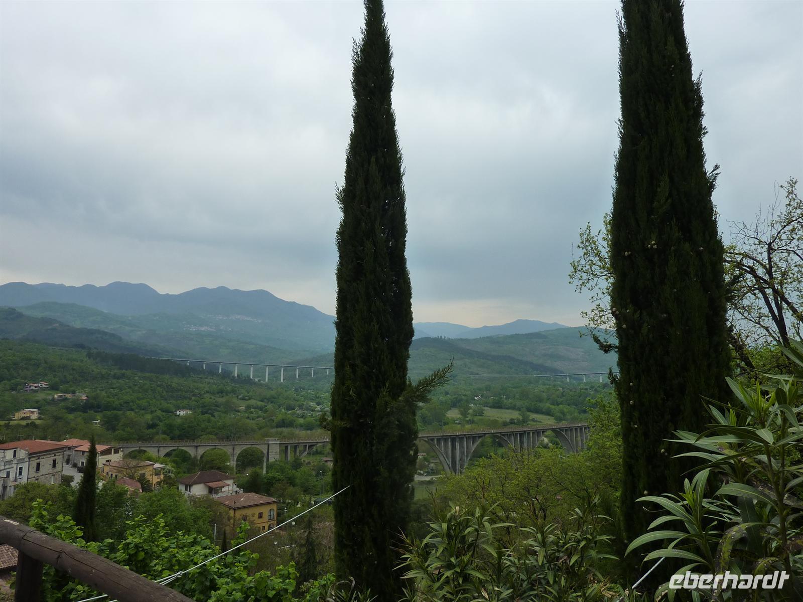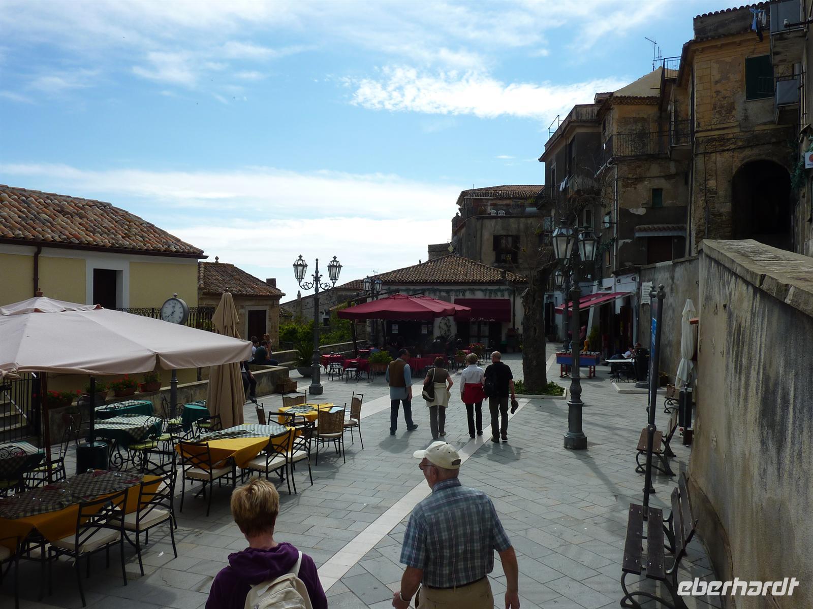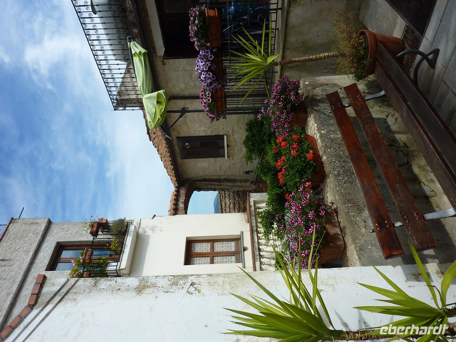 In den frühen Morgenstunden werden wir alle von unseren Wohnorten abgeholt und zum Flughafen Berlin-Schönefeld chauffiert. Hier lernen wir uns alle kennen: die angenehm kleine Wandergruppe mit 10 erwachsenen Personen und zwei kleinen, knapp 4 Jahre alten, Mädchen Svenja und Sophia. Per Direktflug gelangen wir nach 2 ½ Stunden Flugzeit nach Neapel. Hier holt uns Wanderführer Maurizio ab und bringt uns zu unserem Domizil für die nächsten Nächte - das Grand Hotel Santa Maria in Santa Maria di Castellabate. Wir beziehen unsere Zimmer, von denen wir alle freien Blick auf die Bucht von Salerno genießen können. Das Mittagessen geht italienisch turbulent zu - es gibt reichlich Nudeln in einem mit Italienern gut gefüllten Hotelrestaurant mit entsprechender Geräuschkulisse.Nach der kleinen Stärkung sind wir wieder voller Elan und besuchen am Nachmittag das Kastell von Castellabate, das 280m hoch über dem Meer auf einer Anhöhe liegt. Wir können die Vorbereitungen für eine Hochzeit im Kastell beobachten und erfreuen uns an dem herrlichen Ausblick auf die unter uns liegende Meeresbucht. Anschließend bummeln wir durch den historischen Ortskern mit den engen Gassen, romantischen Gassen und dicht aneinander stehenden Häusern. In der romanischen Basilika von Castellabate erfahren wir bei einer Führung viel Wissenswertes über die Entstehung des Ortes; wichtigster Kunstschatz in der Kirche ist ein Gemälde aus dem 15. Jh. Auf der kleinen, romantischen Piazza genehmigen wir uns den ersten, wirklich guten italienischen Cappuccino oder einen Espresso! Hmm, schmeckt wirklich wie beim Italiener! - Und das bei strahlendem Sonnenschein.Beim Abendessen sind wir stolz, dass wir so einen überaus langen Tag erfolgreich gemeistert haben. Wir werden alle mit einer Kleinigkeit vom Eberhardt-Osterhasen belohnt. Auch die Kleinsten haben an diesem Tag bis zum Abendessen durchgehalten. Wir sind am Abend so müde, dass uns ein kurzzeitiger Stromausfall im Hotel nicht mehr aus der Ruhe bringt.