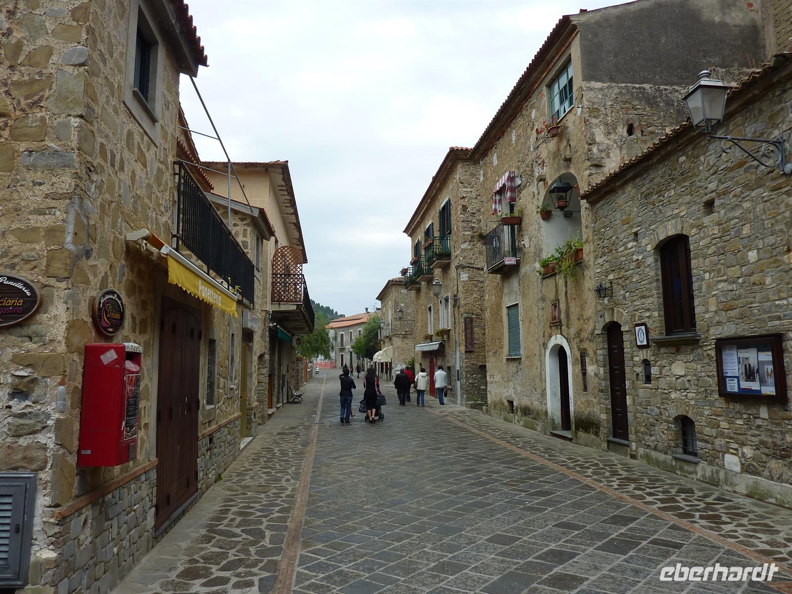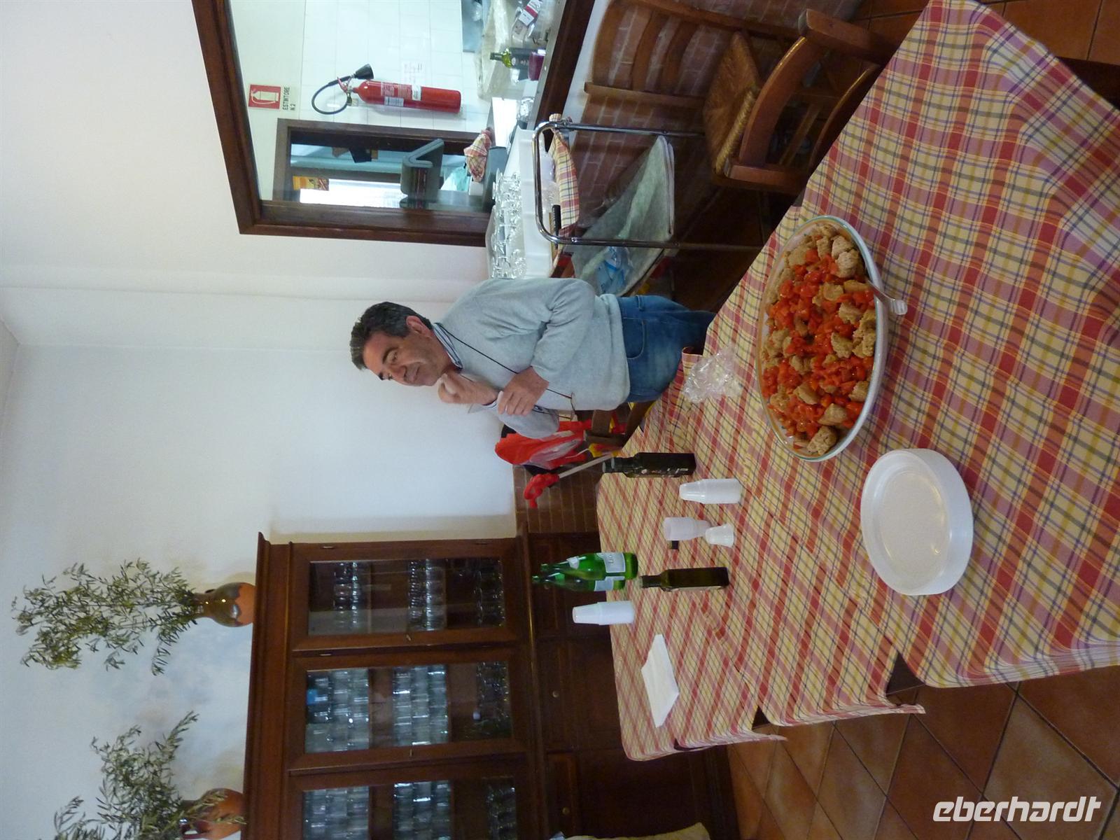 Nach bangem Hoffen erwartet uns an diesem Tag prächtiges Wander-Wetter, nicht zu warm, ein bisschen bewölkt und vor allem kein Regen. Wir machen uns auf zum Ausgangsort unserer heutigen Wanderung, dem kleinen Bergdörfchen Perdifumo. Von hier aus startet der Wanderweg die ersten 20 Minuten ziemlich steil bergan und wir kommen ganz schön außer Puste. Dafür werden wir jedoch mit einem herrlichen Ausblick auf die kleinen Berg- und Küstendörfer, die mediterrane Landschaft und das schillernd blaue Meer im Hintergrund belohnt. Unterwegs bestaunen wir herrlich bunte Blüten am Wegesrand oder bleiben einfach mal stehen, um den Moment zu genießen. Die erste größere Pause legen wir bei 1025 Metern ein. Hier bietet sich ein spektakulärer Hintergrund für ein Gruppenbild unserer kleinen Wandergruppe.Wir steigen weiter bergan und erreichen nach reichlich 2 Stunden den Gipfel des Monte Della Stella auf 1130 Meter Höhe. Die kleine Gipfelkapelle ist der Madonna della Stella gewidmet. Der Abstieg führt uns durch wild verwachsene Landschaft und wir überwinden einige natürliche Hindernisse, bis wir zu unserem urromantischen Picknickplatz gelangen. Hier genießen wir Käse, Schinken, Olivenbrot und Antipasti - Köstlichkeiten aus der Region - und auch ein guter Schluck Rotwein aus dem Cilento fehlt nicht.Endstation unserer heutigen Wanderung ist der kleine verschlafene Ort Galdo. Auf dem kleinen Dorfplatz stärken wir uns mit Kaffee oder Cappuccino und werden zur Attraktion für die Einwohner des Dorfes.In der Olivenölmühle in San Mauro erfahren wir einiges über die Verarbeitung der Oliven im Cilento. Inzwischen werden auch hier eher modere Maschinen benutzt als die herkömmlichen Olivenölpressen. Wir verkosten das gute Öl entweder pur oder auf Brot mit Tomaten.Zurück in unserem Hotel erwartet uns ein kleiner Kochkurs mit den Chefköchen des Hauses. Wir bereiten Pasta mit Puffbohnen zu und erfahren einige Geheimnisse der italienischen Küche. Am Abend dürfen oder müssen ;-) alle Reiseteilnehmer von dem Gericht probieren, auch die, die nicht mitgekocht haben. Es schmeckt aber allen ziemlich gut! Der Abend klingt stimmungsvoll beim reichhaltigen Abendessen im Hotelrestaurant aus.