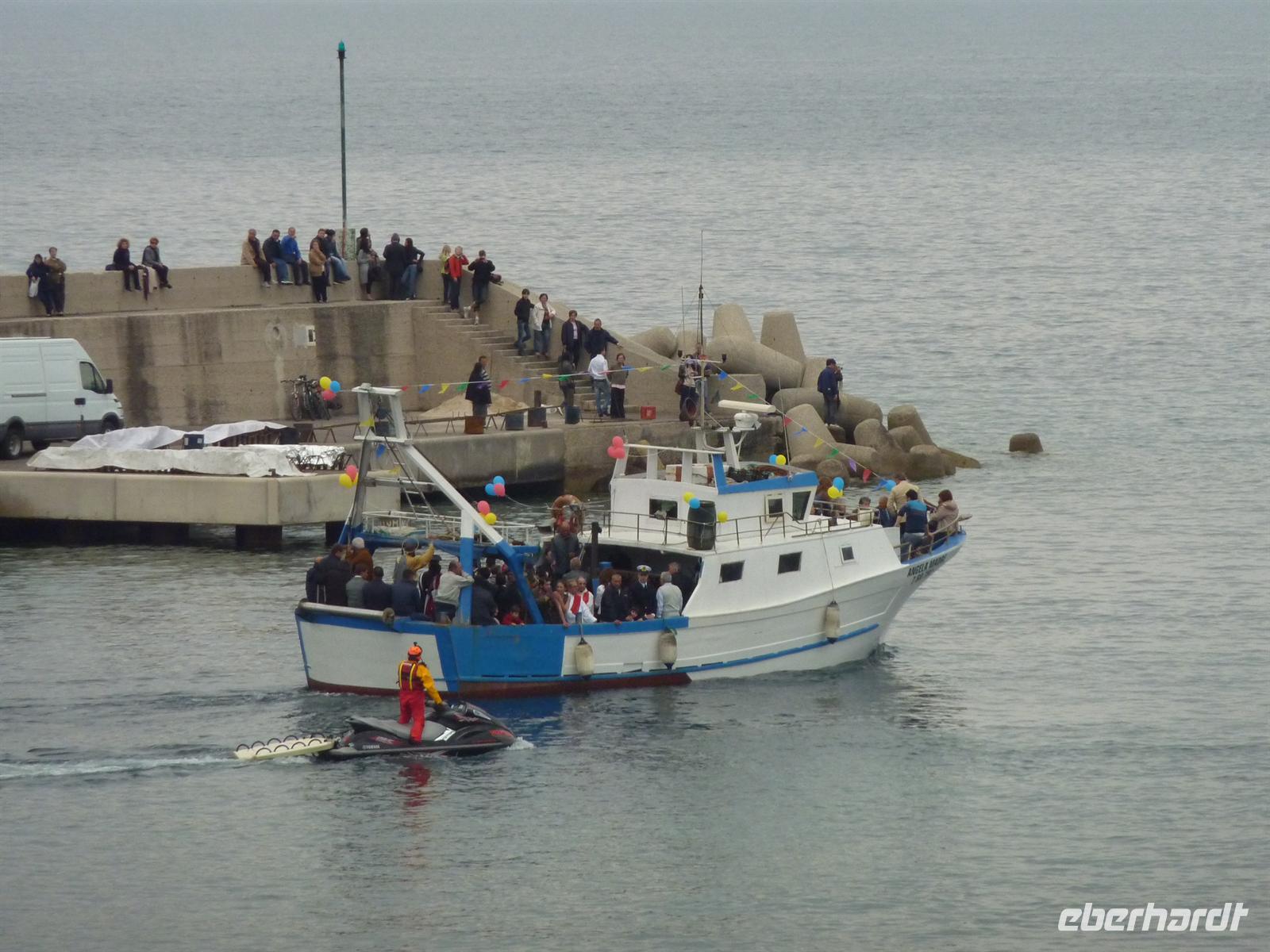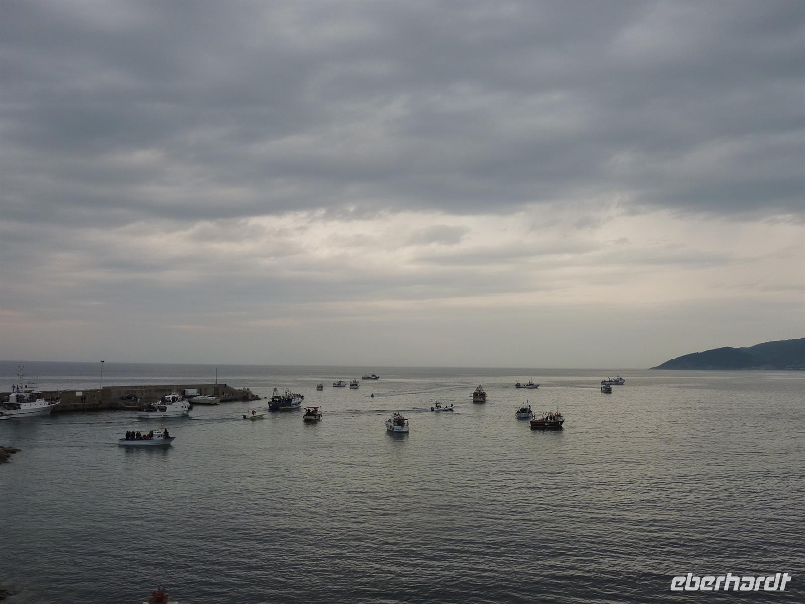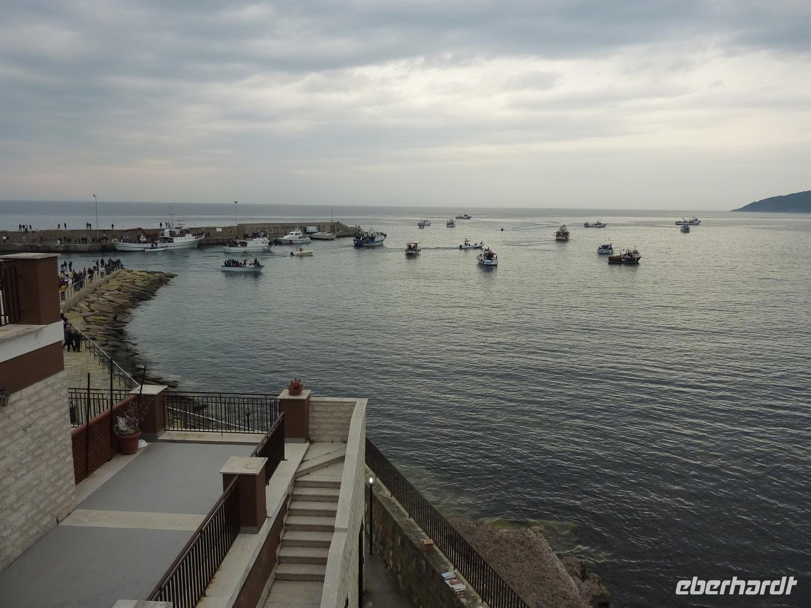 Am Morgen fahren wir mit unserem Bus nach Palinuro. Am Capo Palinuro erlitt laut Vergil, der unglückselige Steuermann und Gefährte des Äneas, Palinuro, Schiffbruch. Nach ihm wurde der kleine, romantische Fischerort benannt. Wir besteigen ein kleines Motorboot und fahren hinaus aufs Meer, um von dort aus die bekanntesten Grotten von Palinuro zu besuchen. Unser Steuermann fährt uns zur u.a. zur „Mönchsgrotte", zur „Schwefelgrotte" oder zu einer Grotte, in der man Überreste von Menschenknochen ansehen kann. Das Meer leuchtet in dunklem Blau und wir genießen den Blick auf die vorbeiziehenden, imposant aus dem Meer aufsteigenden Kalkfelsen vom Boot aus. Verträumte Buchten und weite Sandstrände säumen die Küste. Die Bootsfahrt ist entspannend und aufregend zu gleich, denn der doch etwas stärkere Wind bringt starken Seegang mit sich. Den Abschluss der Bootstour bildet der Besuch der „Blauen Grotte", die größte aller Grotten in der Umgebung von Palinuro. Hier bestaunen wir die intensive Blaufärbung des Wasser, die dadurch entsteht, dass Tageslicht durch einen Unterwassertunnel in die Grotta Azzura scheinen kann. Den geplanten Spaziergang oberhalb des Capo Palinuro können wir leider nur beginnen. Der Weg ist gleich am Anfang unvorhersehbar gesperrt worden. Leider weisen auch keine Schilder daraufhin, auch die örtliche Nationalparkverwaltung wusste bis einen Tag vorher nichts von dieser Sperre. Aber gut, das ist eben Italien, und das ganz im Süden. Wir wandern stattdessen direkt am Strand entlang zu unserem kleinen Mittagslokal. Hier stärken wir uns mit hausgemachten italienischen Spezialitäten -Tomaten mit Büffel-Mozarella, Fischspezialitäten oder Gemüse und Pasta. Einfach lecker! Auch durch den ein oder anderen kleinen Regenschauer lassen wir uns die positive Stimmung nicht verderben. Am Nachmittag fahren wir über das landschaftlich sehr reizvolle Mingardo-Tal nach San Severino di Centola. Das alte Bergdorf, von dem leider nur noch die Ruinen erhalten sind, liegt verschlafen oberhalb des Mingardo-Tales und bietet traumhafte Ausblicke. Bei unserem Besuch fühlen wir uns ein bisschen in die Zeit zurückversetzt, als die Menschen hier oben unter schwierigen Umständen leben mussten. Wirklich beeindruckend! Die alten Mauern lassen das Leben der Menschen damals für uns lebendig werden. In der alten „Osteria", einer ehemaligen Bar, genehmigen wir uns selbst mitgebrachten, cilentanischen Rotwein und traditionellen Osterkuchen! Wir können alles in vollen Zügen genießen - bis uns der einsetzende Regen zurück in den Bus zwingt. Am späten Nachmittag besuchen wir das kleine Dorf Acciaroli. Der bezaubernde Ortkern, der kleine lebendige Hafen und die schönen Geschäfte laden zu einem Bummel ein. Am Abend können wir im kleinen Fischerörtchen San Marco an einer Osterprozession teilnehmen. Wir erleben live zusammen mit den Einheimischen wie der Heilige des Ortes - San Marco - durch die Gassen des Ortes getragen wird und im Hafen auf Fischerboote verladen wird. An der Prozession nehmen fast alle Fischer des Ortes teil, sie eskortieren das Boot, auf dem der Heilige thront. Am Punta Licosa werden Blumen ins Meer geworfen, das soll Glück bringen und reichen Fang für alle Fischer des Ortes. Ein wirklich einmaliges Erlebnis!Das Abendessen nehmen wir wieder im Hotelrestaurant ein. Es ist erneut sehr reichhaltig und überaus schmackhaft. Nach einem erlebnisreichen Tag legen wir uns erfüllt schlafen und erwarten noch mehr schöne Dinge auf dieser Reise. Vor allem aber hoffen wir auf Sonne für den kommenden Tag! Buena notte!