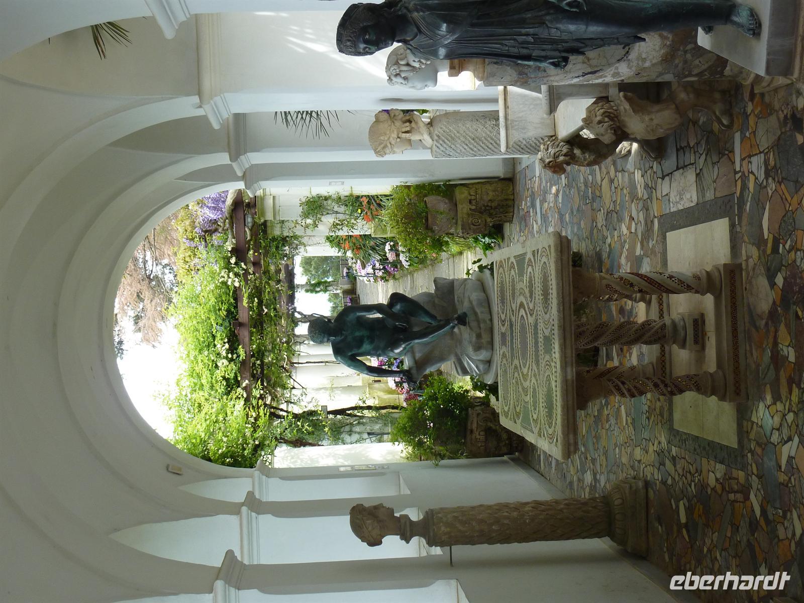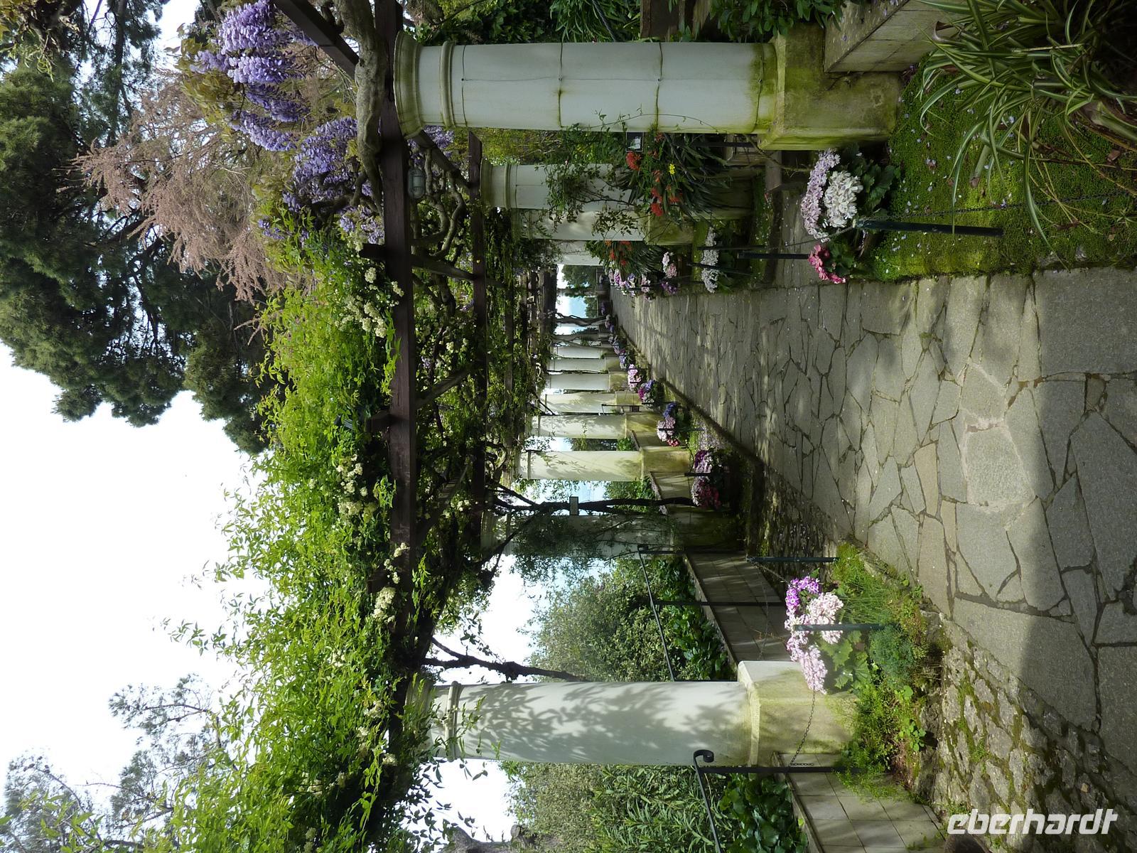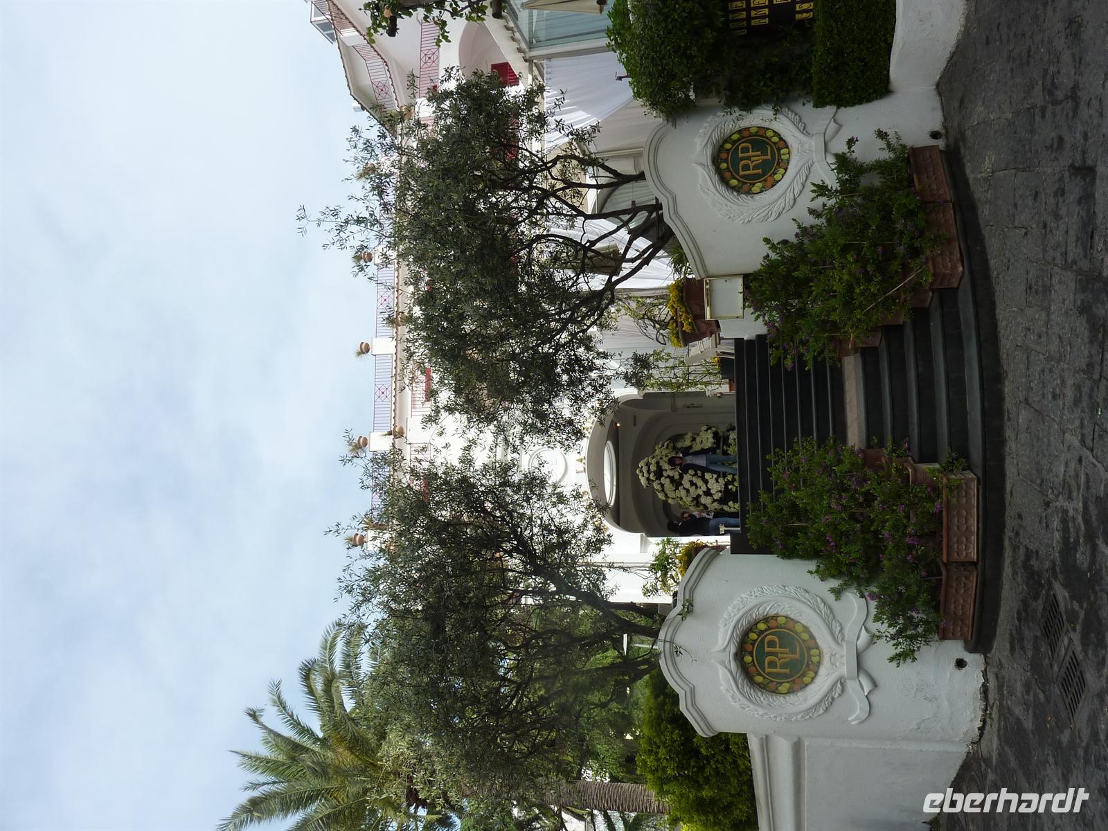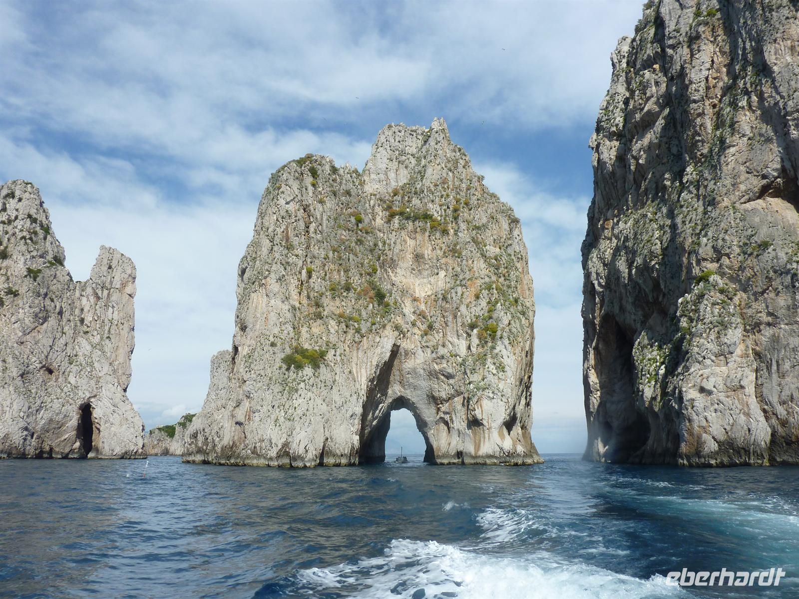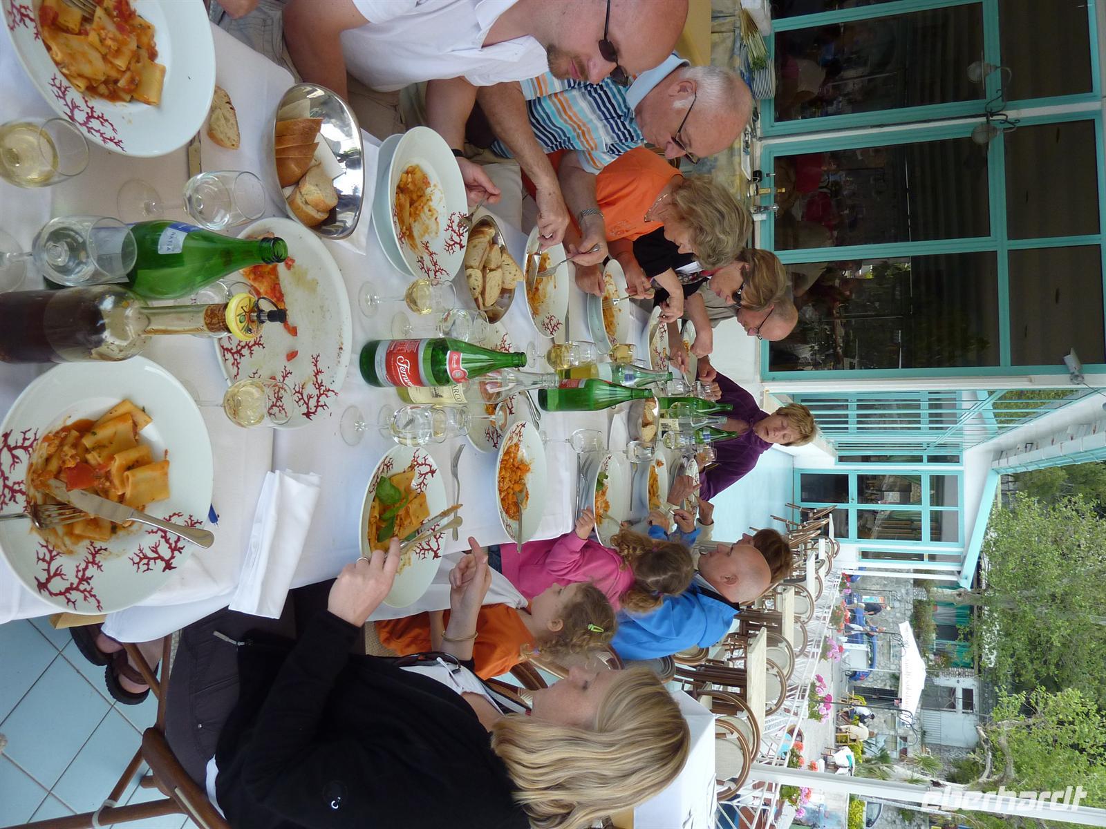 Mit Spannung wird das Wetter des heutigen Tages erwartet und wir können es kaum glauben, dass wir unsere Regenjacken an diesem Tag nicht benötigen. Am Vormittag wollen wir alle Höhepunkte von Capri besuchen, die wir am Vortag nicht sehen konnten. Wir beginnen unsere Tour direkt am Hotel und laufen zur Piazetta, dem zentralen Platz von Capri mit der Kirche von St. Stephano. Annamaria - unserer Reiseleiterin - führt uns durch die verwinkelten Gassen in Capri. Die Architektur und die traumhaften Ausblicke auf das Meer verzaubern uns, vor allem aber freuen wir uns über die Sonnenstrahlen, die mehr und mehr durch die Wolken brechen.Wir bummeln weiter zur Certosa di S. Giacomo, in der wir die zwei Kreuzgänge und ein kleines Museum mit Bildern von Diefenbach besichtigen. Von den Gärten der Certosa und einer kleinen Freiterrasse blicken wir zum ersten Mal auf die Wahrzeichen von Capri - die Faraglioni-Felsen. Auf der Via Krupp, benannt nach dem deutschen Stahlindustriellen, bummeln wir vorbei an den Augustusgärten zur Marina Piccola, dem kleinen Hafen von Capri. Hier stoßen wir erst einmal mit einem guten roten Landwein auf das heutige Wetter an. Wir verabschieden die kleinsten Reisegäste mit ihren Papas zur Mittagspause und fahren mit einem kleinen Bus weiter nach Anacapri. Annamarie kehrt zusammen mit uns in ein kleines Lokal zum Mittagessen ein. Wir stärken uns mit Pizza, Fisch oder Pasta und gut gefüllten Weingläsern! Für alle ist der anschließende Besuch der Villa S. Michele ein Höhepunkt unseres Aufenthaltes auf der Insel. Wir sehen die Innenräume mit teilweise erhaltener Originaleinrichtung von Axel Munthe. Ein wahrer Augenschmaus ist die riesige, üppig bewachsene Freiluftloggia, die uns einen atemberaubenden Rundumblick auf den Golf von Neapel, die Insel Ischia, die sorrentinische Halbinsel bis hin zur Amalfiküste bietet. Die Atmosphäre ist zauberhaft romantisch! Gern lädt Eberhardt TRAVEL zum Besuch dieser Villa ein als kleine Wiedergutmachung für die nicht möglichen Programmpunkte auf Capri!Den gelungenen Abschluss des heutigen Tages bildet einstündige Inselrundfahrt mit dem Boot. Wir bewundern die steilen Küsten der Insel, sehen die smaragdgrüne Grotte Verde leuchten und fahren durch den Bogen der berühmten Faraglioni-Felsen.Die Schlecker-Mäuler treffen sich später an der berühmtesten Eisdiele der Insel, um hausgemachte Gelati zu probieren.Zum Abendessen kehren wir in eines der berühmtesten Restaurants der Insel ein. Im „La Capannina" werden wir vom Chef-Kellner deutsch begrüßt und überaus freundlich bedient. Das 3-Gang-Menü ist überaus köstlich. Wir stimmen überein, dass wir hier die beste Pasta der gesamten Reise serviert bekommen haben. Die Stimmung ist angeheitert. Die Eberhardt-Reisebegleitung bedankt sich bei allen Teilnehmern mit einem kleinen persönlichen Gruß und ist sehr gerührt von der Ehrung durch der Reiseteilnehmer mit einem Bild und einem Likör von Capri! Danke! Es hat allen sehr viel Spaß gemacht!