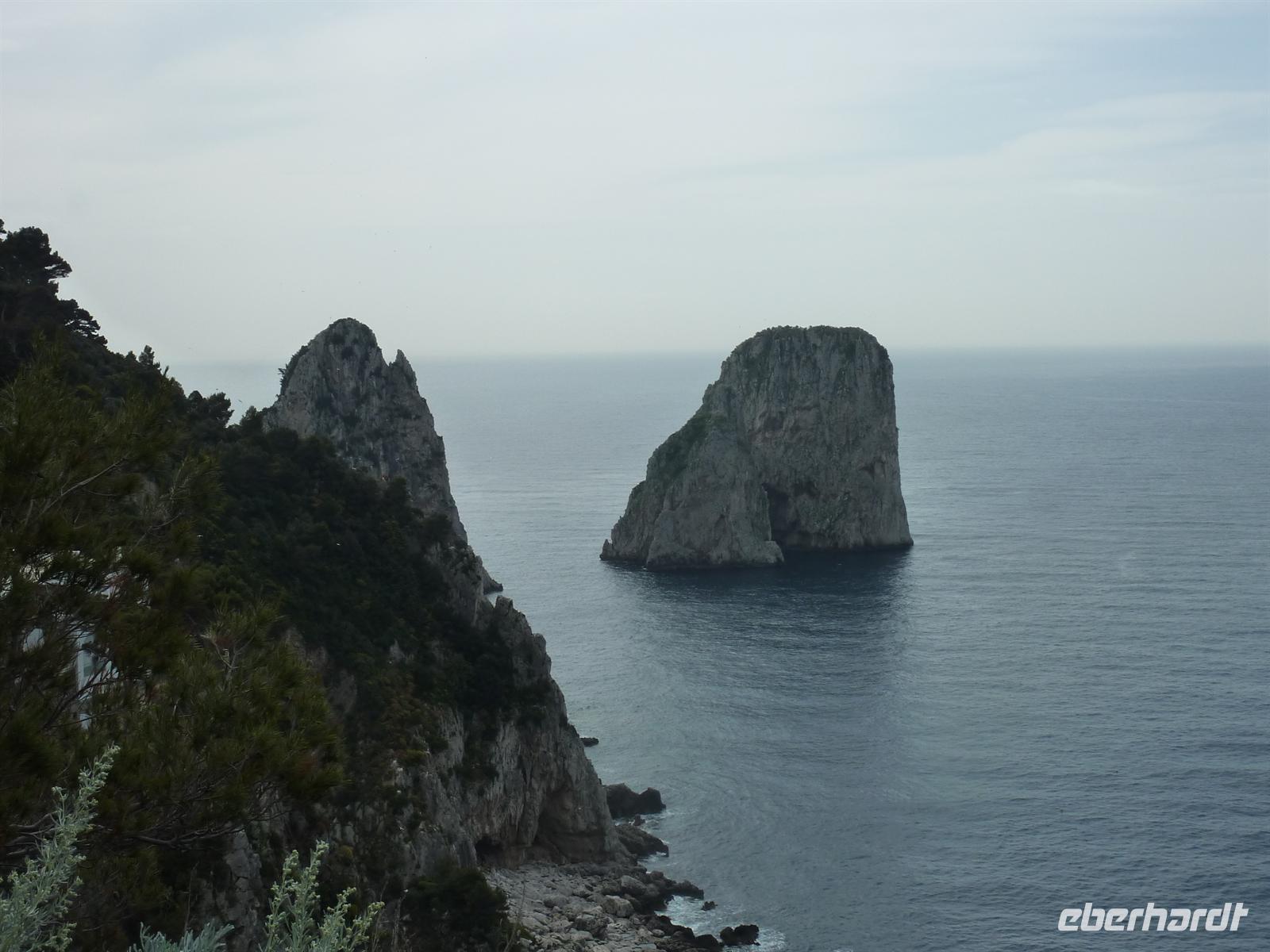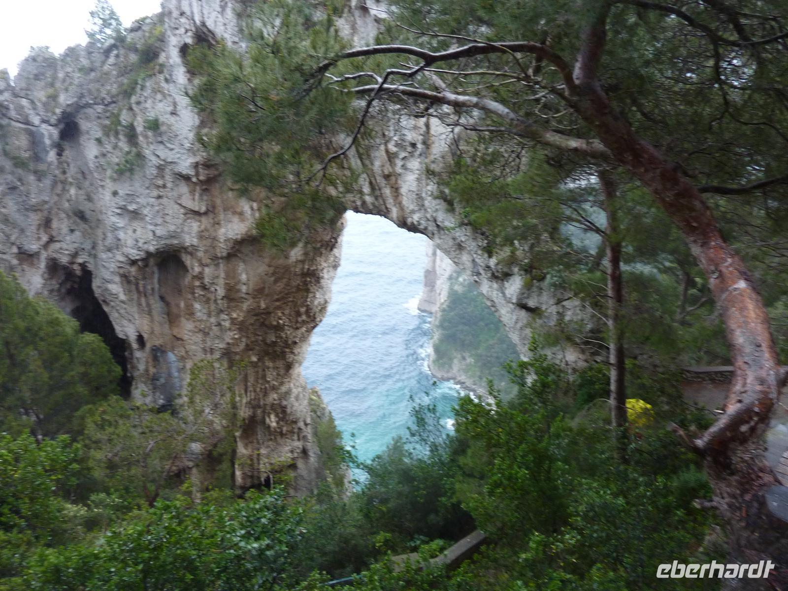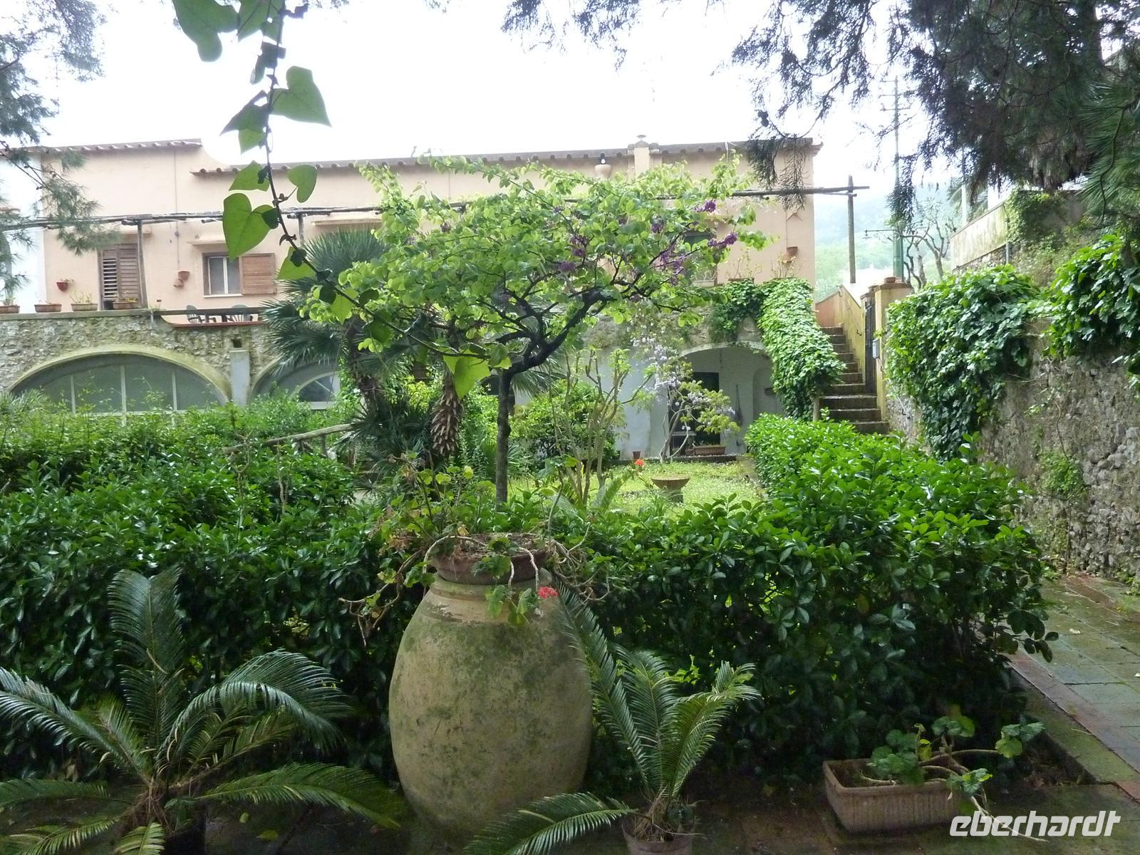 Am frühen Morgen treffen wir uns zum Frühstück und stoßen gemeinsam mit einem guten Prosecco auf den heutigen runden Geburtstag einer Reiseteilnehmerin an. Alle Wanderfreunde gratulieren herzlich und dürfen von der leckeren Geburtstags-Kaffee-Torte probieren. Dann begeben wir uns auf die Reise zu einer der schönsten Inseln im Mittelmeer - nach Capri. Ein Kleinbus bringt uns zur Schnell-Fähre nach Salerno. Der Himmel ist an diesem Tag überaus wolkenverhangen und es regnet nahezu ununterbrochen. Wir haben immer noch ein bisschen Hoffnung, dass das Wetter doch noch durchhält und uns ein wenig Sonne auf der Insel erwartet. Wir erreichen Sorrent unerwartet pünktlich und können auf einem kleinen Stadtbummel einen kleinen Eindruck bekommen.Auf der Fährüberfahrt wir das Wetter immer schlimmer anstatt besser. Wir entscheiden uns kurzerhand, erst zum Hotel zu fahren und dann über das weitere Programm für den heutigen und morgigen Tag zu entscheiden. Leider ist schon abzusehen, dass die geplanten Wanderungen so wie geplant nicht stattfinden können.In der Marina Grande von Capri wird unser Gepäck separat zum Hotel gebracht. Aufgrund des überaus schlechten Wetters kommen nur wenige Touristen am heutigen Tag auf der Insel an und wir können relativ zügig mit der Funicolare - der Seilbahn - auf die Piazza Umberto nach Capri Stadt fahren. Von da aus sind es nur knapp 10 Minuten Fußmarsch zu unserem Hotel della Piccola Marina. Wir kommen hier bereits durchnässt an. Das Personal im Hotel ist sehr flexibel und so können wir auf der überdachten Terrasse unser Mittagspicknick verzehren. Wir nutzen die Gelegenheit, um noch einmal auf das Wohl unseres „Geburtstagskindes" mit einem guten Prosecco zu trinken. Gleich danach sind unsere Zimmer bezugsfertig, die eigentlich erst für den späten Nachmittag gebucht waren.Die Eberhardt-Reisebegleitung bespricht in dieser Zeit das weitere Programm für den Nachmittag und den nächsten Tag, um soviel wie möglich vom geplanten Reiseprogramm auf der Insel trotz des schlechten Wetters durchführen zu können. Regensicher eingemummelt treffen wir uns dann an der Hotelrezeption und begeben uns auf die Wanderung zur Villa Jovis. Der Weg führt uns durch die engen Gassen der Stadt, auf denen bei Dauerregen nur wenige Menschen unterwegs sind. Wenigstens diesen Vorteil verbuchen wir für uns, auch wenn wir innerhalb weniger Minuten bereits völlig nass sind. Die Stimmung ist jedoch trotzdem gut und so erreichen wir nach ca. einer Stunde Aufstieg auf den Monte Tiberius die Villa Jovis an die Ostspitze Capris. Der Wind weht uns um die Nasen, die Regentropfen benetzen die Objektive unserer Kameras, während wir uns das Leben von Kaiser Tiberius in seiner Villa vorstellen, in der er 10 Jahre seines Lebens verbracht hat. Auf dem Rückweg lädt die Eberhardt-Reisebegleitung zu einer Tasse Cappuccino oder einem Kaffee ein, um die Gemüter zu erwärmen.Wir entscheiden uns spontan, noch zum Arco Naturale zu laufen. Wir sehen den natürlichen Felsbogen im strömenden Regen, sind aber froh, ihn überhaupt gesehen zu haben.Völlig durchnässt aber glücklich erreichen wir unser Hotel. Zum Abendessen wagen sich nur noch wenige Reiseteilnehmer noch einmal hinaus in den Regen. Sie werden aber mit einem überaus köstlichen Abendessen in einem kleinen, urigen Restaurant in Capri belohnt.