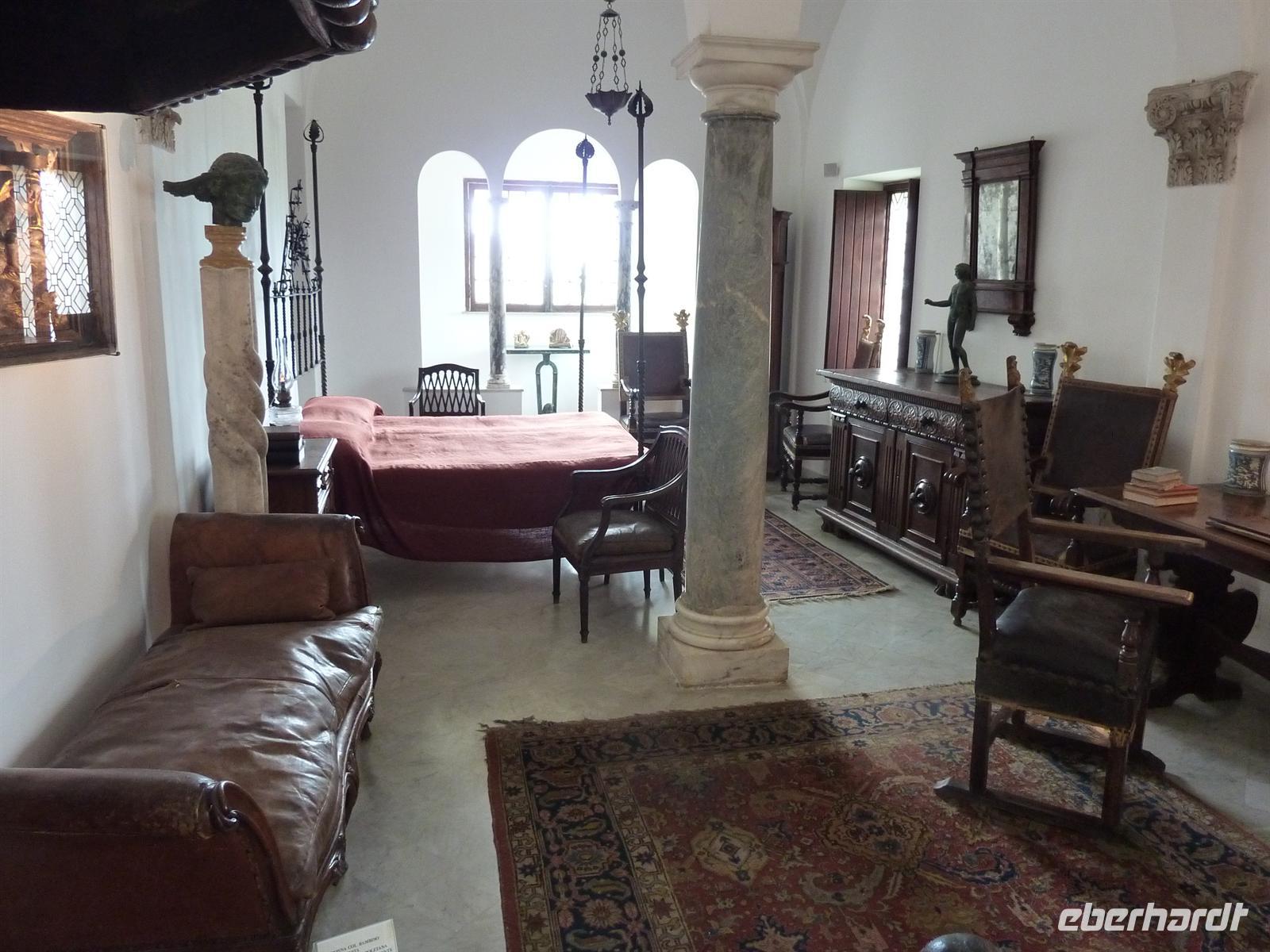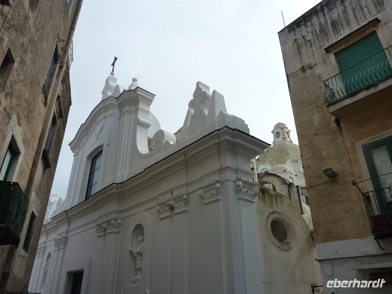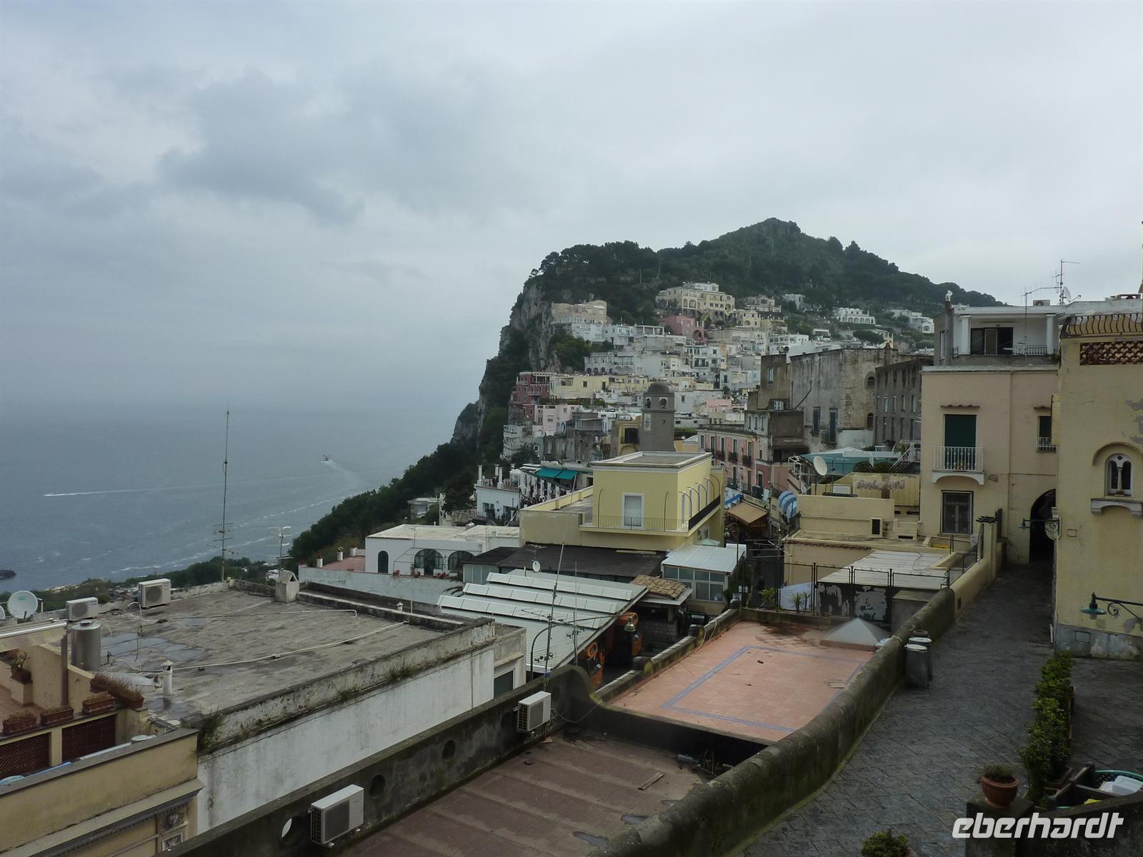 Am frühen Morgen treffen wir uns zum Frühstück und stoßen gemeinsam mit einem guten Prosecco auf den heutigen runden Geburtstag einer Reiseteilnehmerin an. Alle Wanderfreunde gratulieren herzlich und dürfen von der leckeren Geburtstags-Kaffee-Torte probieren. Dann begeben wir uns auf die Reise zu einer der schönsten Inseln im Mittelmeer - nach Capri. Ein Kleinbus bringt uns zur Schnell-Fähre nach Salerno. Der Himmel ist an diesem Tag überaus wolkenverhangen und es regnet nahezu ununterbrochen. Wir haben immer noch ein bisschen Hoffnung, dass das Wetter doch noch durchhält und uns ein wenig Sonne auf der Insel erwartet. Wir erreichen Sorrent unerwartet pünktlich und können auf einem kleinen Stadtbummel einen kleinen Eindruck bekommen.Auf der Fährüberfahrt wir das Wetter immer schlimmer anstatt besser. Wir entscheiden uns kurzerhand, erst zum Hotel zu fahren und dann über das weitere Programm für den heutigen und morgigen Tag zu entscheiden. Leider ist schon abzusehen, dass die geplanten Wanderungen so wie geplant nicht stattfinden können.In der Marina Grande von Capri wird unser Gepäck separat zum Hotel gebracht. Aufgrund des überaus schlechten Wetters kommen nur wenige Touristen am heutigen Tag auf der Insel an und wir können relativ zügig mit der Funicolare - der Seilbahn - auf die Piazza Umberto nach Capri Stadt fahren. Von da aus sind es nur knapp 10 Minuten Fußmarsch zu unserem Hotel della Piccola Marina. Wir kommen hier bereits durchnässt an. Das Personal im Hotel ist sehr flexibel und so können wir auf der überdachten Terrasse unser Mittagspicknick verzehren. Wir nutzen die Gelegenheit, um noch einmal auf das Wohl unseres „Geburtstagskindes" mit einem guten Prosecco zu trinken. Gleich danach sind unsere Zimmer bezugsfertig, die eigentlich erst für den späten Nachmittag gebucht waren.Die Eberhardt-Reisebegleitung bespricht in dieser Zeit das weitere Programm für den Nachmittag und den nächsten Tag, um soviel wie möglich vom geplanten Reiseprogramm auf der Insel trotz des schlechten Wetters durchführen zu können. Regensicher eingemummelt treffen wir uns dann an der Hotelrezeption und begeben uns auf die Wanderung zur Villa Jovis. Der Weg führt uns durch die engen Gassen der Stadt, auf denen bei Dauerregen nur wenige Menschen unterwegs sind. Wenigstens diesen Vorteil verbuchen wir für uns, auch wenn wir innerhalb weniger Minuten bereits völlig nass sind. Die Stimmung ist jedoch trotzdem gut und so erreichen wir nach ca. einer Stunde Aufstieg auf den Monte Tiberius die Villa Jovis an die Ostspitze Capris. Der Wind weht uns um die Nasen, die Regentropfen benetzen die Objektive unserer Kameras, während wir uns das Leben von Kaiser Tiberius in seiner Villa vorstellen, in der er 10 Jahre seines Lebens verbracht hat. Auf dem Rückweg lädt die Eberhardt-Reisebegleitung zu einer Tasse Cappuccino oder einem Kaffee ein, um die Gemüter zu erwärmen.Wir entscheiden uns spontan, noch zum Arco Naturale zu laufen. Wir sehen den natürlichen Felsbogen im strömenden Regen, sind aber froh, ihn überhaupt gesehen zu haben.Völlig durchnässt aber glücklich erreichen wir unser Hotel. Zum Abendessen wagen sich nur noch wenige Reiseteilnehmer noch einmal hinaus in den Regen. Sie werden aber mit einem überaus köstlichen Abendessen in einem kleinen, urigen Restaurant in Capri belohnt.