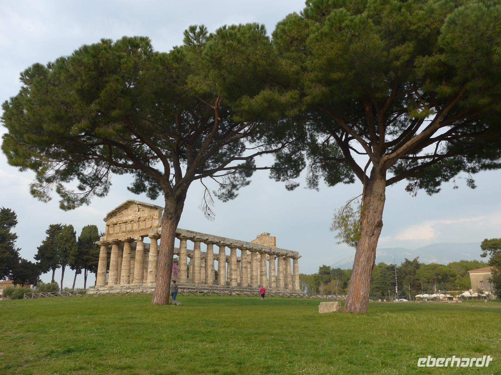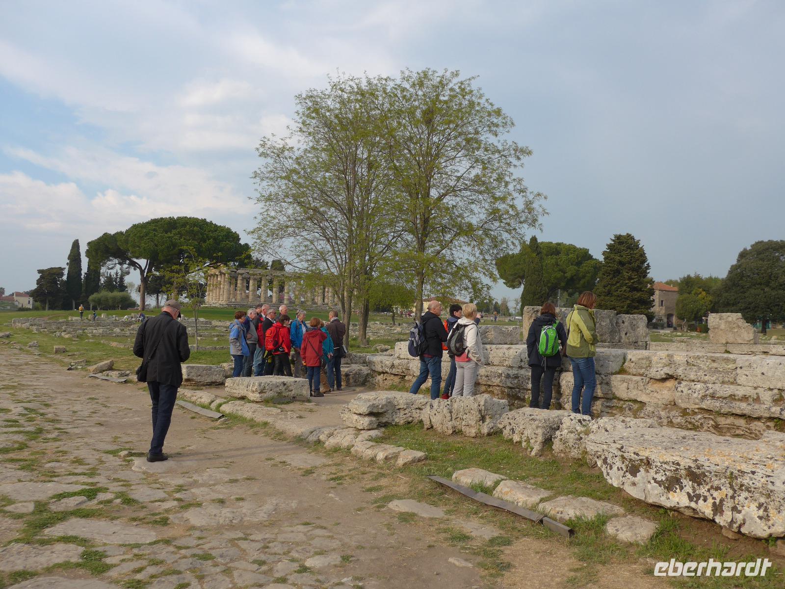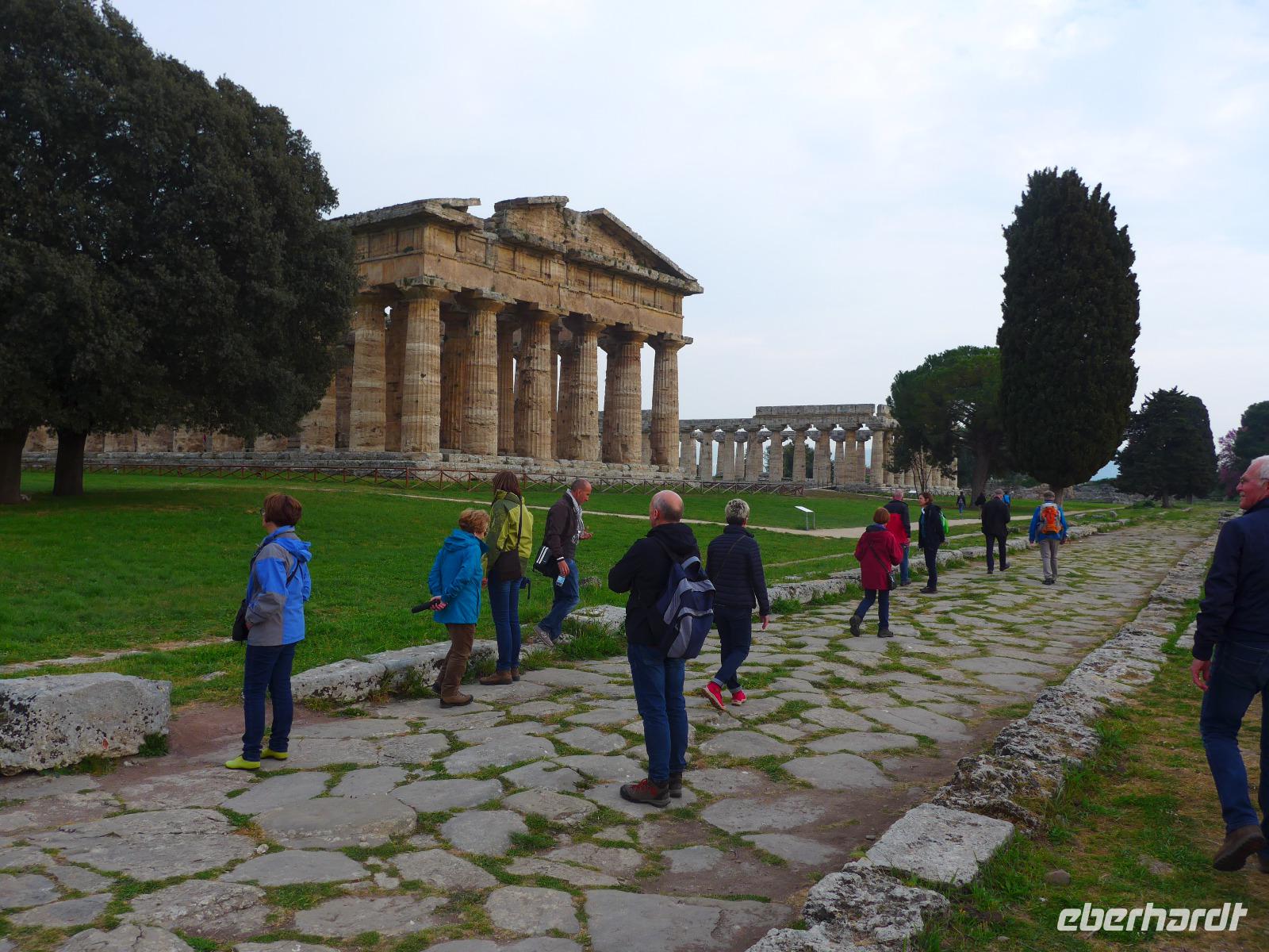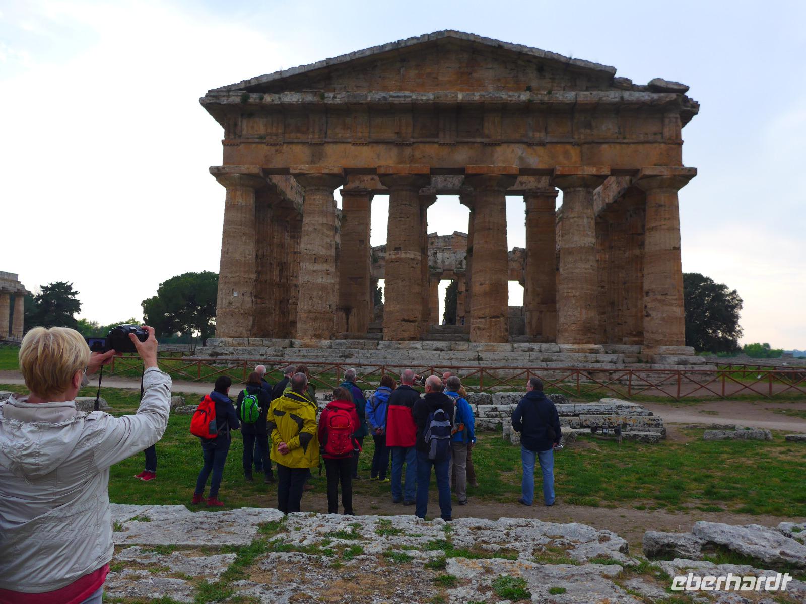 Wir flogen mit Air Berlin nach Neapel. Nach langem Warten am Kofferband erfuhren wir, daß für einige Teilnehmer unserer Gruppe die Koffer nicht ankamen. Wir ließen den Verlust registrieren und konnten dann endlich unsere 2 Teilnehmer aus München kommend begrüßen und uns zum Bus begeben. Unser Busfahrer Emilio brachte uns nach Paestum, wo Angelo die Gruppe schon erwartete. Gemeinsam besichtigten wir die zahlreichen Ausstellungsstücke im archäologischen Museum von Paestum. Vor allem die Gräber der Lukanier und das berühmte griechische Grab des Tauchers machen das Museum so einmalig. Aktuell wurden noch viele Ausstellungsstücke aus dem Museum Grand Tour integriert. Im riesigen Ausgrabungsgelände sahen wir dann noch die 3 großen und gut erhaltenen Tempel und wir konnten den Poseidon-Tempel auch innen betreten. Das war neu in diesem Jahr. Nach reichlich 2 Stunden Besichtigung fuhren wir noch ein kurzes Stück bis zu unserem Hotel Esplanade in Paestum - unsere Bleibe für die ersten 6 Nächte der Reise. Zuvor hielten wir noch kurz an einem Einkaufs-Center, damit die Gäste ohne Koffer das Nötigste besorgen konnten.Nach der Zimmerverteilung gab es endlich was zu essen und dann freuten sich alle auf ihr Bett.