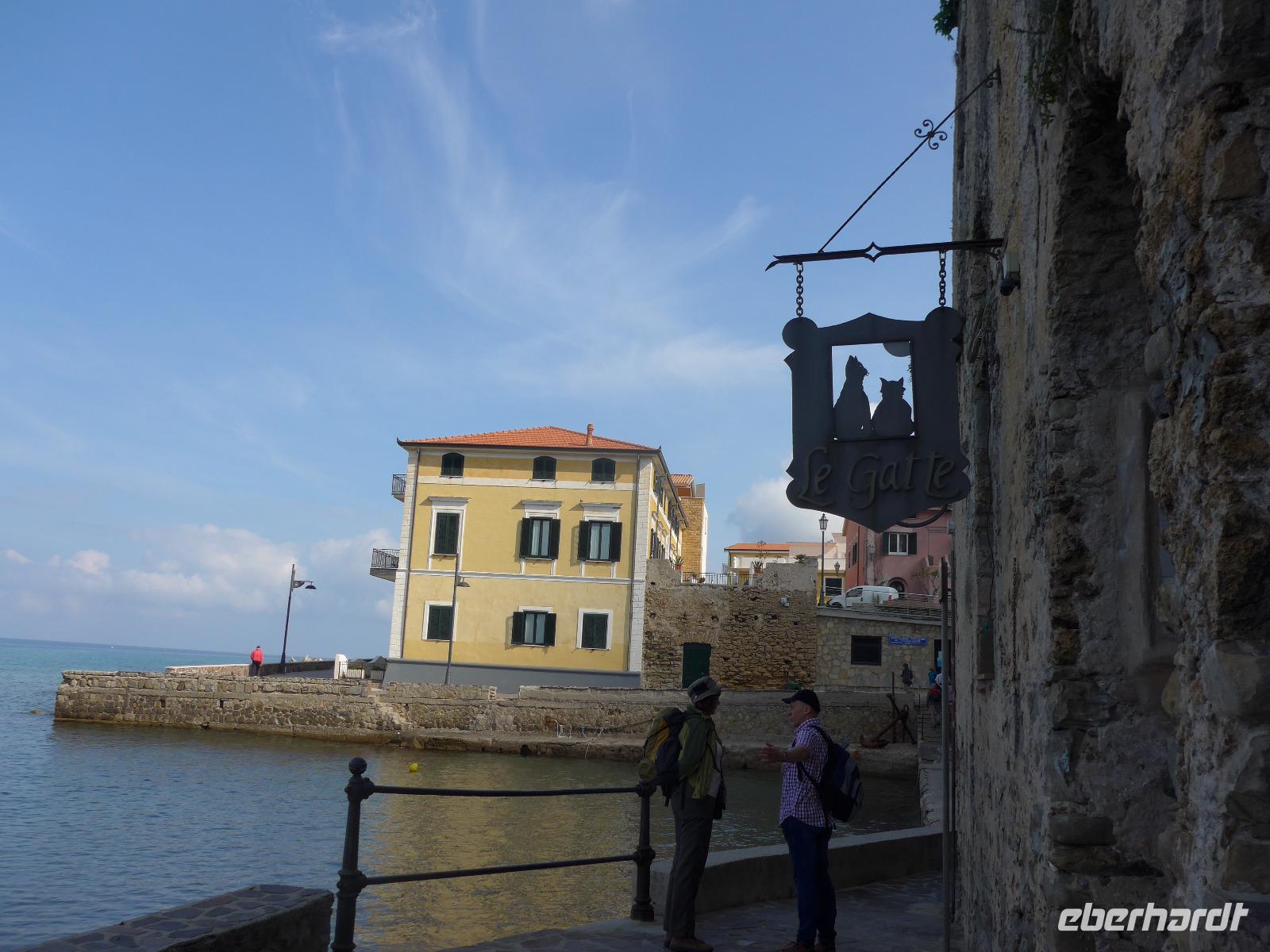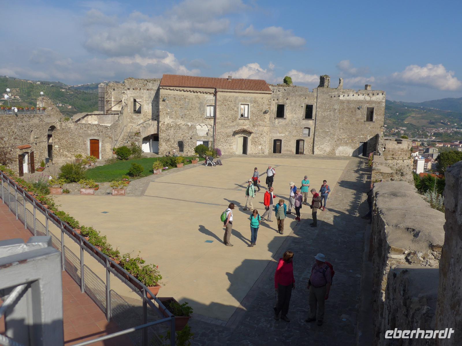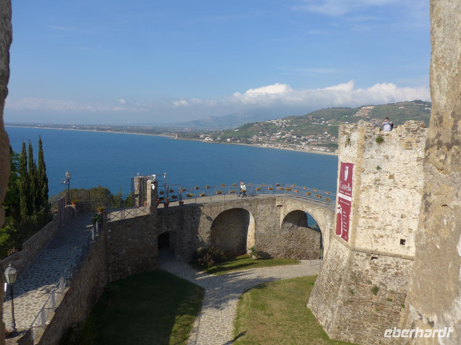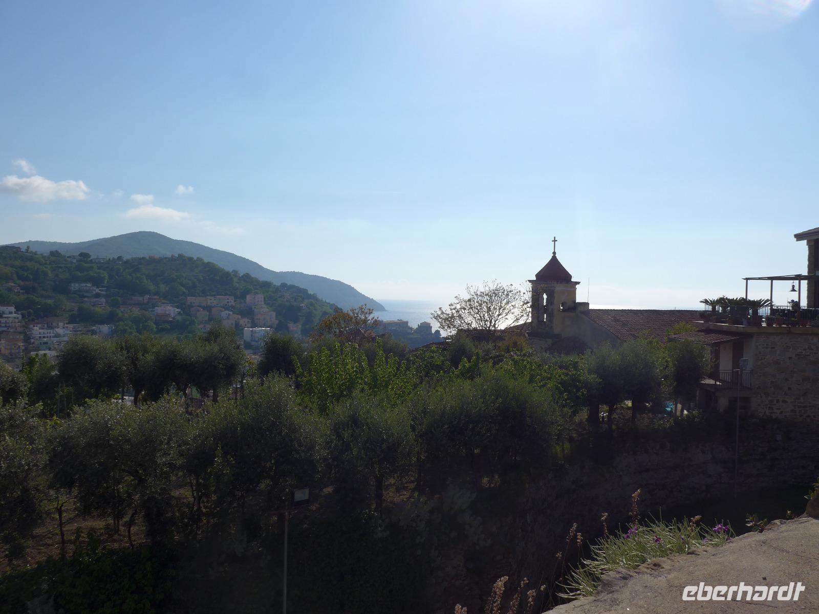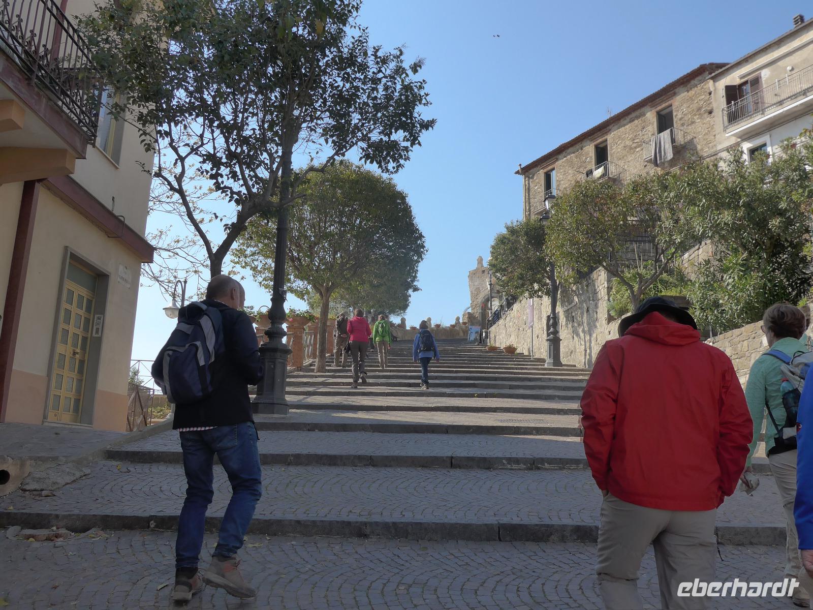 Nach dem guten Essen und Trinken könnte man ein pisolino (Mittagsschläfchen) halten oder 1000 Schritte tun. Wir fuhren nach Agropoli und entschieden uns für Zweiteres. Zu Fuß gingen wir die vielen Treppen hinauf zum Aussichtspunkt an der Kirche Madonna von Costantinopoli. Von dort hat man einen wundervollen Blick auf den alten Hafen und wir konnten unsere Wanderstrecke verfolgen. In der Altstadt sahen wir wieder gut renovierte Häuser und schließlich erreichten wir die Burg mit prächtiger Aussicht auf die Berge des Cilento und auf den Strand der langen Sandbucht ganz in der Nähe unseres Hotels. Bei der Rückkehr ins Hotel hofften wir, die verlorenen Koffer vorzufinden. Aber leider ging dieser Wunsch nicht in Erfüllung. Stattdessen erfuhren wir, daß unsere Koffer erst am Folgetag 3 unserer Reise eintreffen sollten. Also gingen wir nochmals mit unseren Wanderschuhen zum Essen und mußten nochmals Wäsche waschen abends.