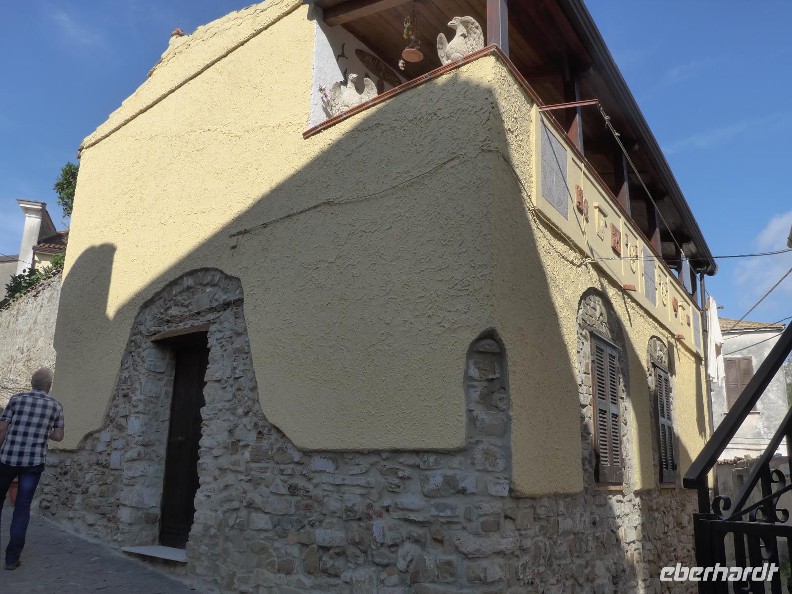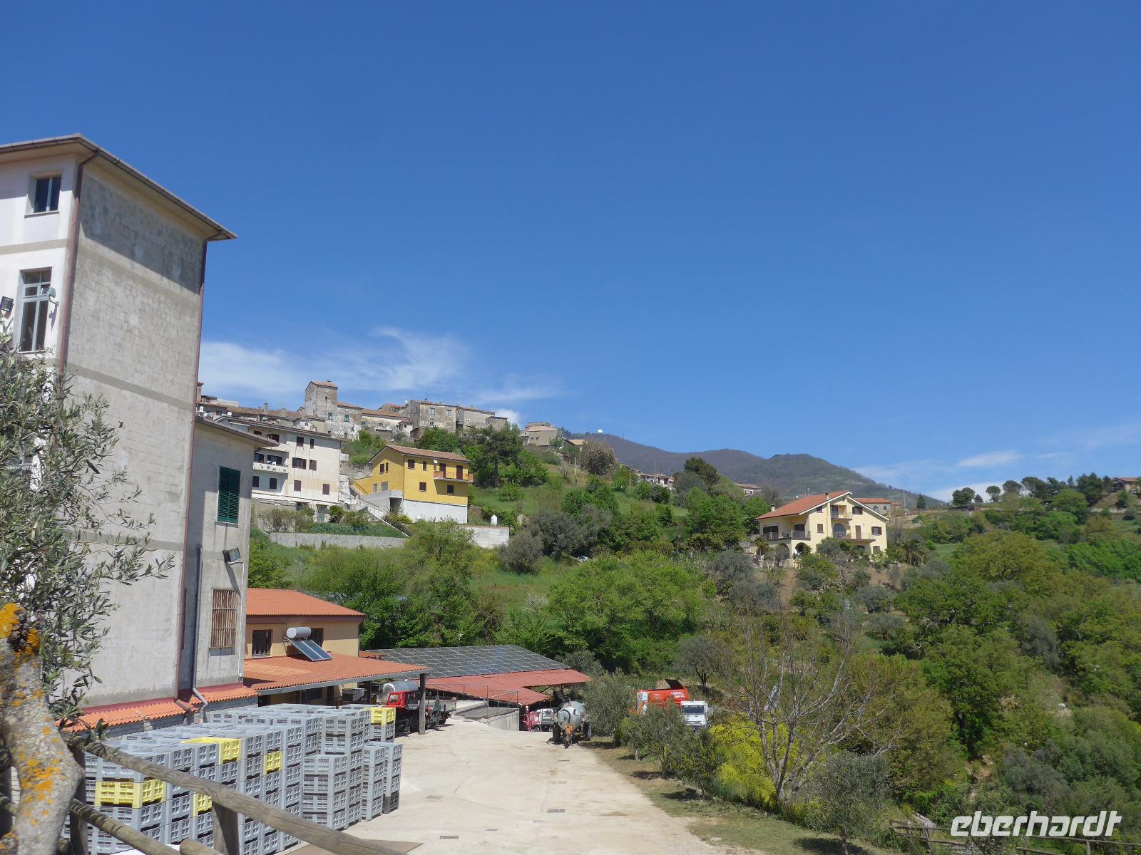 Heute hatten die Wanderschuhe Ruhetag, denn wir fuhren mit dem Bus und Fahrer Rafaele zunächst hinauf nach Castellabate. Angelo zeigte uns beim Rundgang die schönsten Plätze und engen Gassen und berichtete über die Drehorte zum Film "Willkommen im Süden". Der Monte Stella war ganz nah und unten am Meer blickten wir auf Santa Maria, wo vor 2 Tagen unsere erste Wanderung startete. Auf einer kurvenreichen Strasse erreichten wir schließlich San Mauro Cilento und besichtigten die moderne Ölpresse der Cooperativa Nuovo Cilento. Im Gasthaus probierten wir dann die verschiedenen Olivenöle und die Frauen des Dorfes verwöhnten uns mit alten cilentarischen Gerichten. Mit dem Bus fuhren wir um den Monte Stella herum nach Prignano zur "Geschmackswerkstatt" Santomiele. Dort werden die weißen Feigen des Cilento meisterlich verarbeitet. In klassischem Ambiente berichtete der Chef Antonio Longo über seine zahlreichen Aktivitäten und Produkte. Bei einem Glas Sekt auf der Terrasse genossen wir die ersten Feigen. Drinnen probierten wir dann an den hohen Tischen, wo sonst die Produkte verpackt und für den Versand vorbereitet werden, die Produkte von Santomiele wie Feigen, Konfitüren mit verschiedenem Käse, Schokoladenkreationen und ..... Es schmeckte vorzüglich und so manches Mitbringsel wurde gekauft. Unser Abendessen im Hotel konnten wir nach dem vielen Schlemmen erst 20 Uhr einnehmen.
