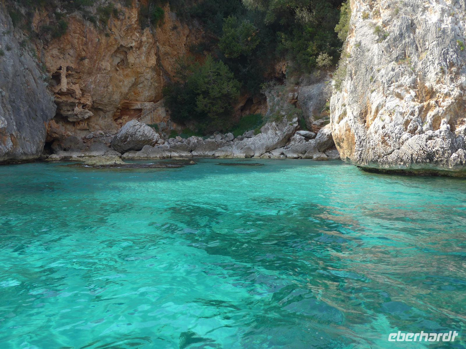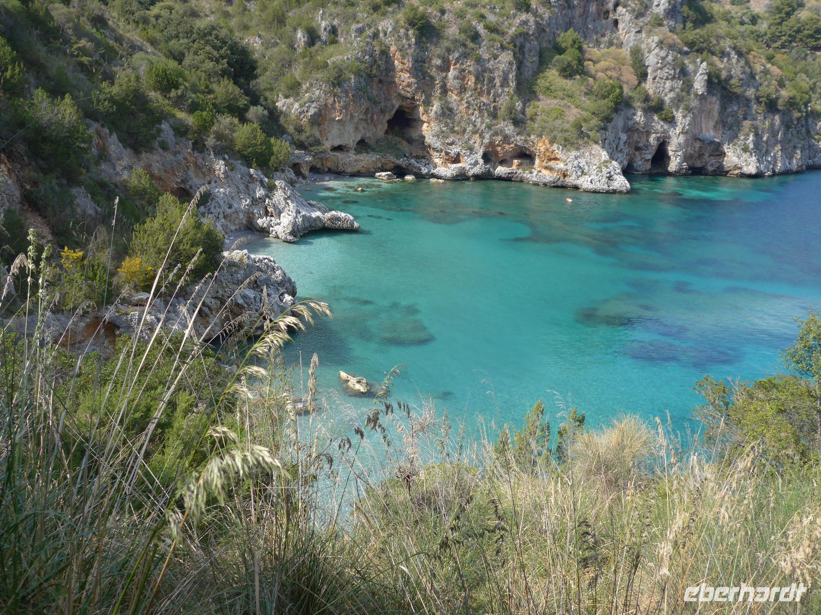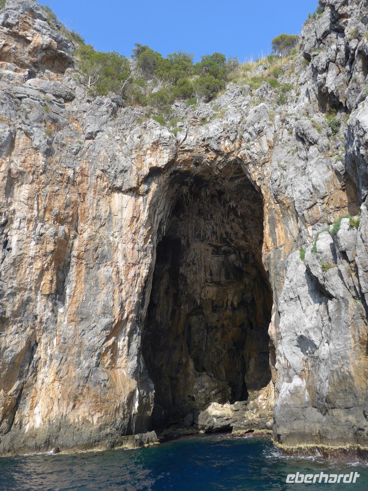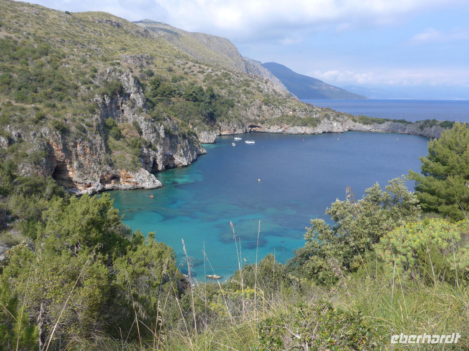 Heute kam ein neuer Bus mit Fahrer Donato und wir fuhren zunächst auf der Küstenstrasse und später auf der Schnellstrasse einmal quer durch den Cilento. Bei San Severino bogen wir ins Mingardotal ab und erreichten über Palinuro Marina di Camerote. Nach einer Kaffee- und Granita-Pause begaben wir uns auf den Küstenweg mehrmals steil bergan und wieder bergab zum Pozzolla Strand. Dort nahmen wir unseren Mittagsimbiß ein - Freselle und gefüllte Auberginen. 3 Damen wagten danach ein Bad glasklaren Wasser der Bucht. Auch der zweite Teil der Wanderung ging wieder durch abwechslungsreiches Gelände steil bergauf und bergab. Schließlich erreichten wir den "Frischen Hafen" Porto degli Infreschi. Kaltes Wasser fließt dort ins Meer und so wurden diese Höhlen zum Kühlen und Aufbewahren von Fisch und anderen Lebensmitteln genutzt. Ein Boot holte unsere Gruppe ab und wir fuhren an der Küste mit vielen Höhlen zurück nach Marina di Camerote. In die größeren Höhlen fuhr unser Boot hinein und besonders die blaue Grotte hatte es uns angetan. Unser Bus brachte uns dann über die Schnellstrasse zurück ins Hotel. Dort war die Freude groß, als wir unsere verlorenen Koffer endlich entgegen nehmen durften.