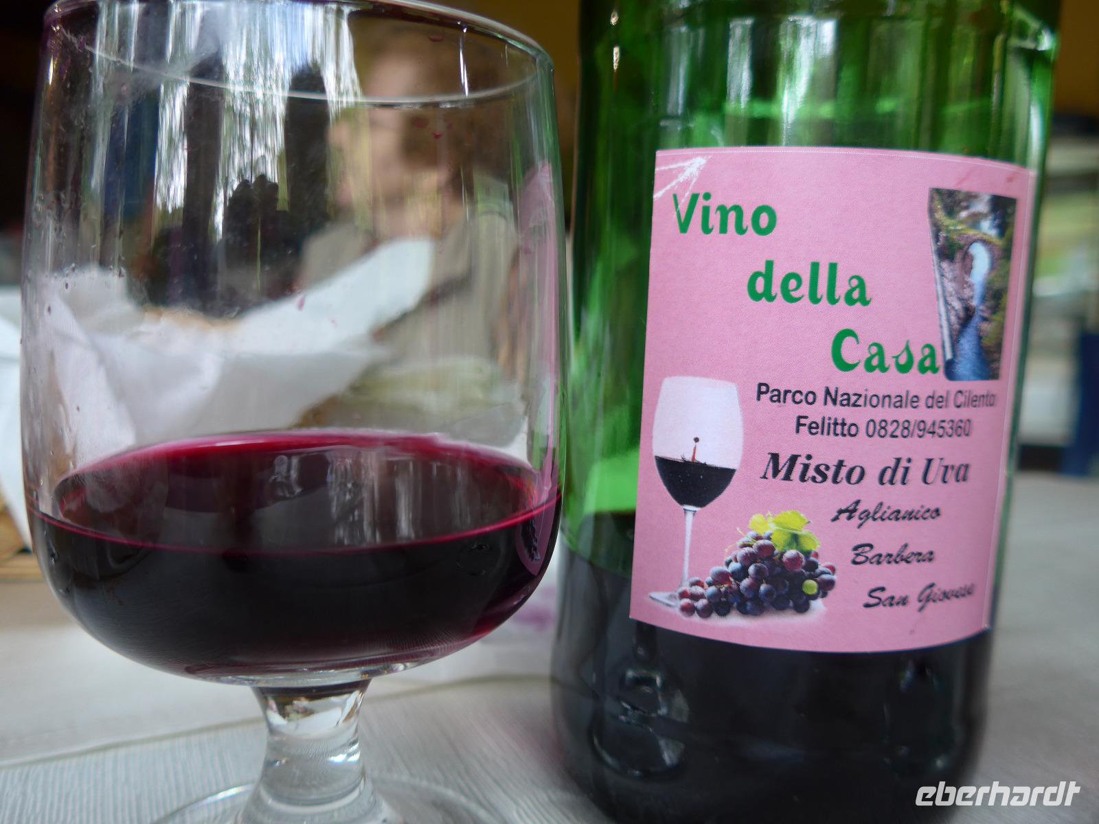 Auf unserer Busfahrt nach Santa Maria nahmen wir Angelo unterwegs an Bord und in Santa Maria gab es zunächst eine Kaffeepause und Zeit für einen kurzen Ortsbummel. Am kleinen alten Fischerhafen machten wir uns miteinander bekannt und dann liefen wir auf der neu angelegten Uferpromenade zum Strand. Es folgte ein kurzer Anstieg und dann verlief unser Wanderweg durch die blühende Mittelmeermacchia mit immer schönen Ausblicken zurück auf Santa Maria und auf das blaue Meer. An der Punta Tresina gab es für alle einen Limoncello und Feigen mit Mandeln gefüllt. Nun sollte es nicht mehr weit sein bis zu unserem Bus - aber der direkte Weg war gesperrt und so mussten wir nochmals steil bergan und wieder steil bergab gehen. Nach kurzer Busfahrt erreichten wir das Weingut Marino, wo uns die Besitzerin Assunta bereits erwartete. Wir bekamen verschiedene Vorspeisen serviert und probierten dazu einen Weißwein Fiano und den Rotwein Aglianico. Den Abschluß bildeten selbst gebackene Kekse mit einem Süßwein Aglianico. Für den Süßwein werden Trauben verwendet, die am Rebstock vertrocknen und erst im November geerntet werden.