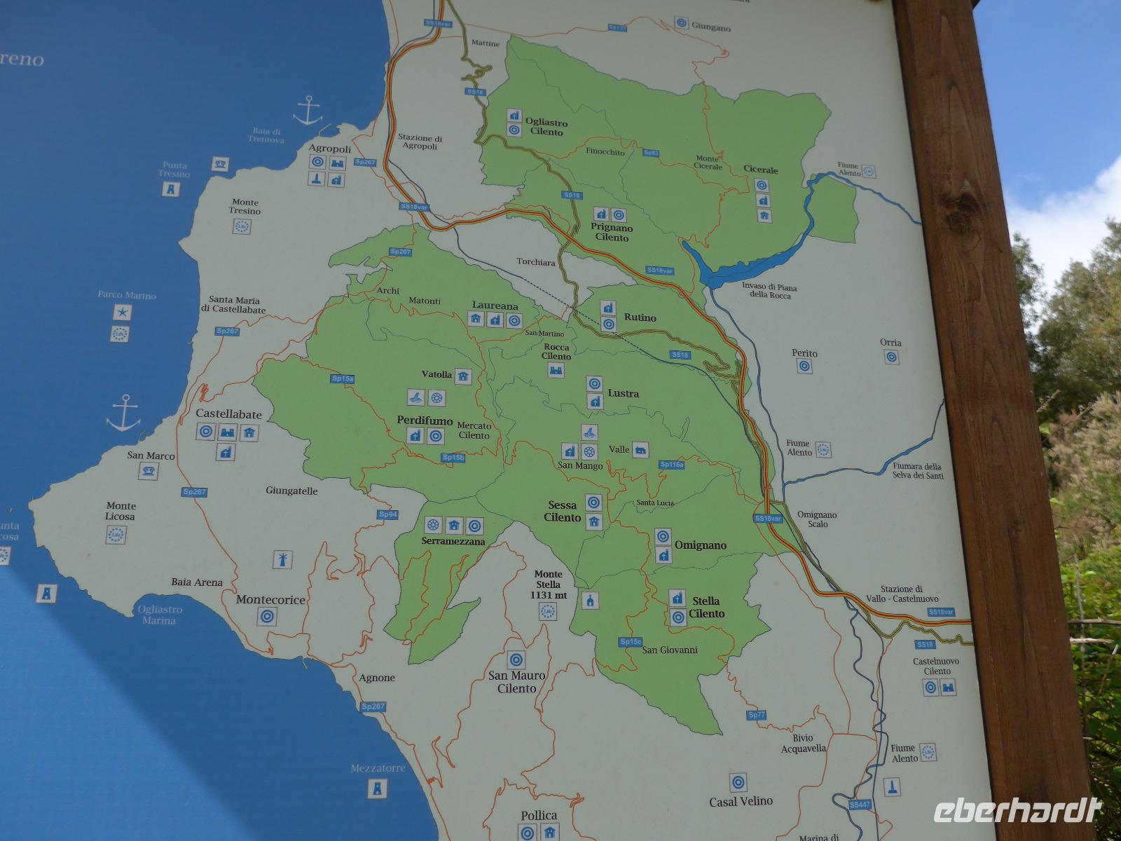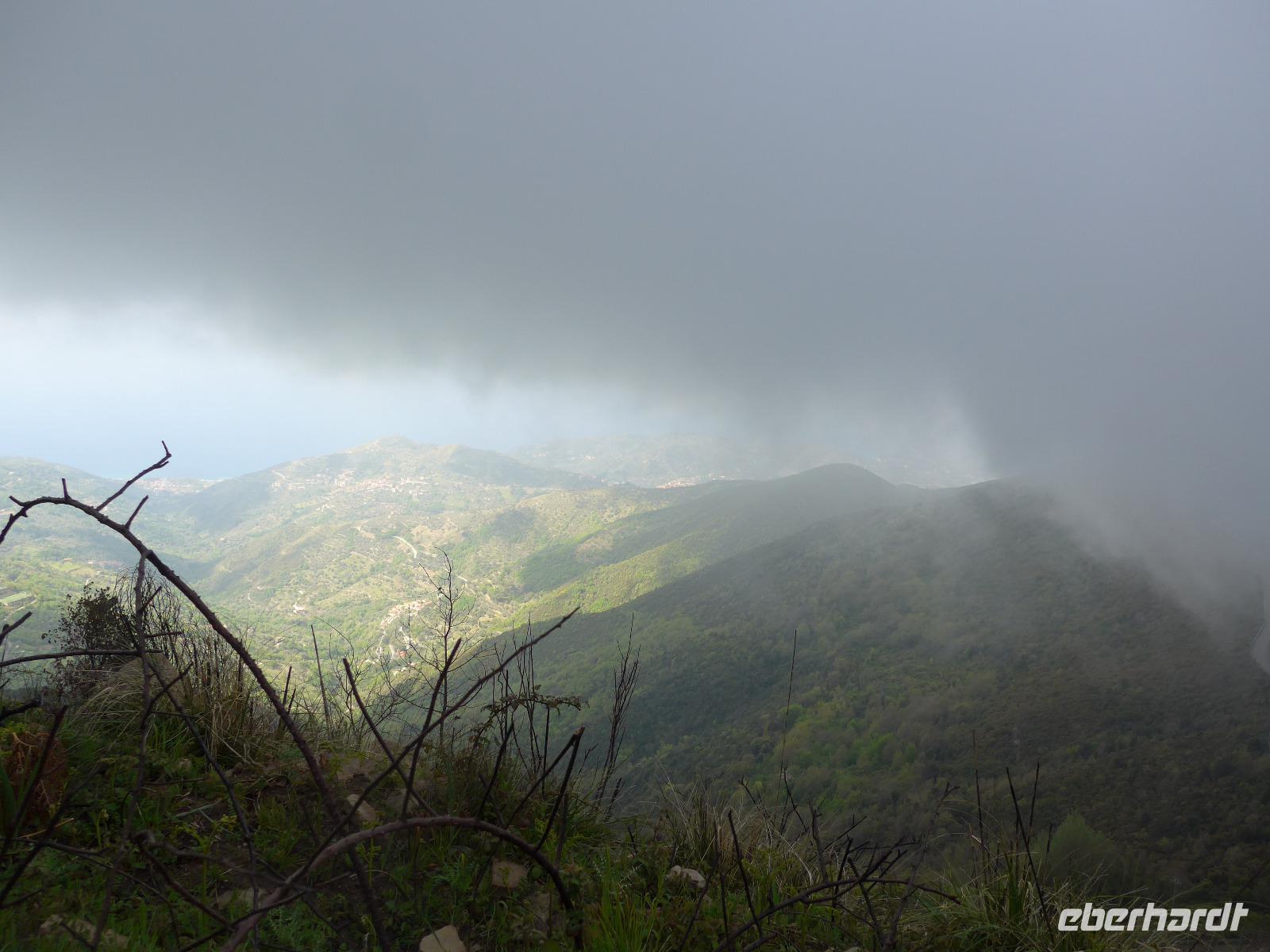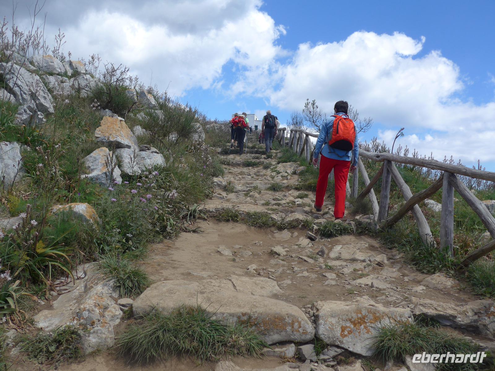 Zunächst aber kaufte ich mit Angelo für unsere Gruppe im Supermarkt das Picknick ein. Die einzelnen Pakete wurden auf die Rücksäcke der Teilnehmer verteilt und dann brachte uns der Bus hinauf auf ca. 700 Meter Höhe, wo unsere Wanderung begann. Die Wolken hingen tief und nur unten an der Küste war es sonnig. Das änderte sich aber und bald liefen auch wir in der Sonne. In Etappen, immer mit Pausen dazwischen zum Trinken, Essen und die Aussicht genießend, erreichten wir schließlich zur Mittagszeit den Gipfel des 1130 m hohen Monte Stella. Der Berg steht frei nahe der Küste und bietet herrliche Ausblicke in alle Richtungen. Oben gibt es viele Tische zum Picknick machen. Dennoch waren wir zu spät und alle Tische zumindest reserviert. So nahmen wir die kleine Terrasse oben hinter der Kirche für unsere Gruppe und alle bekamen ein Plätzchen auf der Mauer. Die Teller, Gabeln, Trinkbecher sowie Brötchen, verschiedene Wurst, verschiedener Käse, Tomate und Getränke wurden verteilt . Nach der Anstrengung schmeckte es allen sehr gut und zum Schluß probierten wir den Artischockenschnaps Cynar mit einem Marzipantaler. Die Aussicht von unserem Picknickplatz reichte hinunter ans Meer und wir schauten von Elia bis hin zum Kap Palinuro. Gut gestärkt traten wir den langen Abstieg hinuter nach Galdo an. Dort kehrten wir in einer Bar ein.
