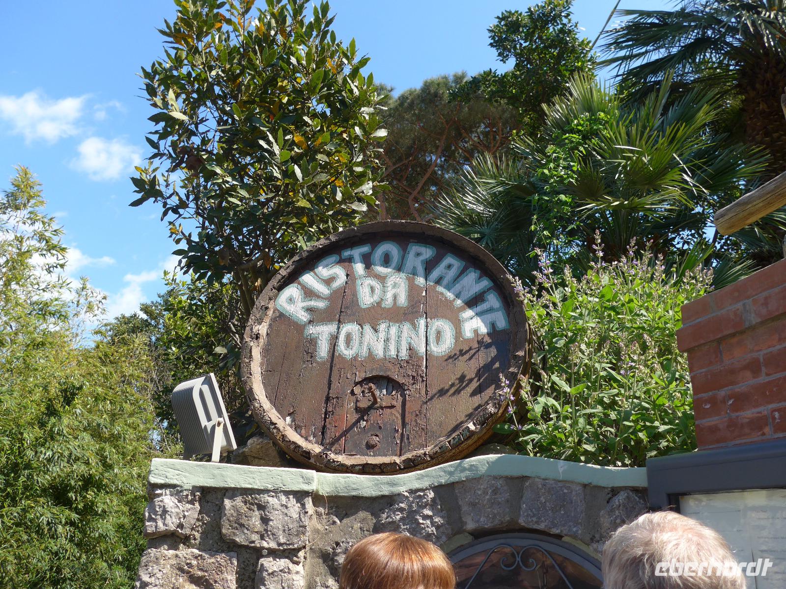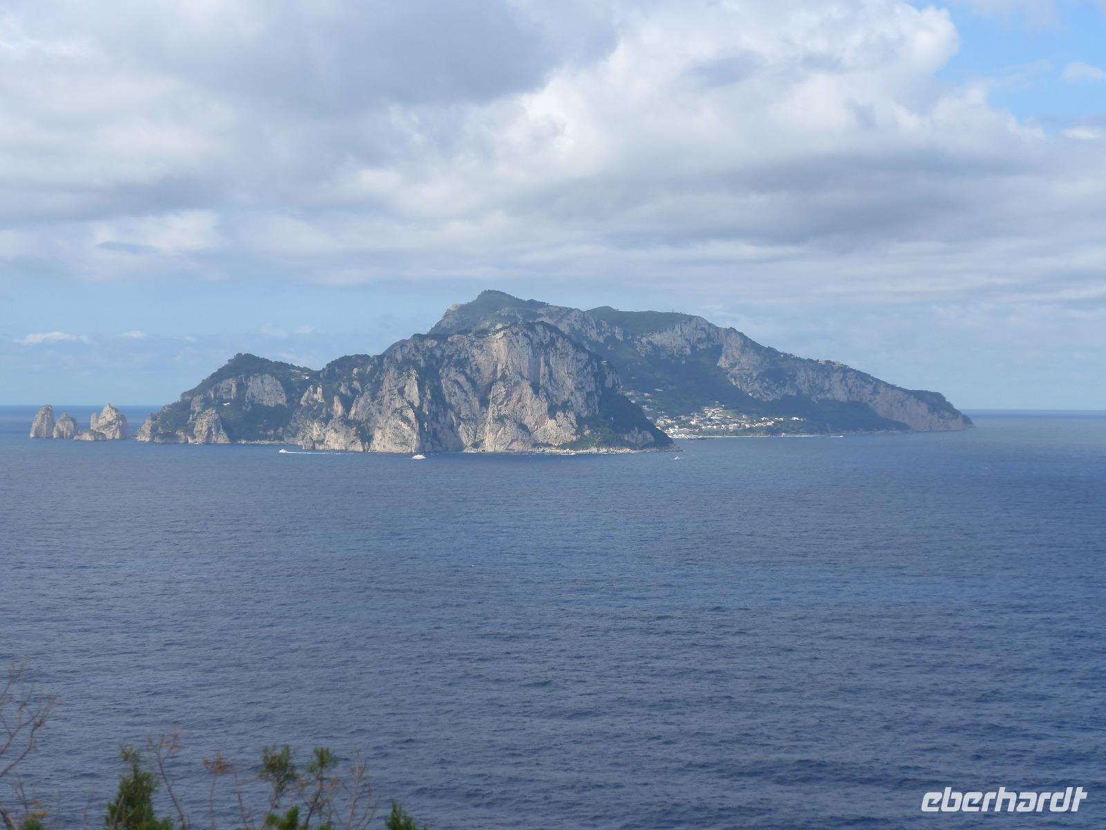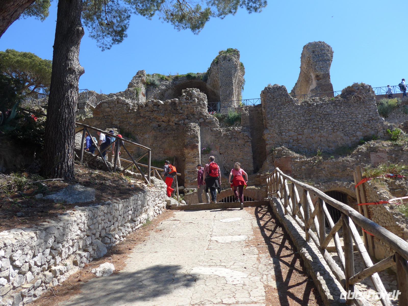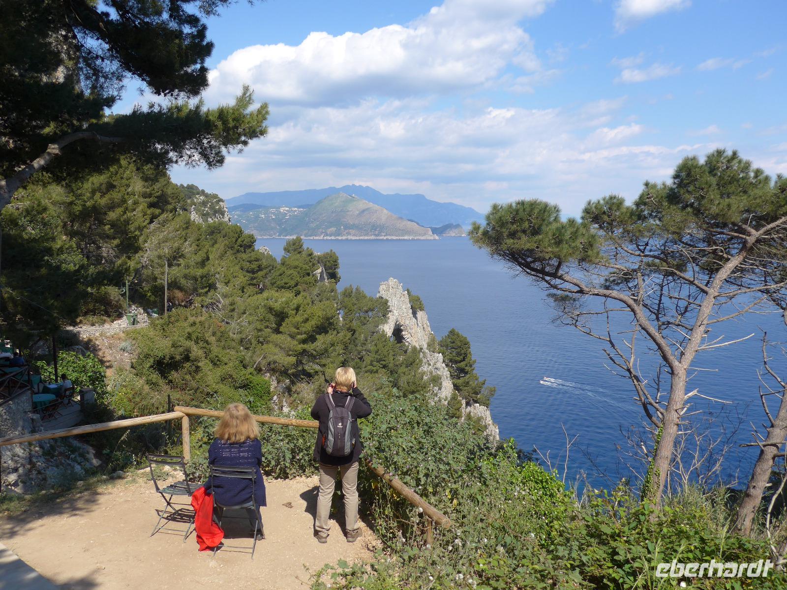 14 Gäste hatten sich für diesen Ausflug eingeschrieben und so starteten wir nach dem Frühstück zu Fuß zum Hafen in Sorrent. Wir fuhren mit der großen Fähre von Caremar eine halbe Stunde hinüber nach Capri. Annamaria stand schon am Hafen und begrüßte uns. Gemeinsam wanderten wir hinauf zur Piazzetta, dem touristischen Zentrum der Insel. Am Aussichtsbalkon erklärte uns Annamaria den Aufbau der Insel und gab viele allgemeine wichtige Informationen. Wir überquerten die Piazzetta und gingen durch die engen Gassen hinauf zur Villa Jovis. Von hier regierte Kaiser Tiberius das römische Reich 11 Jahre lang. Die exponierte Lage am höchsten Punkt Capris bot auch uns sehr schöne Ausblicke zum Vesuv, der sorrentinischen Halbinsel und zur Amalfiküste. Nach der Besichtigung der Villa gingen wir zurück zum Mittagessen ins "Da Tonino". Wir wurden vom Chef schon erwartet und bekamen als Vorspeise verschiedene Teigtaschen und dann die legendären Ravioli gefüllt mit Ricottakäse und Tomatensose dazu. Den Abschluß bildete eine Caprese Torte extra frisch für unsere Gruppe gebacken. Nun hatten wir genügend Kalorien aufgenommen und konnten unsere Wanderung zum Arco Naturale und zur Grotte Matermana beginnen. Über viele Stufen stiegen wir ab und dann wieder hinauf, um die Faragliono Felsen und die Villa Malaparte von oben zu bewundern. Der Weg endete an der Punta Tragara, wo das gleichnamige 5 Sterne Hotel steht.