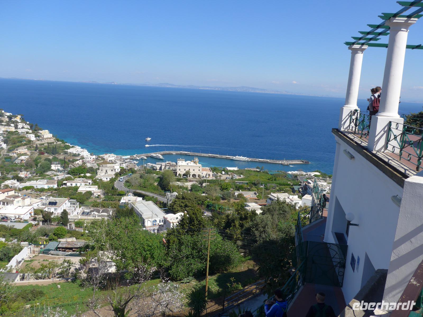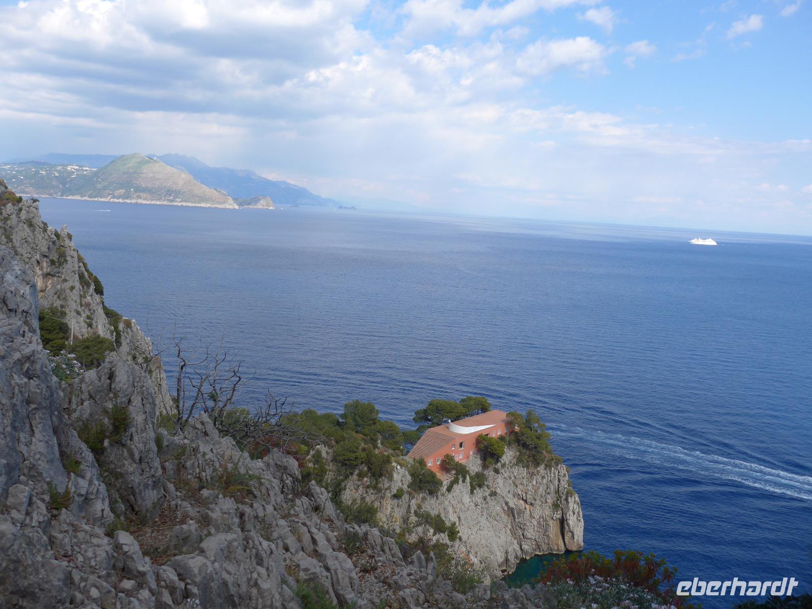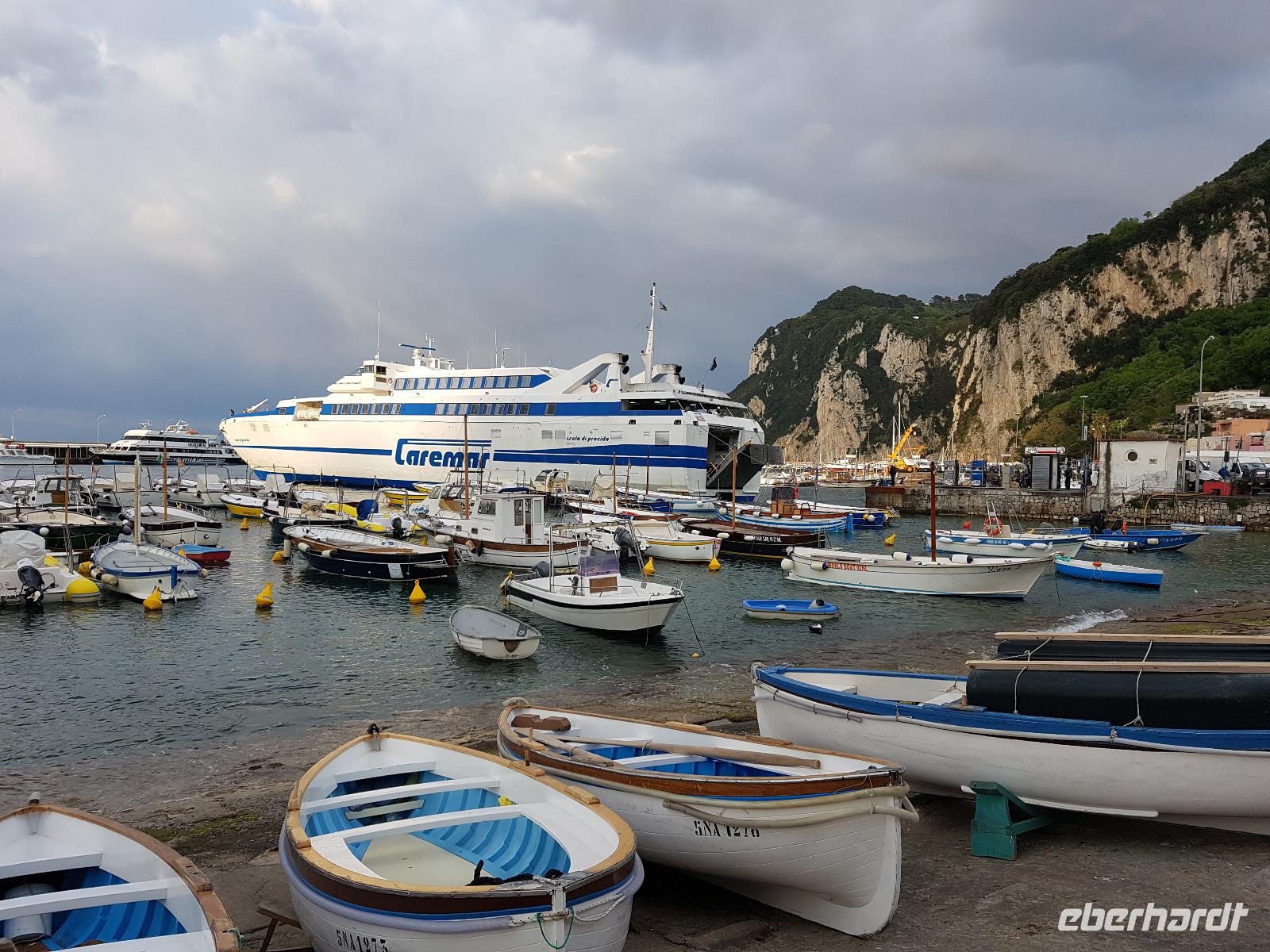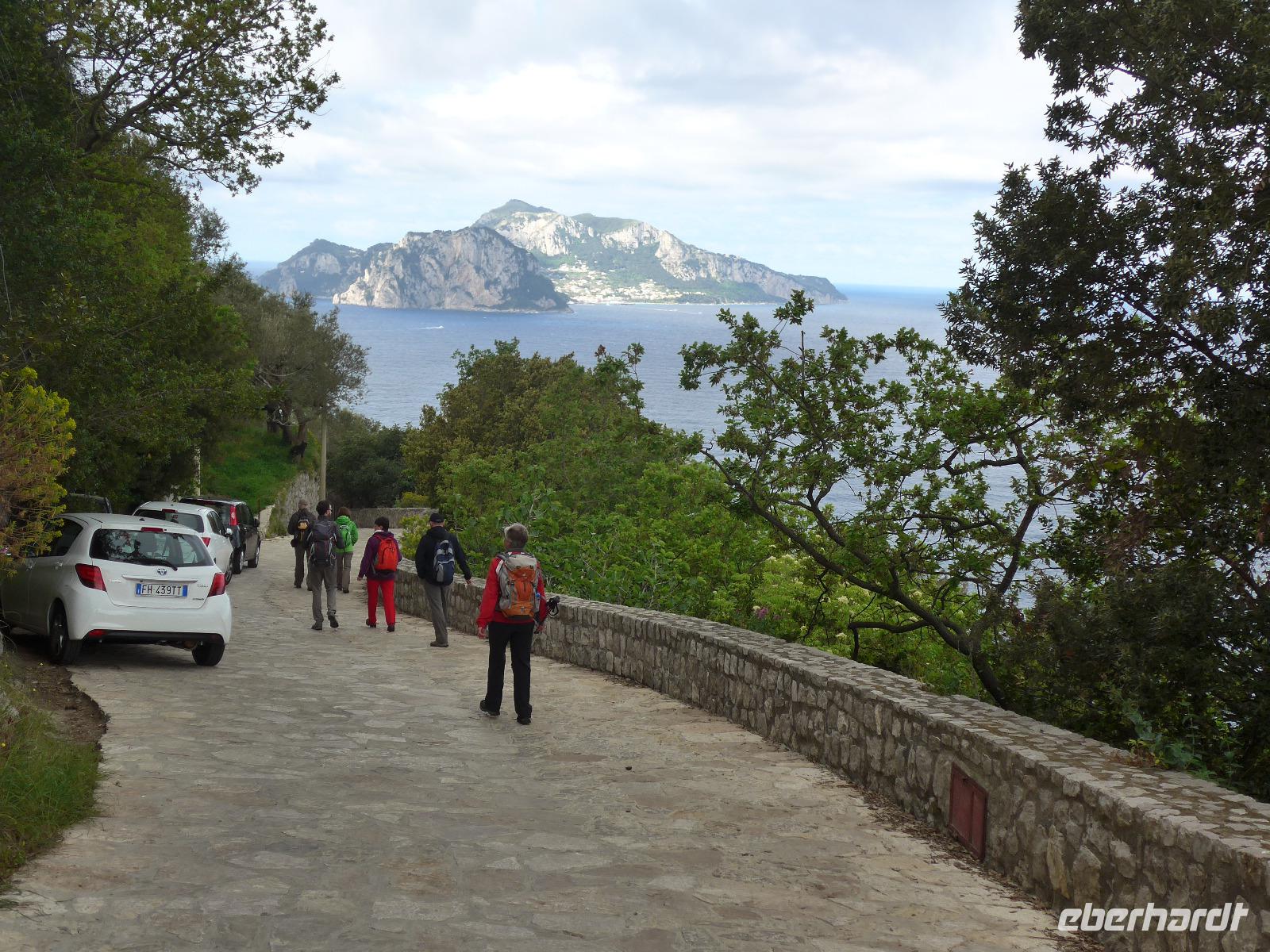 14 Gäste hatten sich für diesen Ausflug eingeschrieben und so starteten wir nach dem Frühstück zu Fuß zum Hafen in Sorrent. Wir fuhren mit der großen Fähre von Caremar eine halbe Stunde hinüber nach Capri. Annamaria stand schon am Hafen und begrüßte uns. Gemeinsam wanderten wir hinauf zur Piazzetta, dem touristischen Zentrum der Insel. Am Aussichtsbalkon erklärte uns Annamaria den Aufbau der Insel und gab viele allgemeine wichtige Informationen. Wir überquerten die Piazzetta und gingen durch die engen Gassen hinauf zur Villa Jovis. Von hier regierte Kaiser Tiberius das römische Reich 11 Jahre lang. Die exponierte Lage am höchsten Punkt Capris bot auch uns sehr schöne Ausblicke zum Vesuv, der sorrentinischen Halbinsel und zur Amalfiküste. Nach der Besichtigung der Villa gingen wir zurück zum Mittagessen ins "Da Tonino". Wir wurden vom Chef schon erwartet und bekamen als Vorspeise verschiedene Teigtaschen und dann die legendären Ravioli gefüllt mit Ricottakäse und Tomatensose dazu. Den Abschluß bildete eine Caprese Torte extra frisch für unsere Gruppe gebacken. Nun hatten wir genügend Kalorien aufgenommen und konnten unsere Wanderung zum Arco Naturale und zur Grotte Matermana beginnen. Über viele Stufen stiegen wir ab und dann wieder hinauf, um die Faragliono Felsen und die Villa Malaparte von oben zu bewundern. Der Weg endete an der Punta Tragara, wo das gleichnamige 5 Sterne Hotel steht.