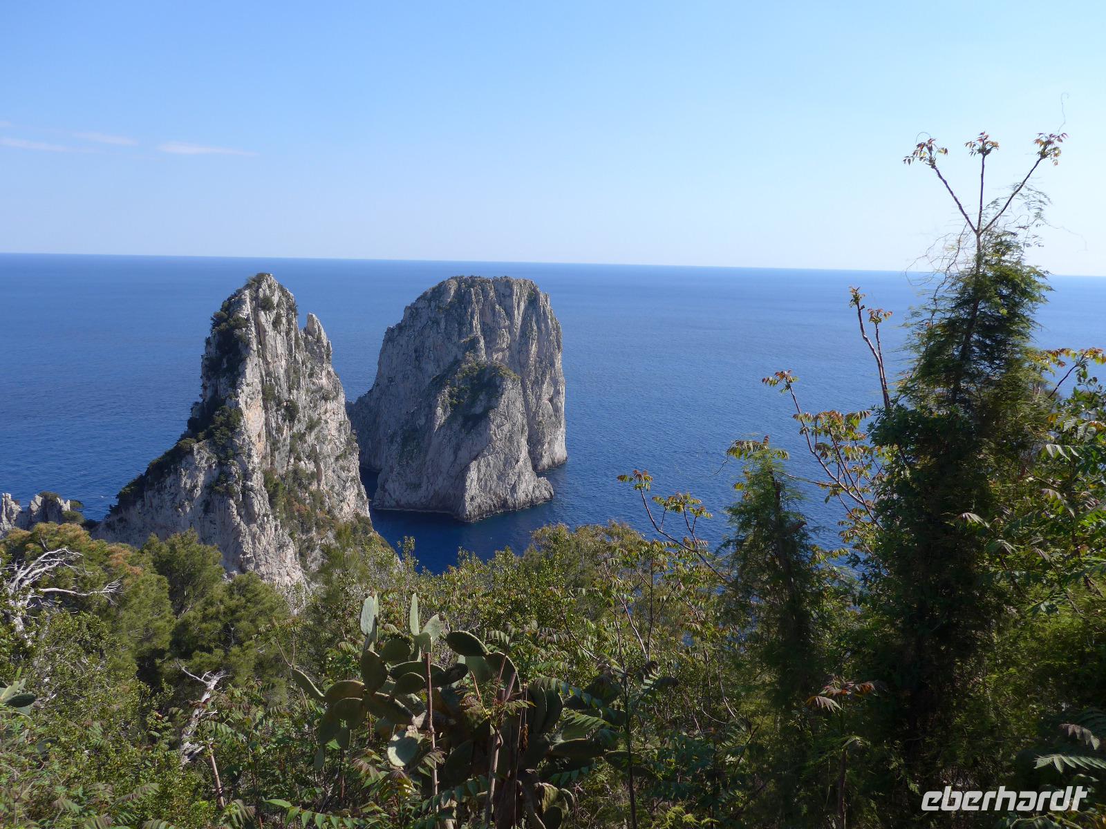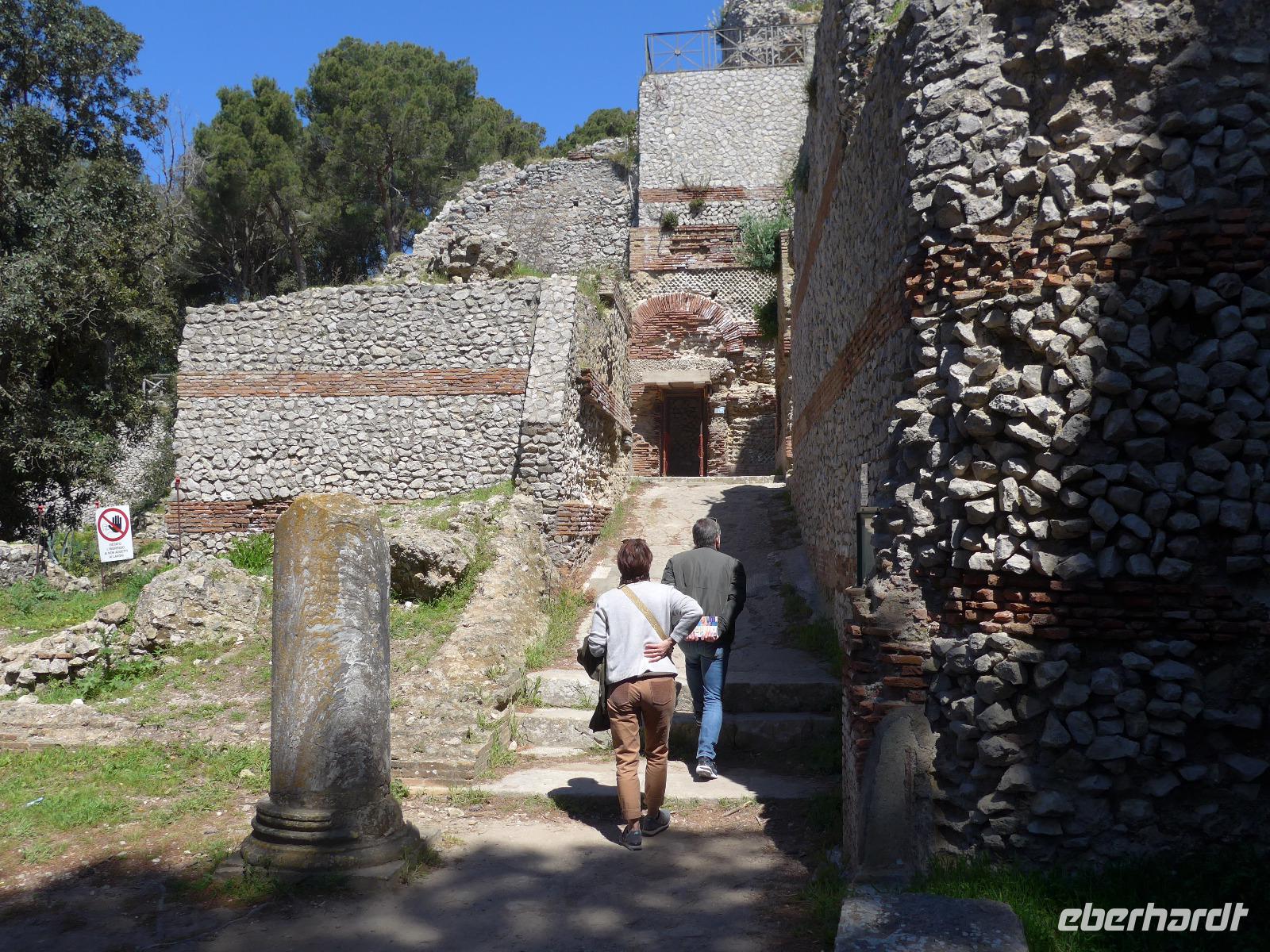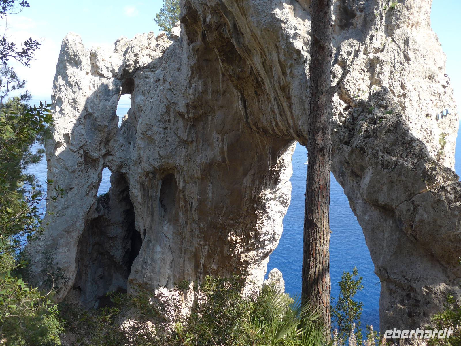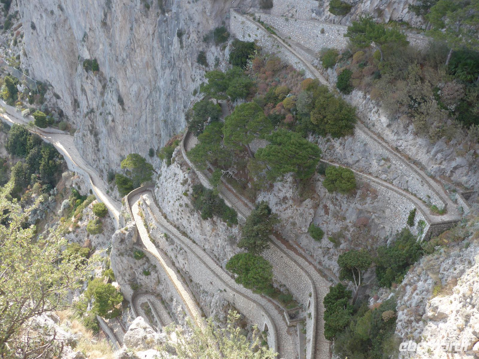 14 Gäste hatten sich für diesen Ausflug eingeschrieben und so starteten wir nach dem Frühstück zu Fuß zum Hafen in Sorrent. Wir fuhren mit der großen Fähre von Caremar eine halbe Stunde hinüber nach Capri. Annamaria stand schon am Hafen und begrüßte uns. Gemeinsam wanderten wir hinauf zur Piazzetta, dem touristischen Zentrum der Insel. Am Aussichtsbalkon erklärte uns Annamaria den Aufbau der Insel und gab viele allgemeine wichtige Informationen. Wir überquerten die Piazzetta und gingen durch die engen Gassen hinauf zur Villa Jovis. Von hier regierte Kaiser Tiberius das römische Reich 11 Jahre lang. Die exponierte Lage am höchsten Punkt Capris bot auch uns sehr schöne Ausblicke zum Vesuv, der sorrentinischen Halbinsel und zur Amalfiküste. Nach der Besichtigung der Villa gingen wir zurück zum Mittagessen ins "Da Tonino". Wir wurden vom Chef schon erwartet und bekamen als Vorspeise verschiedene Teigtaschen und dann die legendären Ravioli gefüllt mit Ricottakäse und Tomatensose dazu. Den Abschluß bildete eine Caprese Torte extra frisch für unsere Gruppe gebacken. Nun hatten wir genügend Kalorien aufgenommen und konnten unsere Wanderung zum Arco Naturale und zur Grotte Matermana beginnen. Über viele Stufen stiegen wir ab und dann wieder hinauf, um die Faragliono Felsen und die Villa Malaparte von oben zu bewundern. Der Weg endete an der Punta Tragara, wo das gleichnamige 5 Sterne Hotel steht.