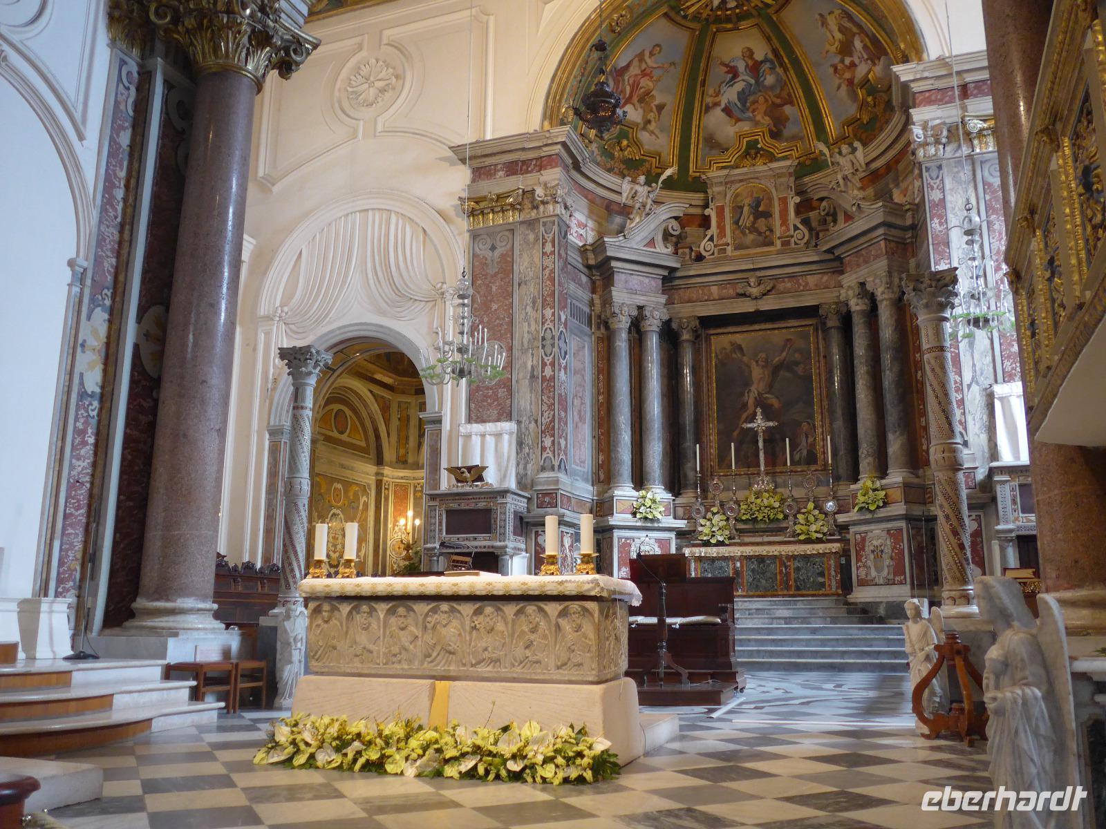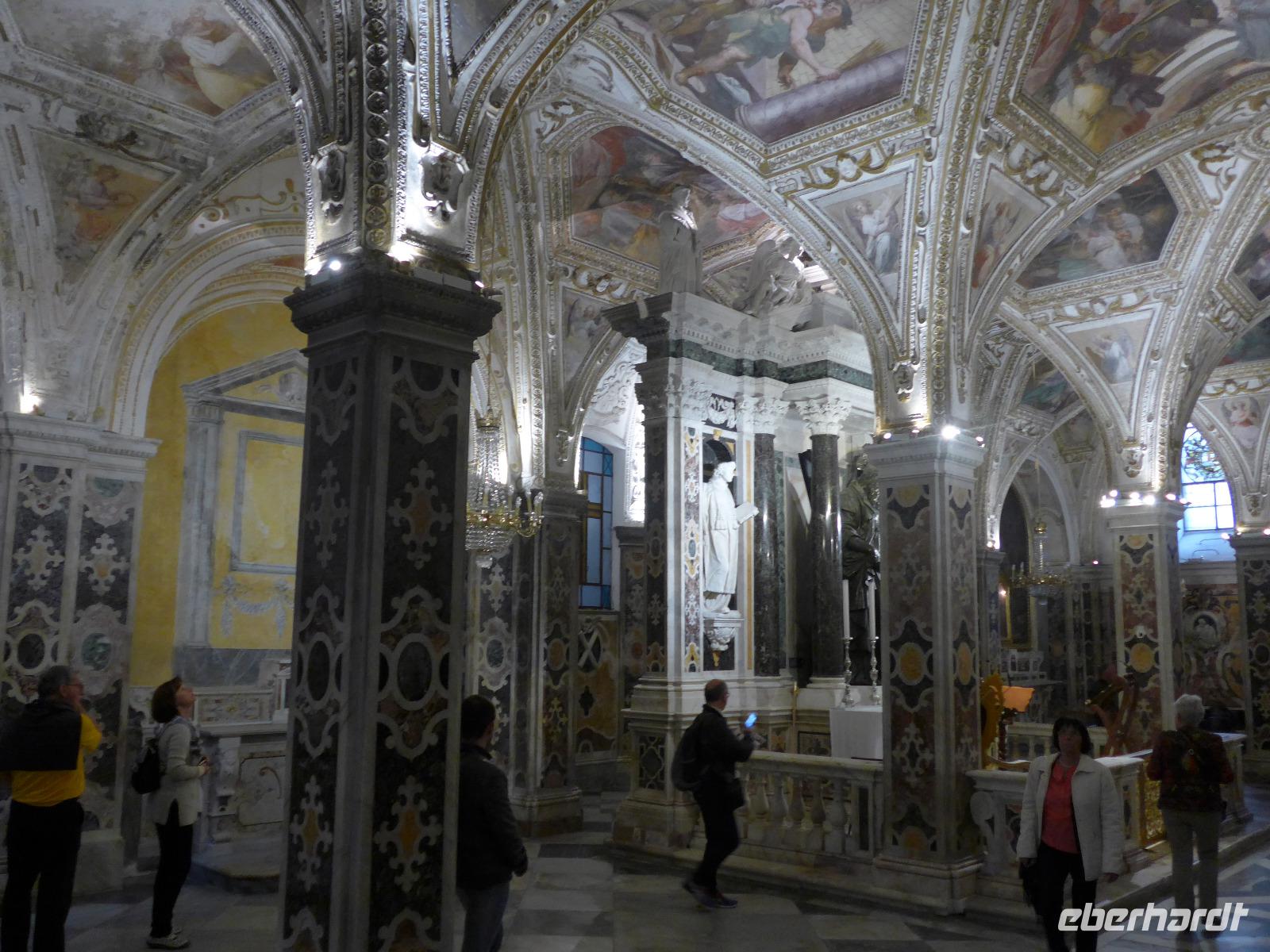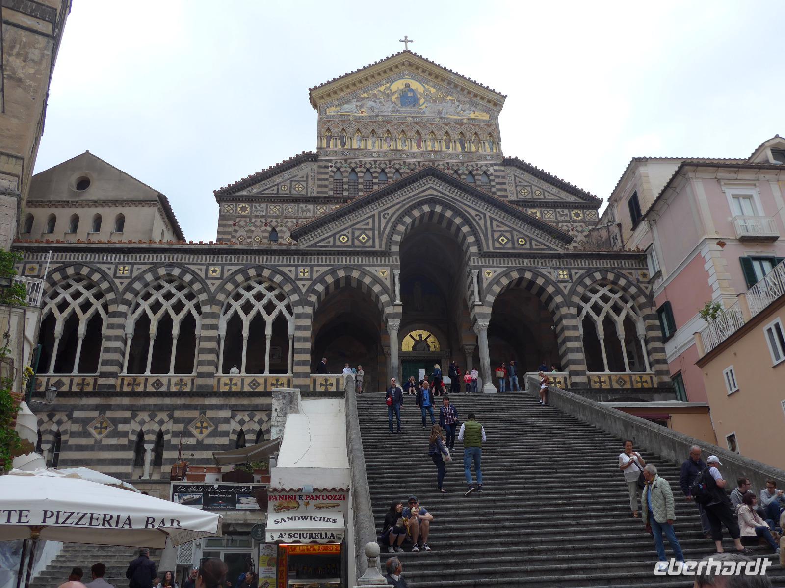 Unser Aufenthalt im Cilento war zu Ende und so hieß es mit gepackten Koffern zum zweiten Unterkunftsort aufzubrechen. Auf der Büffelfarm Vannulo empfing uns Stefanie und führte uns durch das weitläufige Gelände. Wir durften beim "Zupfen" des Käses zuschauen, die Schokolade und frischen Mozzarella probieren. Der riesige Stall wird modern überwacht und das Leben der Büffel so angenehm wie möglich gestaltet. Danach verabschiedeten wir uns von Angelo und wir bedankten uns für seine vielen und ausführlichen Information zum Cilento und für das gelungene Programm. Unser Busfahrer Elio aus Sorrent brachte uns auf der Schnellstraße und Autobahn zur Amalfitana. Diese enge und kurvenreiche Straße verlangt den Fahrern alles ab. In Amalfi hatten wir knapp 2 Stunden Zeit, den Dom mit Kreuzgang, Krypta und Basilika zu besuchen, durch die Gassen zu schlendern, eine Sfogliatella zu probieren und die vielen Menschen zu beobachten. Auf der Treppe zum Dom posierte ein Hochzeitspaar. Auf der Weiterfahrt entlang der Amalfitana machten wir Halt bei einem Keramikladen und nach Positano an einem Aussichtspunkt. Schließlich erreichten wir Sorrent, wo am Correale unsere Koffer in das Auto des Hotels umgeladen wurden. Wir stiegen bei der Kirche aus und gingen das letzte Stück zu Fuß zu unserem Hotel Astoria mitten in der Altstadt von Sorrent.