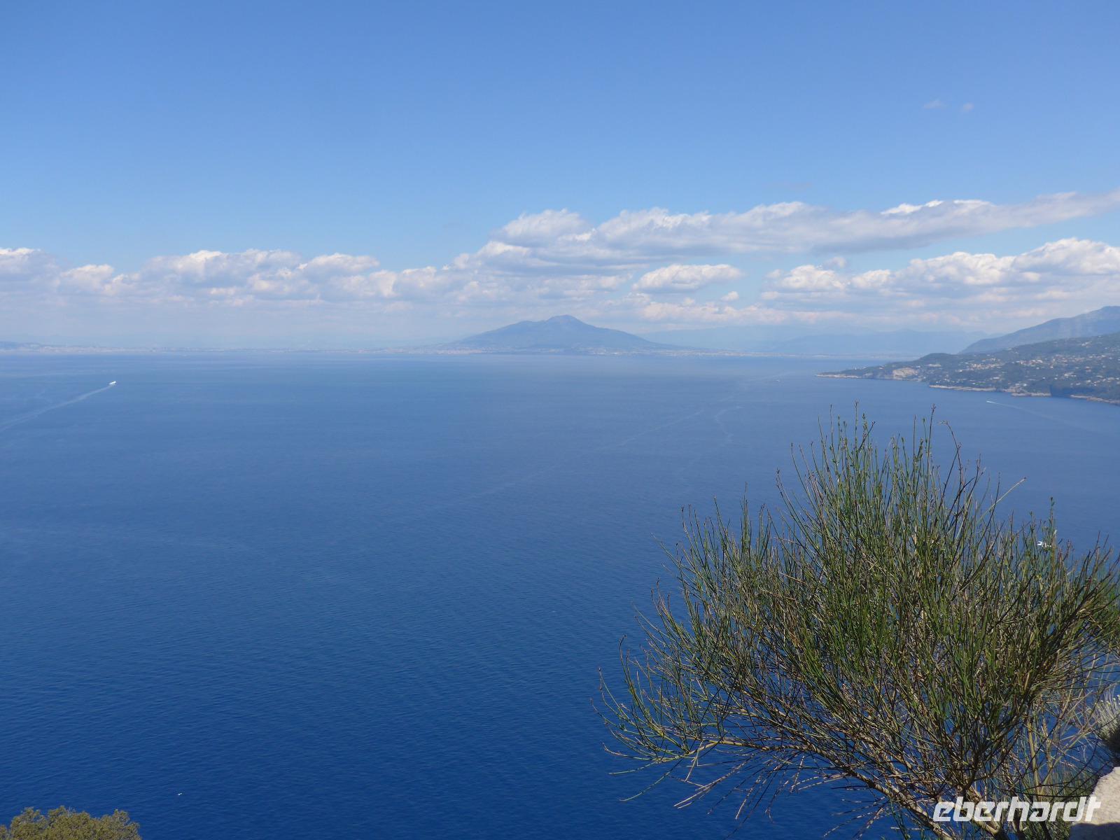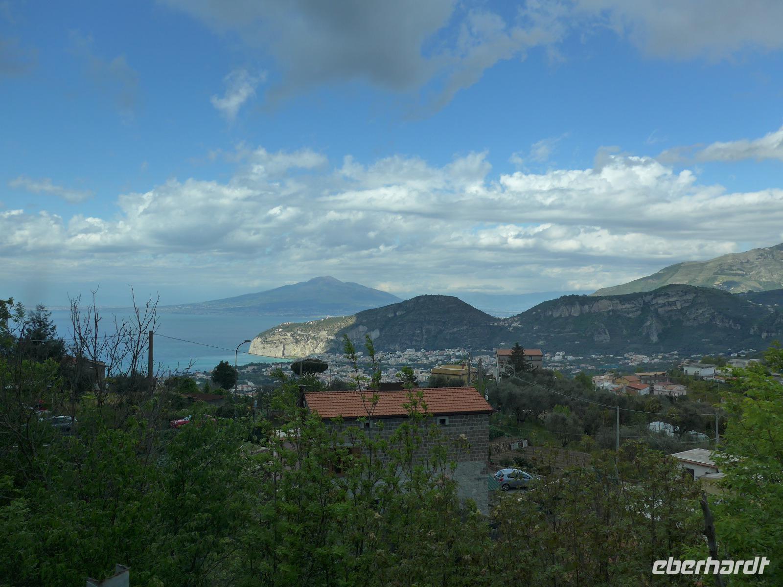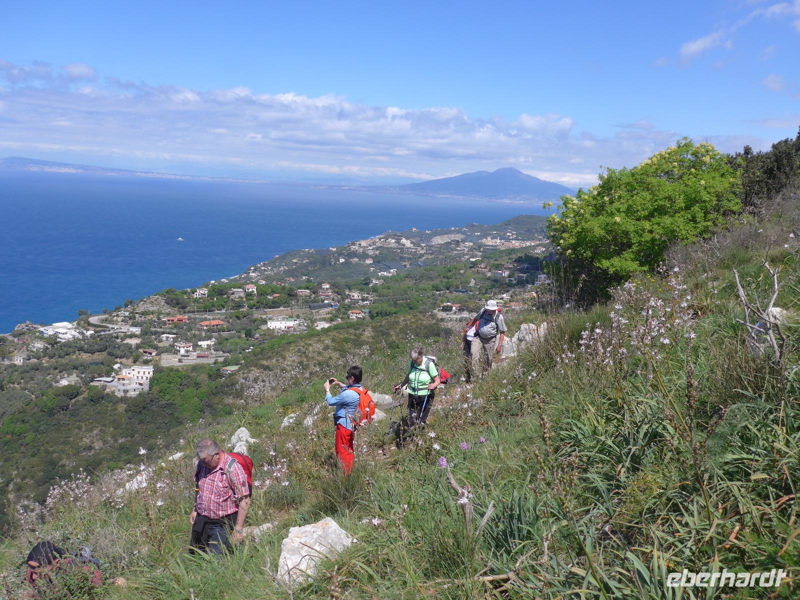 Nach dem Frühstück kam Marco ins Hotel und begrüßte alle Teilnehmer unserer Gruppe. Mit ihm waren 2 Wanderungen geplant. An der Kirche in Sorrent stiegen wir in unseren Bus und fuhren nach Termini. Dort ließ ich für jeden ein Sandwich herrichten und dann wanderten wir gemeinsam zur Punta Campanella. Heute steht dort der Minervaturm von den Römern. Zuvor hatten die Griechen an gleicher Stelle einen Athena Tempel errichtet. Um den Turm herum gab es einst römische Villen, von denen die Natur heute wieder Reste freigibt. Für die Wanderung auf den Mt.S.Costanzo waren 450 Höhenmeter zu überwinden. 6 Gäste nahmen mit Marco den steilen direkten Weg und die anderen gingen mit mir den längeren Zickzackweg hinauf. Oben trafen wir uns und verspeisten unser Sandwich und italienischen Nougat. Es war sehr gute Sicht und so konnten wir bis zum Cilento schauen und deutlich den Monte Stella ausmachen. Hinunter nach Termini liefen wir auf dem Pilgerweg mit vielen Stufen. Am Ortsrand besuchten wir eine Bar, tranken Granita, Kaffee und frisch gepresste Säfte. Für den Rückweg nahm unser Busfahrer Emiliano die Panoramastrasse über die sorrentinische Halbinsel mit vielen schönen Aussichtspunkten.