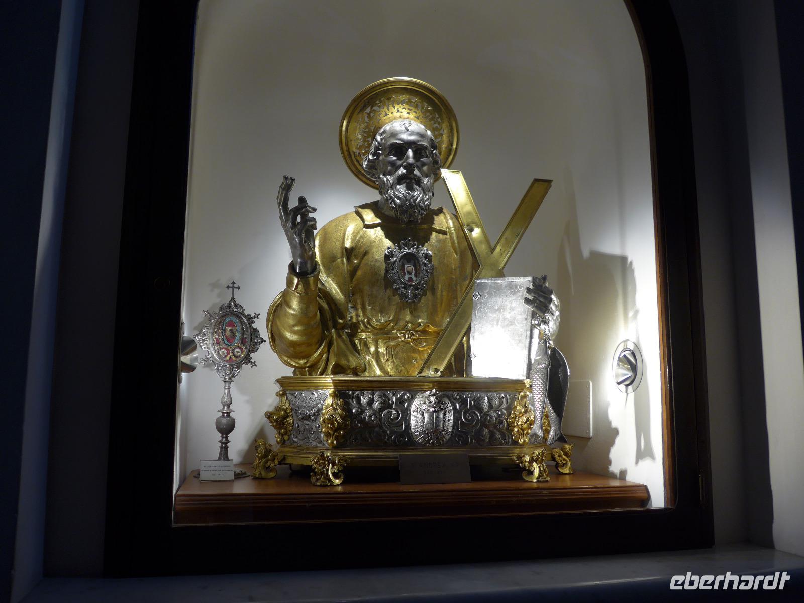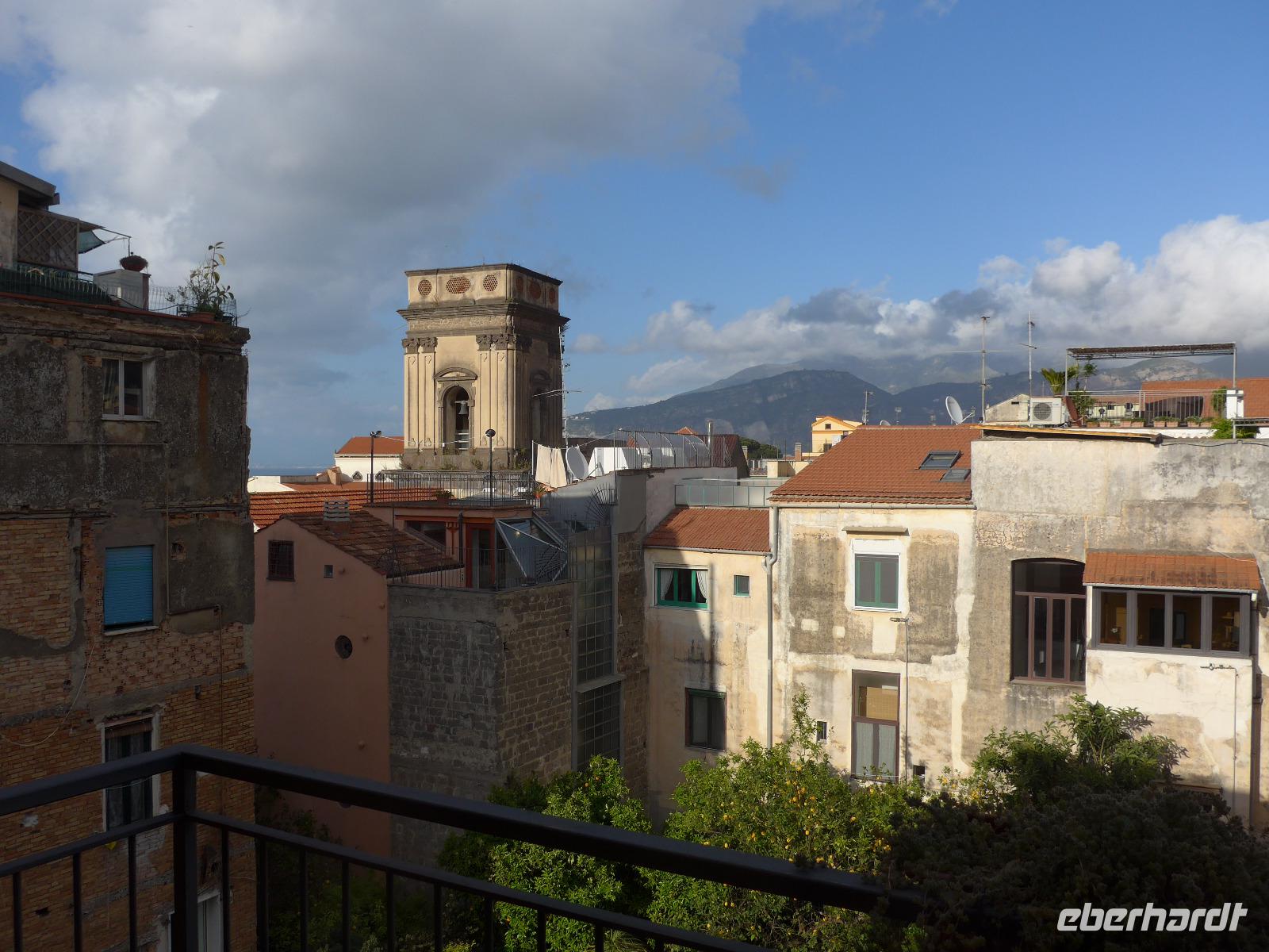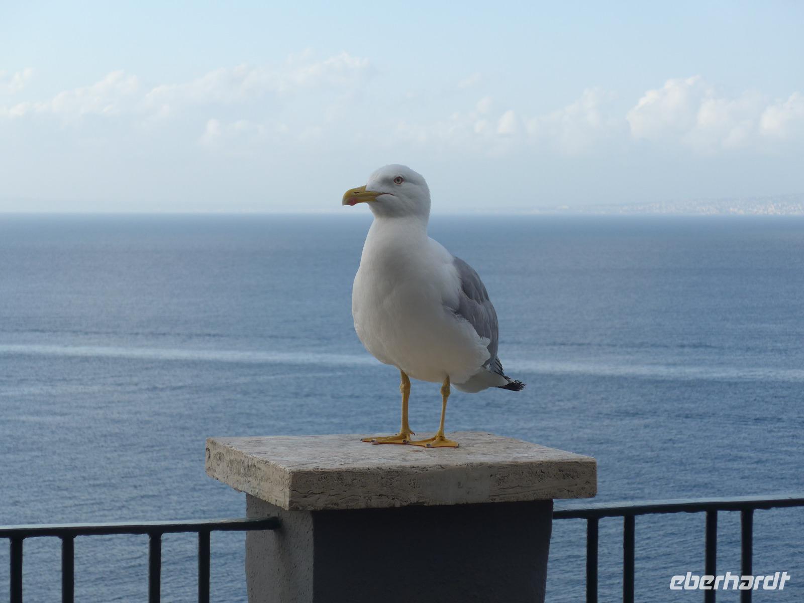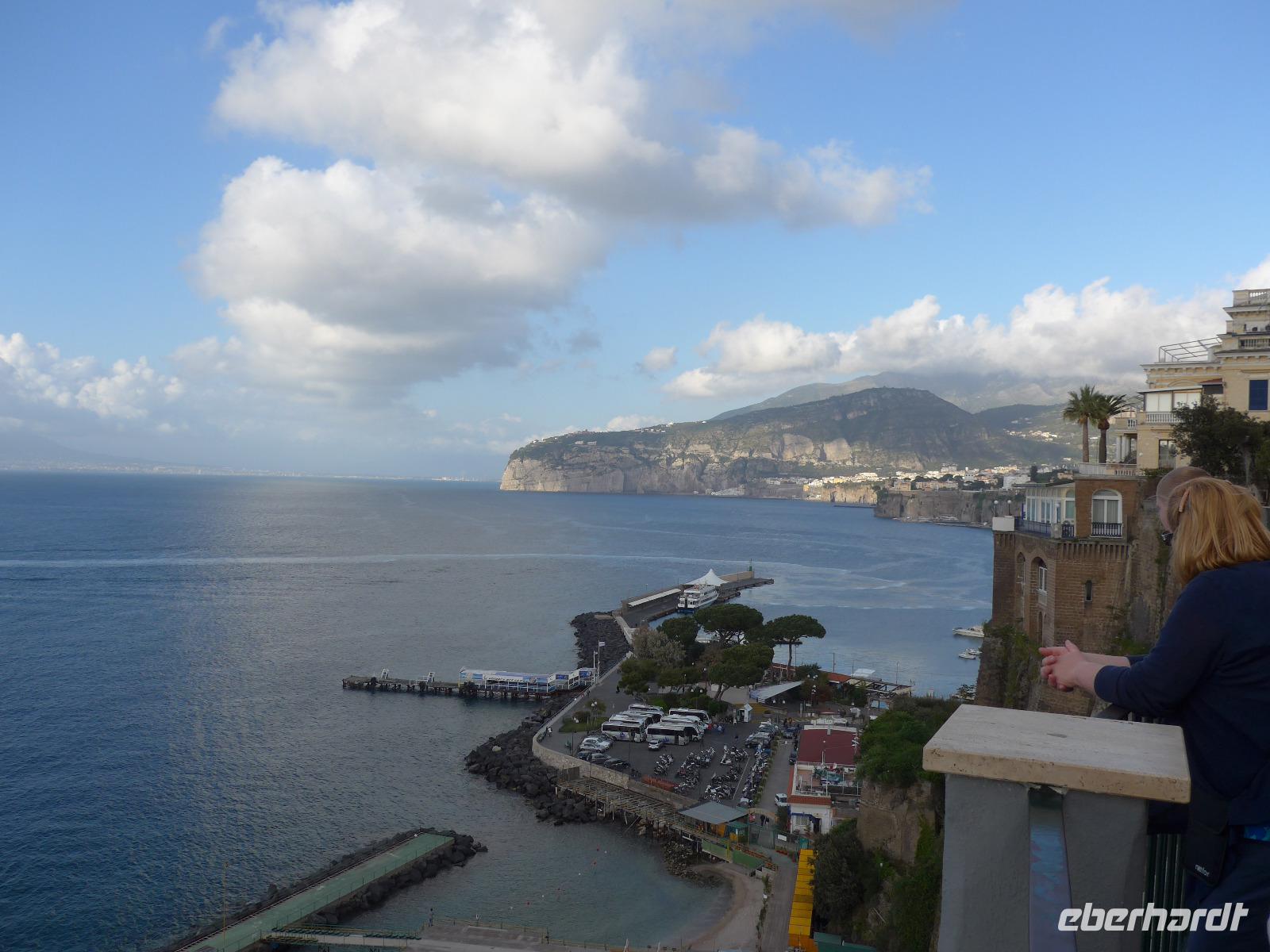 Nach dem Frühstück kam Marco ins Hotel und begrüßte alle Teilnehmer unserer Gruppe. Mit ihm waren 2 Wanderungen geplant. An der Kirche in Sorrent stiegen wir in unseren Bus und fuhren nach Termini. Dort ließ ich für jeden ein Sandwich herrichten und dann wanderten wir gemeinsam zur Punta Campanella. Heute steht dort der Minervaturm von den Römern. Zuvor hatten die Griechen an gleicher Stelle einen Athena Tempel errichtet. Um den Turm herum gab es einst römische Villen, von denen die Natur heute wieder Reste freigibt. Für die Wanderung auf den Mt.S.Costanzo waren 450 Höhenmeter zu überwinden. 6 Gäste nahmen mit Marco den steilen direkten Weg und die anderen gingen mit mir den längeren Zickzackweg hinauf. Oben trafen wir uns und verspeisten unser Sandwich und italienischen Nougat. Es war sehr gute Sicht und so konnten wir bis zum Cilento schauen und deutlich den Monte Stella ausmachen. Hinunter nach Termini liefen wir auf dem Pilgerweg mit vielen Stufen. Am Ortsrand besuchten wir eine Bar, tranken Granita, Kaffee und frisch gepresste Säfte. Für den Rückweg nahm unser Busfahrer Emiliano die Panoramastrasse über die sorrentinische Halbinsel mit vielen schönen Aussichtspunkten.