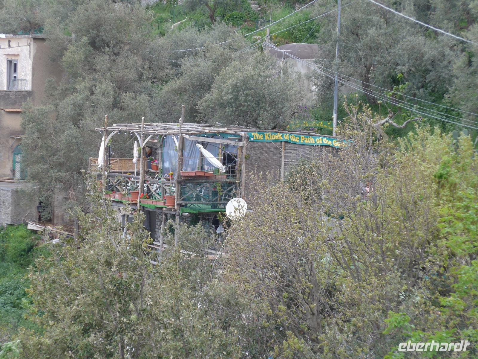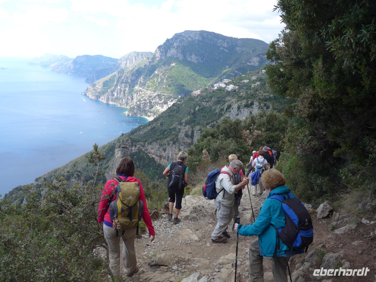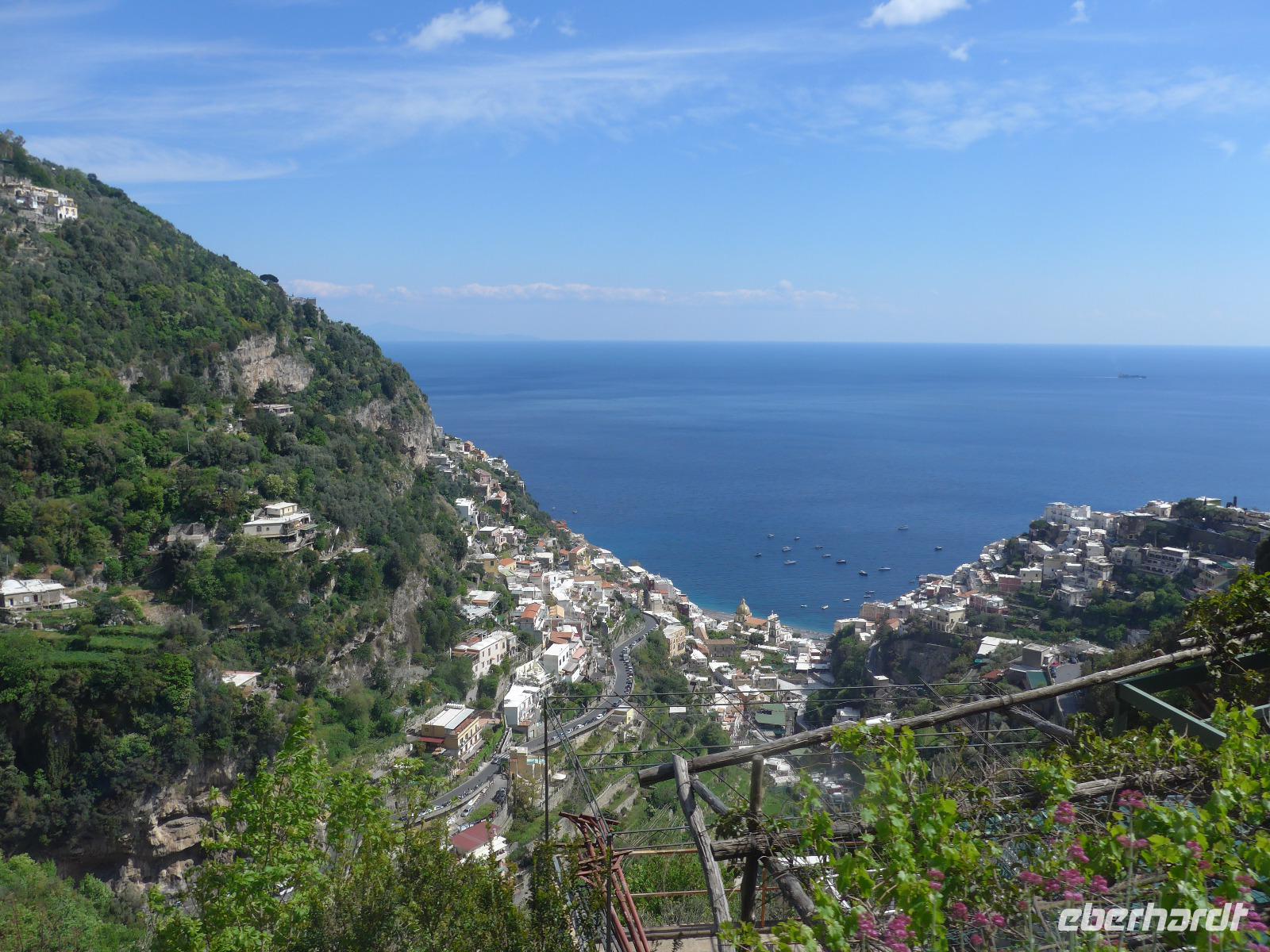 Es war frisch, die Sonne schien und wir hatten gute Sicht. Wir wanderten auf dem Götterweg mit vielen anderen Gruppen. Steile Terrassen, unten am Meer die Amalfitana und der Blick auf Praiana und später auf Positano begleiteten uns. Der Weg führte über viele Steine und Treppen im ständigen Wechsel bergauf und bergab. Am Ende des Weges steht der chiosco del sentierero degli dei und dort nahmen wir einen Mittagsimbiß ein. Der Bau oben am Felsen ist spektakulär, erfüllt aber seinen Zweck und uns mundete es sehr nach der Wanderung. Der Weg hinunter nach Positano ist sehr steil und führt über viele Treppen. 6 Gäste fuhren deshalb mit mir mit dem Linienbus und die anderen gingen mit Marco zu Fuß hinunter. Positano ist neben Amalfi der zweite malerische Ort an der Amalfiküste, den man gesehen haben sollte. Wir nahmen uns Zeit für einen letzten Kaffee und ein Eis. Hinauf zur Hauptstrasse mußten wir mit dem örtlichen Bus fahren, weil die Touristenbusse nicht mehr in den Ort fahren dürfen. Wieder in Sorrent verabschiedeten wir uns von Marco und unserem Fahrer und liefen zurück ins Hotel. Zum Abschiedsabend gab es Pizza und dann mußten ja noch die Koffer gepackt werden.
