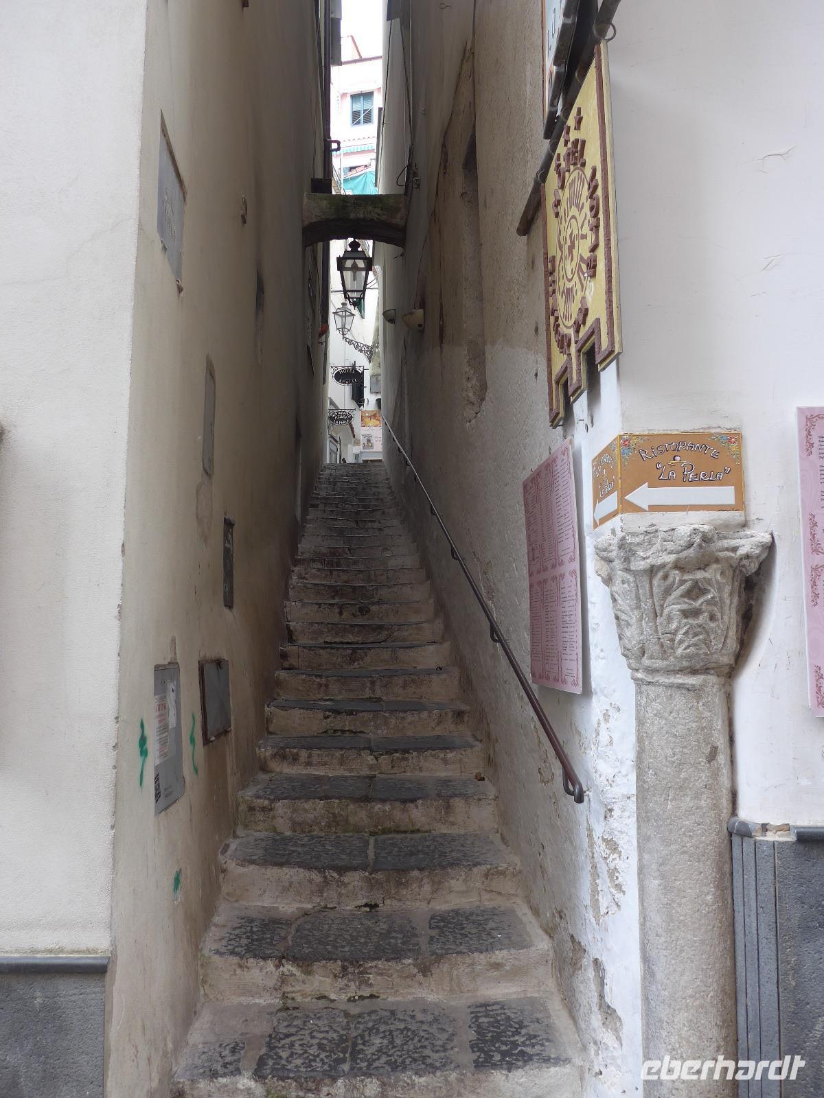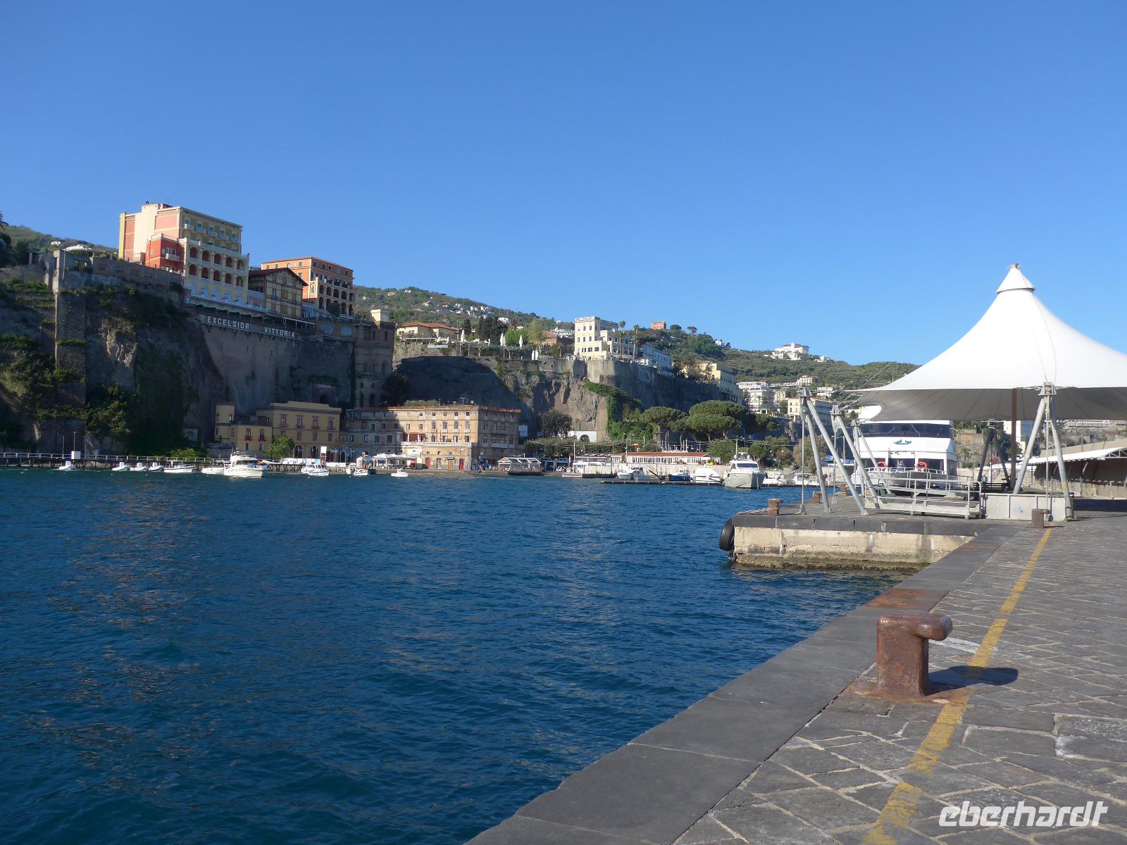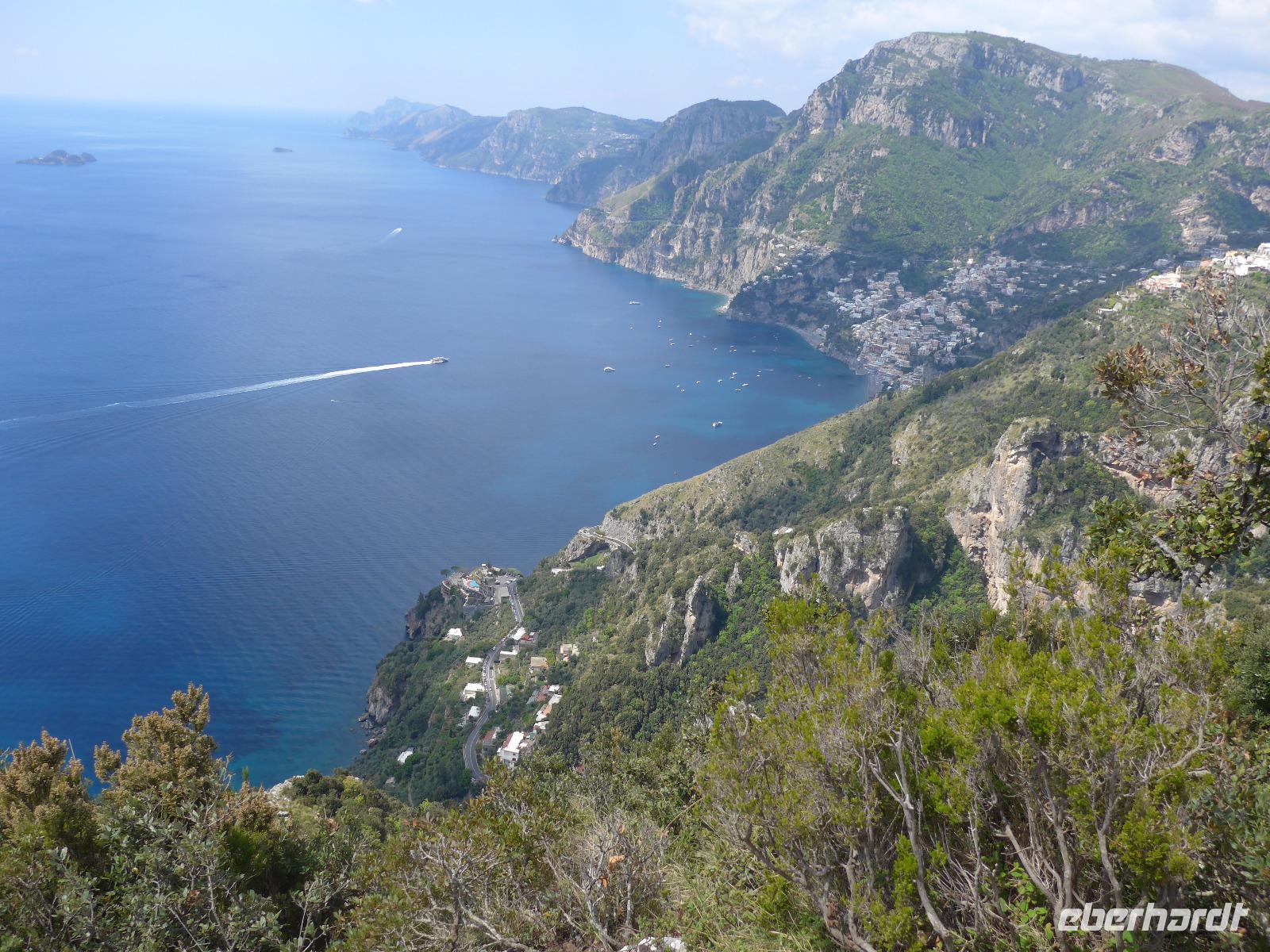 Es war frisch, die Sonne schien und wir hatten gute Sicht. Wir wanderten auf dem Götterweg mit vielen anderen Gruppen. Steile Terrassen, unten am Meer die Amalfitana und der Blick auf Praiana und später auf Positano begleiteten uns. Der Weg führte über viele Steine und Treppen im ständigen Wechsel bergauf und bergab. Am Ende des Weges steht der chiosco del sentierero degli dei und dort nahmen wir einen Mittagsimbiß ein. Der Bau oben am Felsen ist spektakulär, erfüllt aber seinen Zweck und uns mundete es sehr nach der Wanderung. Der Weg hinunter nach Positano ist sehr steil und führt über viele Treppen. 6 Gäste fuhren deshalb mit mir mit dem Linienbus und die anderen gingen mit Marco zu Fuß hinunter. Positano ist neben Amalfi der zweite malerische Ort an der Amalfiküste, den man gesehen haben sollte. Wir nahmen uns Zeit für einen letzten Kaffee und ein Eis. Hinauf zur Hauptstrasse mußten wir mit dem örtlichen Bus fahren, weil die Touristenbusse nicht mehr in den Ort fahren dürfen. Wieder in Sorrent verabschiedeten wir uns von Marco und unserem Fahrer und liefen zurück ins Hotel. Zum Abschiedsabend gab es Pizza und dann mußten ja noch die Koffer gepackt werden.