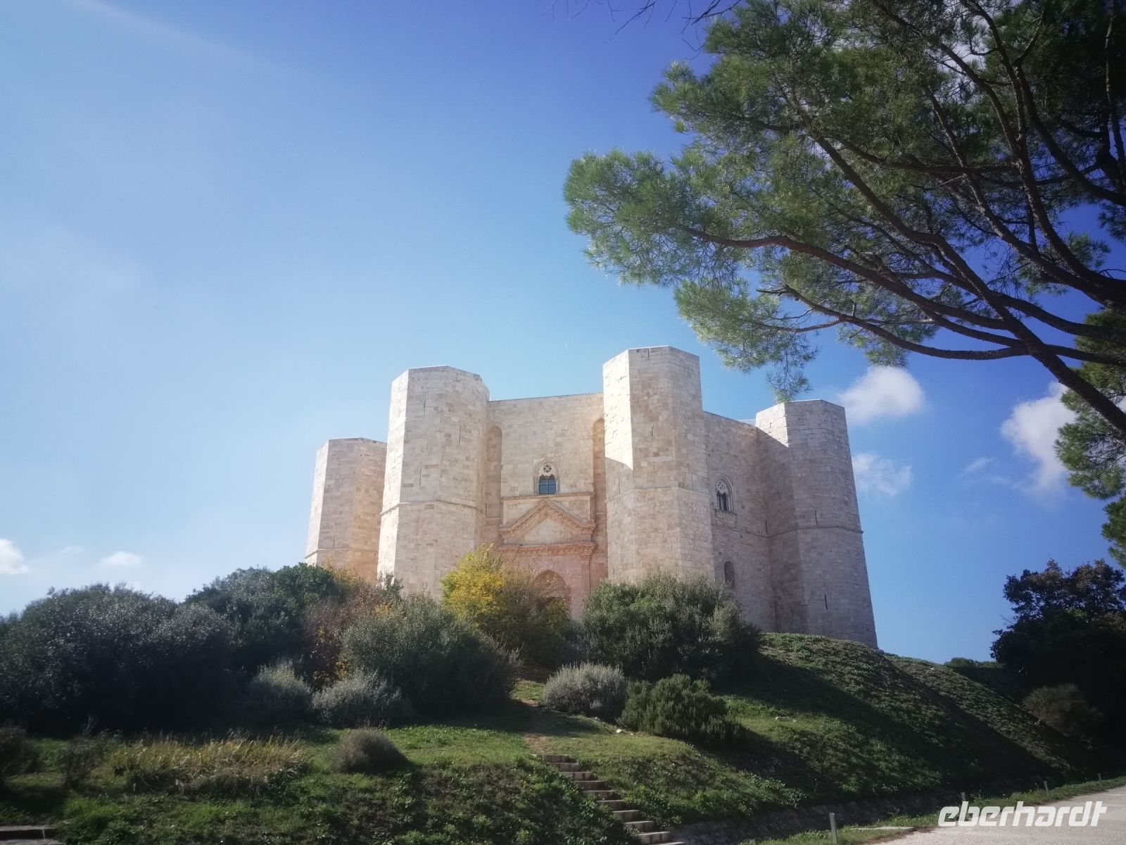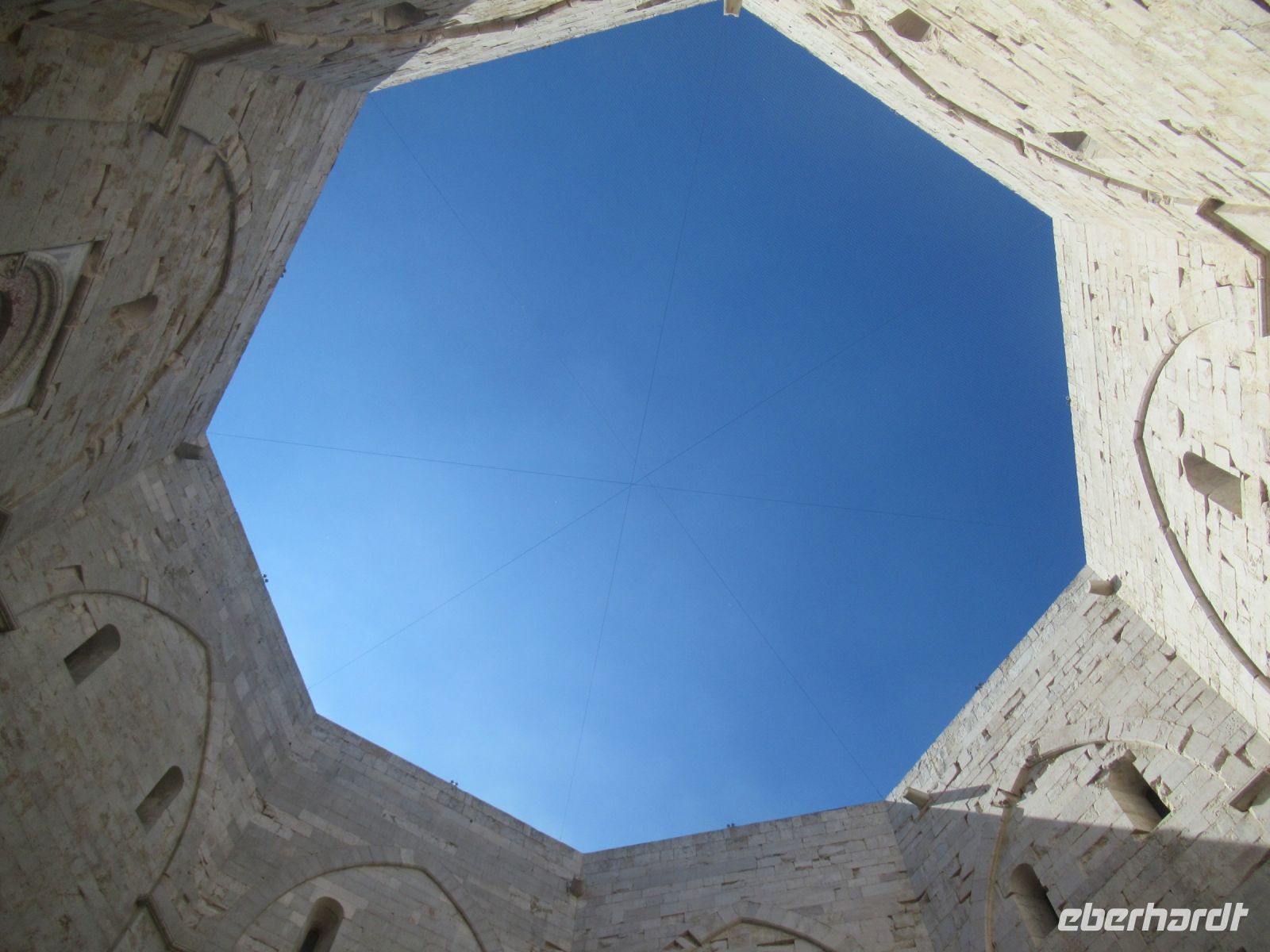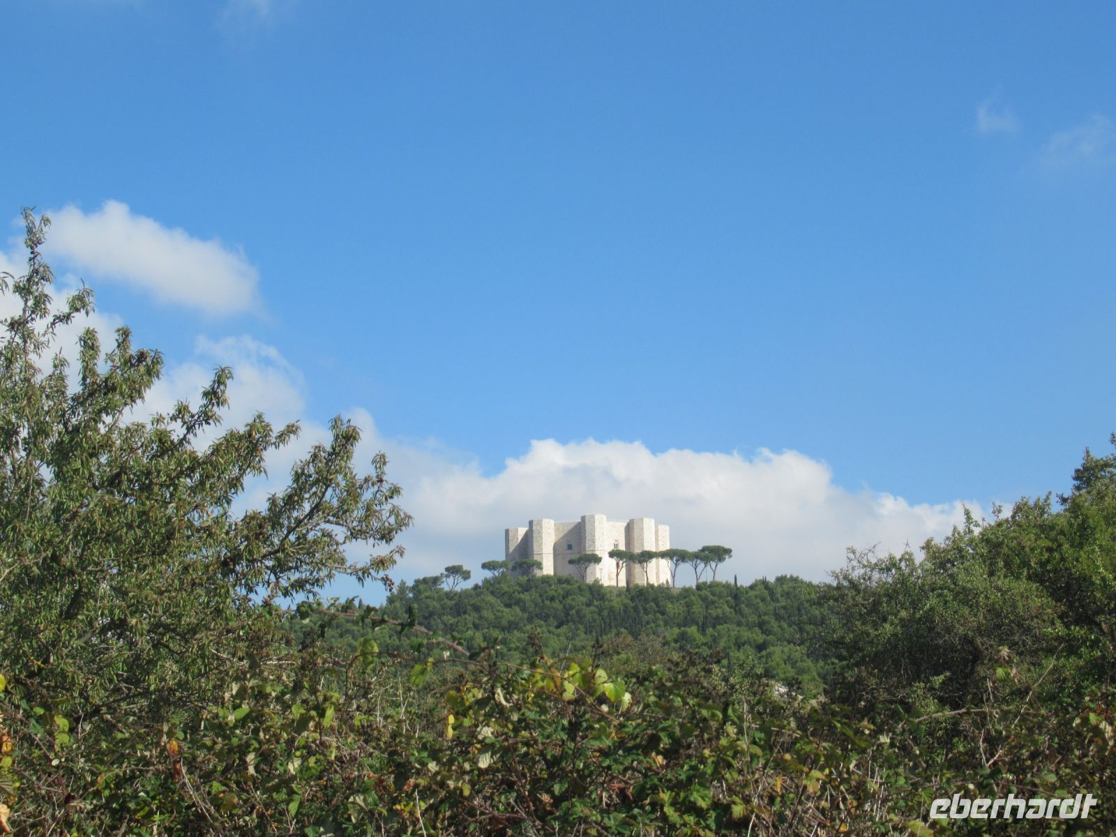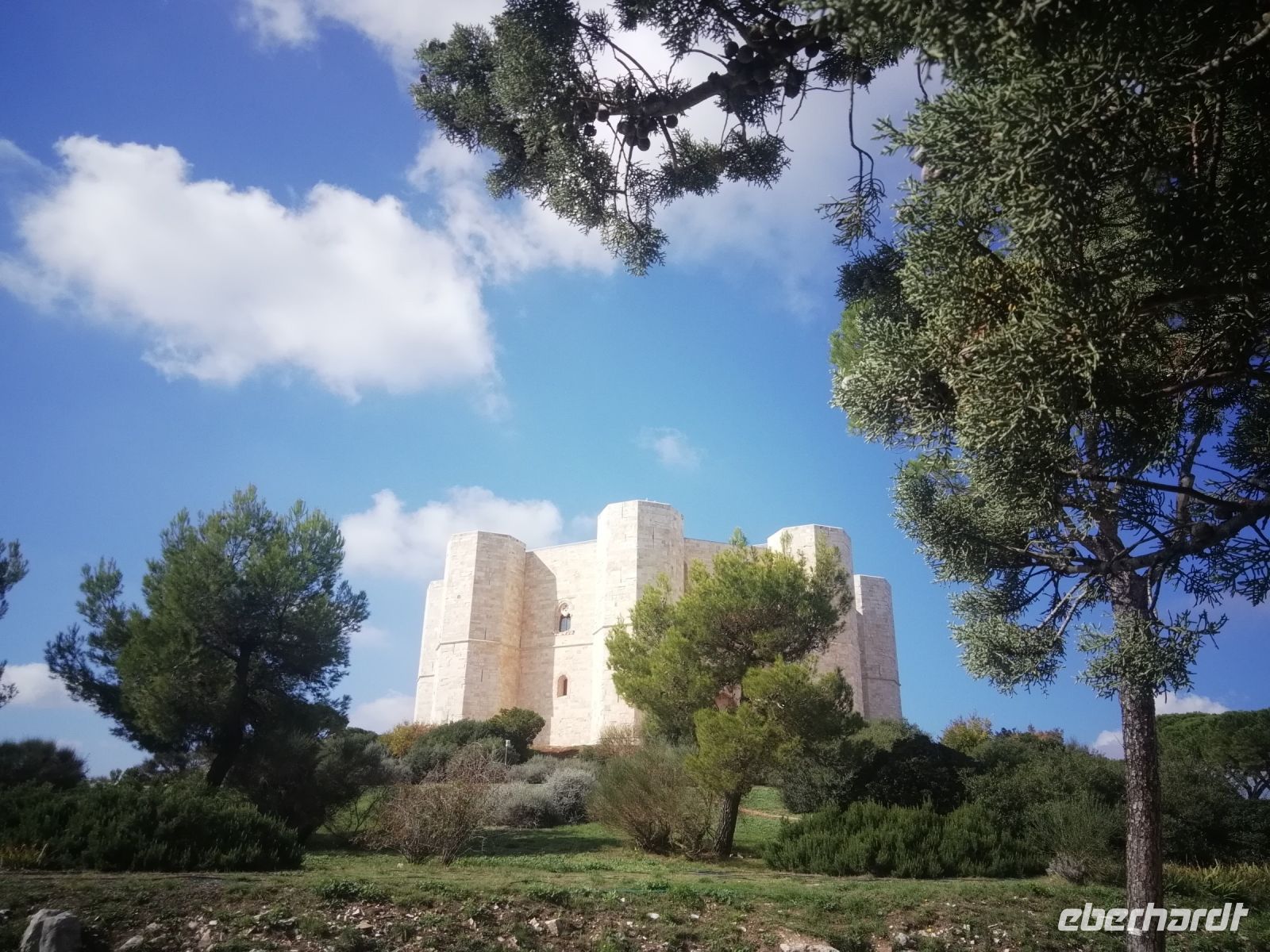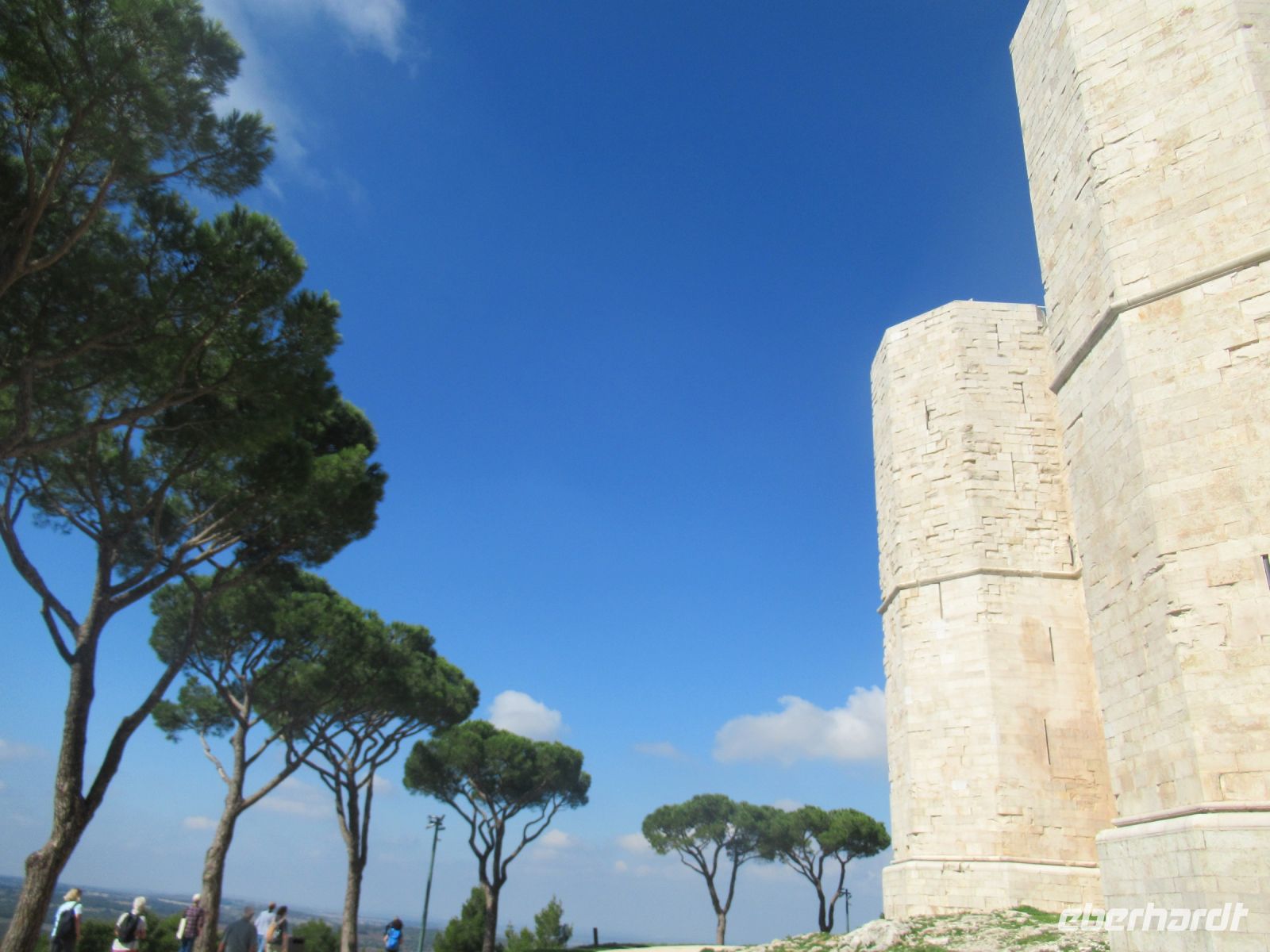 Heute heißt es, sich von der nördlichen Region Apuliens und Gargano Nationalpark zu verabschieden, um weitere Highlights Apuliens zu erkunden. So packten wir am Abend unsere Koffer und verabschiedeten uns vom Meer und der wunderschönen Region. Heute ein Frühstück mit Kaffeespezialitäten und Auswahl an frischen an Früchten. So gestärkt steigen wir schon um 8 Uhr in Bus ein und fahren ca. 160 km Richtung Süden, zum nächsten UNESCO Weltkulturerbe (seit 1996): Castel del Monte. Die „Steinerne Krone Apuliens“. Vom Bus gelangen wir durch ein Waldweg zum Castel. Imposant, mit klaren Linien. Und wieder bei dem schönsten Wetter konnten wir schon die ersten Eindrücke des außergewöhnlichen Bauwerks bewundern. Durch vorab bestellten Karten von Eberhardt Travel kamen wir schnell hinein und die Besucheranzahl ist dadurch auch geregelt. 8 – 8 – 8 ist die Zahl, die das geheimnisvolle Werk bestimmt. Acht achteckige Türme, achteckiger Innenhof. Das Castel del Monte wurde von 1240 bis 1250 errichtet und ist auch als die Demonstration der Macht Friedrich II. zu betrachten. Obwohl bis heute, (oder gerade deswegen) geschichtlich nicht ganz geklärt ist, zu welchen Zweck dieser außergewöhnliche Prachtbau diente, ist es faszinierend, die Dimensionen des Bauwerks, die noch erhaltene und vermutende Ausstattung des Gebäudes zu bestaunen. Dazu gehört das ausgeklügelte System der Verteidigung, die kleinen Entwässerungskanäle in jedem Raum, Steinbänke rund herum in vielen Räumen, Kaminöfen und sogar Toiletten. Viele Rätsel, zu welchem Zweck das Castel errichtet worden ist, für welche Zwecke es tatsächlich gedient hat. Was bedeuten die Formen des Achtecks? Die Historiker konnten bis heute diese Fragen nicht klar beantworten und so bleibt einfach der Eindruck eines gigantischen Bauwerks, umwoben von vielen Geheimnissen und Unbekannten und vielleicht auch deswegen so interessant. Nach der Besichtigung des Castels haben wir noch eine kleine individuelle Erfrischungspause eingelegt, bevor wir uns auf dem Weg zurück begeben.