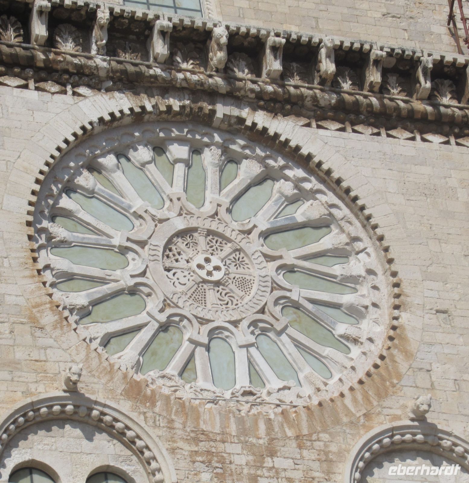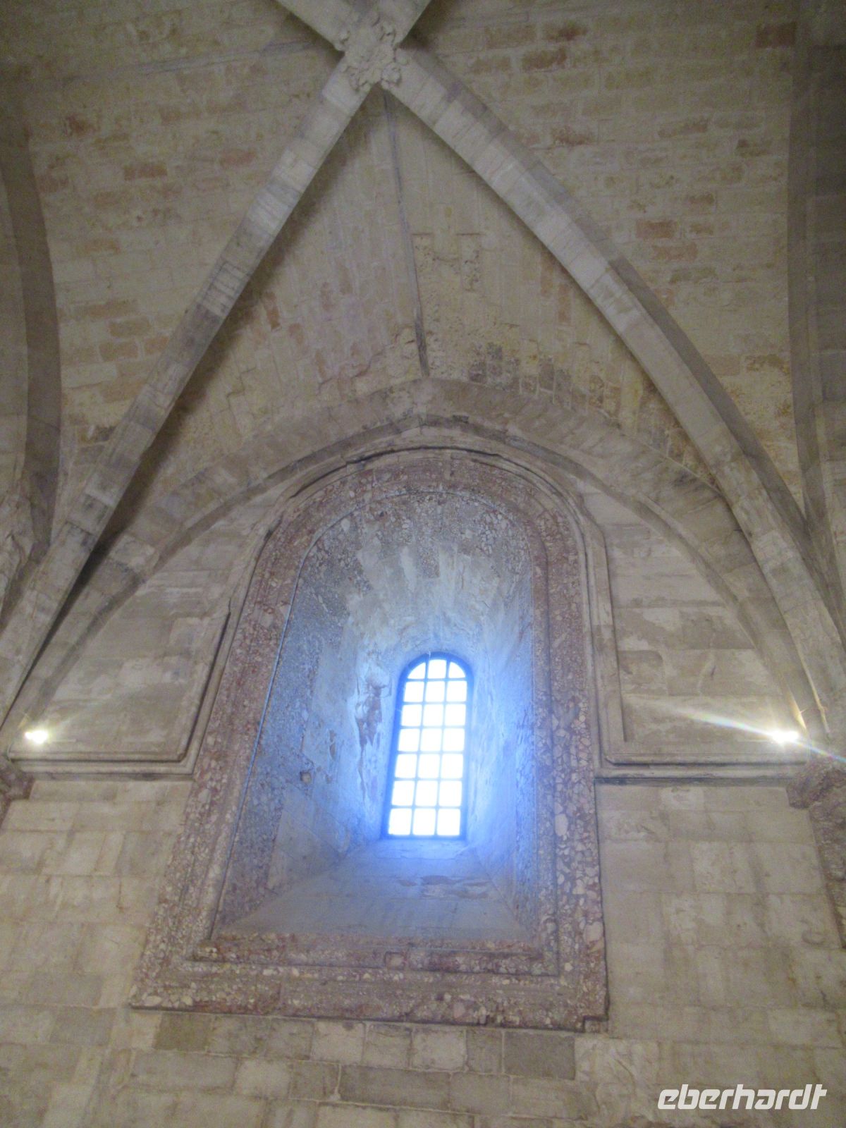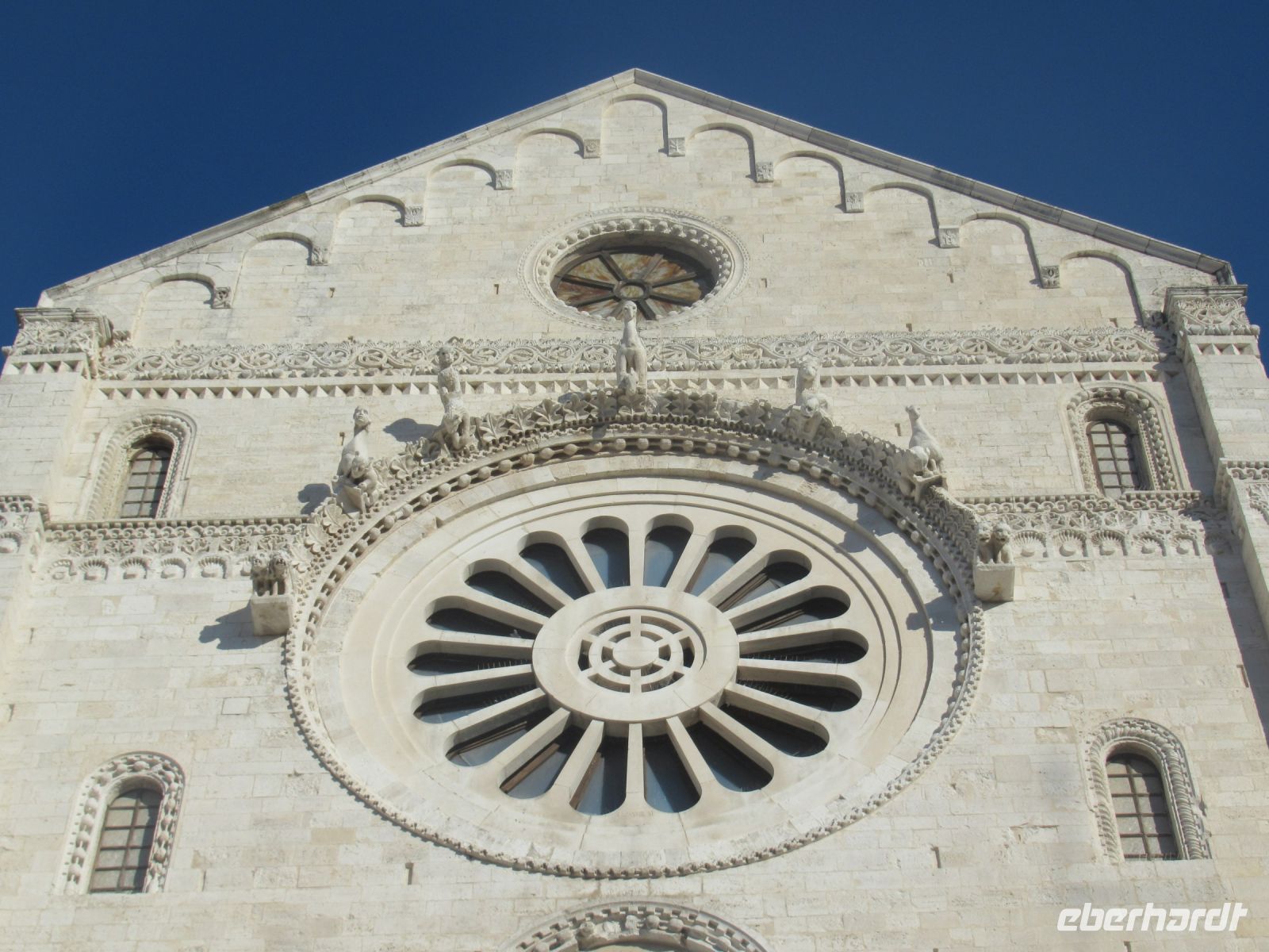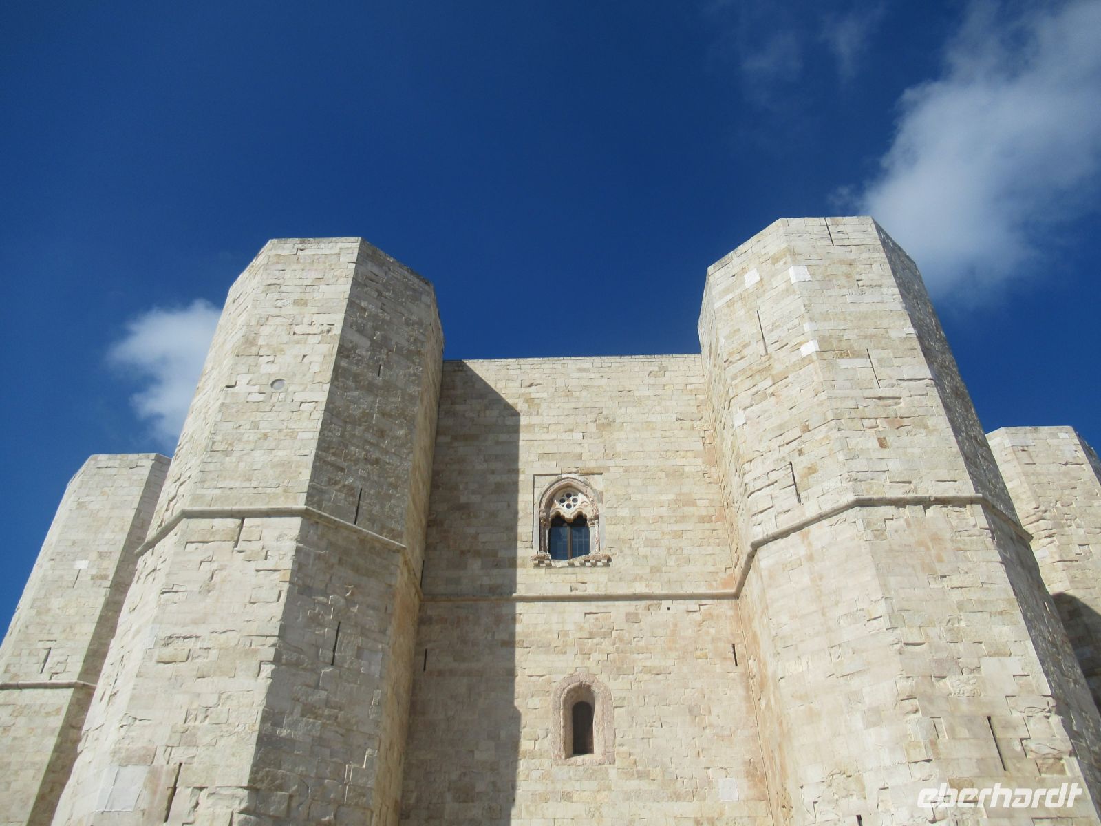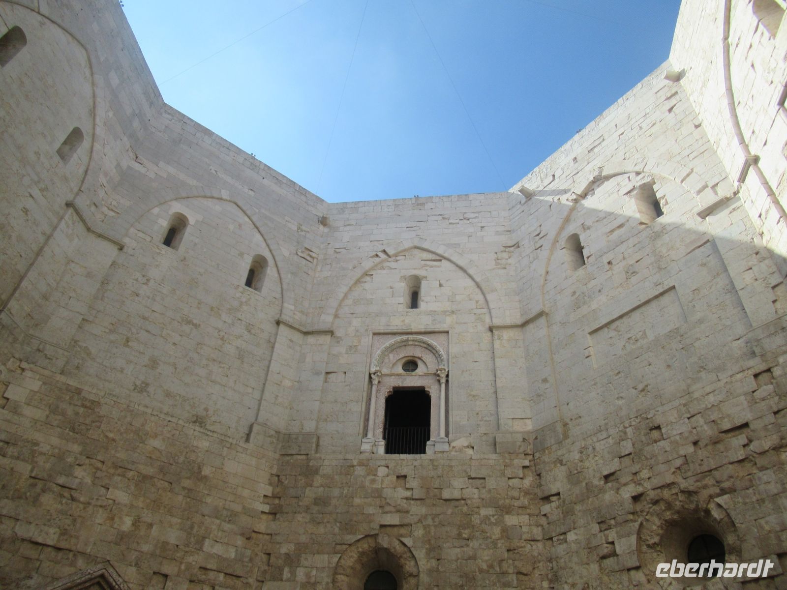 Heute heißt es, sich von der nördlichen Region Apuliens und Gargano Nationalpark zu verabschieden, um weitere Highlights Apuliens zu erkunden. So packten wir am Abend unsere Koffer und verabschiedeten uns vom Meer und der wunderschönen Region. Heute ein Frühstück mit Kaffeespezialitäten und Auswahl an frischen an Früchten. So gestärkt steigen wir schon um 8 Uhr in Bus ein und fahren ca. 160 km Richtung Süden, zum nächsten UNESCO Weltkulturerbe (seit 1996): Castel del Monte. Die „Steinerne Krone Apuliens“. Vom Bus gelangen wir durch ein Waldweg zum Castel. Imposant, mit klaren Linien. Und wieder bei dem schönsten Wetter konnten wir schon die ersten Eindrücke des außergewöhnlichen Bauwerks bewundern. Durch vorab bestellten Karten von Eberhardt Travel kamen wir schnell hinein und die Besucheranzahl ist dadurch auch geregelt. 8 – 8 – 8 ist die Zahl, die das geheimnisvolle Werk bestimmt. Acht achteckige Türme, achteckiger Innenhof. Das Castel del Monte wurde von 1240 bis 1250 errichtet und ist auch als die Demonstration der Macht Friedrich II. zu betrachten. Obwohl bis heute, (oder gerade deswegen) geschichtlich nicht ganz geklärt ist, zu welchen Zweck dieser außergewöhnliche Prachtbau diente, ist es faszinierend, die Dimensionen des Bauwerks, die noch erhaltene und vermutende Ausstattung des Gebäudes zu bestaunen. Dazu gehört das ausgeklügelte System der Verteidigung, die kleinen Entwässerungskanäle in jedem Raum, Steinbänke rund herum in vielen Räumen, Kaminöfen und sogar Toiletten. Viele Rätsel, zu welchem Zweck das Castel errichtet worden ist, für welche Zwecke es tatsächlich gedient hat. Was bedeuten die Formen des Achtecks? Die Historiker konnten bis heute diese Fragen nicht klar beantworten und so bleibt einfach der Eindruck eines gigantischen Bauwerks, umwoben von vielen Geheimnissen und Unbekannten und vielleicht auch deswegen so interessant. Nach der Besichtigung des Castels haben wir noch eine kleine individuelle Erfrischungspause eingelegt, bevor wir uns auf dem Weg zurück begeben.