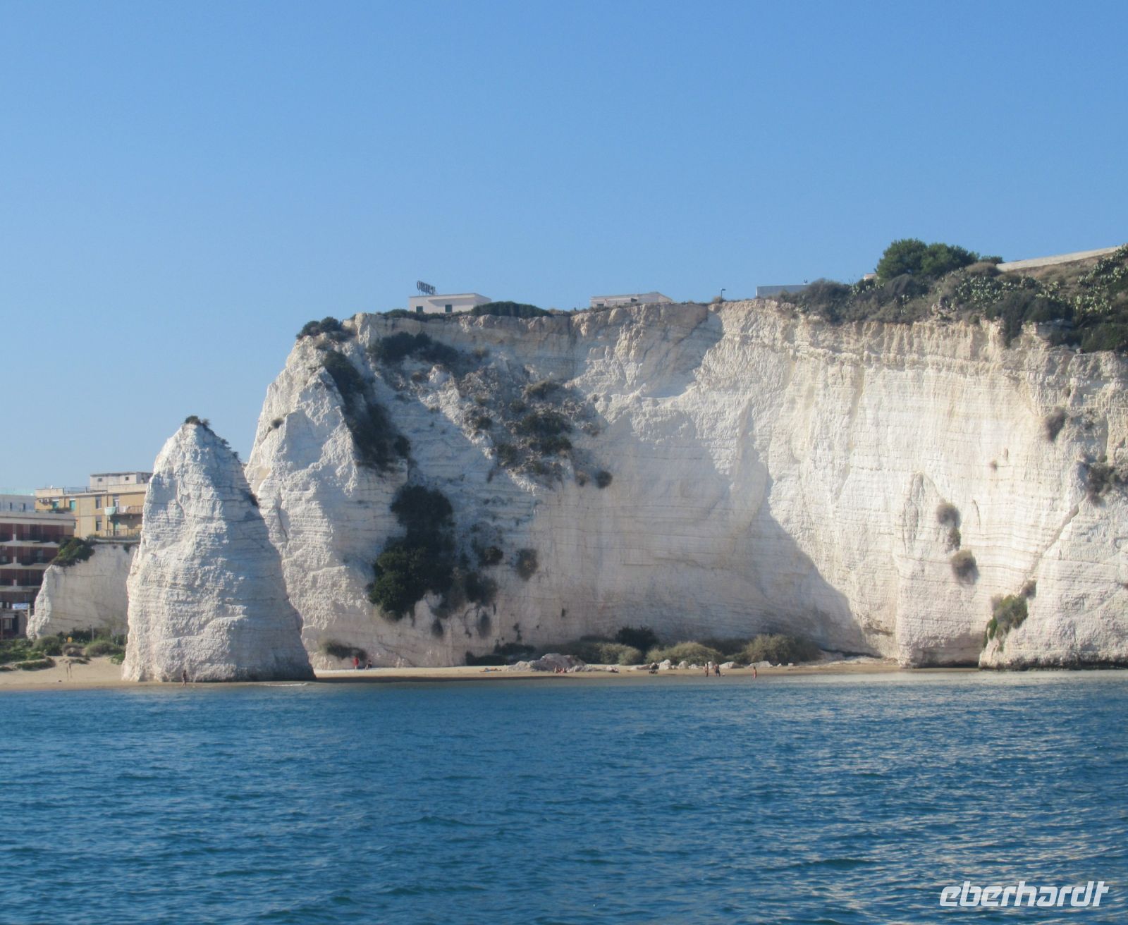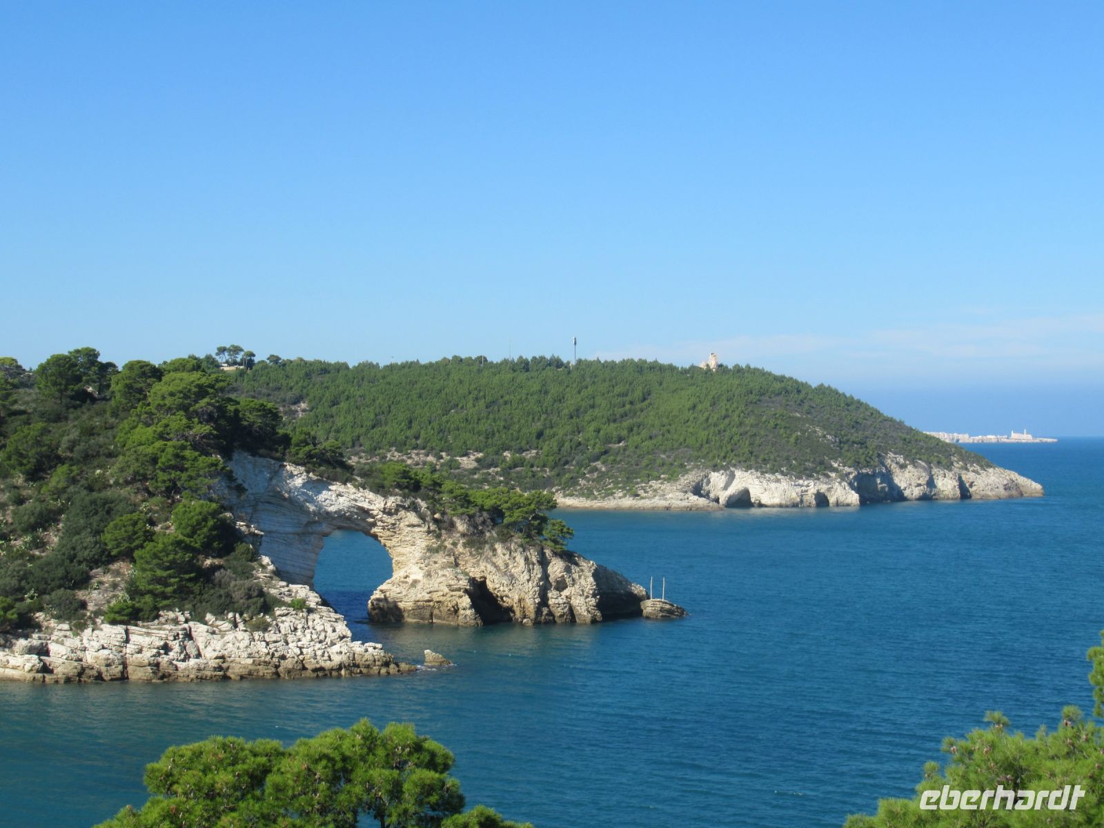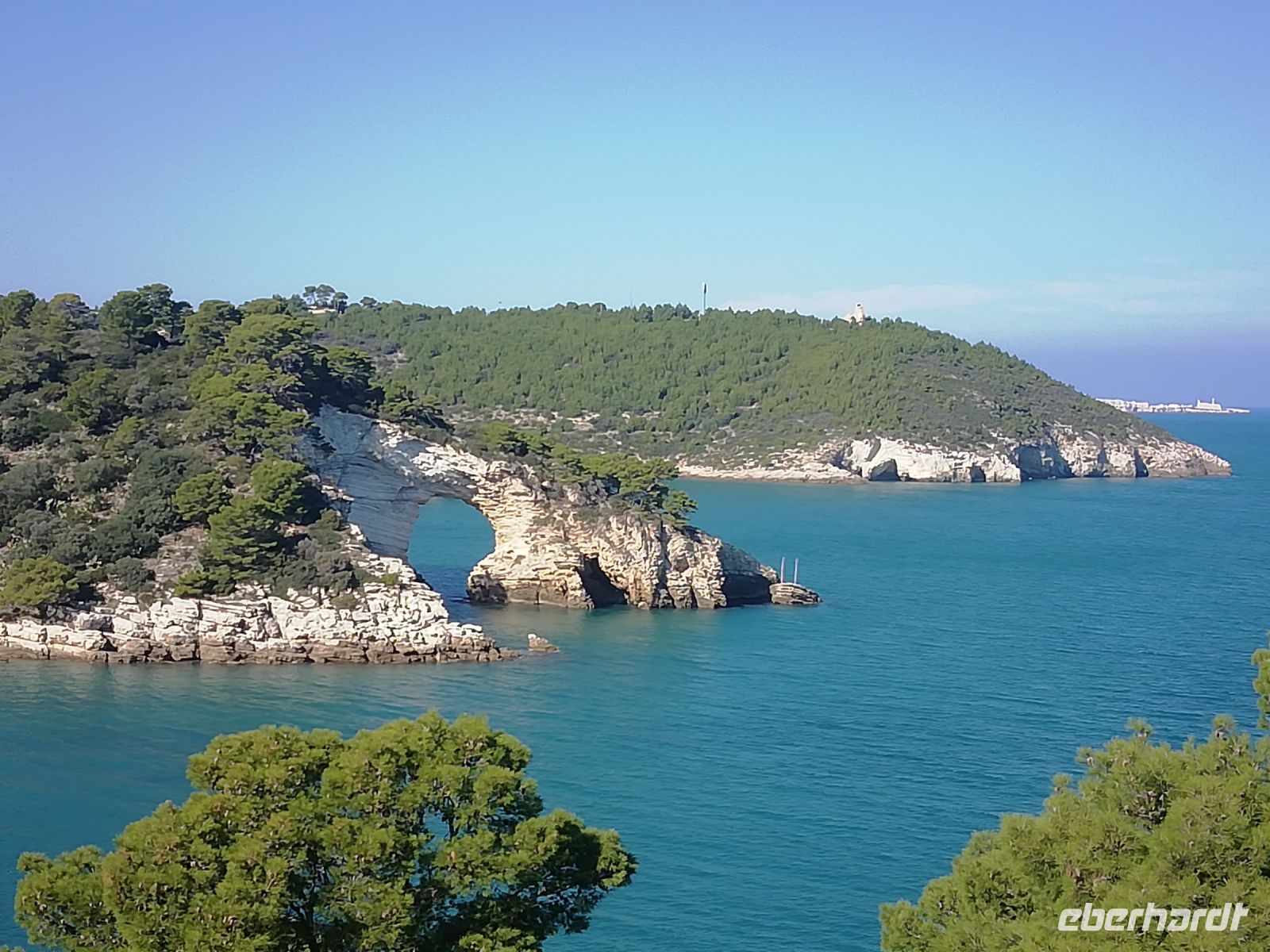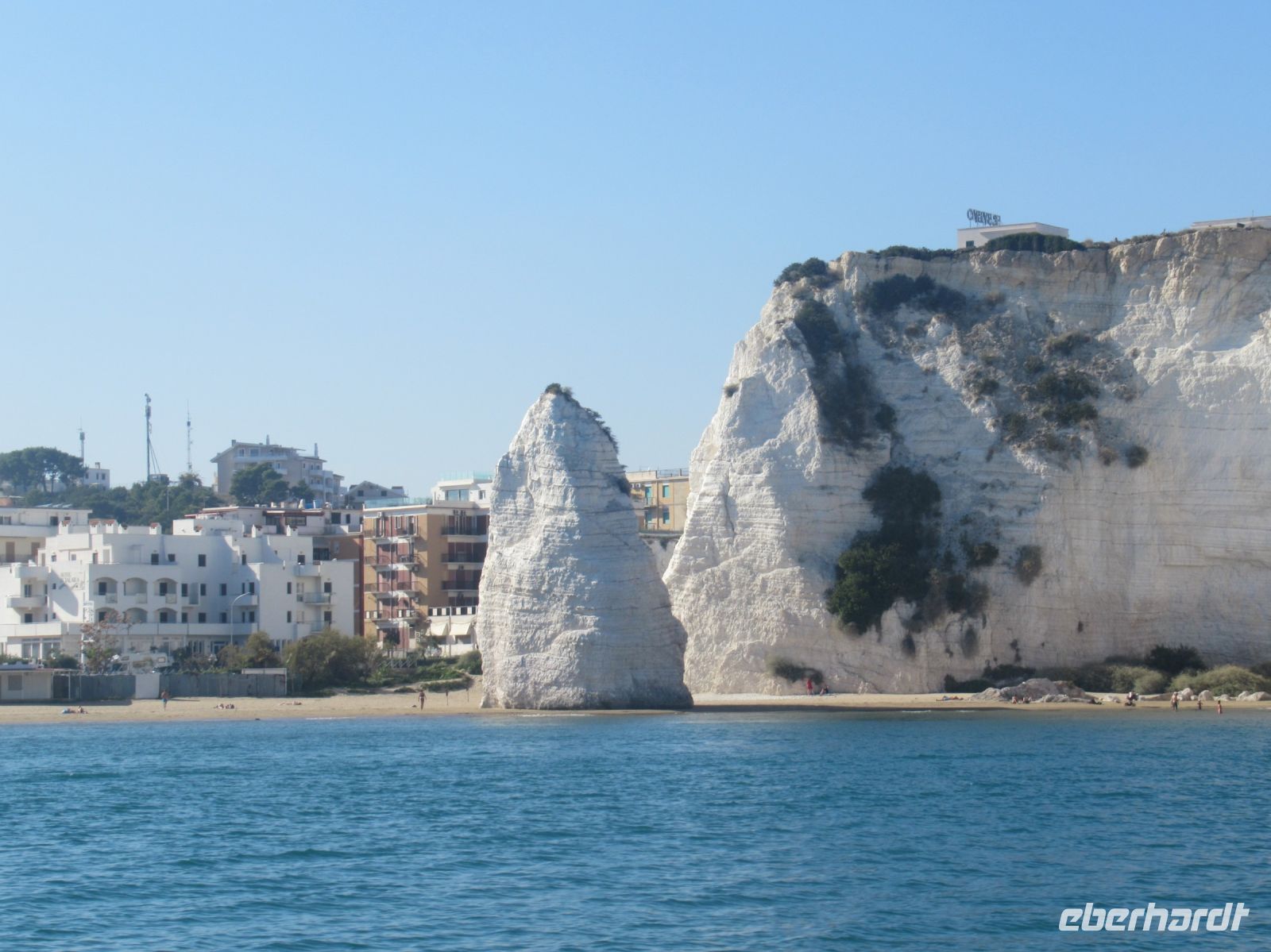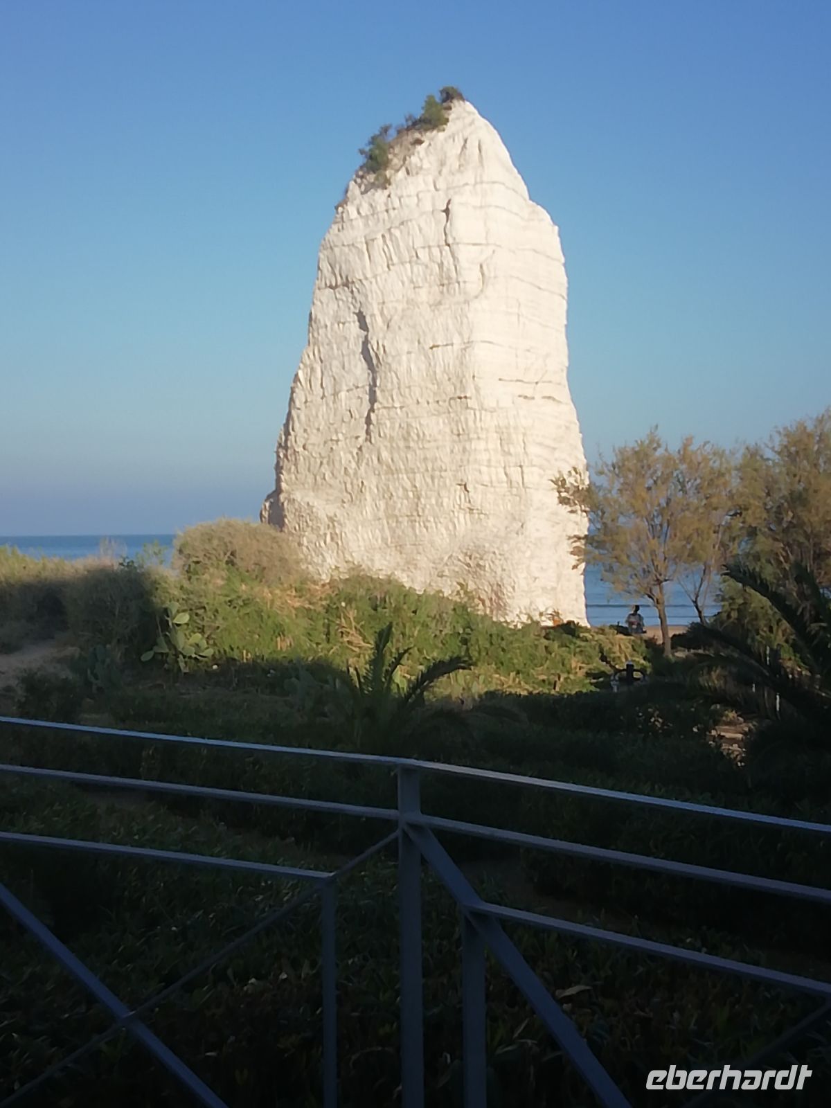 Nach dem Aufenthalt in der Bucht liefen wir einen steileren Weg zurück, bis wir dann wieder den gleichen Pfad vom Hinweg erreichten. Nochmals Fotos von Felsen im Meer, jetzt im etwas anderen Licht. Am Bus wieder angelangt haben wir zum ersten Mal die Wanderschuhe mit Turnschuhen gewechselt und fuhren zurück nach Richtung Vieste. Auf der Rückfahrt machten wir einen kleinen Fotostopp um den „Arco die Felice“ zu bewundern und in unseren Fotoapparaten und Mobiltelefonen zu verewigen, ein zweiter Stopp bot uns einen Blick auf die weiße Stadt Vieste, die wie ein Streifen in das Meer ragte. Wir hatten das schönste Wetter, blauen Himmel und klare Sicht. Es gab die Möglichkeit am Pizzomunno in Vieste auszusteigen und noch mittags den Strand und Städtchen zu erkunden, oder zurück ins Hotel und evtl. noch eine kleine Runde im Meer zu schwimmen oder eine „Siesta“ genießen. Die meisten Gäste fuhren zurück ins Hotel. Ein Gast und ich sind ausgestiegen um den Pizzomunno in der Mittagssonne zu fotografieren.
