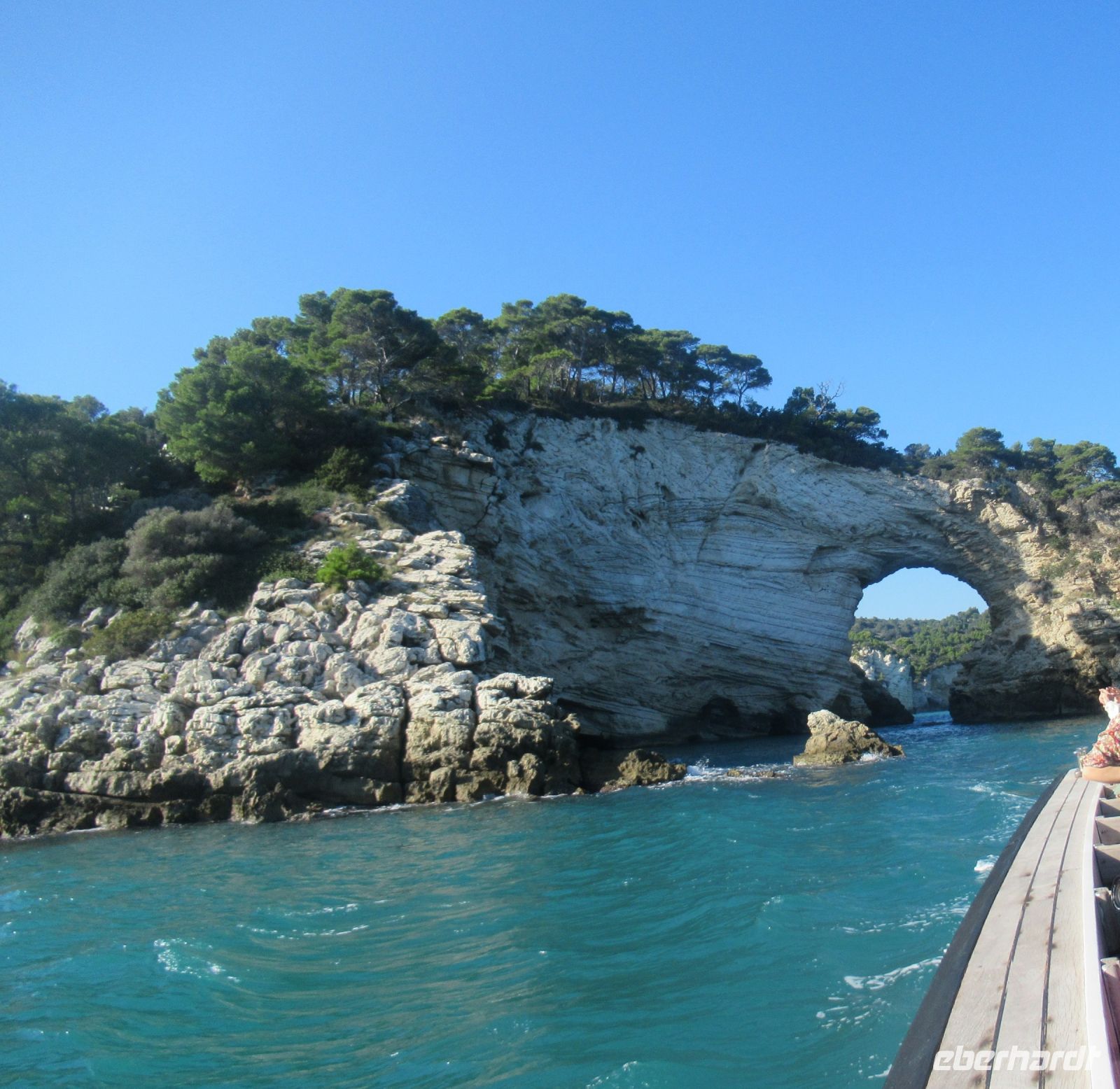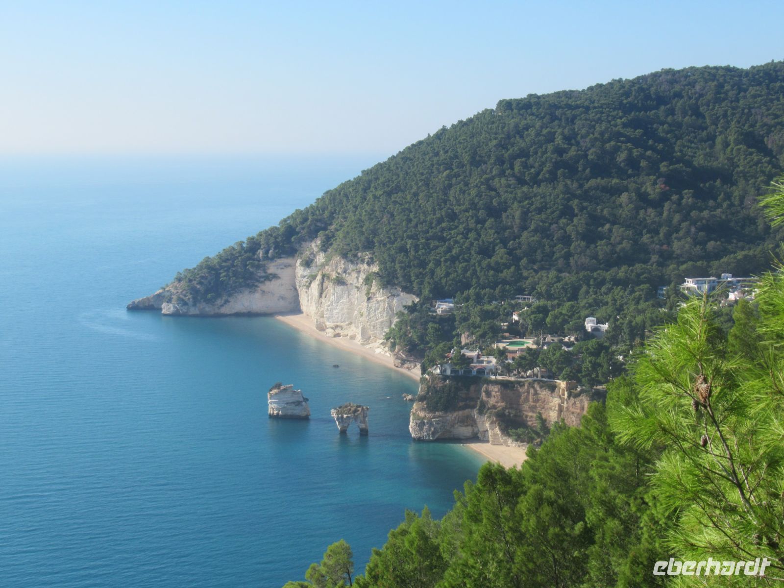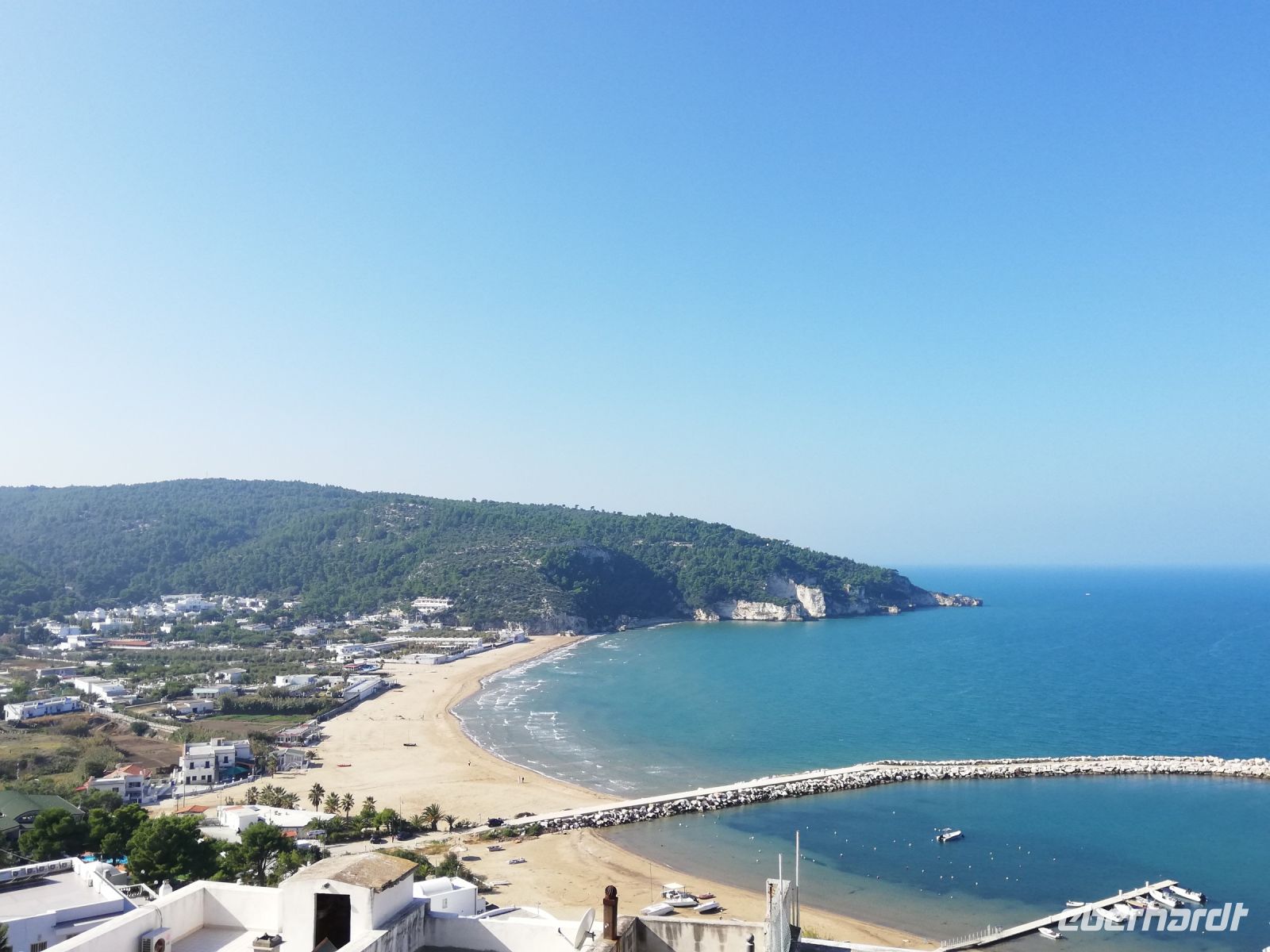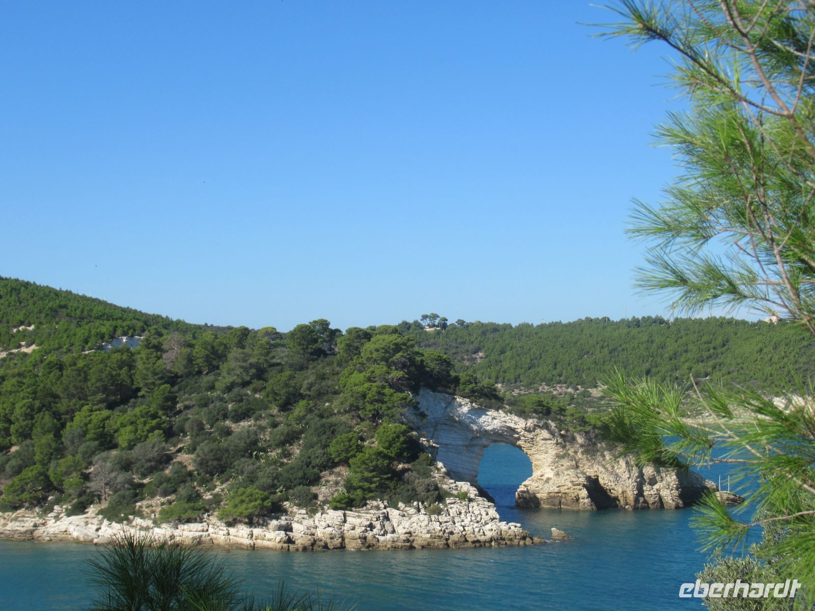 Nach dem Aufenthalt in der Bucht liefen wir einen steileren Weg zurück, bis wir dann wieder den gleichen Pfad vom Hinweg erreichten. Nochmals Fotos von Felsen im Meer, jetzt im etwas anderen Licht. Am Bus wieder angelangt haben wir zum ersten Mal die Wanderschuhe mit Turnschuhen gewechselt und fuhren zurück nach Richtung Vieste. Auf der Rückfahrt machten wir einen kleinen Fotostopp um den „Arco die Felice“ zu bewundern und in unseren Fotoapparaten und Mobiltelefonen zu verewigen, ein zweiter Stopp bot uns einen Blick auf die weiße Stadt Vieste, die wie ein Streifen in das Meer ragte. Wir hatten das schönste Wetter, blauen Himmel und klare Sicht. Es gab die Möglichkeit am Pizzomunno in Vieste auszusteigen und noch mittags den Strand und Städtchen zu erkunden, oder zurück ins Hotel und evtl. noch eine kleine Runde im Meer zu schwimmen oder eine „Siesta“ genießen. Die meisten Gäste fuhren zurück ins Hotel. Ein Gast und ich sind ausgestiegen um den Pizzomunno in der Mittagssonne zu fotografieren.