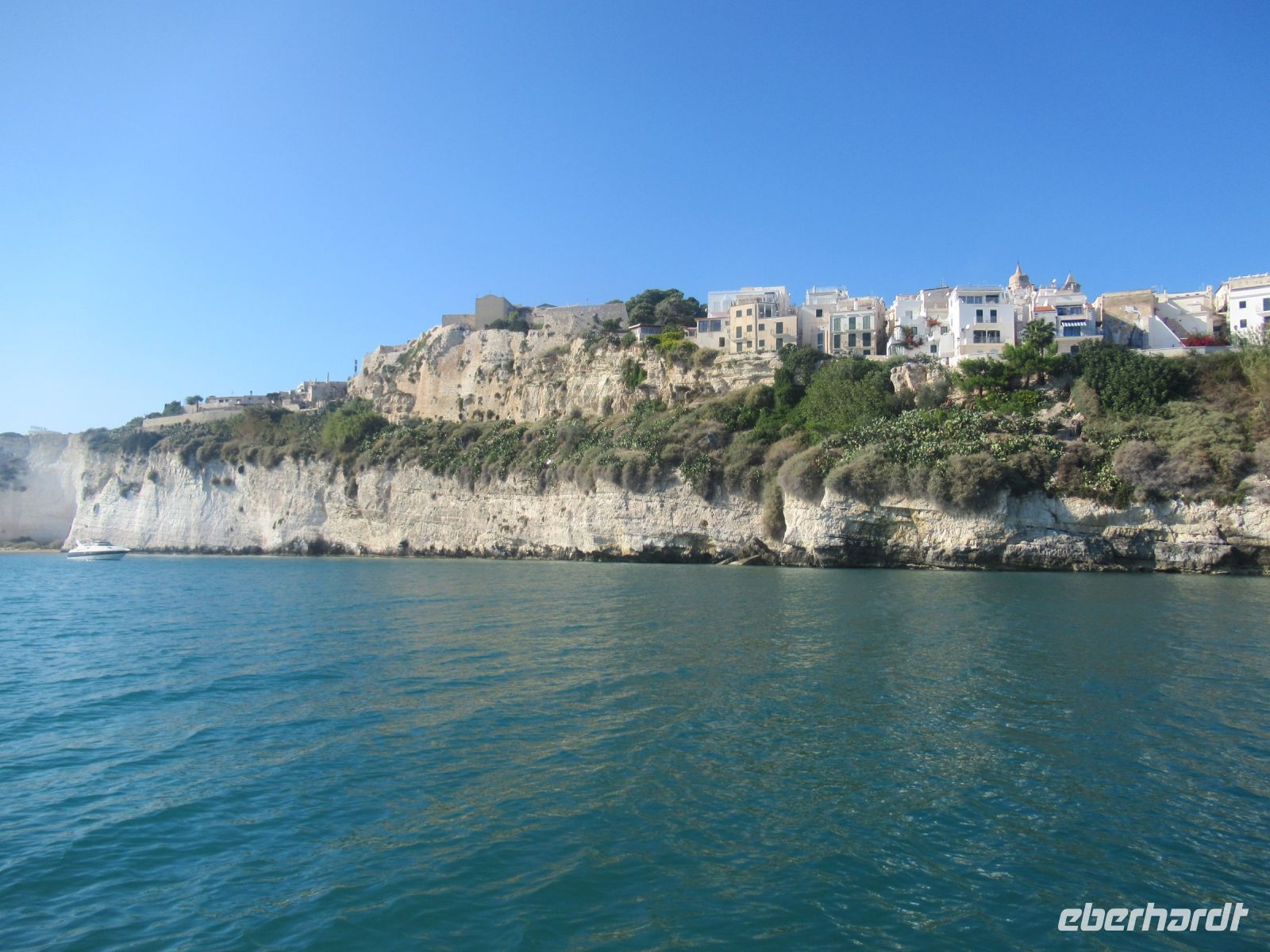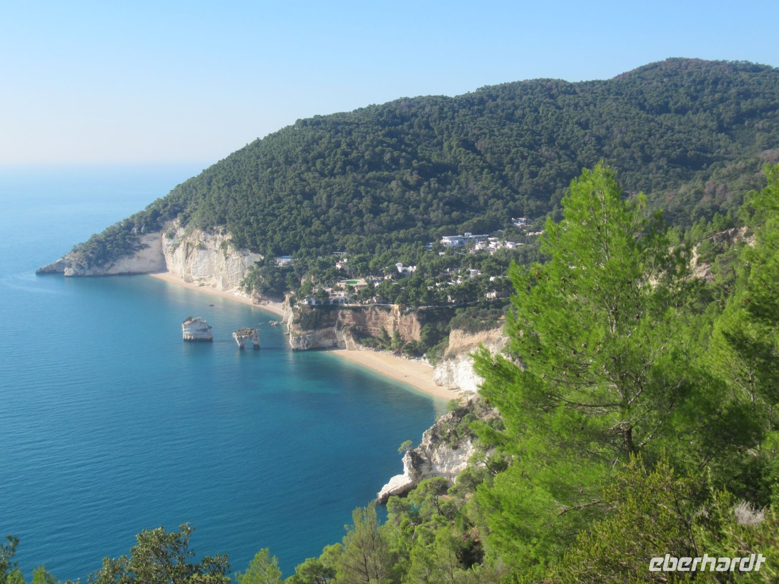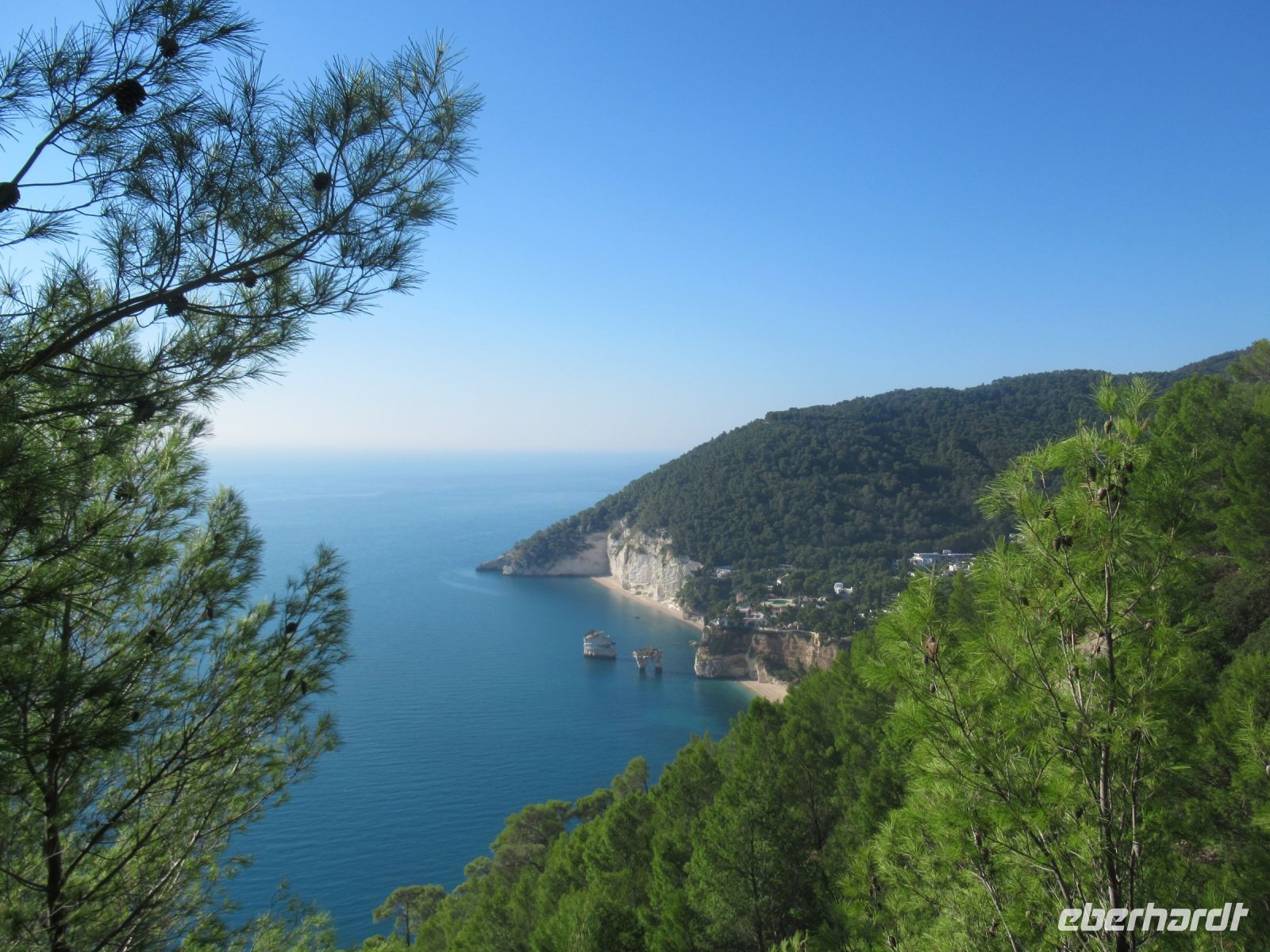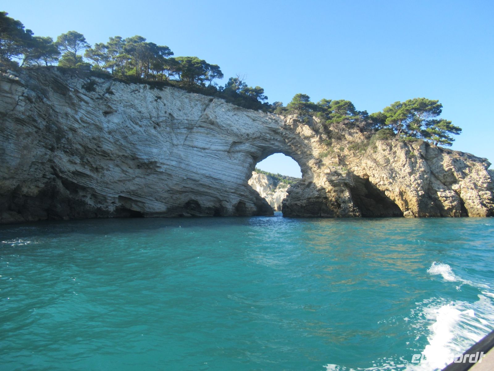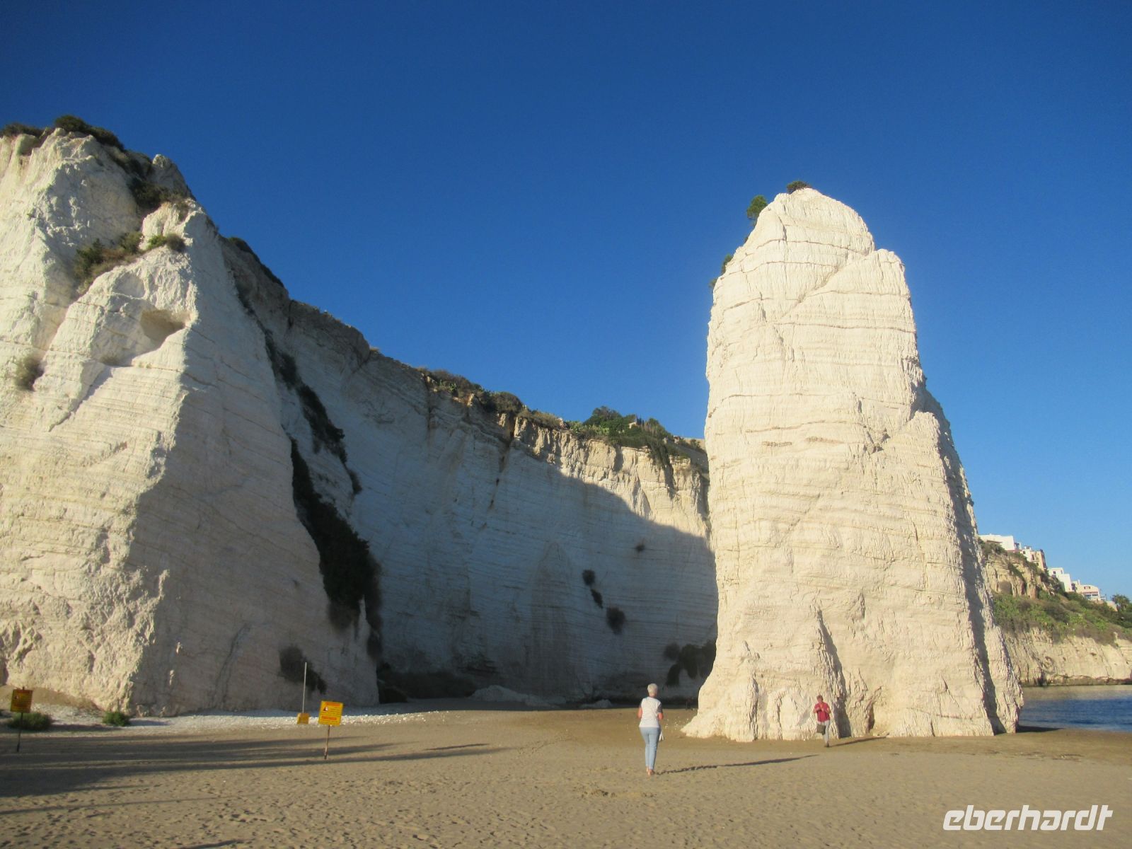 Nach dem Aufenthalt in der Bucht liefen wir einen steileren Weg zurück, bis wir dann wieder den gleichen Pfad vom Hinweg erreichten. Nochmals Fotos von Felsen im Meer, jetzt im etwas anderen Licht. Am Bus wieder angelangt haben wir zum ersten Mal die Wanderschuhe mit Turnschuhen gewechselt und fuhren zurück nach Richtung Vieste. Auf der Rückfahrt machten wir einen kleinen Fotostopp um den „Arco die Felice“ zu bewundern und in unseren Fotoapparaten und Mobiltelefonen zu verewigen, ein zweiter Stopp bot uns einen Blick auf die weiße Stadt Vieste, die wie ein Streifen in das Meer ragte. Wir hatten das schönste Wetter, blauen Himmel und klare Sicht. Es gab die Möglichkeit am Pizzomunno in Vieste auszusteigen und noch mittags den Strand und Städtchen zu erkunden, oder zurück ins Hotel und evtl. noch eine kleine Runde im Meer zu schwimmen oder eine „Siesta“ genießen. Die meisten Gäste fuhren zurück ins Hotel. Ein Gast und ich sind ausgestiegen um den Pizzomunno in der Mittagssonne zu fotografieren.