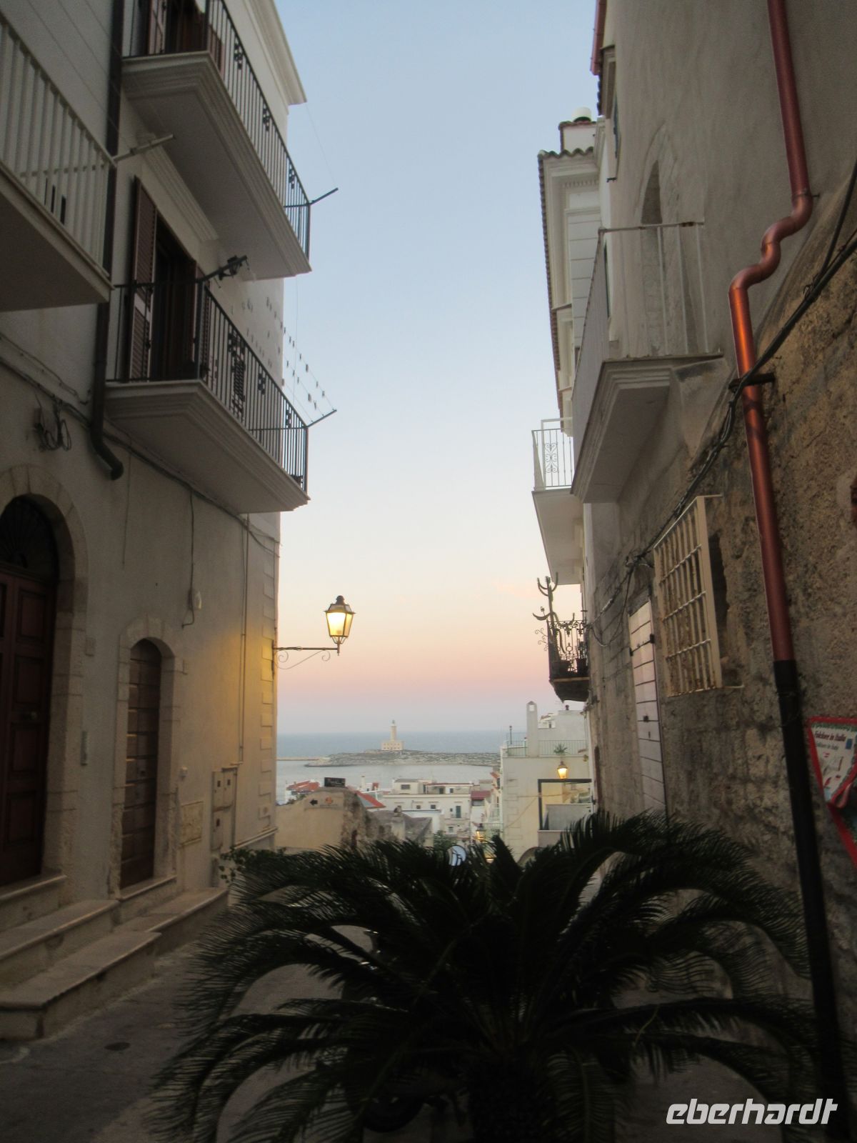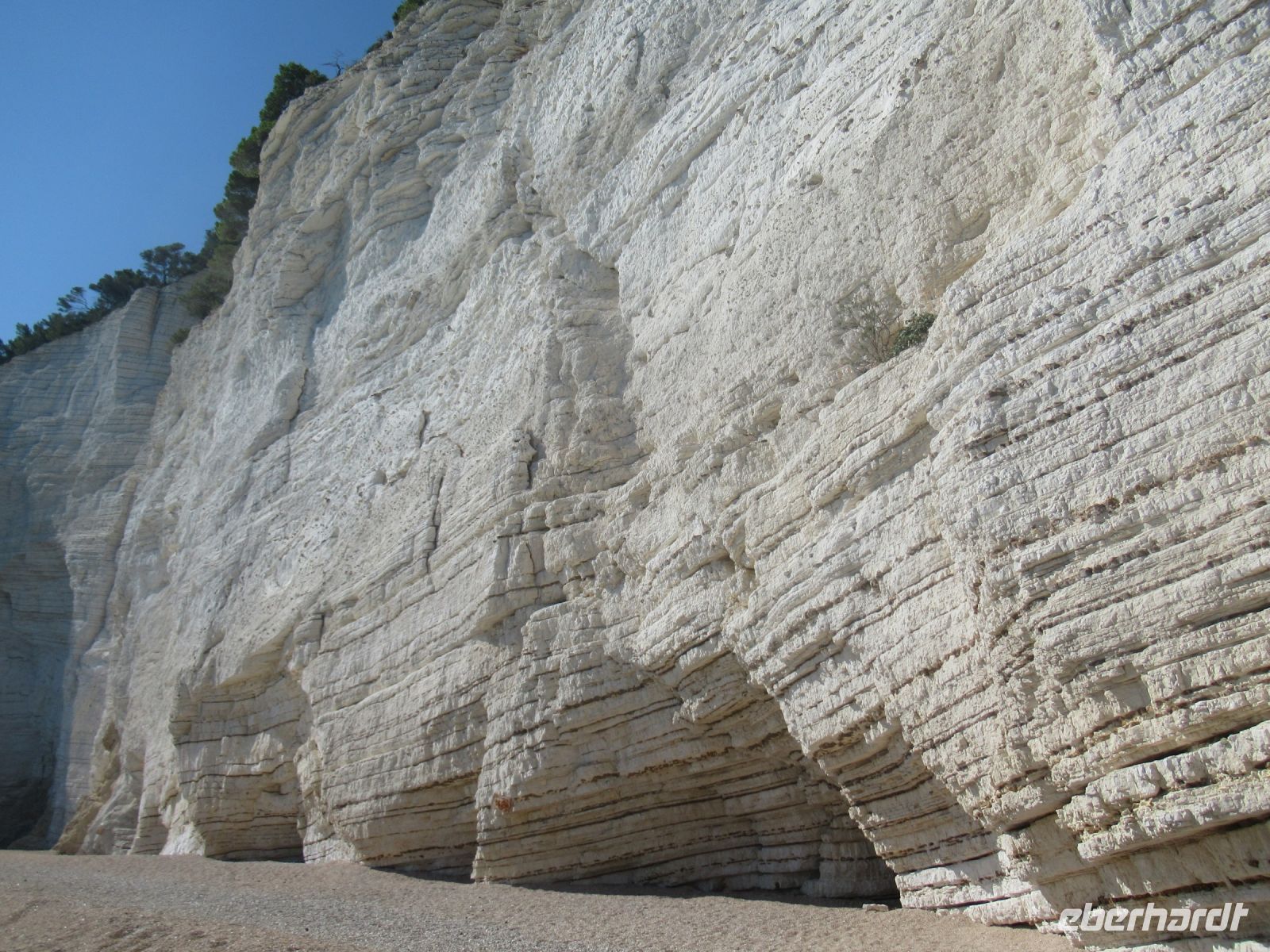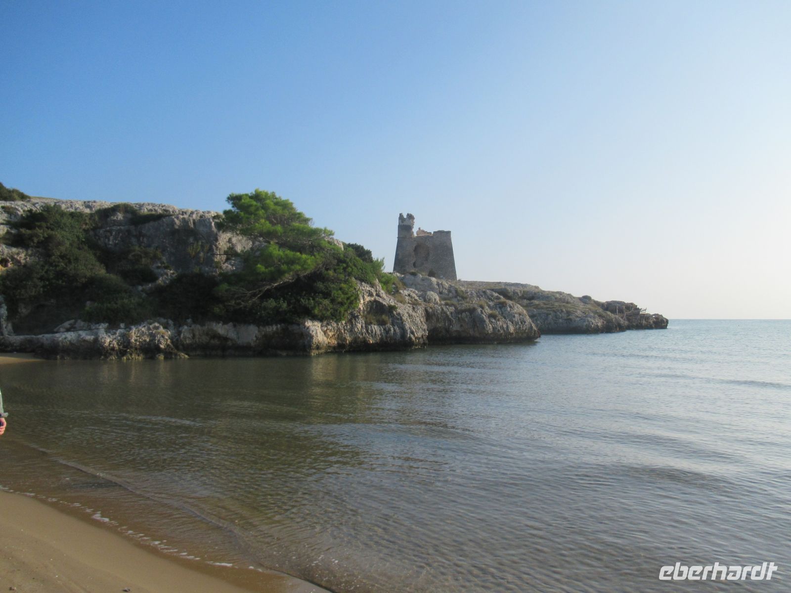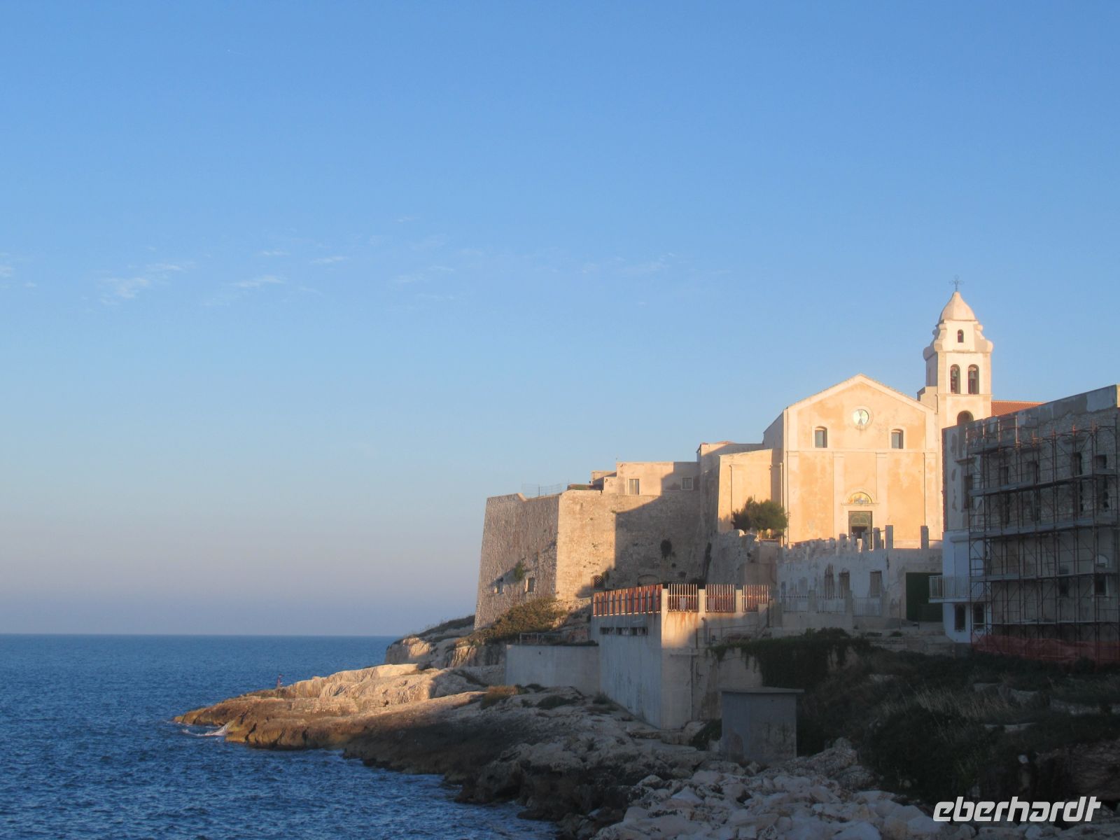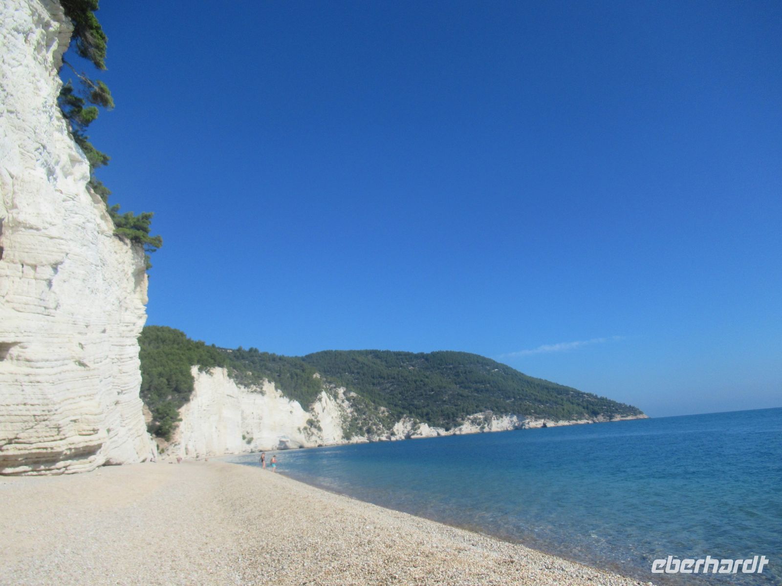 Nach dem Aufenthalt in der Bucht liefen wir einen steileren Weg zurück, bis wir dann wieder den gleichen Pfad vom Hinweg erreichten. Nochmals Fotos von Felsen im Meer, jetzt im etwas anderen Licht. Am Bus wieder angelangt haben wir zum ersten Mal die Wanderschuhe mit Turnschuhen gewechselt und fuhren zurück nach Richtung Vieste. Auf der Rückfahrt machten wir einen kleinen Fotostopp um den „Arco die Felice“ zu bewundern und in unseren Fotoapparaten und Mobiltelefonen zu verewigen, ein zweiter Stopp bot uns einen Blick auf die weiße Stadt Vieste, die wie ein Streifen in das Meer ragte. Wir hatten das schönste Wetter, blauen Himmel und klare Sicht. Es gab die Möglichkeit am Pizzomunno in Vieste auszusteigen und noch mittags den Strand und Städtchen zu erkunden, oder zurück ins Hotel und evtl. noch eine kleine Runde im Meer zu schwimmen oder eine „Siesta“ genießen. Die meisten Gäste fuhren zurück ins Hotel. Ein Gast und ich sind ausgestiegen um den Pizzomunno in der Mittagssonne zu fotografieren.