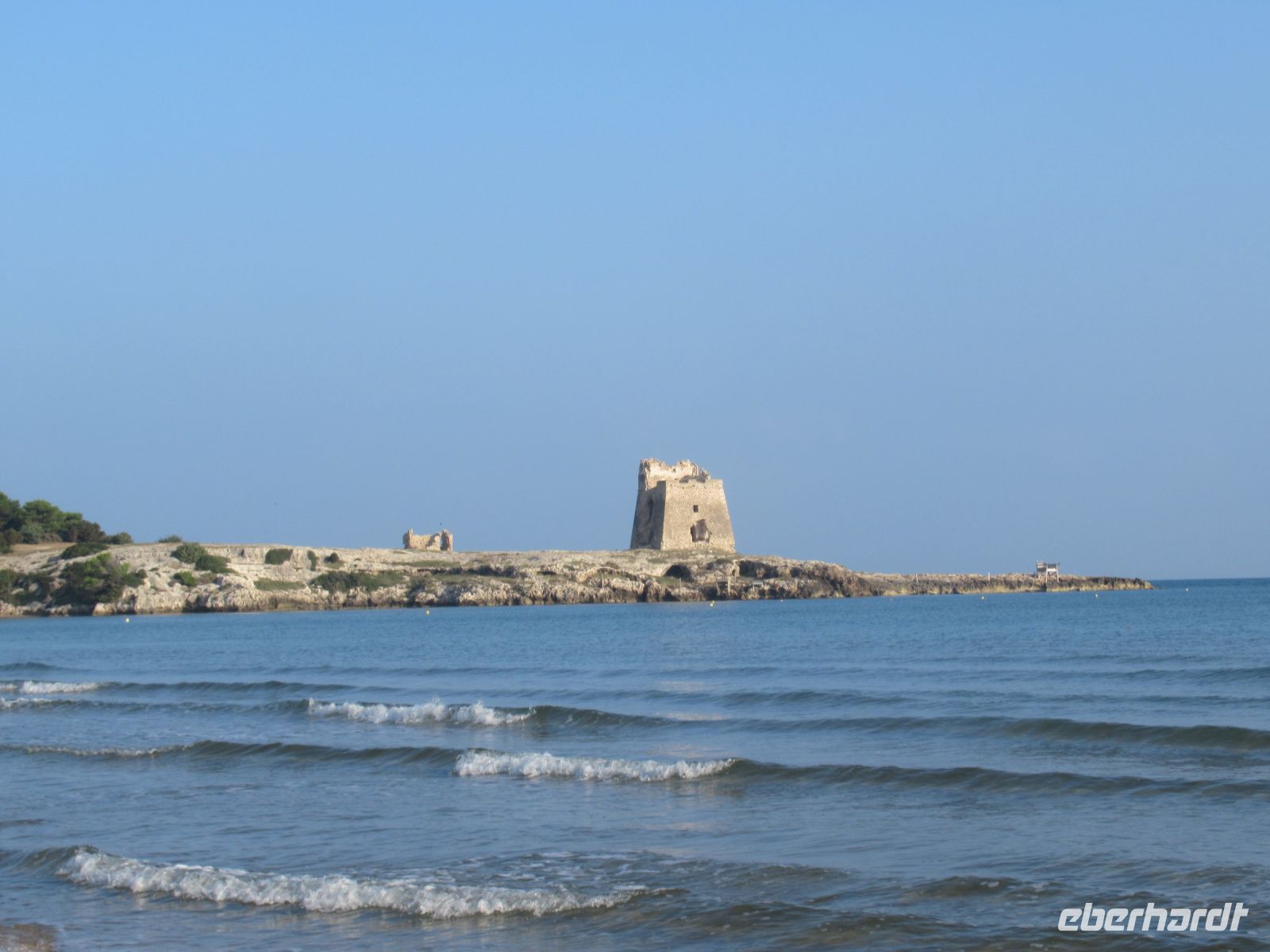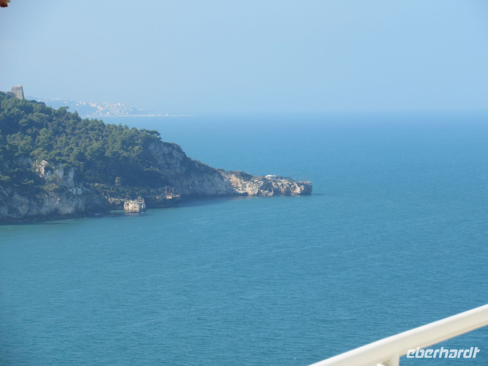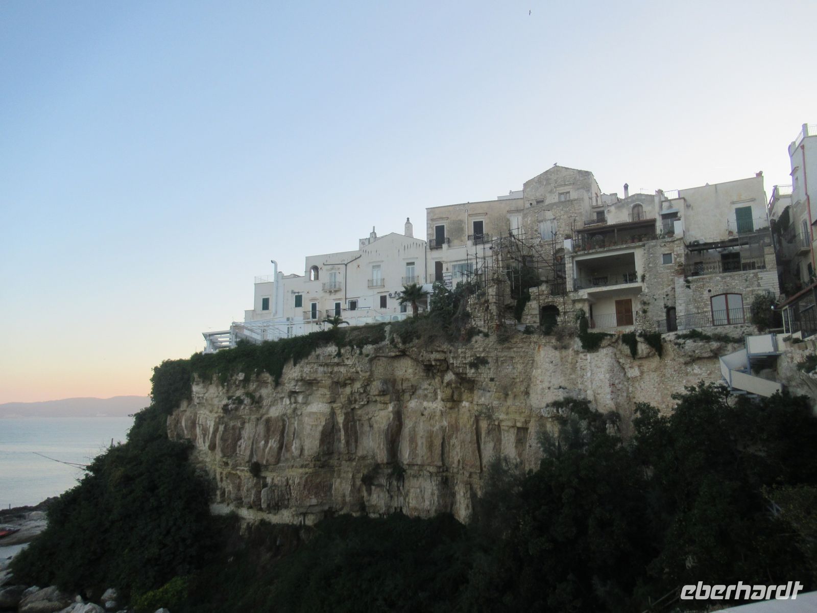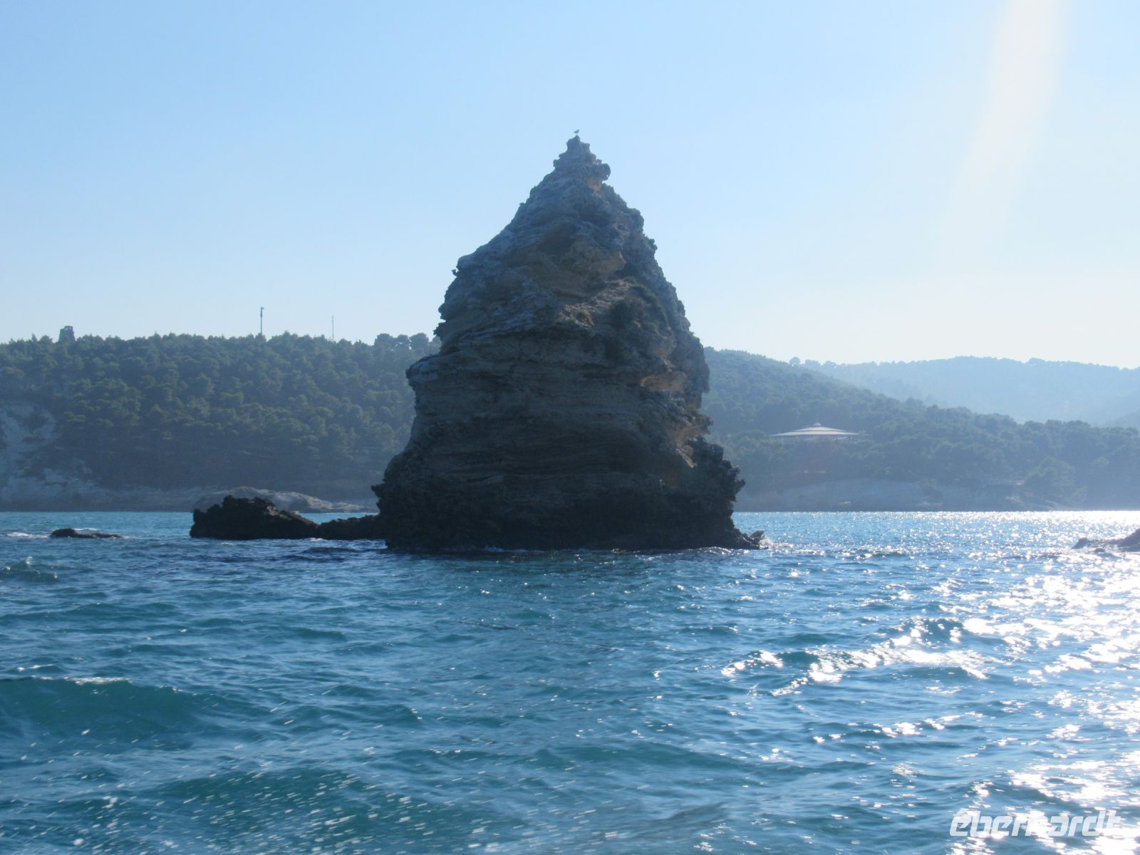Nach dem Aufenthalt in der Bucht liefen wir einen steileren Weg zurück, bis wir dann wieder den gleichen Pfad vom Hinweg erreichten. Nochmals Fotos von Felsen im Meer, jetzt im etwas anderen Licht. Am Bus wieder angelangt haben wir zum ersten Mal die Wanderschuhe mit Turnschuhen gewechselt und fuhren zurück nach Richtung Vieste. Auf der Rückfahrt machten wir einen kleinen Fotostopp um den „Arco die Felice“ zu bewundern und in unseren Fotoapparaten und Mobiltelefonen zu verewigen, ein zweiter Stopp bot uns einen Blick auf die weiße Stadt Vieste, die wie ein Streifen in das Meer ragte. Wir hatten das schönste Wetter, blauen Himmel und klare Sicht. Es gab die Möglichkeit am Pizzomunno in Vieste auszusteigen und noch mittags den Strand und Städtchen zu erkunden, oder zurück ins Hotel und evtl. noch eine kleine Runde im Meer zu schwimmen oder eine „Siesta“ genießen. Die meisten Gäste fuhren zurück ins Hotel. Ein Gast und ich sind ausgestiegen um den Pizzomunno in der Mittagssonne zu fotografieren.
