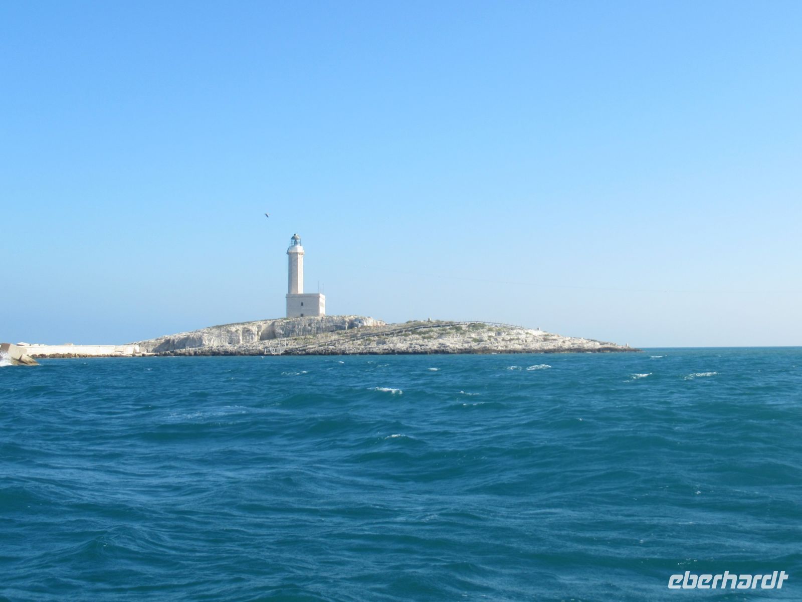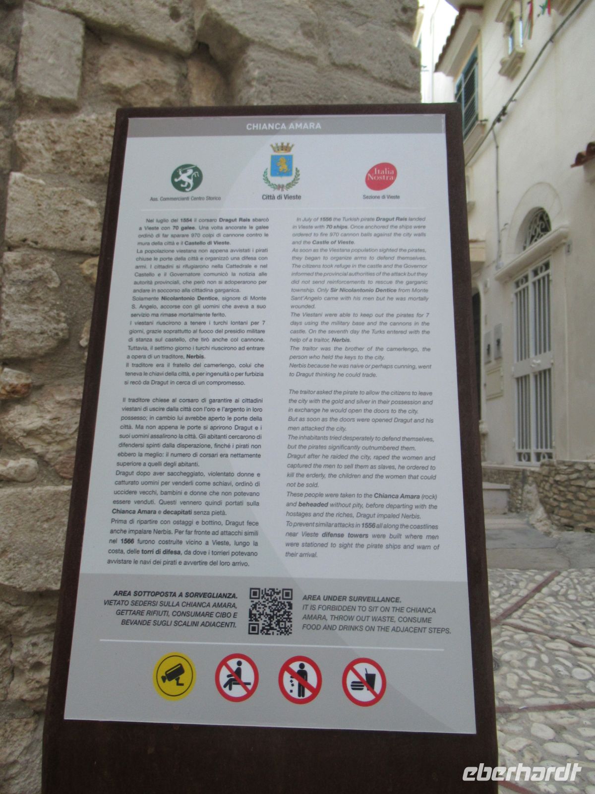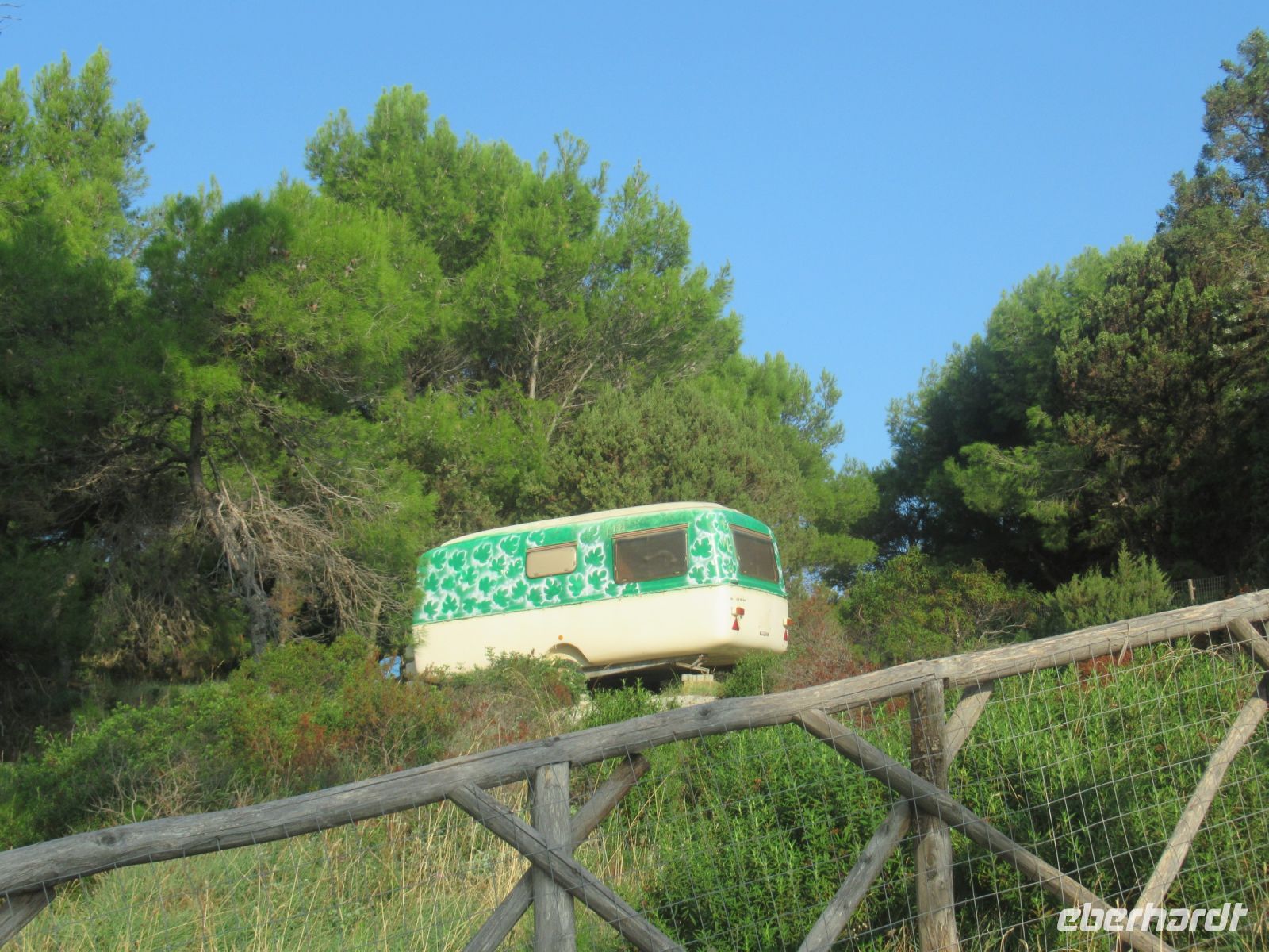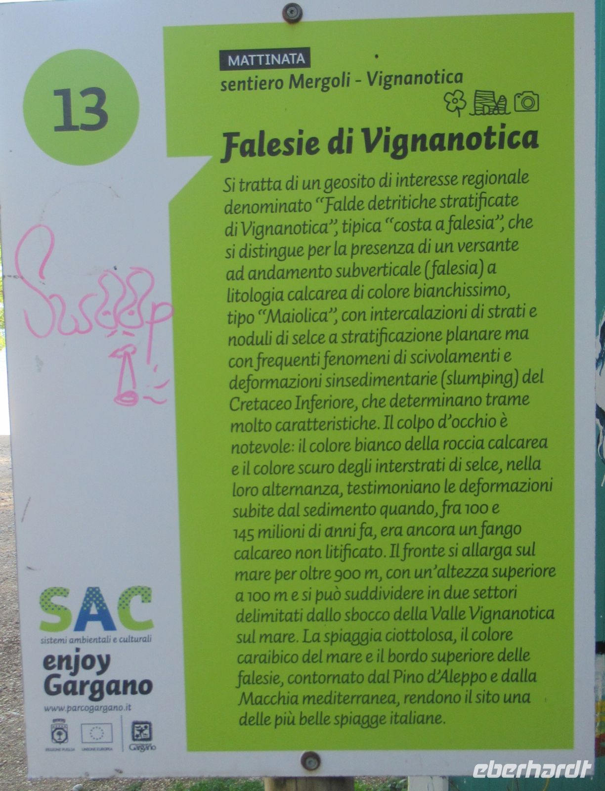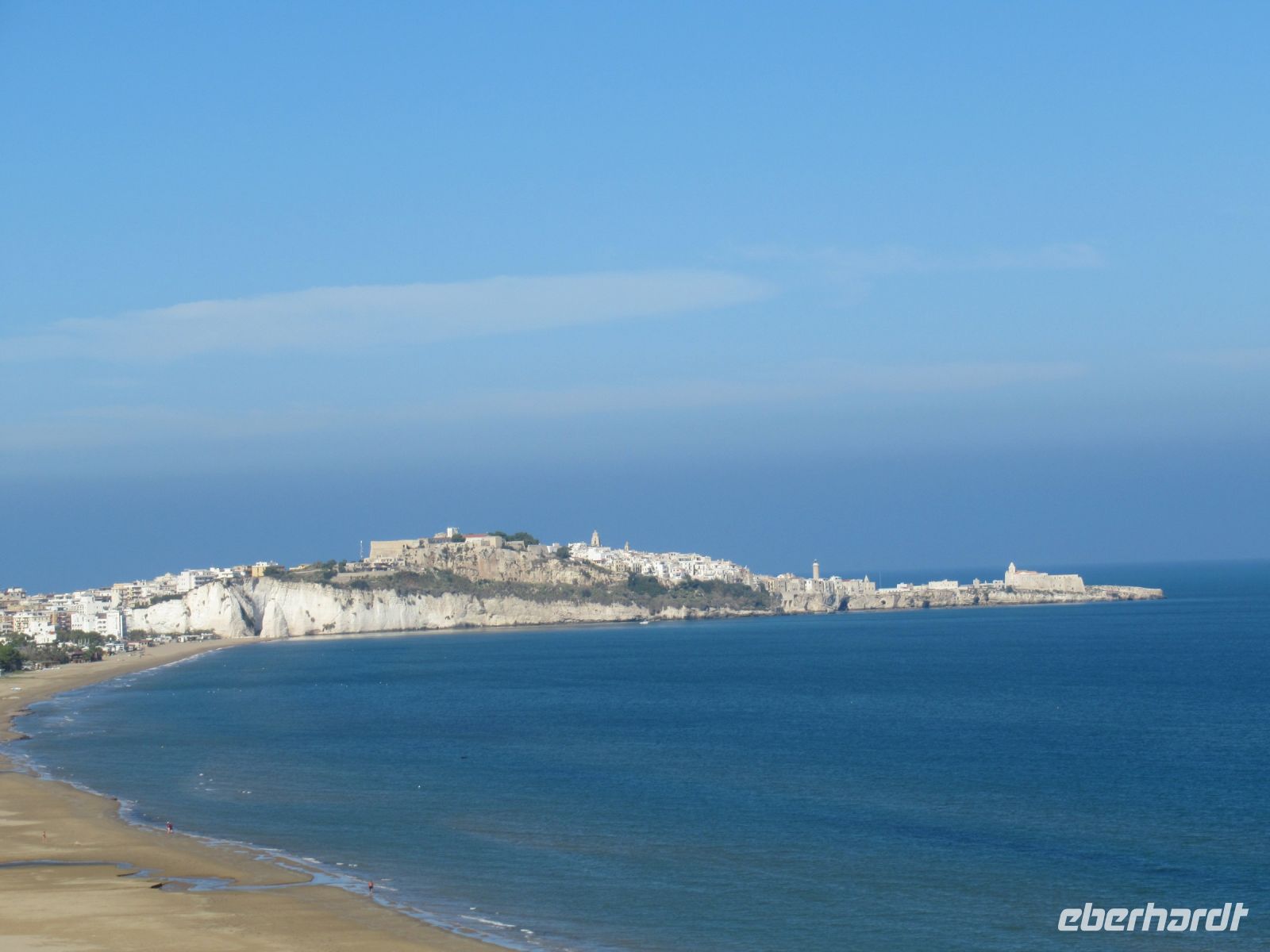 Nach dem Aufenthalt in der Bucht liefen wir einen steileren Weg zurück, bis wir dann wieder den gleichen Pfad vom Hinweg erreichten. Nochmals Fotos von Felsen im Meer, jetzt im etwas anderen Licht. Am Bus wieder angelangt haben wir zum ersten Mal die Wanderschuhe mit Turnschuhen gewechselt und fuhren zurück nach Richtung Vieste. Auf der Rückfahrt machten wir einen kleinen Fotostopp um den „Arco die Felice“ zu bewundern und in unseren Fotoapparaten und Mobiltelefonen zu verewigen, ein zweiter Stopp bot uns einen Blick auf die weiße Stadt Vieste, die wie ein Streifen in das Meer ragte. Wir hatten das schönste Wetter, blauen Himmel und klare Sicht. Es gab die Möglichkeit am Pizzomunno in Vieste auszusteigen und noch mittags den Strand und Städtchen zu erkunden, oder zurück ins Hotel und evtl. noch eine kleine Runde im Meer zu schwimmen oder eine „Siesta“ genießen. Die meisten Gäste fuhren zurück ins Hotel. Ein Gast und ich sind ausgestiegen um den Pizzomunno in der Mittagssonne zu fotografieren.
