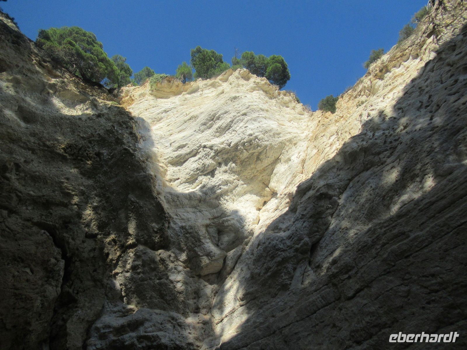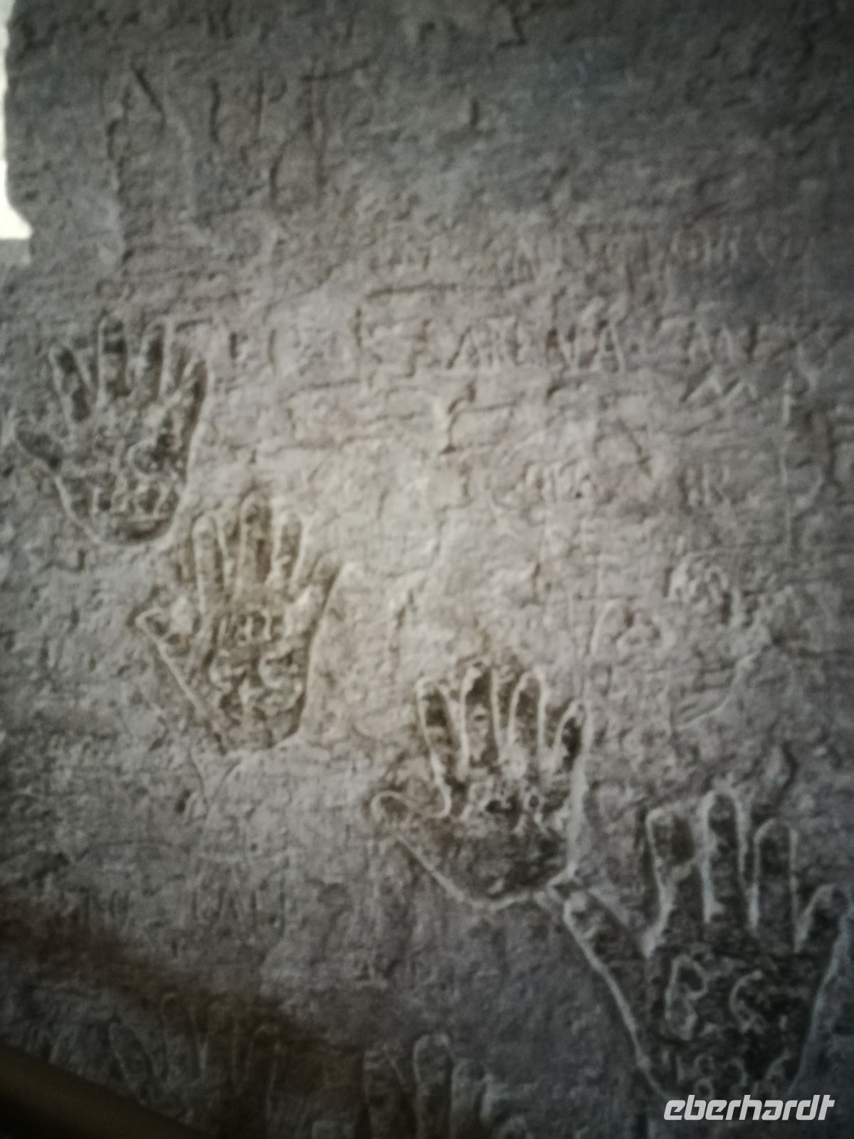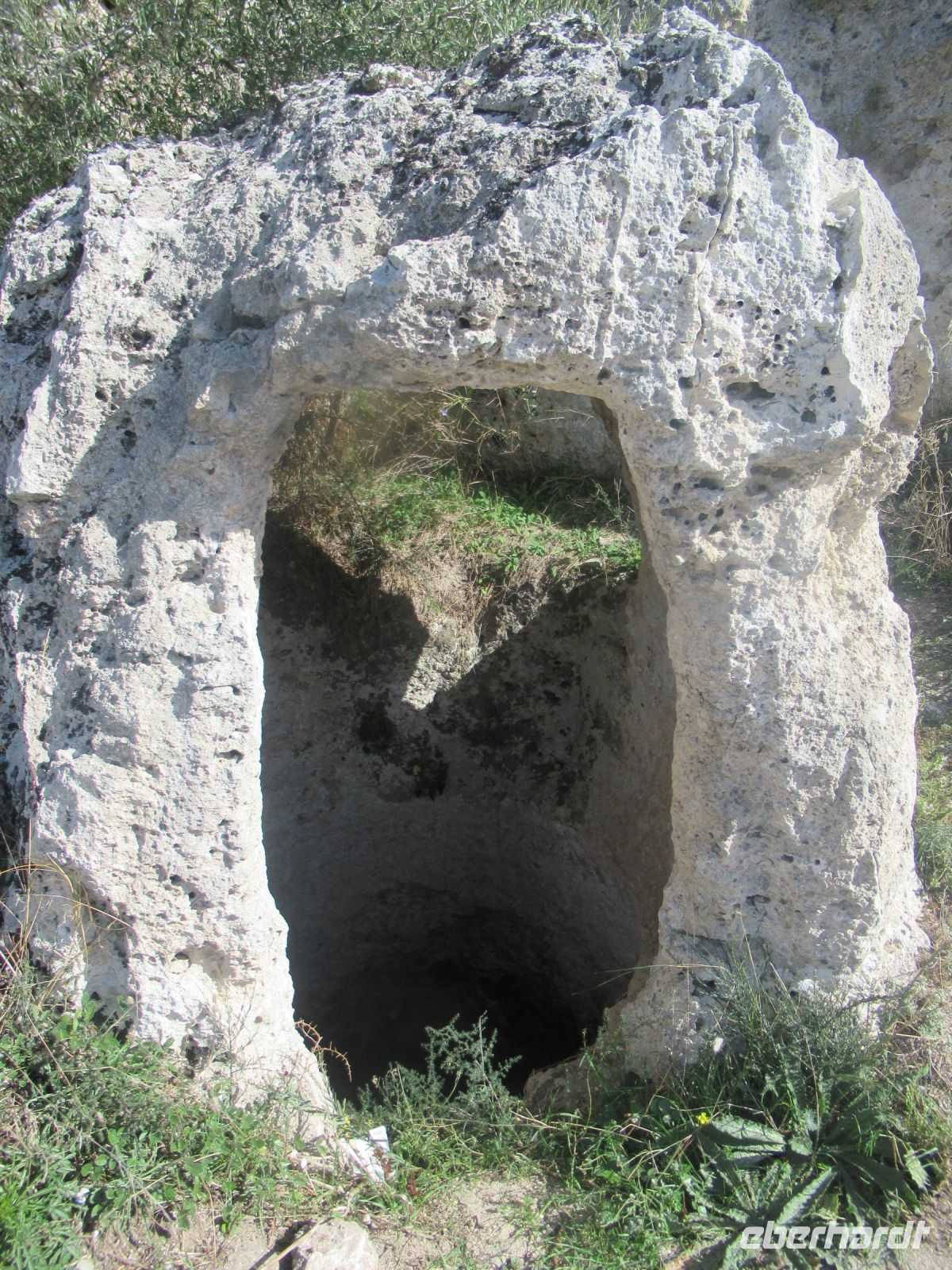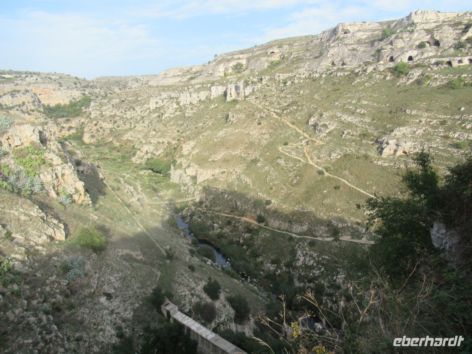 Heute wandern wir zu der Gravina Schlucht, von der wir eine wunderschöne Sicht auf die Stadt Matera haben. Das Wetter beschert uns auch den letzten Tag Sonne pur, blauen Himmel und einen angenehmen Wind. Wir laufen einen schmalen, steinigen Weg mit hohen Gräsern im Gänsemarsch hinauf. Entlang eröffneten sich Felsen mit kleinen Grotten und diverse Felsenformationen säumten unseren Weg. An einer Stelle können wir in eine Höhlenkapelle reinschauen. Stein für Stein kommen wir nach oben auf das felsige Plateau und bald eröffneten sich die Aussichten – nach unten in die Gravina Schlucht und vor uns die riesige Stadt Matera, die von den Farben wie aus Stein aussah. Hier machen wir eine Pause. Jeder hat sich zur Stärkung was mitgenommen und ich habe noch ein paar Datteln, Tomaten und Grissini verteilt. Unten sehen wir die Hängebrücke über die Schlucht, die diesen Felsenhang mit der Stadt Matera verbindet. Einmal runter – Brücke - und dann wieder hoch. Dennoch, keiner von der Gruppe wollte die etwas anspruchsvollere Route gehen. Nach der Pause und vielen Fotos laufen wir wieder einen anderen Weg runter. Hier eröffnete sich ein recht grünes Tal mit Fluss. Vorbei an einer Höhlenkapelle mit Resten von Fresken, die wohl mit spezieller Technik von den Wänden geraubt worden sind. Kleine gelbe Blümchen zierten den Weg und tausende kleine Schnecken haben sich an die Pflanzen angeklebt – sieht im ersten Blick wie weiße Blumen aus. Wir laufen den Weg hinunter und kommen zu unserem Bus an die gleiche Stelle.