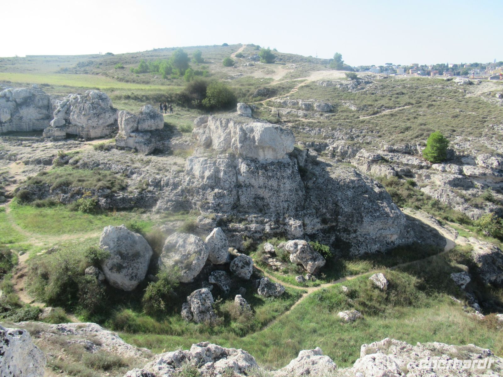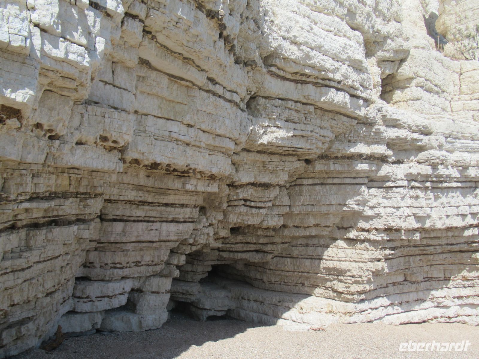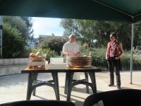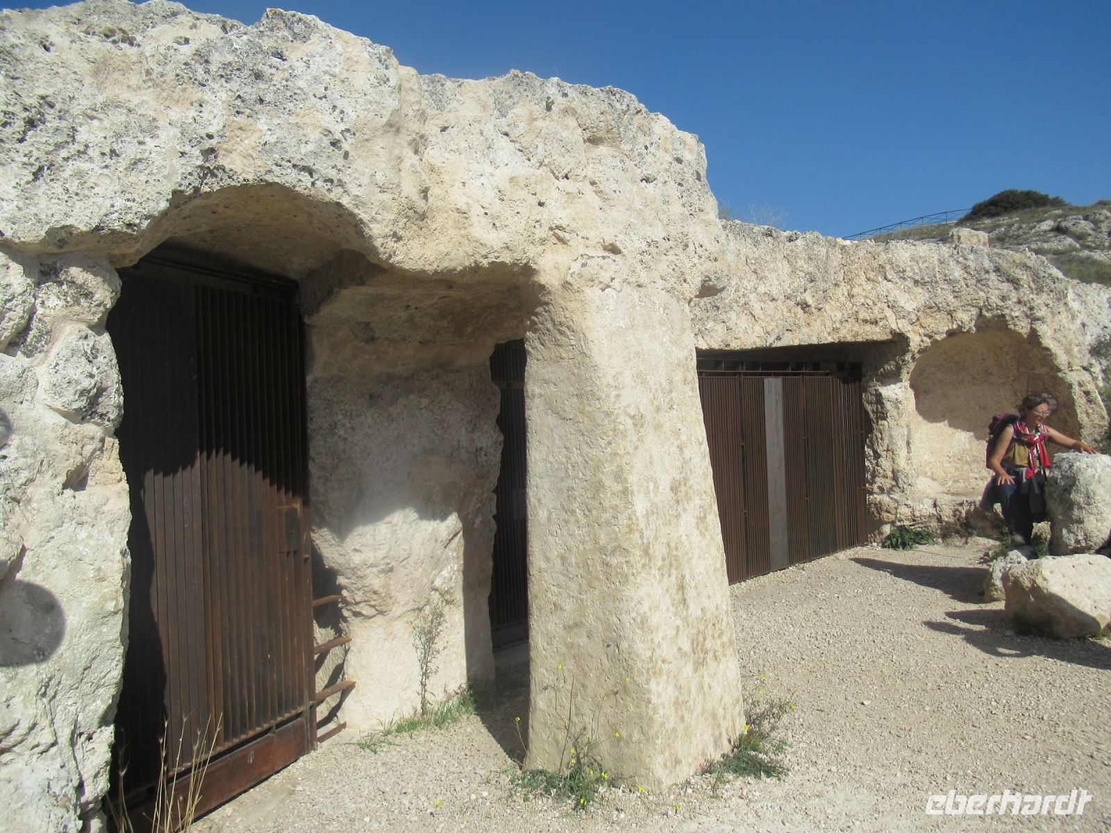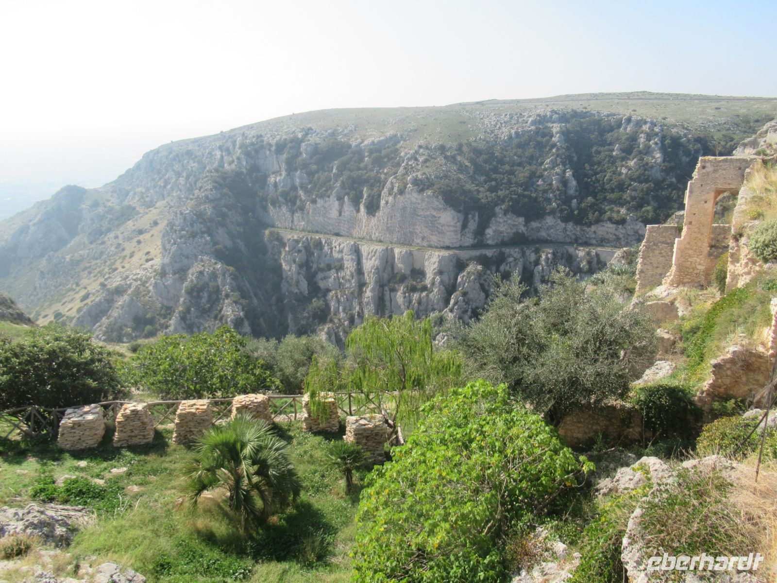 Heute wandern wir zu der Gravina Schlucht, von der wir eine wunderschöne Sicht auf die Stadt Matera haben. Das Wetter beschert uns auch den letzten Tag Sonne pur, blauen Himmel und einen angenehmen Wind. Wir laufen einen schmalen, steinigen Weg mit hohen Gräsern im Gänsemarsch hinauf. Entlang eröffneten sich Felsen mit kleinen Grotten und diverse Felsenformationen säumten unseren Weg. An einer Stelle können wir in eine Höhlenkapelle reinschauen. Stein für Stein kommen wir nach oben auf das felsige Plateau und bald eröffneten sich die Aussichten – nach unten in die Gravina Schlucht und vor uns die riesige Stadt Matera, die von den Farben wie aus Stein aussah. Hier machen wir eine Pause. Jeder hat sich zur Stärkung was mitgenommen und ich habe noch ein paar Datteln, Tomaten und Grissini verteilt. Unten sehen wir die Hängebrücke über die Schlucht, die diesen Felsenhang mit der Stadt Matera verbindet. Einmal runter – Brücke - und dann wieder hoch. Dennoch, keiner von der Gruppe wollte die etwas anspruchsvollere Route gehen. Nach der Pause und vielen Fotos laufen wir wieder einen anderen Weg runter. Hier eröffnete sich ein recht grünes Tal mit Fluss. Vorbei an einer Höhlenkapelle mit Resten von Fresken, die wohl mit spezieller Technik von den Wänden geraubt worden sind. Kleine gelbe Blümchen zierten den Weg und tausende kleine Schnecken haben sich an die Pflanzen angeklebt – sieht im ersten Blick wie weiße Blumen aus. Wir laufen den Weg hinunter und kommen zu unserem Bus an die gleiche Stelle.