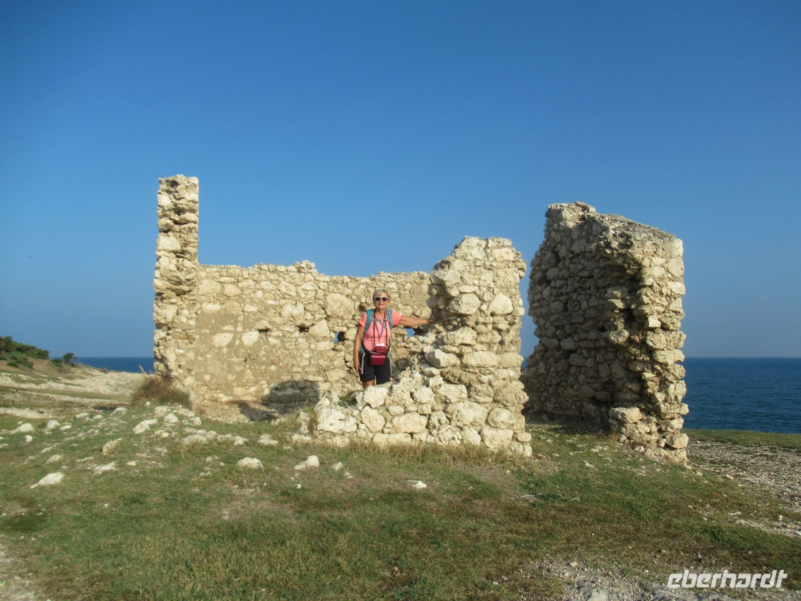 Dadurch, dass es uns doch noch gelungen ist kurzfristig eine Bootsfahrt zu buchen, haben wir die Programmtage gewechselt und so ging es am Dienstag Richtung Nordküste. Die breiten Sandstrände sind alle umsäumt von Ferienhäuser-Anlagen und Campingplätzen und haben von der Straße nur kleine Durchgänge zum Meer. Wir starteten mit Spaziergang am Strand und liefen kurz über die Felsenanhöhe zu einem Wachturm - Torre des Finale. Hier hat uns Katrin über die Historie der Wachtürme erzählt und die „Meldesysteme, die für diese Zeit sehr schnelle Warnungen an die zentrale Stelle in Neapel meldeten. Viele Wachtürme sind entlang der ganzen Küste, einige sind nur teils erhalten und einige werden in Restaurants oder für andere touristische Zwecke umgebaut. Die Sommersaison ist zu Ende und die leeren Strände exklusiv für uns.
