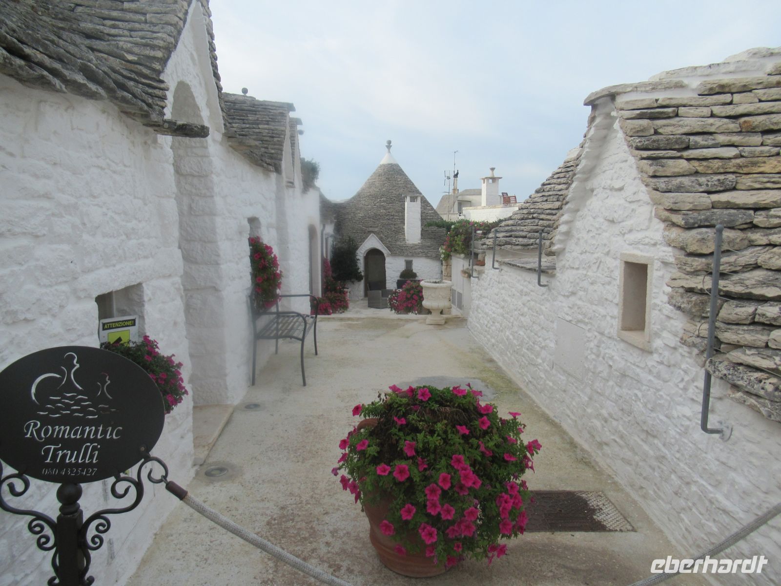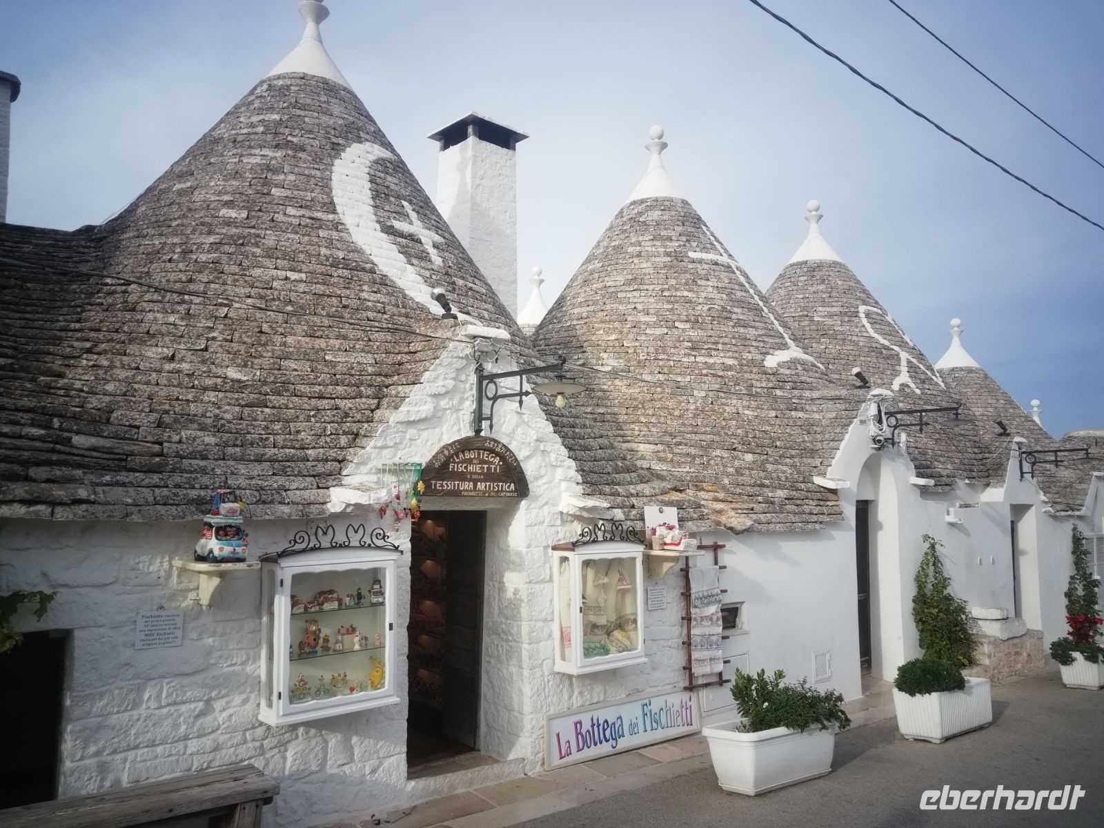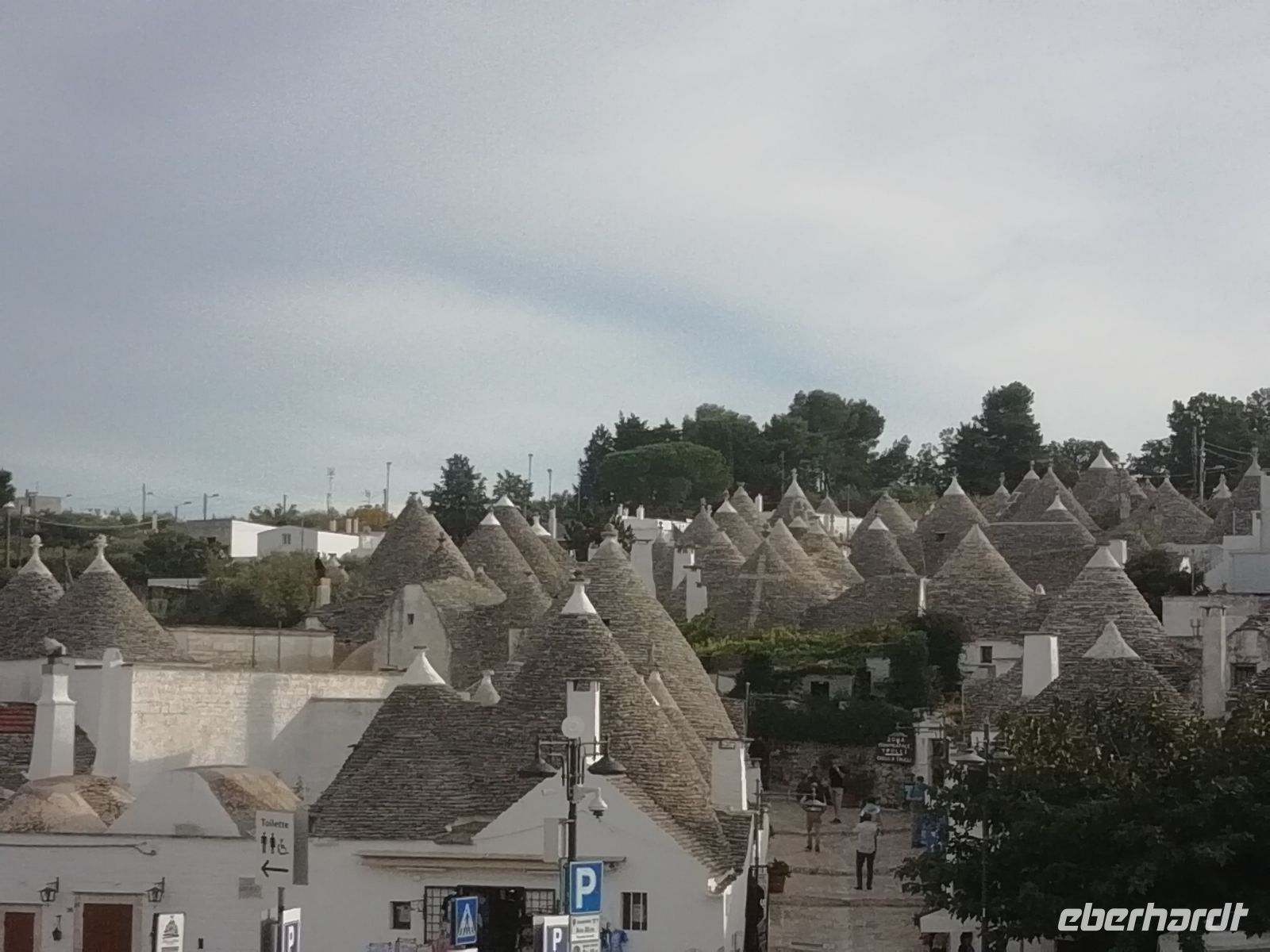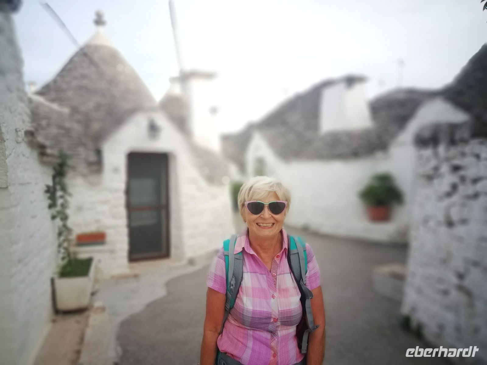 Alberobello – mit den bekannten Trulli-Häusern, seit 1996 von der UNESCO zum Weltkulturerbe erklärt. Hier erwartet uns ein pittoreskes Städtchen mit etwa 1.000 Trulli Häusern. Angeblich wurden die Trulli Häuser im 17. Jh., um Grundsteuer zu sparen, ohne Mörtel gebaut und als „Steinhaufen“ deklariert. Wir spazieren durch die Trulli-Straßen, können sogar ein Haus mit sehr freundlichen Frau von Innen sehen. Ein sehr gemütliches Häuschen mit Esstisch, Bett, Küchen-und Toilettenecke und eine Leiter in die „2te-Etage“ unters Trulli-Dach. Wir spazieren weiter bis zu der Wallfahrtskirche Sant'Antonio di Padova – eine in Trulli Bauweise errichtete Kirche. Anschließend erkundet jeder für sich dieses Trulli-Städtchen mit einem ganz besonderem Flair. Heute sind in den Trulli Häusern kleine Lädchen, Pensionen oder Restaurants eingerichtet.
