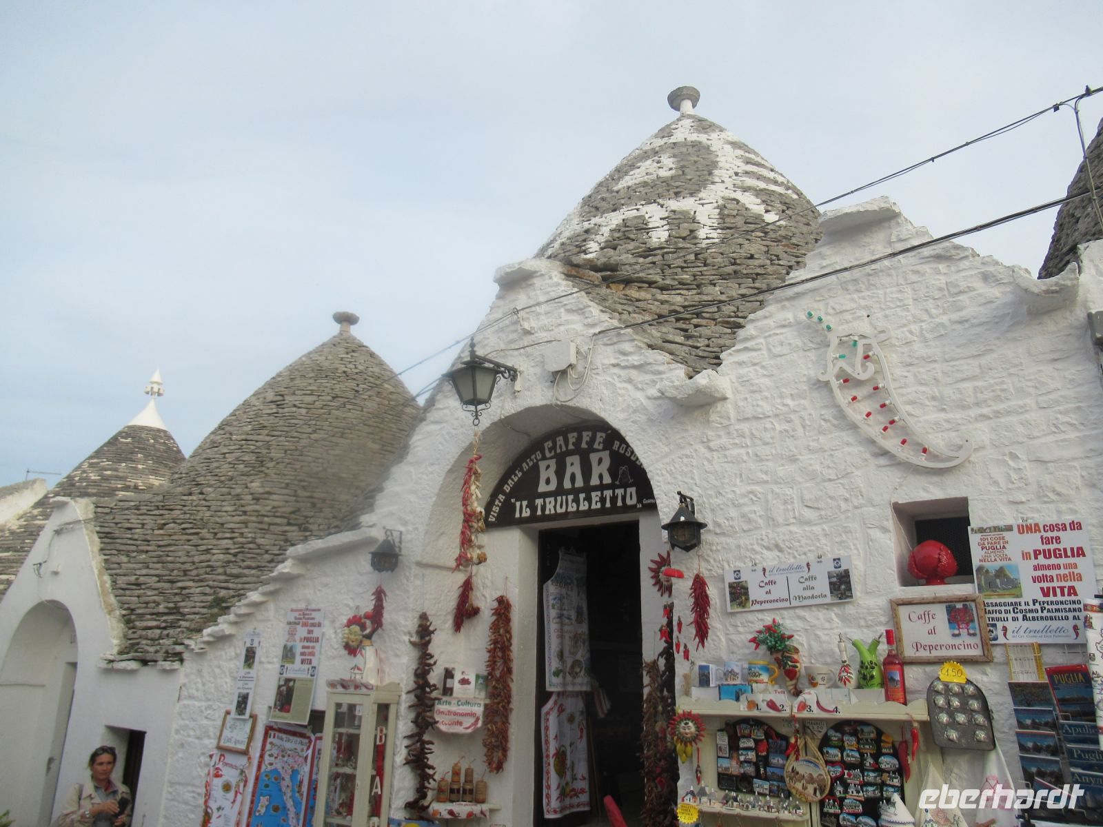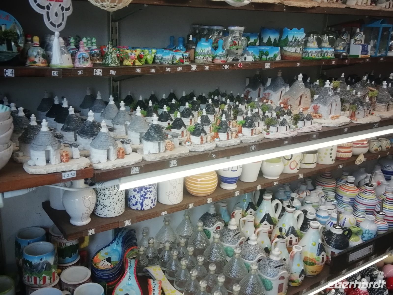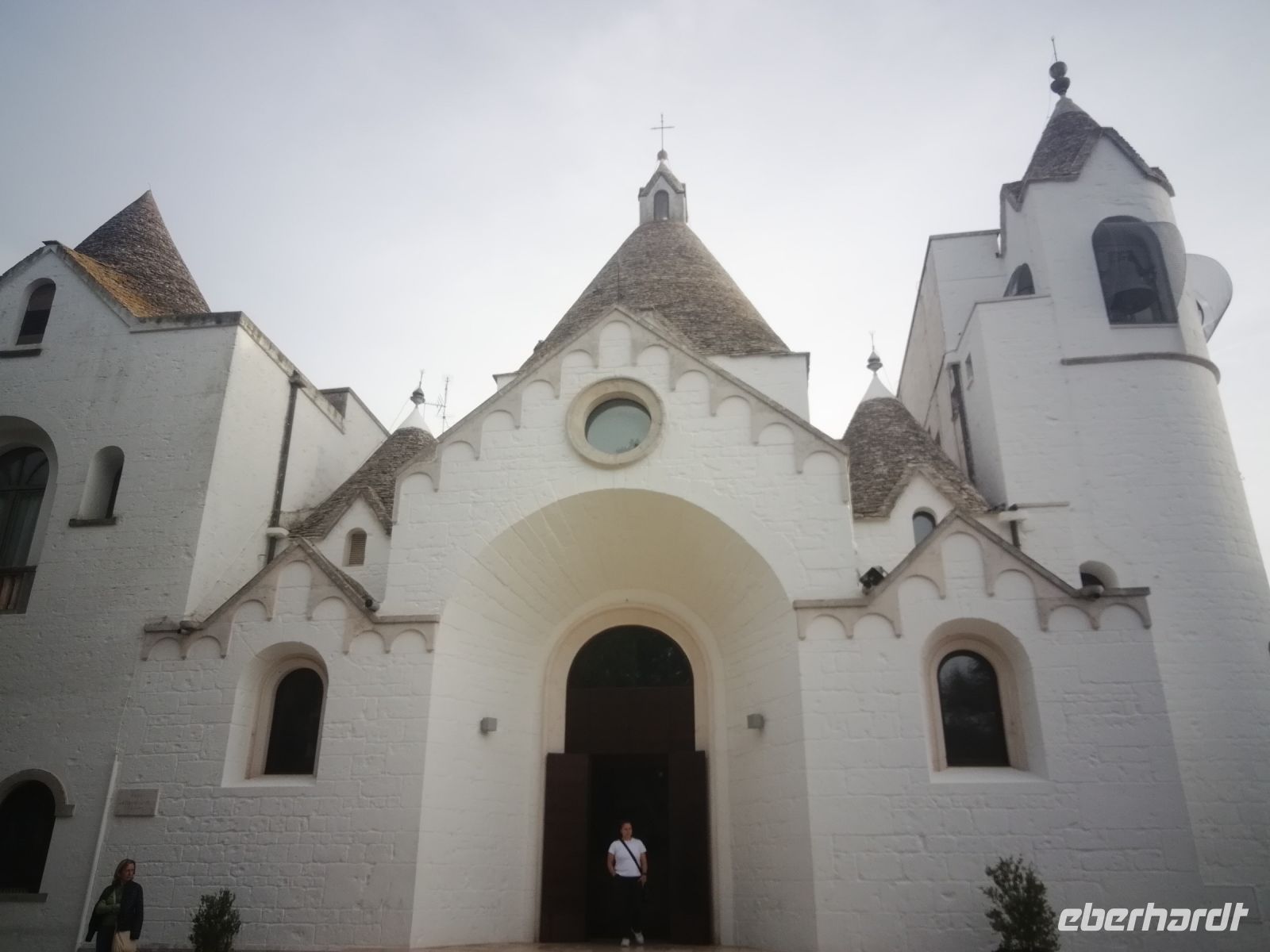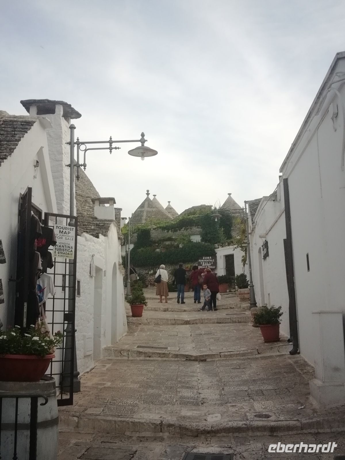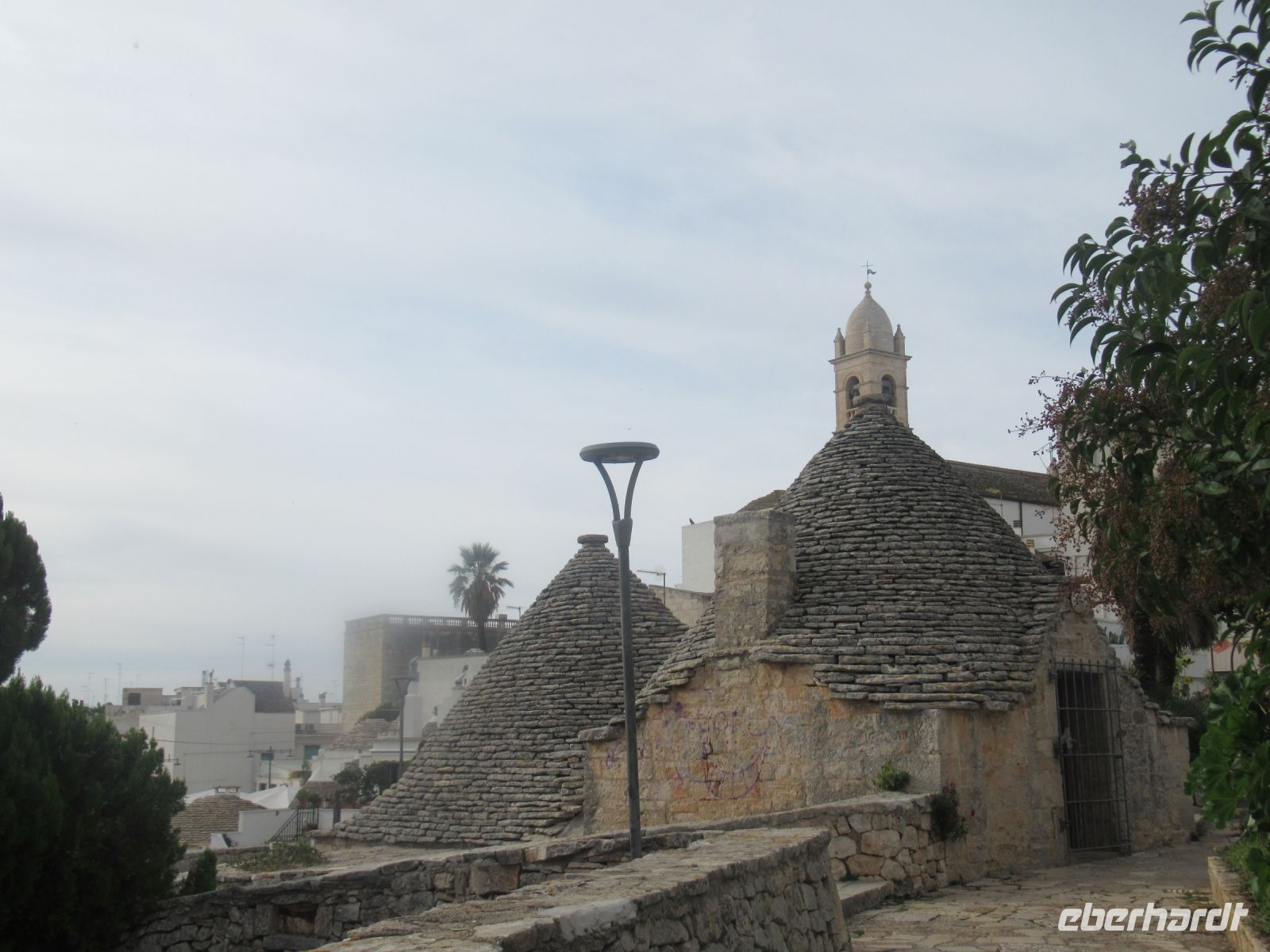 Alberobello – mit den bekannten Trulli-Häusern, seit 1996 von der UNESCO zum Weltkulturerbe erklärt. Hier erwartet uns ein pittoreskes Städtchen mit etwa 1.000 Trulli Häusern. Angeblich wurden die Trulli Häuser im 17. Jh., um Grundsteuer zu sparen, ohne Mörtel gebaut und als „Steinhaufen“ deklariert. Wir spazieren durch die Trulli-Straßen, können sogar ein Haus mit sehr freundlichen Frau von Innen sehen. Ein sehr gemütliches Häuschen mit Esstisch, Bett, Küchen-und Toilettenecke und eine Leiter in die „2te-Etage“ unters Trulli-Dach. Wir spazieren weiter bis zu der Wallfahrtskirche Sant'Antonio di Padova – eine in Trulli Bauweise errichtete Kirche. Anschließend erkundet jeder für sich dieses Trulli-Städtchen mit einem ganz besonderem Flair. Heute sind in den Trulli Häusern kleine Lädchen, Pensionen oder Restaurants eingerichtet.