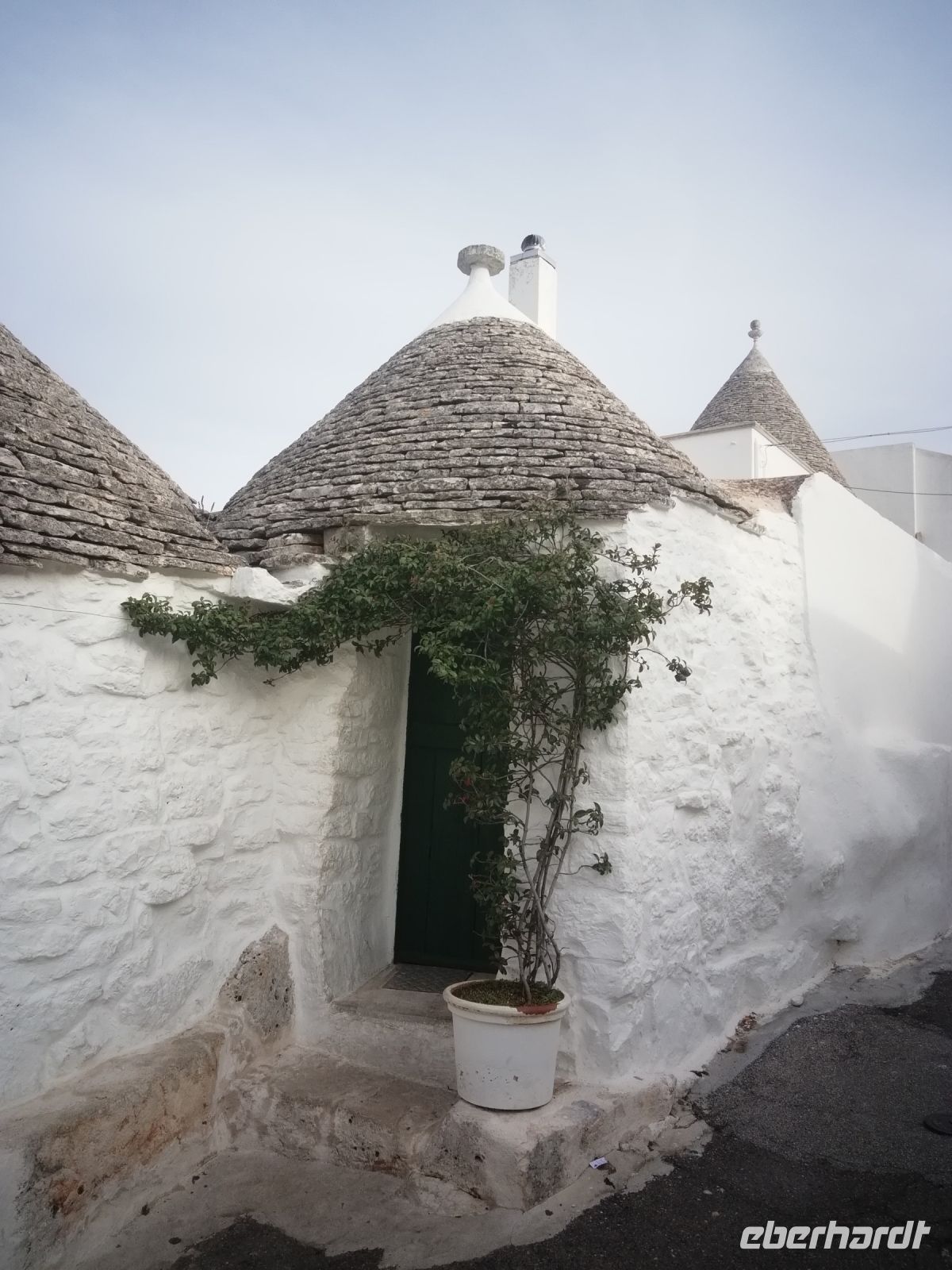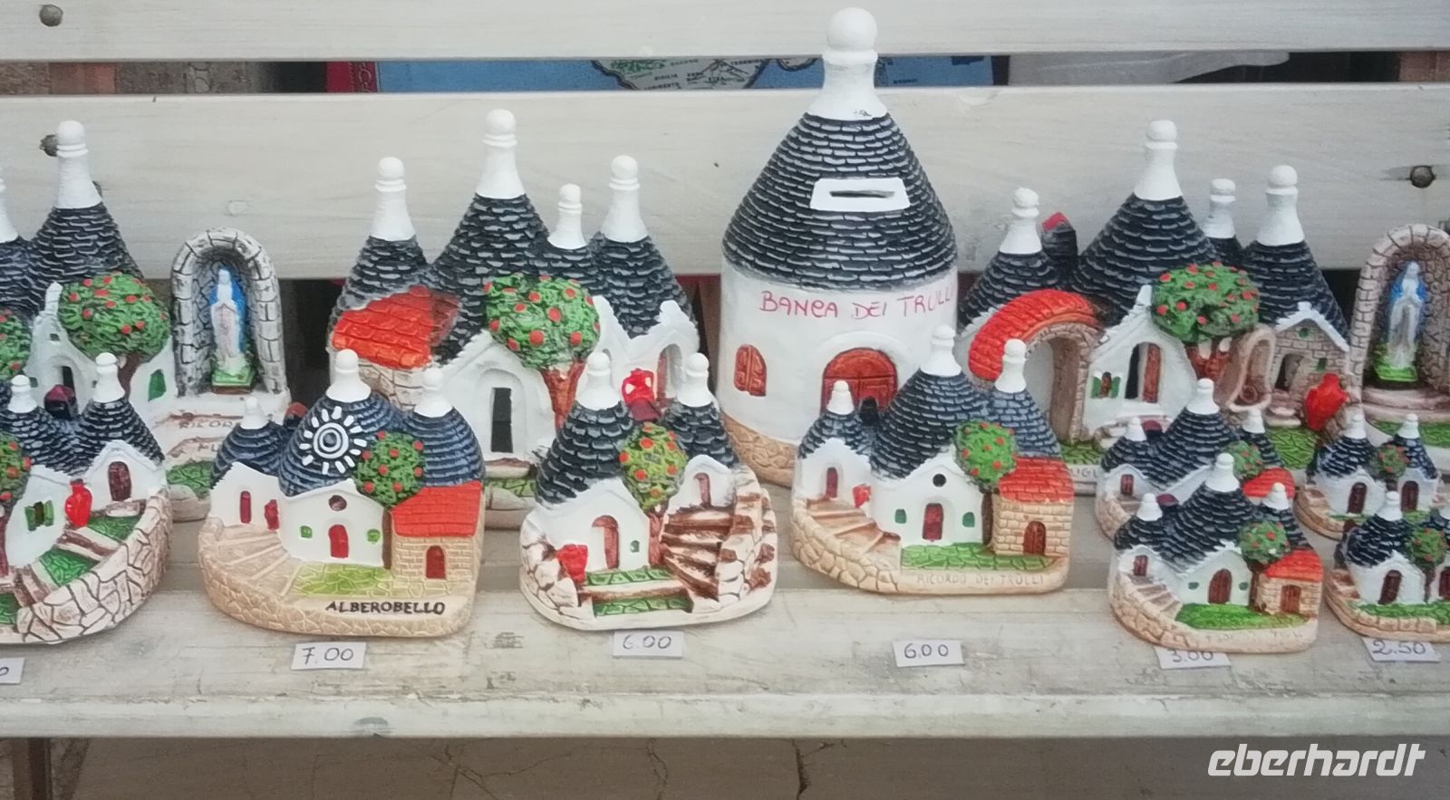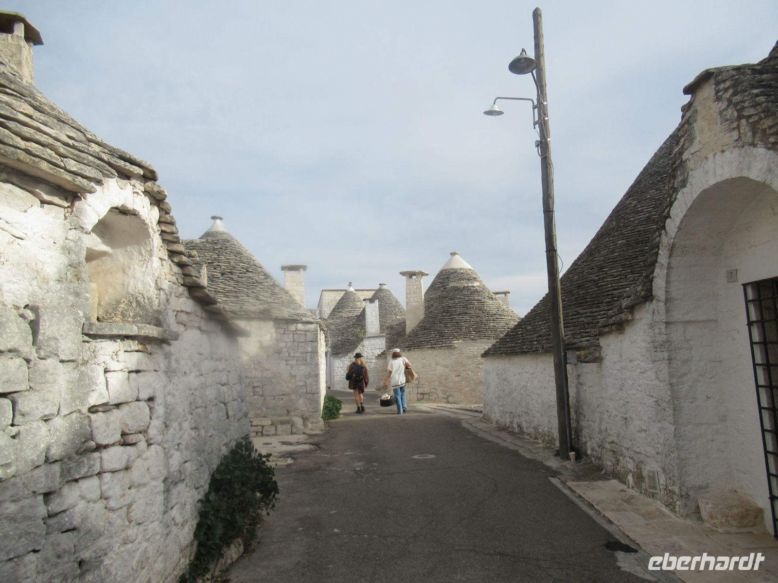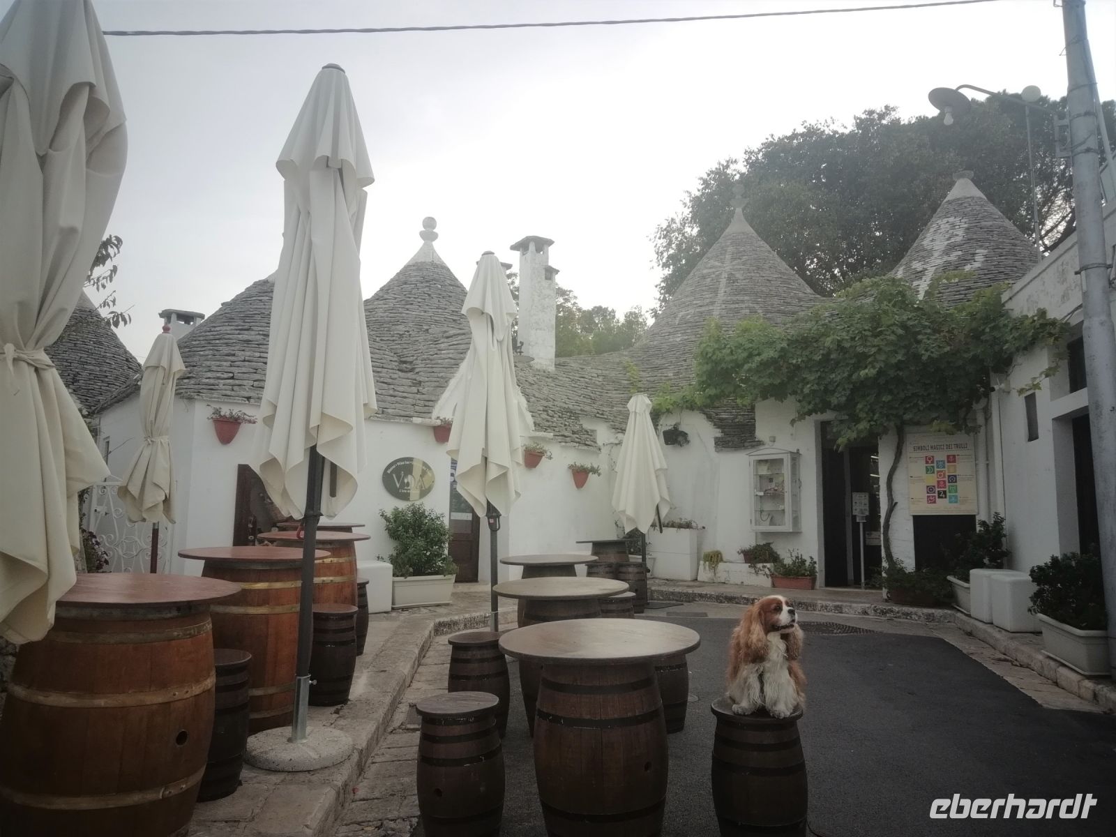 Alberobello – mit den bekannten Trulli-Häusern, seit 1996 von der UNESCO zum Weltkulturerbe erklärt. Hier erwartet uns ein pittoreskes Städtchen mit etwa 1.000 Trulli Häusern. Angeblich wurden die Trulli Häuser im 17. Jh., um Grundsteuer zu sparen, ohne Mörtel gebaut und als „Steinhaufen“ deklariert. Wir spazieren durch die Trulli-Straßen, können sogar ein Haus mit sehr freundlichen Frau von Innen sehen. Ein sehr gemütliches Häuschen mit Esstisch, Bett, Küchen-und Toilettenecke und eine Leiter in die „2te-Etage“ unters Trulli-Dach. Wir spazieren weiter bis zu der Wallfahrtskirche Sant'Antonio di Padova – eine in Trulli Bauweise errichtete Kirche. Anschließend erkundet jeder für sich dieses Trulli-Städtchen mit einem ganz besonderem Flair. Heute sind in den Trulli Häusern kleine Lädchen, Pensionen oder Restaurants eingerichtet.