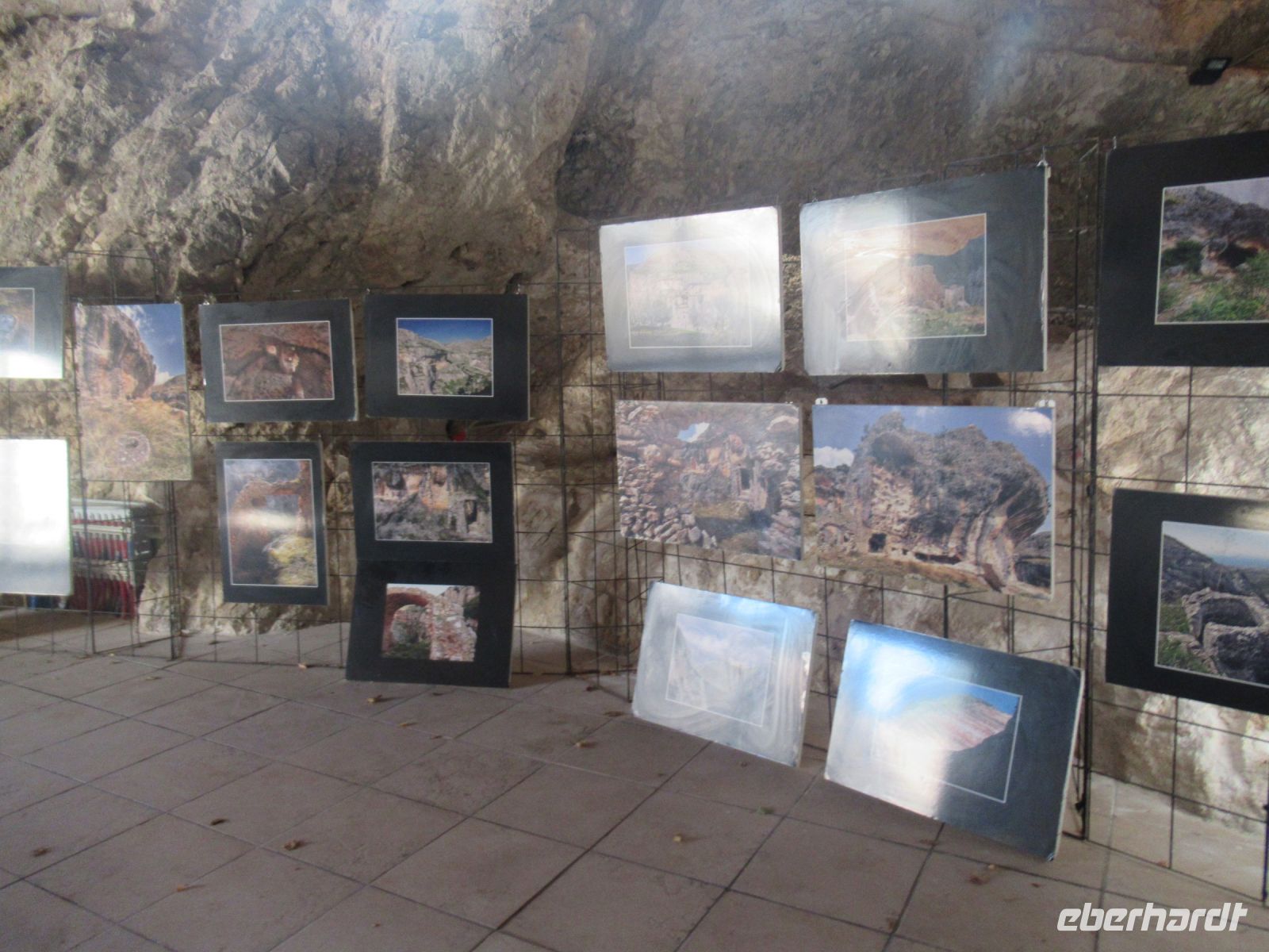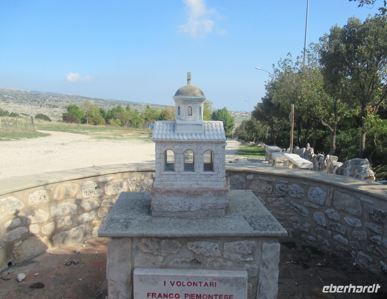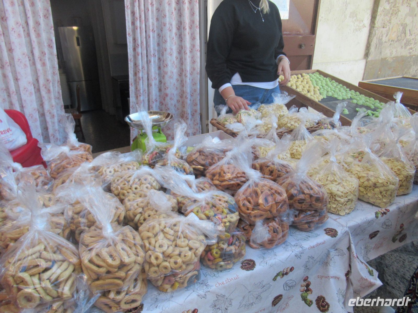 Wir fuhren über eine wunderschöne Serpentinenstraße hinunter zum Kloster Pulsano aus dem 12. Jahrhundert. Der Kloster liegt zwischen Höhlen auf der Klippe der Felsenlandschaft mit wunderschönen Blick auf die Bucht von Manfredonia in der Ferne. Wir schauen uns erst die Höhle an, in der wohl die Mönche des Pulsanesi-Eremiten Orden „Scasi“ gelebt haben. Durch einen schmalen Tunnel gelangen wir doch zu einer großen Höhle, die heute als Kulturstädte, Konzertsaal und Ausstellungsraum genutzt wird. Aktuell waren da wunderschöne Landschaftsbilder von örtlichen Künstlern ausgestellt. Die Kirche und Gebetsstätte, die auch in die Höhle gebaut wurde, ist heute mit Ikonenbilder und Malereien bestückt. Hier an diesem Ort der Spiritualität konnten wir auch unser Picknick beim schönsten Wetter und Aussicht auf die Berge und die Manfredonia Bucht einnehmen. Nur die Bucht hat sich heute in einen Dunstschleier eingehüllt. Kleine Auswahl an italienischen Spezialitäten auf dem Kreuzpodest konnten die Gäste picken. Man könnte fast sagen „Ein heiliges Mahl“.