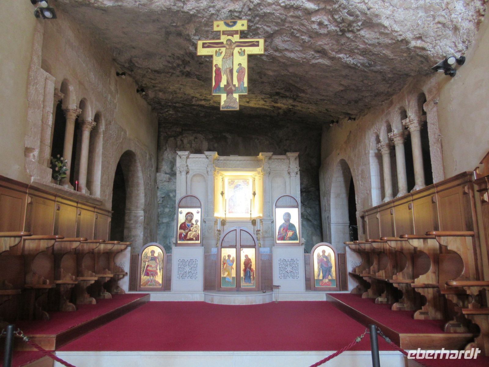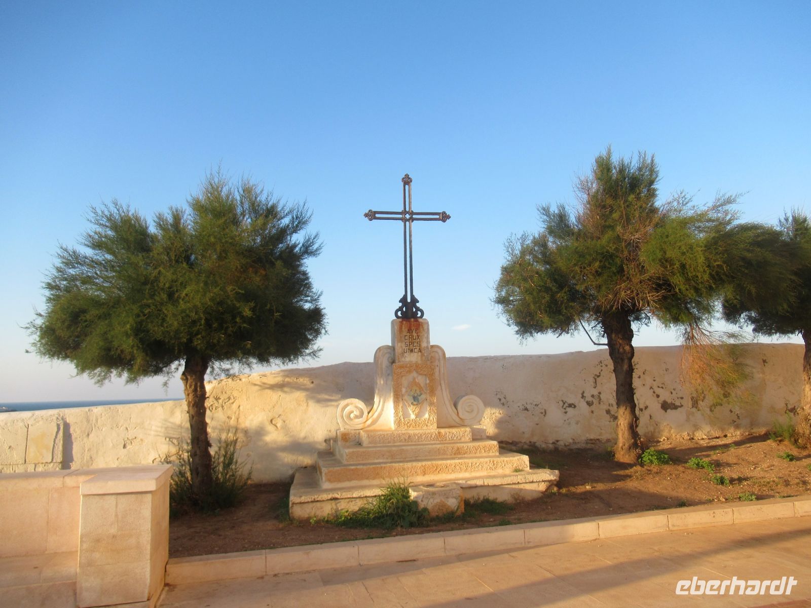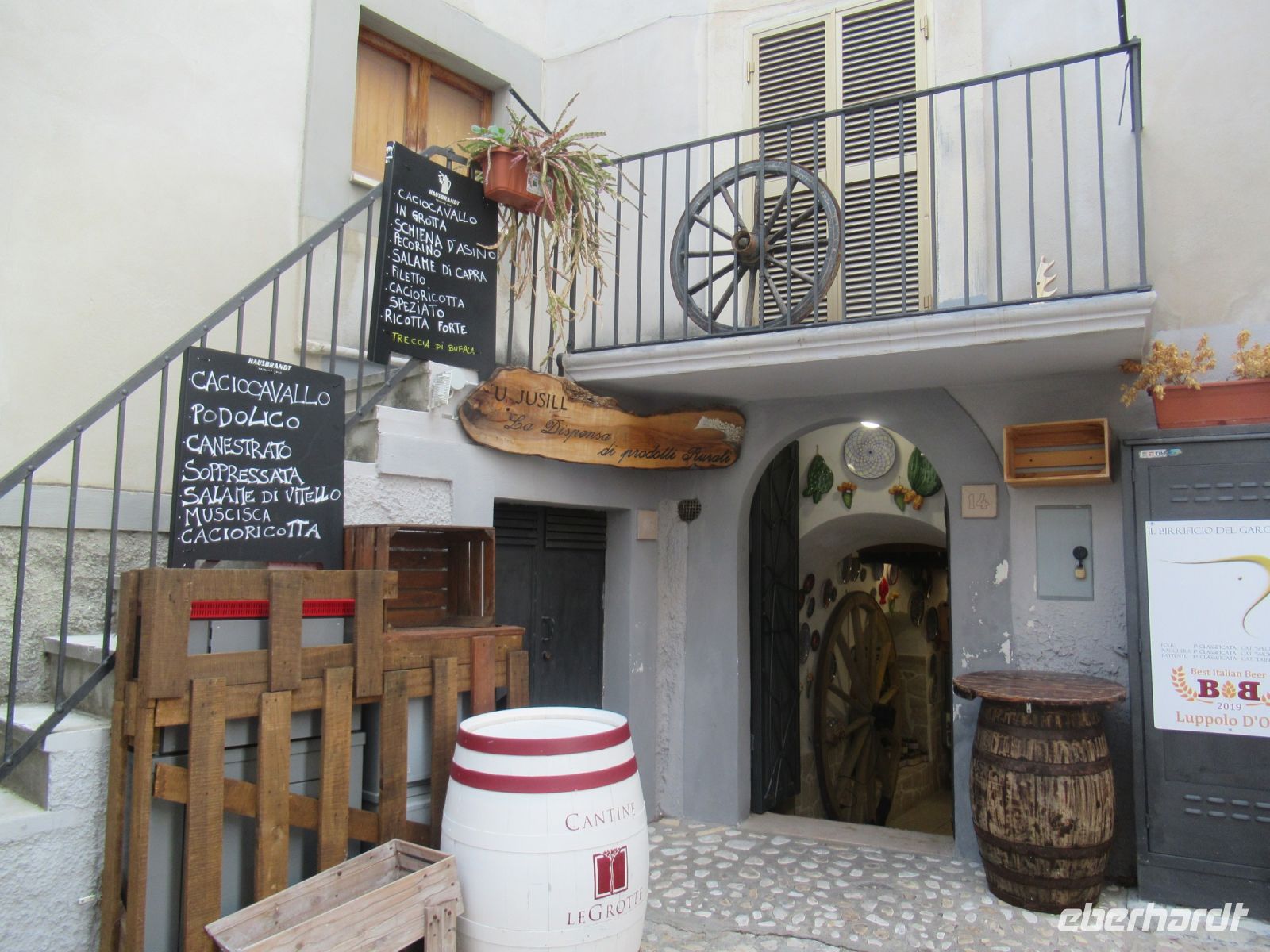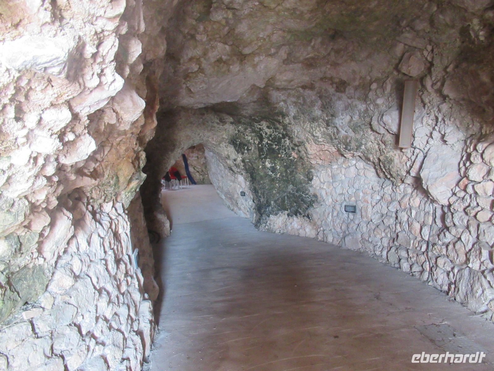 Wir fuhren über eine wunderschöne Serpentinenstraße hinunter zum Kloster Pulsano aus dem 12. Jahrhundert. Der Kloster liegt zwischen Höhlen auf der Klippe der Felsenlandschaft mit wunderschönen Blick auf die Bucht von Manfredonia in der Ferne. Wir schauen uns erst die Höhle an, in der wohl die Mönche des Pulsanesi-Eremiten Orden „Scasi“ gelebt haben. Durch einen schmalen Tunnel gelangen wir doch zu einer großen Höhle, die heute als Kulturstädte, Konzertsaal und Ausstellungsraum genutzt wird. Aktuell waren da wunderschöne Landschaftsbilder von örtlichen Künstlern ausgestellt. Die Kirche und Gebetsstätte, die auch in die Höhle gebaut wurde, ist heute mit Ikonenbilder und Malereien bestückt. Hier an diesem Ort der Spiritualität konnten wir auch unser Picknick beim schönsten Wetter und Aussicht auf die Berge und die Manfredonia Bucht einnehmen. Nur die Bucht hat sich heute in einen Dunstschleier eingehüllt. Kleine Auswahl an italienischen Spezialitäten auf dem Kreuzpodest konnten die Gäste picken. Man könnte fast sagen „Ein heiliges Mahl“.