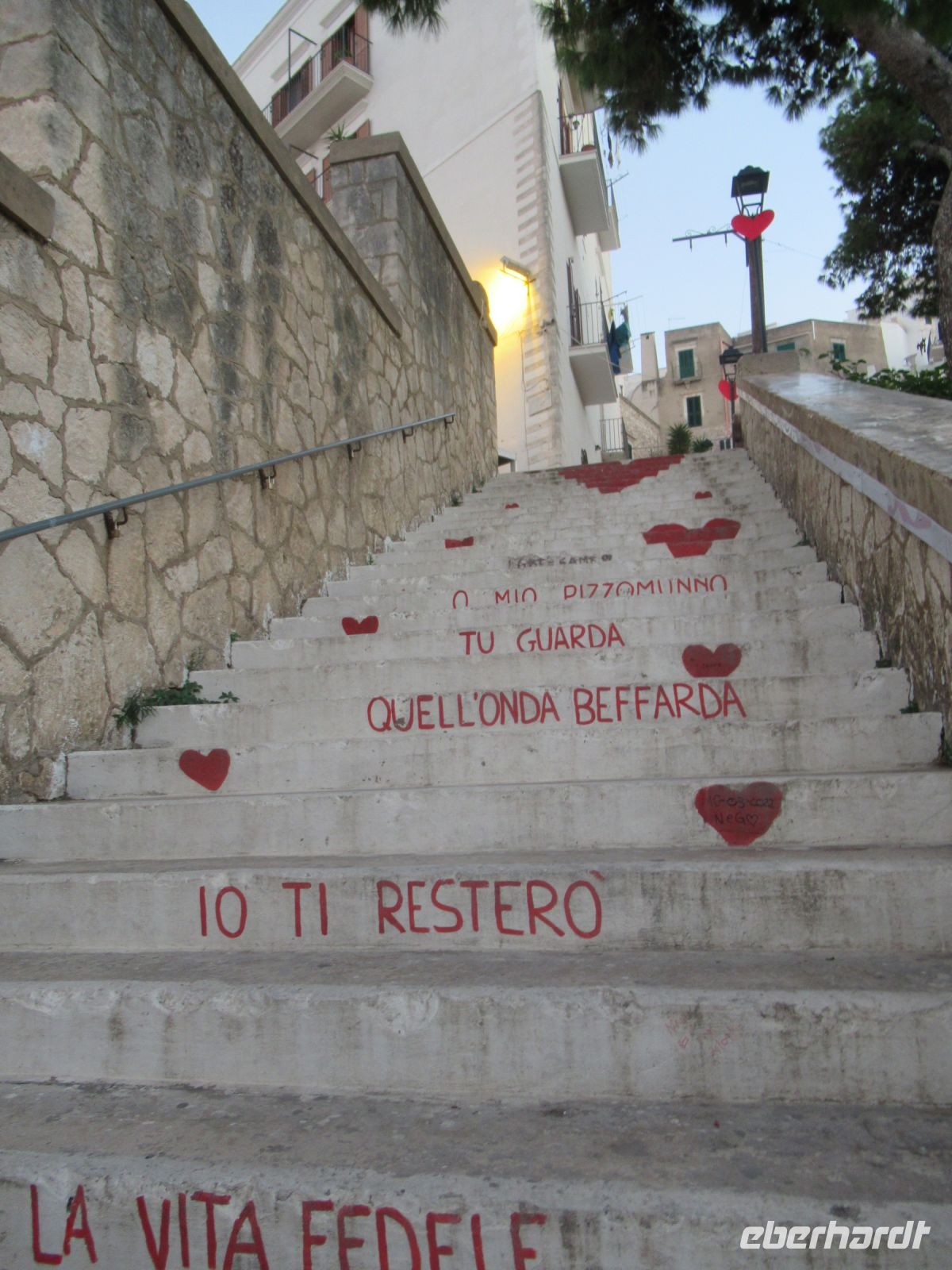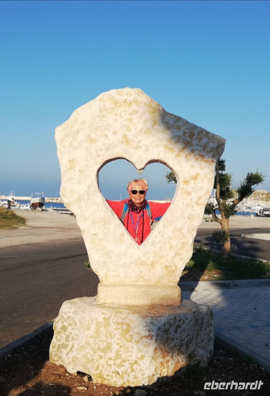 Am späten Nachmittag hat uns unser Fahrer Luigi nach Vieste zum Ausgangspunkt des Spazierganges in Vieste hingefahren. Wir starteten am Pizzomunno, dem mit Liebeslegende umwobenen Felsen von unglücklicher Liebe des Fischers Pizzomunno und junger Dame Cristalda. Dann gingen wir weiter Richtung Stadt, vorbei an gemütlichen Restaurants mit Blick auf den Leuchtturm, dann die Treppe hinauf zum Franziskaner Kirche – Chiesa e Convento di San Francesco. Hier konnten wir Bodenmosaik bewundern und den schönen Blick aufs Meer. Weiter ging der Spaziergang zu der Cathedrale di Santa Maria Oreta. Auf der Anhöhe bei Dom konnten wir dann noch den Strand, einen Trabucco und Pizzomuno von anderer Perspektive betrachten. Langsam schlenderten wir durch die Straßen von Vieste, die sich als Stadt der Liebe präsentiert. Am Ende der mit Herzen bemalten Treppe mit dem leuchtenden Herz beendeten wir unseren Spaziergang durch Vieste. In kleinen Gruppen gingen wir am Strand entlang Richtung Hotel, wo uns das wunderbare 3-Gang Abendessen und sehr freundliche Bedienung und Dessert für den Tag belohnt hat.