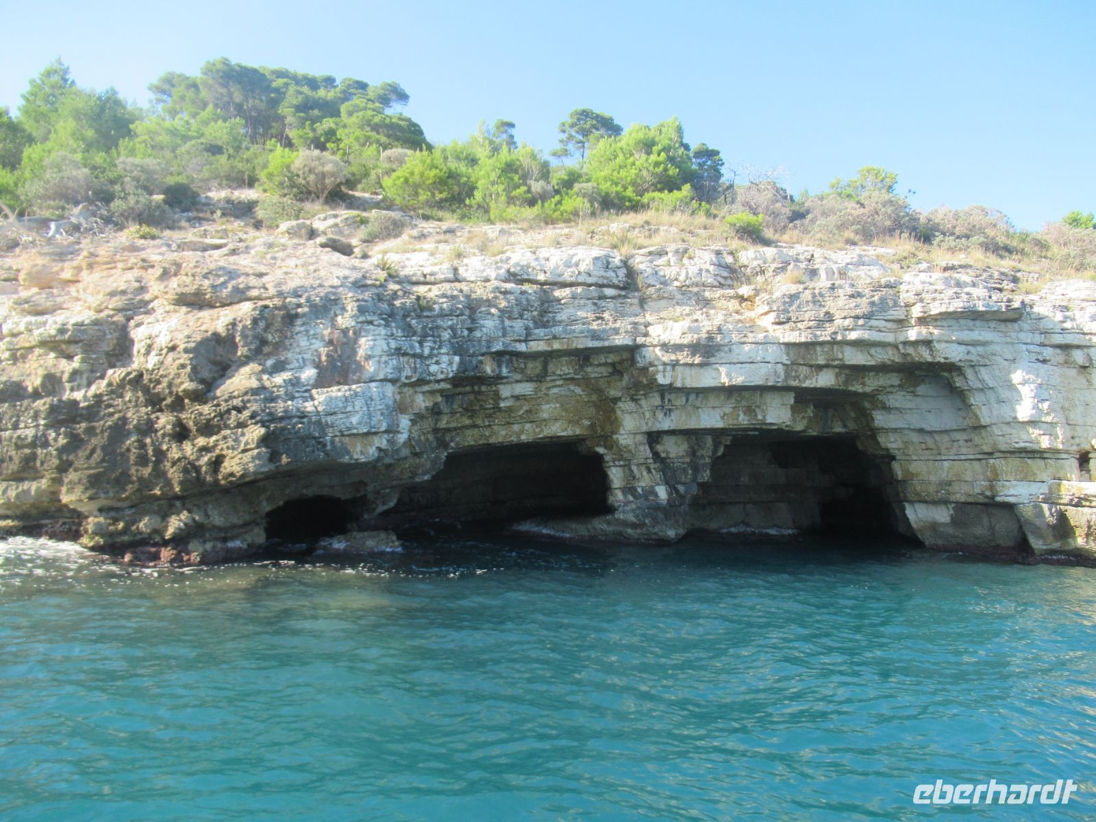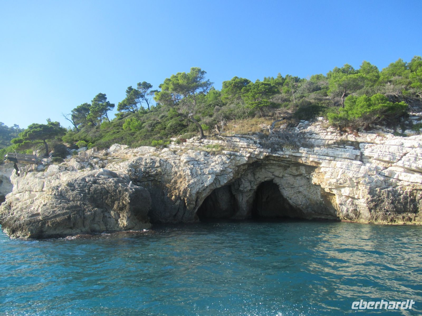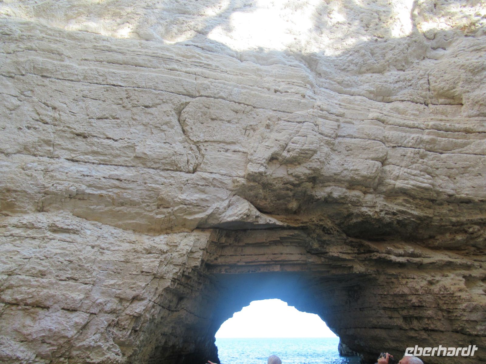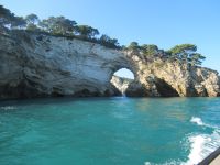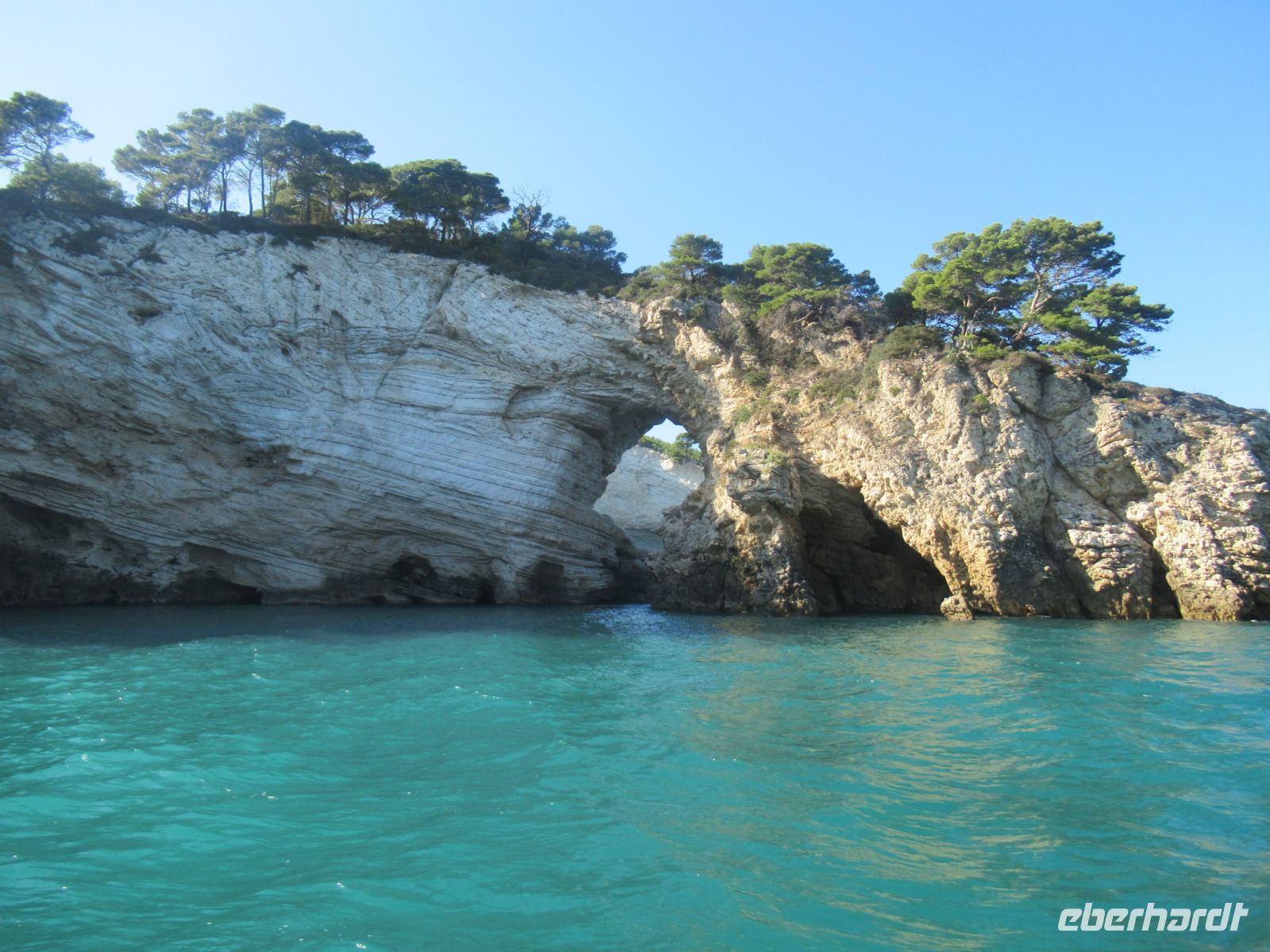 Jetzt aber zurück nach Vieste ins Hotel, dort werden wir für die Bootsfahrt abgeholt, die am Hafen von Vieste startete. Alle waren wir soo gespannt… Wieder Sonne pur, blauer Himmel – jetzt geht’s los. Vorbei an den Leuchtturm sehen wir schon den Pizzomunno von einer anderen Perspektive, die Stadt Vieste und dann die wunderbare weiße Felsenküste, kleine Steininselchen und immer wieder die Löcher und Grotten in der zerklüfteten und doch begrünten Küste. Ob wir in so eine Grotte reinfahren? – ja doch und das sogar drei Mal. Es ist kaum mit Worten zu beschreiben, man muss es einfach sehen und erleben. Hier gilt wirklich: Bilder sagen mehr als tausend Worte, schauen Sie einfach in die Fotogalerie. Diese Bootsfahrt ist wirklich ein „Muss“ jeder Apulien-Gargano Reise. Mehr als eine Stunde ging das Naturschauspiel, bis wir an die bekannte Stelle, der Baia Vignanotica gelangen. Von dort ginge es wieder zurück mit einem schnelleren Speed und die Nachmittagssonne bescherte uns wieder andere Bilder. Beindruckt von den Eindrücken spazierten wir dann am Strand von Vieste zurück ins Hotel.