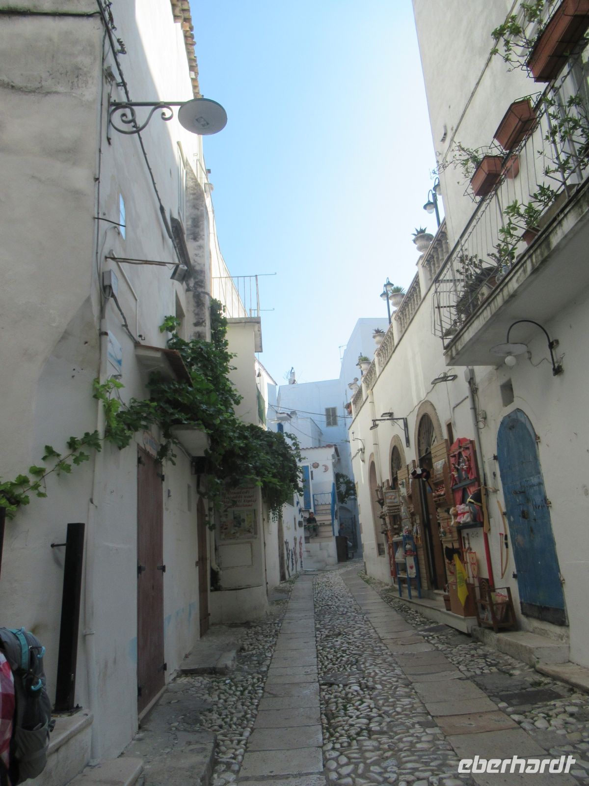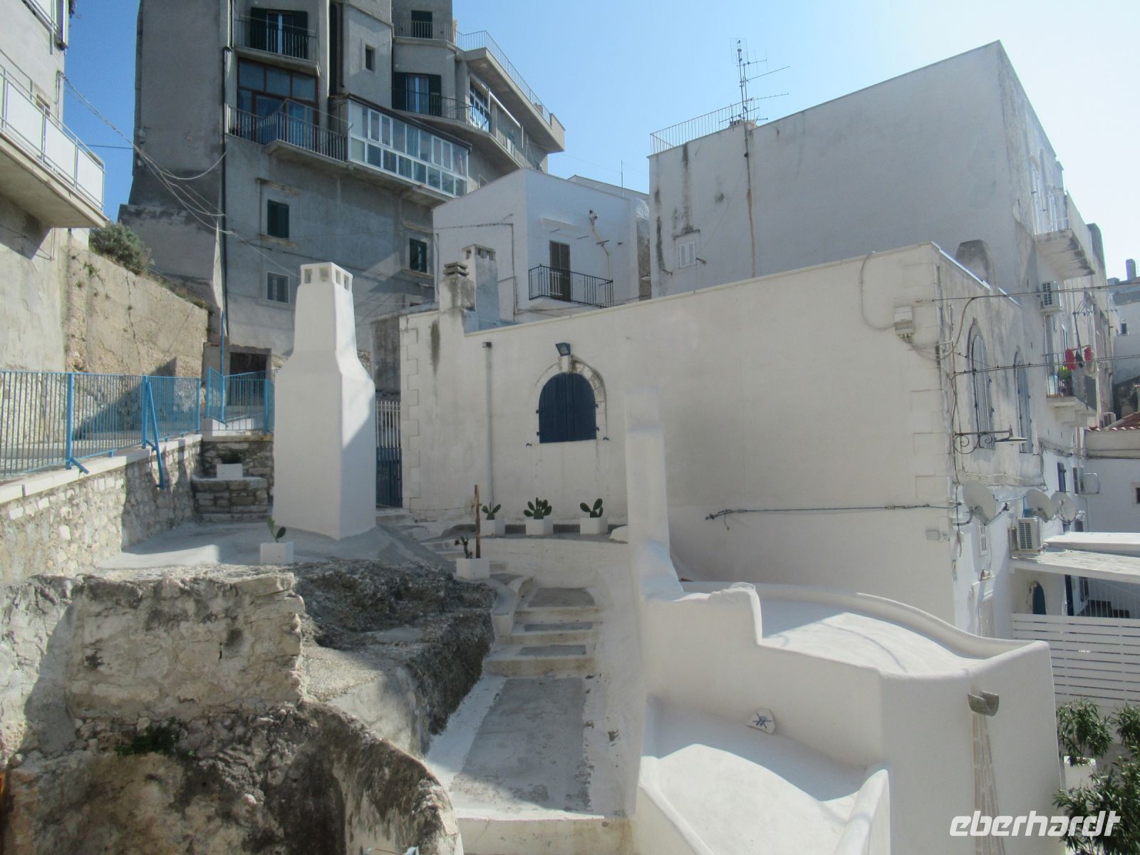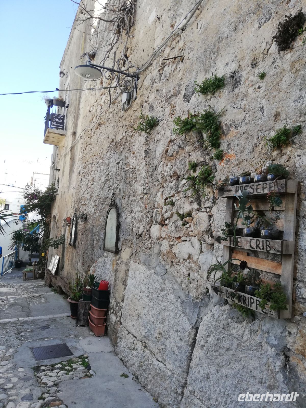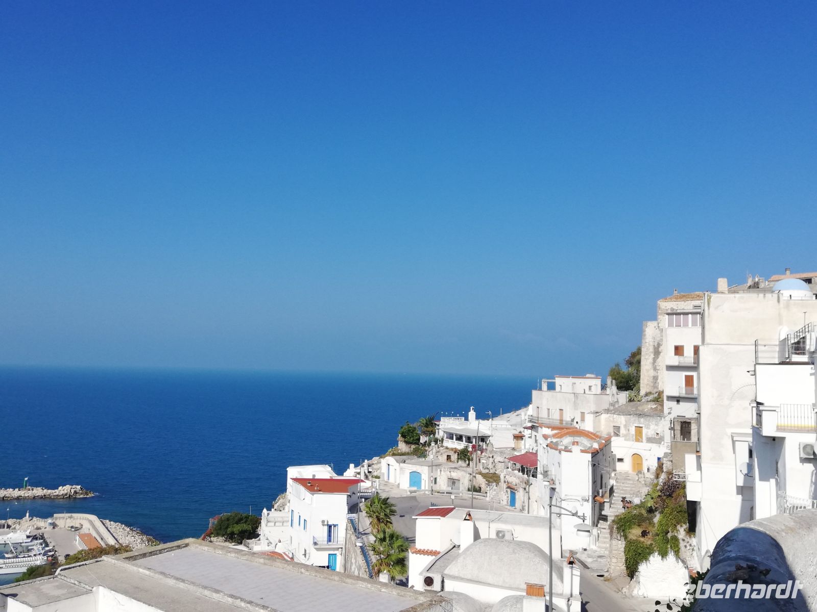 Zurück im Bus fuhren wir eine kurvenreiche Straße etwas nördlich nach Peschici. Hier am Castello Medioevale, machen wir eine kleine Kaffeepause und verkosteten das italienische Eis. Eine Altstadt mit uralten Häuser, verwinkelte Gassen und einem wunderschöner Blick aufs Meer. Wir schlendernden an Steinhäuser vorbei, die eher einer Mauer ähneln. Pflanzen, Blumentöpfe verzierte die sonst die Karge Steinwand. Danach gibt es noch eine Mittagspause mit italienischen Spezialitäten, oder manche Gäste erkunden Peschici noch selbst.