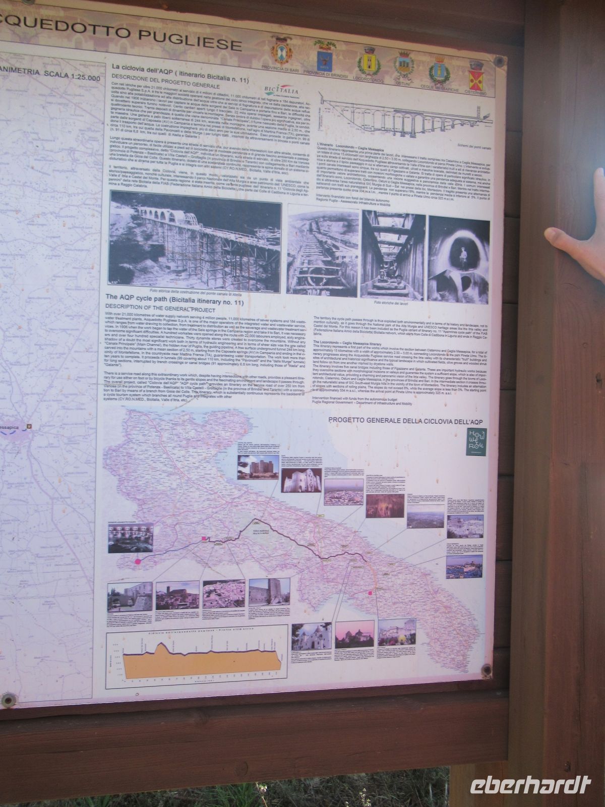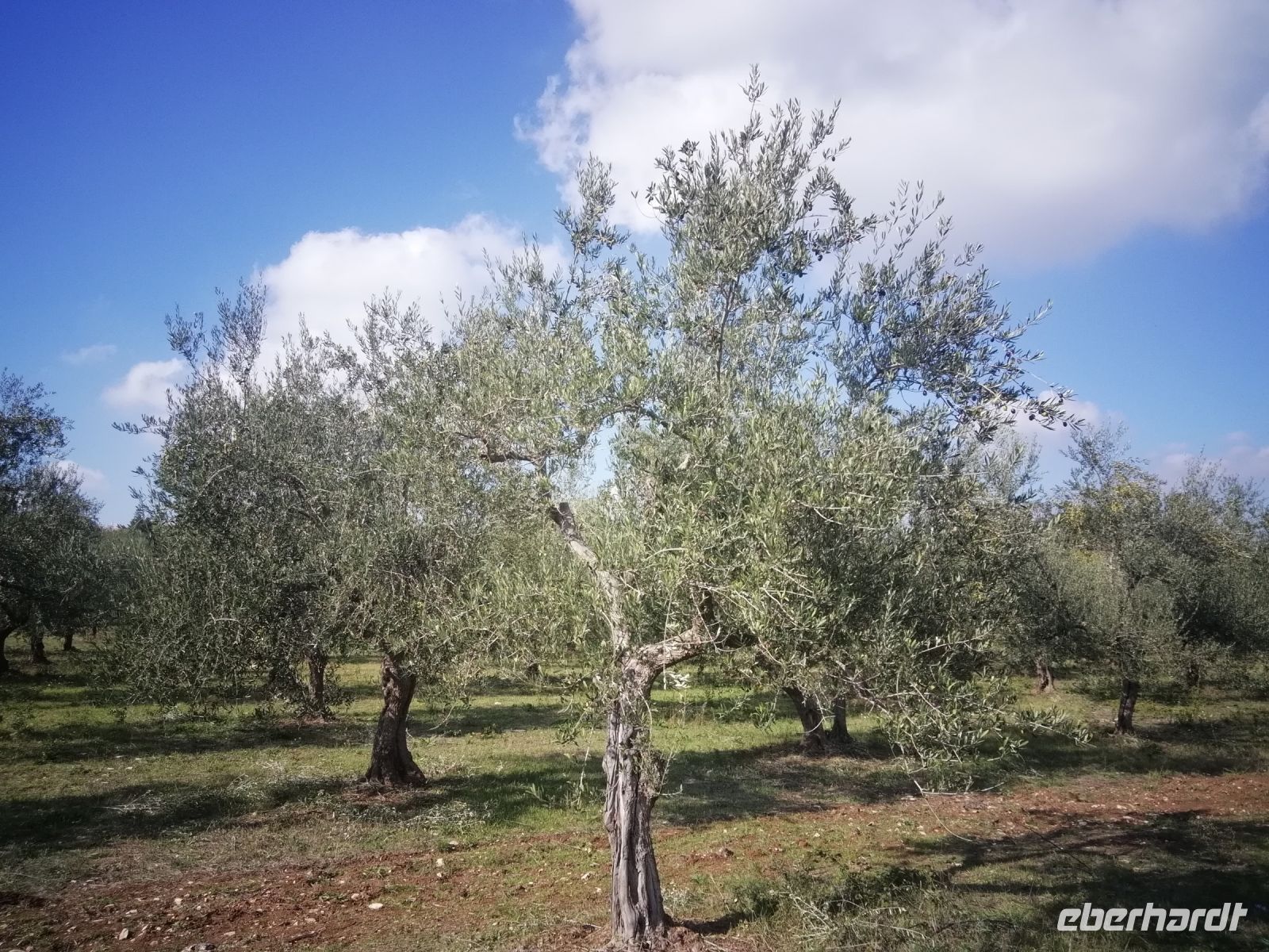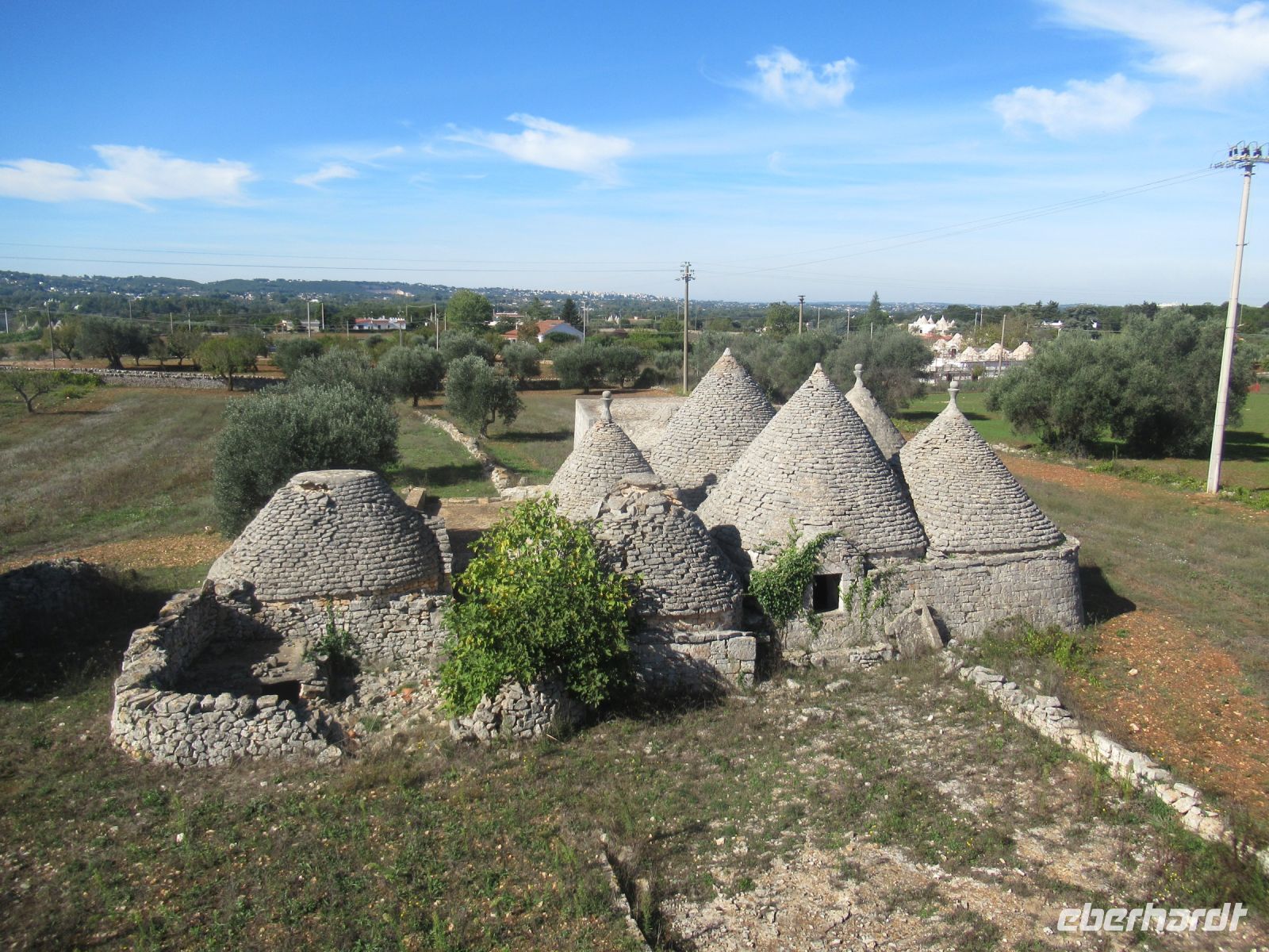 Heute können wir etwas entspannter starten. Frühstück mit einem sehr schönen Büffet und Kaffeeautomaten. Nach dem Frühstück können wir noch die großzügige Hotelanlage erkunden um dann die Region Apuliens zu entdecken. Wir fuhren durch ganz andere, sanfte Landschaften, mit vielen Olivenplantagen, Weinreben, Kirsch- und Pflaumen Wiesen und schönen Steinhäusern, die in die Landschaft gebaut sind. Steinabgrenzungen, trockene Steinbauweise ziehen sich durch die Landschaften und schützen die Felder vom Austrocknen, vor Erdrutschen und starken Regenfällen. Schon unterwegs sahen wir Häuser mit den „Trulli-Dächern“, Alte ursprüngliche aber auch Neue, die an die neugebauten Häuser als Dächer angebaut sind. Wir fuhren durch das Städtchen Loco Rotondo – eine „Runde Stadt“ und an der Stadt Martina Franca vorbei und machen einen kleinen Fotostopp, um die schöne Silhouette von Loco Rotondo einzufangen. Heute ist eine Wanderung an der Strecke des Aquädukts, der die Stadt Bari mit Wasser versorgt hat angesagt. Auch heute agiert „Acquedetto Pugliese“ mit Projekten, die das Ziel haben, jedes Haus mit Wasser zu versorgen. Diese Wege zur Pflege der Wasserversorgung werden heute touristisch für Wanderer und Fahrradfahren genutzt. Wir starten unsere ca. 7 km lange Wanderung und schauen uns die Karte und die Information an der Info-Tafel an. Auf der Strecke mit vielfältigen Pflanzen, Mandelbäumen, Feigenkakteen laufen wir gemütlich wieder bei strahlender Sonne und immer wieder sehen wir in der Landschaft die ursprünglichen aber auch neuen Trulli-Häuser. Wie Zipfelmützen tauchen die rechts und links entlang der Strecke auf. Es sieht, wie in einem Märchenland aus. Man denkt, es kommt gleich ein Zwerg aus dem Häuschen raus. Katrin erklärt uns die Bauweise der Trulli Häuser. Die Trullis wurden ursprünglich von Einheimischen für landwirtschaftliche Zwecke zur Aufbewahrung von Lebensmitteln geschaffen.